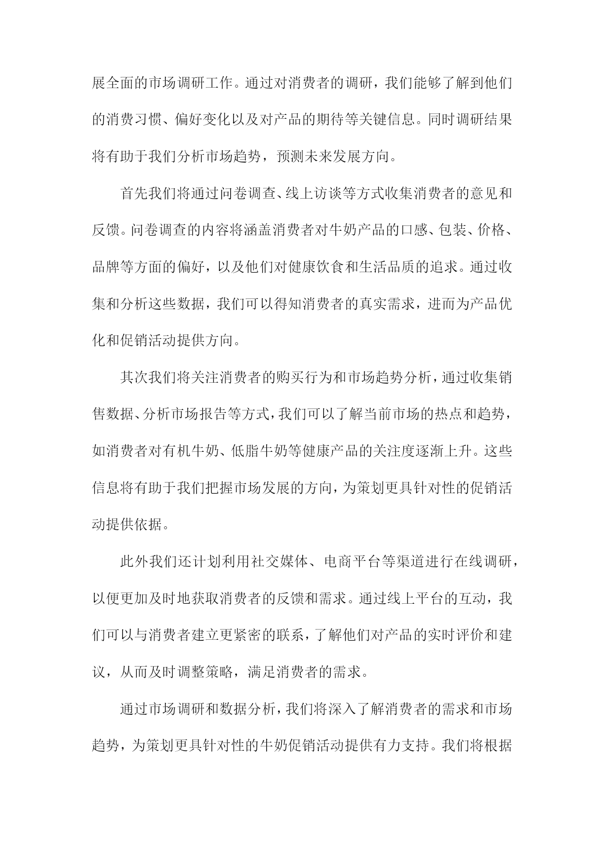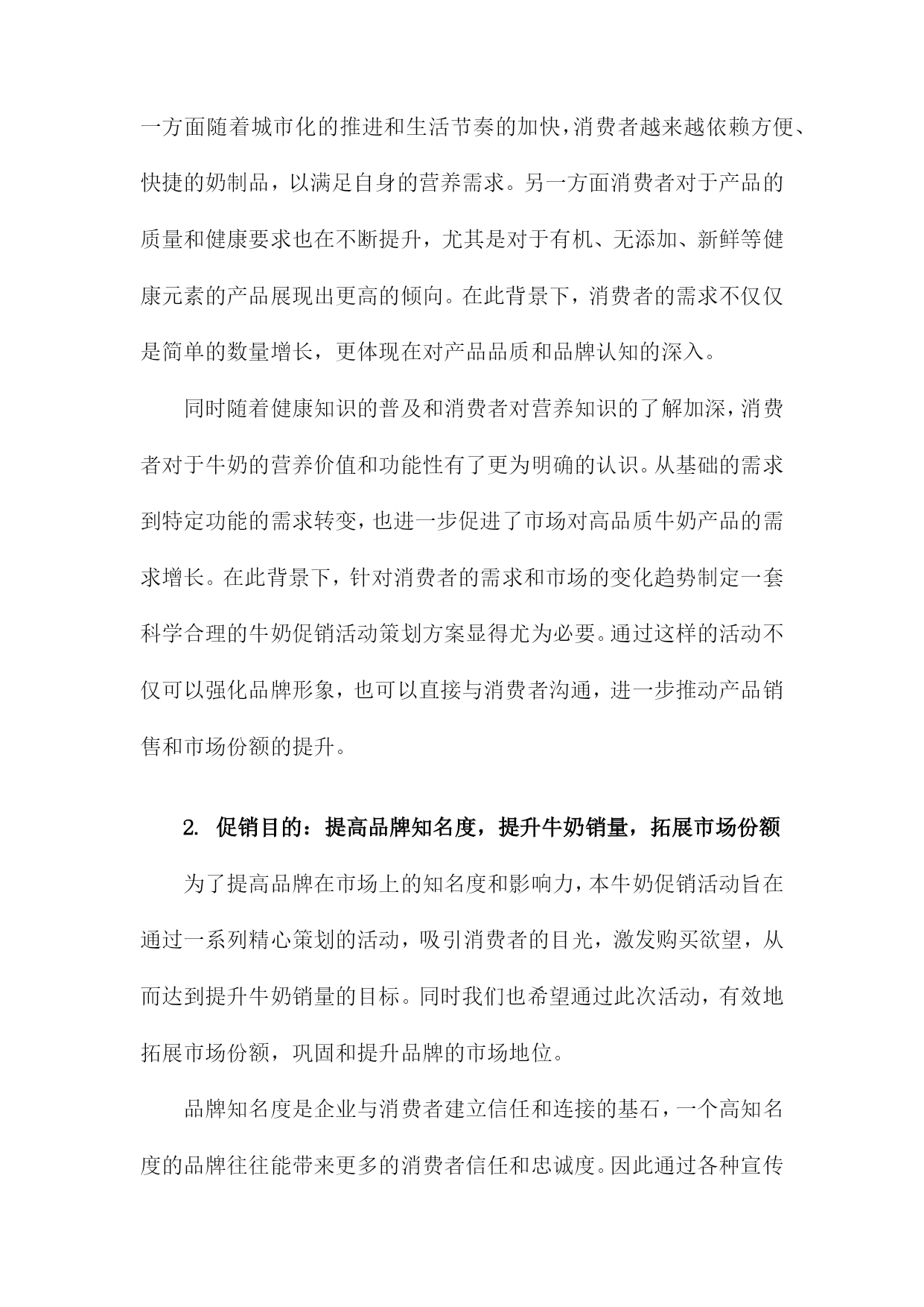牛奶促销活动策划方案一、综述随着健康意识的日益增强,乳制品在人们的日常消费中占据了越来越重要的地位。牛奶作为优质的营养来源,其市场需求稳步增长。为了进一步提升品牌知名度,提高市场占有率,本次牛奶促销活动策划方案应运而生。本策划方案旨在针对潜在消费者,制定一系列有趣、有吸引力且富有创意的促销活动,推动牛奶的销量增长,同时增强消费者对品牌的好感度和忠诚度。通过整合线上线下资源,我们将打造一个全方位的营销网络,确保活动的影响力覆盖各个消费群体,从而达成预期的营销目标。接下来我们将从活动背景、市场分析、目标群体、核心策略等方面,全面阐述本次牛奶促销活动策划方案。1.背景介绍:当前市场状况,消费者对牛奶的需求趋势在当前社会背景下,随着人们生活水平的提高和健康意识的增强,乳制品行业正在经历前所未有的发展机遇。作为日常营养补给的重要来源之一,牛奶的市场需求持续增长。当前市场状况反映了消费者对于高质量、健康食品的追求,而牛奶作为一种富含营养的食品,正好契合了这一需求趋势。在当前的市场环境下,消费者对牛奶的需求呈现出多元化的趋势。一方面随着城市化的推进和生活节奏的加快,消费者越来越依赖方便、快捷的奶制品,以满足自身的营养需求。另一方面消费者对于产品的质量和健康要求也在不断提升,尤其是对于有机、无添加、新鲜等健康元素的产品展现出更高的倾向。在此背景下,消费者的需求不仅仅是简单的数量增长,更体现在对产品品质和品牌认知的深入。同时随着健康知识的普及和消费者对营养知识的了解加深,消费者对于牛奶的营养价值和功能性有了更为明确的认识。从基础的需求到特定功能的需求转变,也进一步促进了市场对高品质牛奶产品的需求增长。在此背景下,针对消费者的需求和市场的变化趋势制定一套科学合理的牛奶促销活动策划方案显得尤为必要。通过这样的活动不仅可以强化品牌形象,也可以直接与消费者沟通,进一步推动产品销售和市场份额的提升。2.促销目的:提高品牌知名度,提升牛奶销量,拓展市场份额为了提高品牌在市场上的知名度和影响力,本牛奶促销活动旨在通过一系列精心策划的活动,吸引消费者的目光,激发购买欲望,从而达到提升牛奶销量的目标。同时我们也希望通过此次活动,有效地拓展市场份额,巩固和提升品牌的市场地位。品牌知名度是企业与消费者建立信任和连接的基石,一个高知名度的品牌往往能带来更多的消费者信任和忠诚度。因此通过各种宣传手段和促销活动,提升品牌的知名度和影响力是至关重要的。通过本次牛奶促销活动,我们将全方位展示品牌特色和优势,让更多的人了解并认同我们的品牌。随着市场竞争的日益激烈,提升牛奶销量是我们当前的重要任务。为了实现这一目标,我们需要不断创新促销策略,吸引更多的消费者购买我们的产品。本次促销活动将通过优惠的价格、丰富的赠品和吸引人的活动形式,激发消费者的购买欲望,从而实现销量的提升。拓展市场份额是我们持续发展的关键因素之一,为了拓展市场份额,我们将充分利用本次促销活动的机会,通过广泛的市场宣传和推广,吸引更多的潜在客户。同时我们也将通过提供高质量的产品和服务,提高客户满意度,从而吸引他们成为我们的忠实客户,进一步拓展市场份额。本次牛奶促销活动的目的是通过提高品牌知名度、提升牛奶销量和拓展市场份额,实现品牌的持续发展和市场占有率的提升。我们将通过一系列精心策划的活动和策略,达成这些目标。3.活动概述:简述策划一场牛奶促销活动的必要性和预期目标随着市场竞争的加剧和消费者需求的多样化,策划一场牛奶促销活动变得尤为重要。本策划方案的第三部分——活动概述,旨在清晰地简述策划这场牛奶促销活动的必要性及预期目标。在当前乳制品市场环境下,消费者对牛奶产品的选择日趋多元化。为了提升品牌知名度,增强消费者对我们品牌牛奶的认知度和忠诚度,策划一场具有创意和吸引力的促销活动显得尤为重要。此外通过此次活动,我们希望能够缓解库存压力、加速产品流通,进一步拓展市场份额,为公司的长远发展奠定基础。提升品牌知名度:通过此次促销活动,使更多的消费者了解并熟悉我们的牛奶品牌,提升品牌在市场中的知名度和影响力。增强消费者忠诚度:通过优惠活动、互动体验等环节,增强消费者对我们品牌牛奶的信任和依赖,培养消费者的品牌忠诚度。扩大市场份额:借助此次促销活动,吸引更多潜在消费者尝试并购买我们的牛奶产品,从而拓展市场份额,提升销售业绩。促进产品销售:通过促销活动刺激消费者购买欲望,增加即期销量,缓解库存压力,加速产品周转。塑造品牌形象:通过活动展示我们品牌牛奶的高品质、健康、天然的形象,与消费者建立情感连接,为品牌的长远发展打下坚实基础。本次牛奶促销活动策划旨在通过一系列精心设计的活动环节,实现品牌知名度、消费者忠诚度、市场份额及产品销售的全面提升,为公司创造更大的商业价值。二、市场分析随着人们