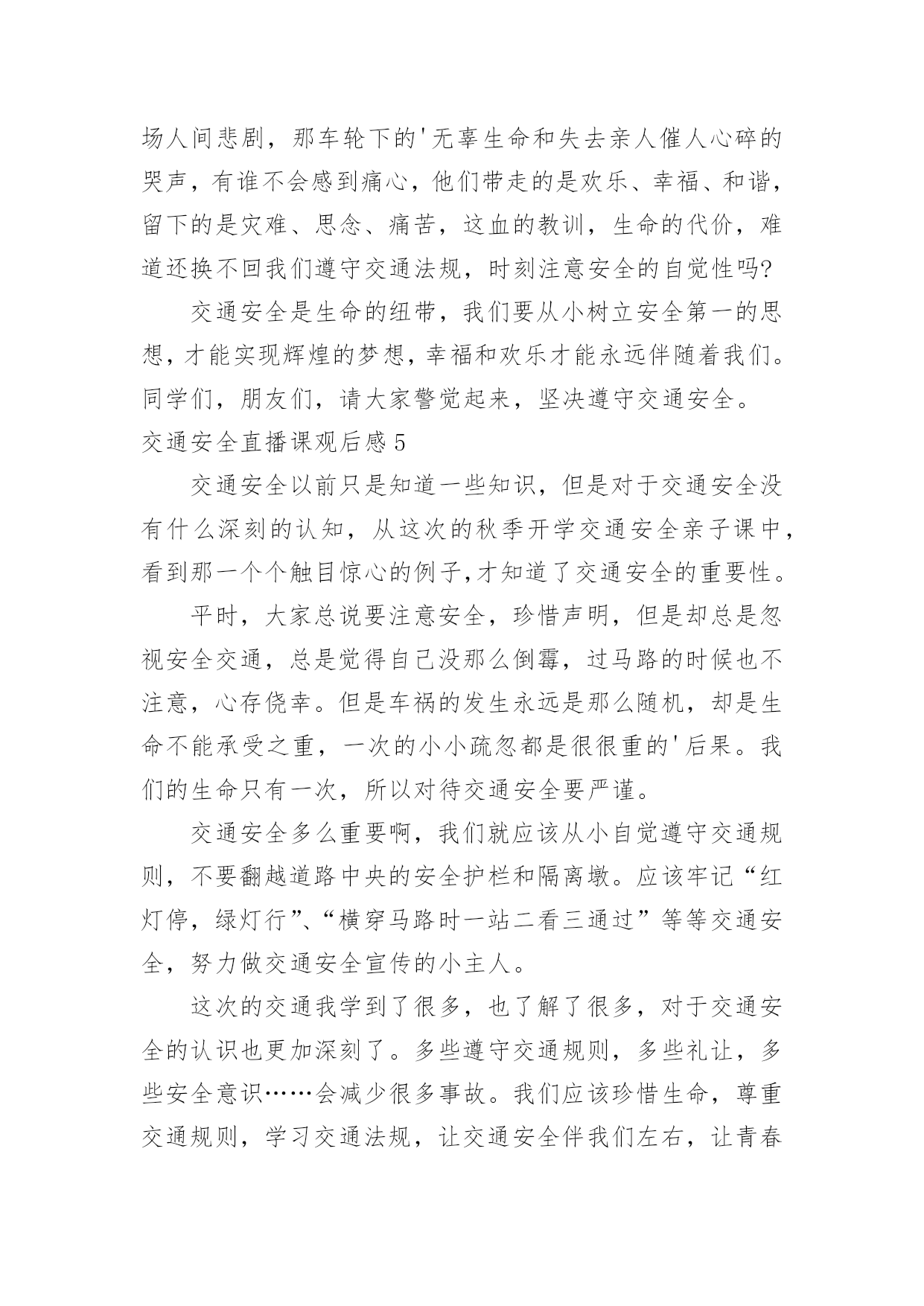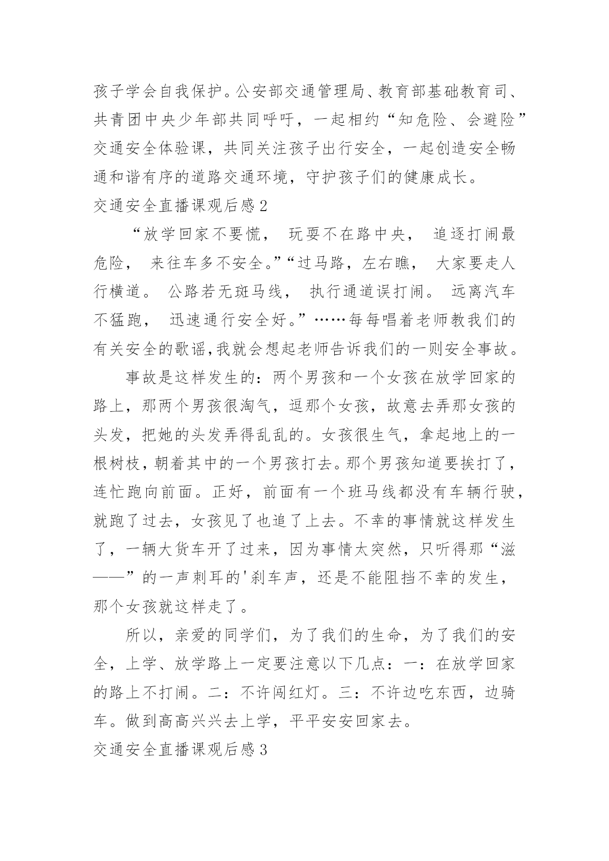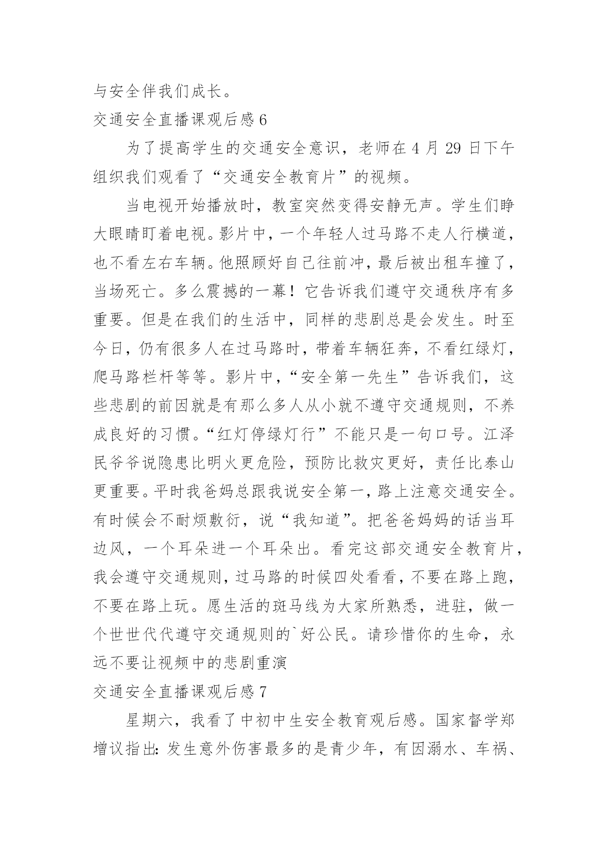 交通安全直播课观后感交通安全直播课观后感当看完一部影视作品后,相信大家有很多值得分享的东西吧,这时候最关键的观后感不能忘了。现在你是否对观后感一筹莫展呢?以下是小编为大家整理的交通安全直播课观后感,仅供参考,希望能够帮助到大家。交通安全直播课观后感13月25日电记者孔大为报道:每年3月最后一周的星期一,是“全国中小学生安全教育日”。在第26个“全国中小学生安全教育日”来临之际,公安部交通管理局、教育部基础教育司和共青团中央少年部联合组织开展以“知危险、会避险”为主题的交通安全体验课,该体验课将于3月28日19时30分至20时10分在线举办。此次交通安全体验课是由公安部交通管理局、教育部基础教育司、共青团中央少年部共同指导,由公安部道路交通安全研究中心、中国少年儿童新闻出版总社、中央广播电视总台体育青少节目中心、中国青少年发展基金会和中国交通频道主办,中国少年儿童新闻出版总社知心姐姐教育服务中心和未来网承办。公众可通过公安部交通管理局微博、央视频等途径在线观看。孩子是祖国的未来、民族的'希望,万般呵护,不如教孩子学会自我保护。公安部交通管理局、教育部基础教育司、共青团中央少年部共同呼吁,一起相约“知危险、会避险”交通安全体验课,共同关注孩子出行安全,一起创造安全畅通和谐有序的道路交通环境,守护孩子们的健康成长。交通安全直播课观后感2“放学回家不要慌,玩耍不在路中央,追逐打闹最危险,来往车多不安全。”“过马路,左右瞧,大家要走人行横道。公路若无斑马线,执行通道误打闹。远离汽车不猛跑,迅速通行安全好。”……每每唱着老师教我们的有关安全的歌谣,我就会想起老师告诉我们的一则安全事故。事故是这样发生的:两个男孩和一个女孩在放学回家的路上,那两个男孩很淘气,逗那个女孩,故意去弄那女孩的头发,把她的头发弄得乱乱的。女孩很生气,拿起地上的一根树枝,朝着其中的一个男孩打去。那个男孩知道要挨打了,连忙跑向前面。正好,前面有一个班马线都没有车辆行驶,就跑了过去,女孩见了也追了上去。不幸的事情就这样发生了,一辆大货车开了过来,因为事情太突然,只听得那“滋——”的一声刺耳的'刹车声,还是不能阻挡不幸的发生,那个女孩就这样走了。所以,亲爱的同学们,为了我们的生命,为了我们的安全,上学、放学路上一定要注意以下几点:一:在放学回家的路上不打闹。二:不许闯红灯。三:不许边吃东西,边骑车。做到高高兴兴去上学,平平安安回家去。交通安全直播课观后感3今天下午我校全体师生大操场上听了交通大队卫队长的精彩讲座,我的心情此起彼浮,久久不能平静。卫队长讲的内容十分丰富:首先,卫队长说出了令人惊讶的数字,那就是我国每年因车货死亡人数大约是二百七十几万人,其中学生死亡人数为一万六千人,平均每天有四十个学生因为车祸而夺去宝贵的生命。这些数字是多么的可怕呀!魏队长继续给我们讲了不能乘坐超载的车辆,因为人坐多了不安全。我记得有一次,我和妈妈乘坐环城回家,当时有点晚了着急回家,这时过来了一辆面包车,车上面挤满了人,密密麻麻的,司机说还有小板凳可以坐,我当时只顾要快点回到家准备上车时,妈妈提醒了我人太多了不能坐,我们再等等。卫队长还讲了交通信号灯,不坐无牌车,不酒后开车等等和一些和我们年龄相仿不遵守交通规则被车撞的'一些典型案例。通过这次讲座使我明白:马路是一个无形的杀手,我们必须认真严格的遵守交通规则,走斑马线,不横穿马路,希望大家一起好好遵守交通规则吧!交通安全直播课观后感4说到“交通”这个词,大家一定会把它和生命连在一起,因为它与我们的生命财产息息相关。随着社会的发展,交通事业为我们的生活和生产提供了便利条件,与此同时,它也时时刻刻威胁着我们的生命财产的安全,交通事故已成为社会的重大问题之一。由于一些人交通意识的淡薄,平坦的马路经常上演一场场人间悲剧,那车轮下的'无辜生命和失去亲人催人心碎的哭声,有谁不会感到痛心,他们带走的是欢乐、幸福、和谐,留下的是灾难、思念、痛苦,这血的教训,生命的代价,难道还换不回我们遵守交通法规,时刻注意安全的自觉性吗?交通安全是生命的纽带,我们要从小树立安全第一的思想,才能实现辉煌的梦想,幸福和欢乐才能永远伴随着我们。同学们,朋友们,请大家警觉起来,坚决遵守交通安全。交通安全直播课观后感5交通安全以前只是知道一些知识,但是对于交通安全没有什么深刻的认知,从这次的秋季开学交通安全亲子课中,看到那一个个触目惊心的例子,才知道了交通安全的重要性。平时,大家总说要注意安全,珍惜声明,但是却总是忽视安全交通,总是觉得自己没那么倒霉,过马路的时候也不注意,心存侥幸。但是车祸的发生永远是那么随机,却是生命不能承受之重,一次的小小疏忽都是很很重的'后果。我们的生命只有一次,所以对待交通安全要严谨。交通安全多么重要啊,我们就应该从小自觉遵守交通规则,不要翻越道路中央的安
