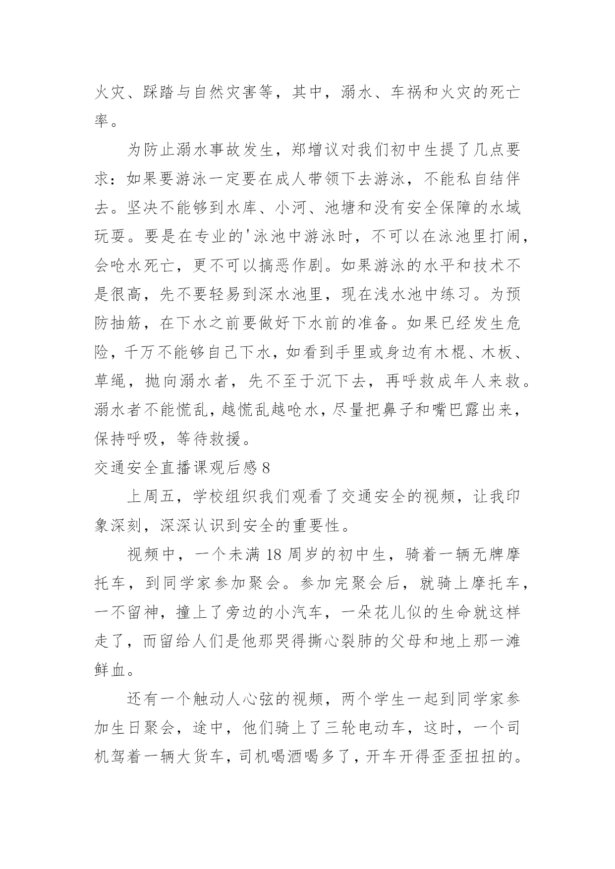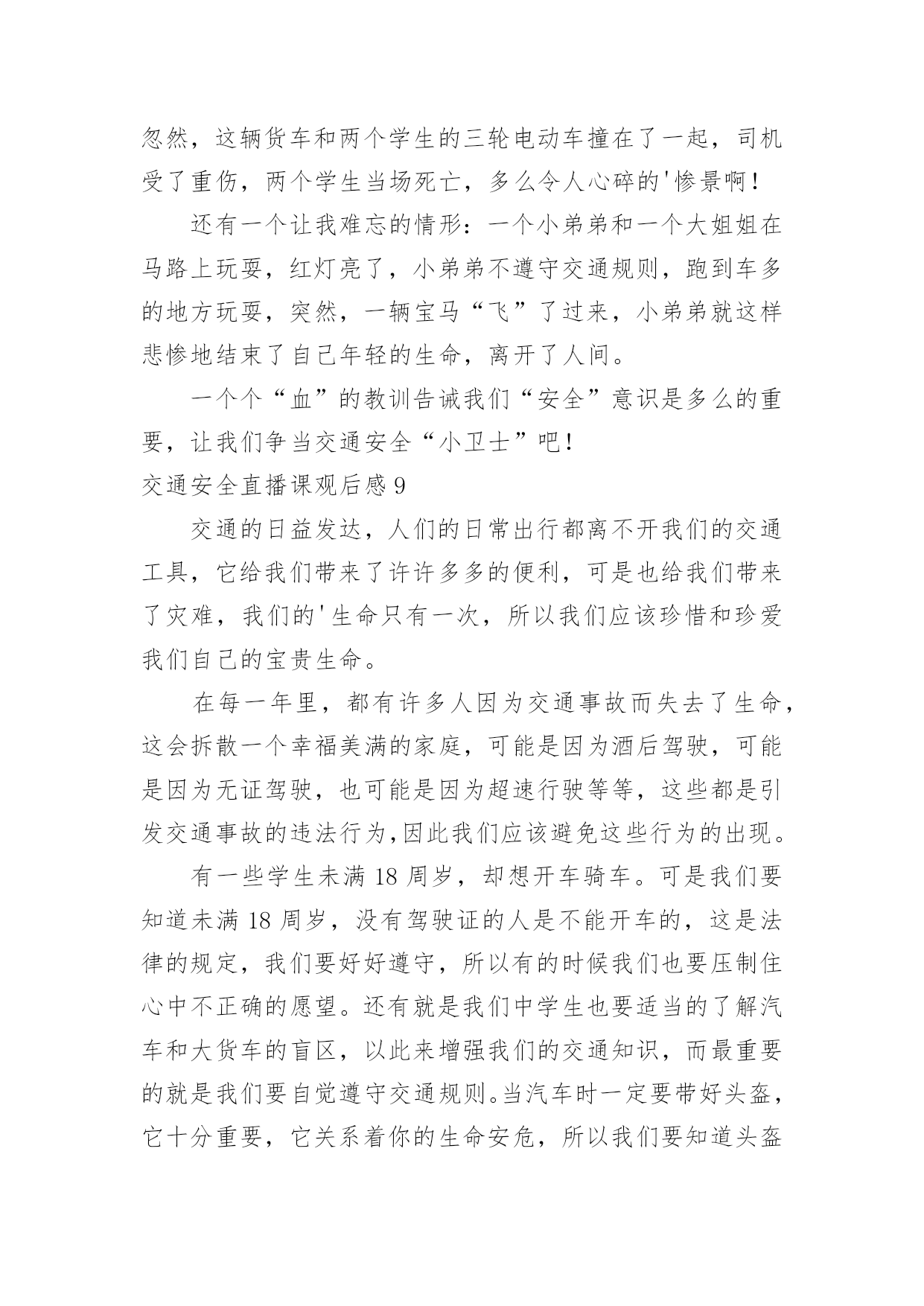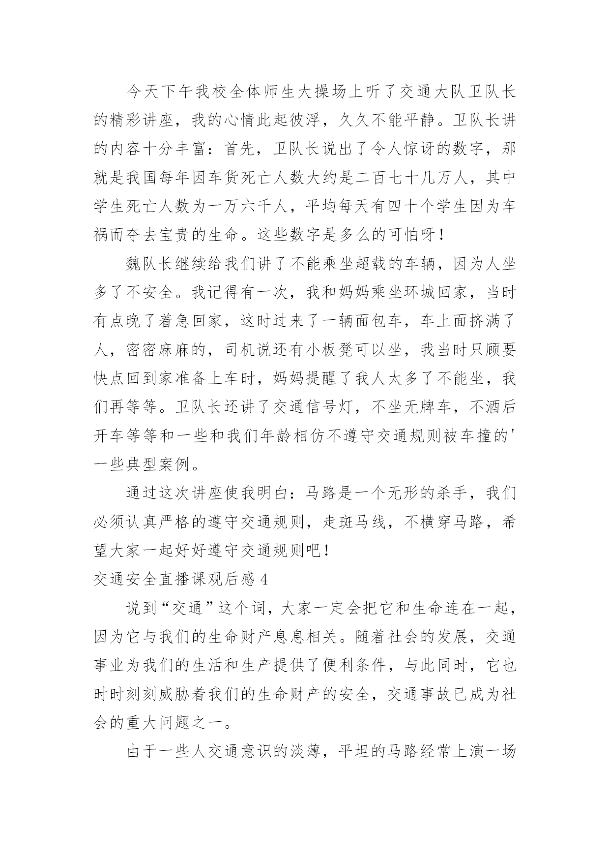 交通安全直播课观后感交通安全直播课观后感当看完一部影视作品后,相信大家有很多值得分享的东西吧,这时候最关键的观后感不能忘了。现在你是否对观后感一筹莫展呢?以下是小编为大家整理的交通安全直播课观后感,仅供参考,希望能够帮助到大家。交通安全直播课观后感13月25日电记者孔大为报道:每年3月最后一周的星期一,是“全国中小学生安全教育日”。在第26个“全国中小学生安全教育日”来临之际,公安部交通管理局、教育部基础教育司和共青团中央少年部联合组织开展以“知危险、会避险”为主题的交通安全体验课,该体验课将于3月28日19时30分至20时10分在线举办。此次交通安全体验课是由公安部交通管理局、教育部基础教育司、共青团中央少年部共同指导,由公安部道路交通安全研究中心、中国少年儿童新闻出版总社、中央广播电视总台体育青少节目中心、中国青少年发展基金会和中国交通频道主办,中国少年儿童新闻出版总社知心姐姐教育服务中心和未来网承办。公众可通过公安部交通管理局微博、央视频等途径在线观看。孩子是祖国的未来、民族的'希望,万般呵护,不如教孩子学会自我保护。公安部交通管理局、教育部基础教育司、共青团中央少年部共同呼吁,一起相约“知危险、会避险”交通安全体验课,共同关注孩子出行安全,一起创造安全畅通和谐有序的道路交通环境,守护孩子们的健康成长。交通安全直播课观后感2“放学回家不要慌,玩耍不在路中央,追逐打闹最危险,来往车多不安全。”“过马路,左右瞧,大家要走人行横道。公路若无斑马线,执行通道误打闹。远离汽车不猛跑,迅速通行安全好。”……每每唱着老师教我们的有关安全的歌谣,我就会想起老师告诉我们的一则安全事故。事故是这样发生的:两个男孩和一个女孩在放学回家的路上,那两个男孩很淘气,逗那个女孩,故意去弄那女孩的头发,把她的头发弄得乱乱的。女孩很生气,拿起地上的一根树枝,朝着其中的一个男孩打去。那个男孩知道要挨打了,连忙跑向前面。正好,前面有一个班马线都没有车辆行驶,就跑了过去,女孩见了也追了上去。不幸的事情就这样发生了,一辆大货车开了过来,因为事情太突然,只听得那“滋——”的一声刺耳的'刹车声,还是不能阻挡不幸的发生,那个女孩就这样走了。所以,亲爱的同学们,为了我们的生命,为了我们的安全,上学、放学路上一定要注意以下几点:一:在放学回家的路上不打闹。二:不许闯红灯。三:不许边吃东西,边骑车。做到高高兴兴去上学,平平安安回家去。交通安全直播课观后感3今天下午我校全体师生大操场上听了交通大队卫队长的精彩讲座,我的心情此起彼浮,久久不能平静。卫队长讲的内容十分丰富:首先,卫队长说出了令人惊讶的数字,那就是我国每年因车货死亡人数大约是二百七十几万人,其中学生死亡人数为一万六千人,平均每天有四十个学生因为车祸而夺去宝贵的生命。这些数字是多么的可怕呀!魏队长继续给我们讲了不能乘坐超载的车辆,因为人坐多了不安全。我记得有一次,我和妈妈乘坐环城回家,当时有点晚了着急回家,这时过来了一辆面包车,车上面挤满了人,密密麻麻的,司机说还有小板凳可以坐,我当时只顾要快点回到家准备上车时,妈妈提醒了我人太多了不能坐,我们再等等。卫队长还讲了交通信号灯,不坐无牌车,不酒后开车等等和一些和我们年龄相仿不遵守交通规则被车撞的'一些典型案例。通过这次讲座使我明白:马路是一个无形的杀手,我们必须认真严格的遵守交通规则,走斑马线,不横穿马路,希望大家一起好好遵守交通规则吧!交通安全直播课观后感4说到“交通”这个词,大家一定会把它和生命连在一起,因为它与我们的生命财产息息相关。随着社会的发展,交通事业为我们的生活和生产提供了便利条件,与此同时,它也时时刻刻威胁着我们的生命财产的安全,交通事故已成为社会的重大问题之一。由于一些人交通意识的淡薄,平坦的马路经常上演一场场人间悲剧,那车轮下的'无辜生命和失去亲人催人心碎的哭声,有谁不会感到痛心,他们带走的是欢乐、幸福、和谐,留下的是灾难、思念、痛苦,这血的教训,生命的代价,难道还换不回我们遵守交通法规,时刻注意安全的自觉性吗?交通安全是生命的纽带,我们要从小树立安全第一的思想,才能实现辉煌的梦想,幸福和欢乐才能永远伴随着我们。同学们,朋友们,请大家警觉起来,坚决遵守交通安全。交通安全直播课观后感5交通安全以前只是知道一些知识,但是对于交通安全没有什么深刻的认知,从这次的秋季开学交通安全亲子课中,看到那一个个触目惊心的例子,才知道了交通安全的重要性。平时,大家总说要注意安全,珍惜声明,但是却总是忽视安全交通,总是觉得自己没那么倒霉,过马路的时候也不注意,心存侥幸。但是车祸的发生永远是那么随机,却是生命不能承受之重,一次的小小疏忽都是很很重的'后果。我们的生命只有一次,所以对待交通安全要严谨。交通安全多么重要啊,我们就应该从小自觉遵守交通规则,不要翻越道路中央的安