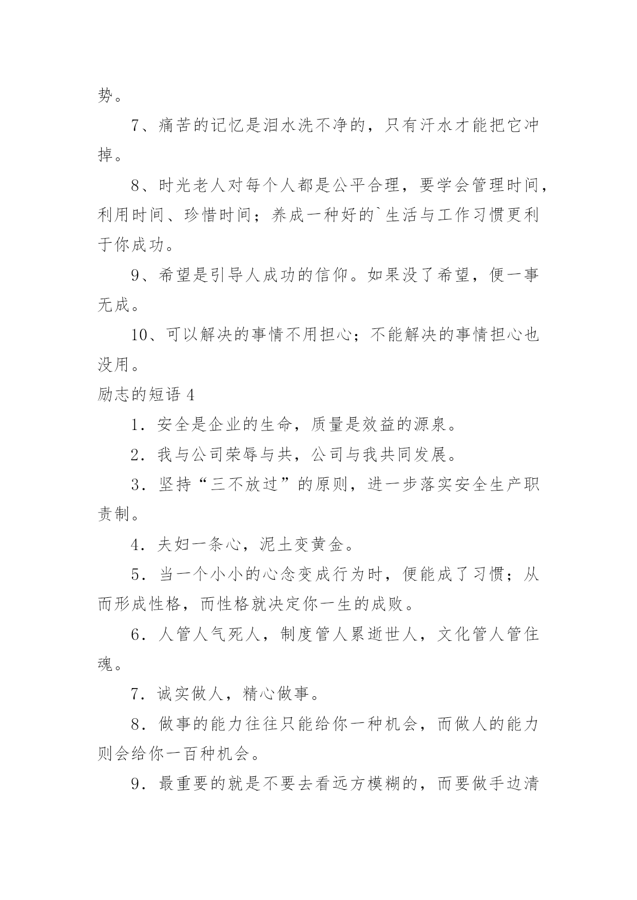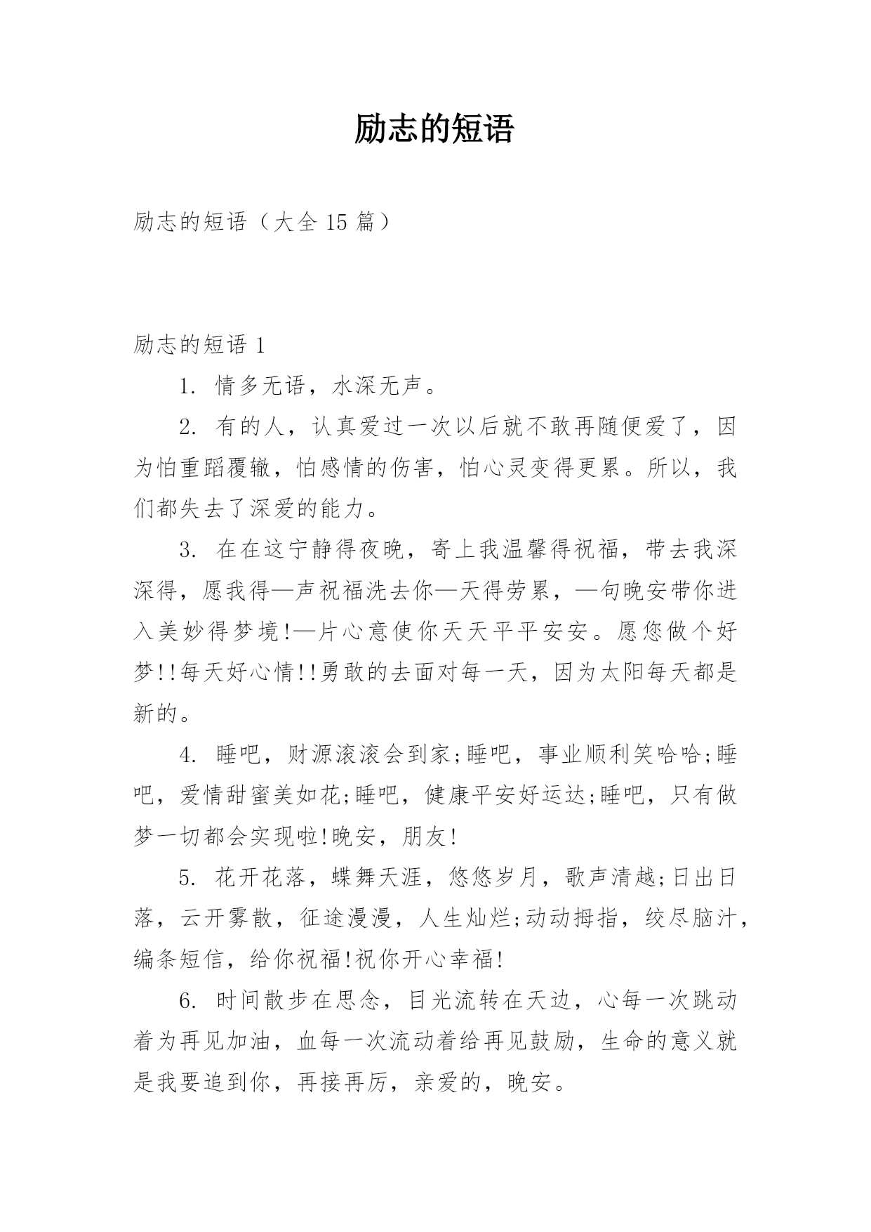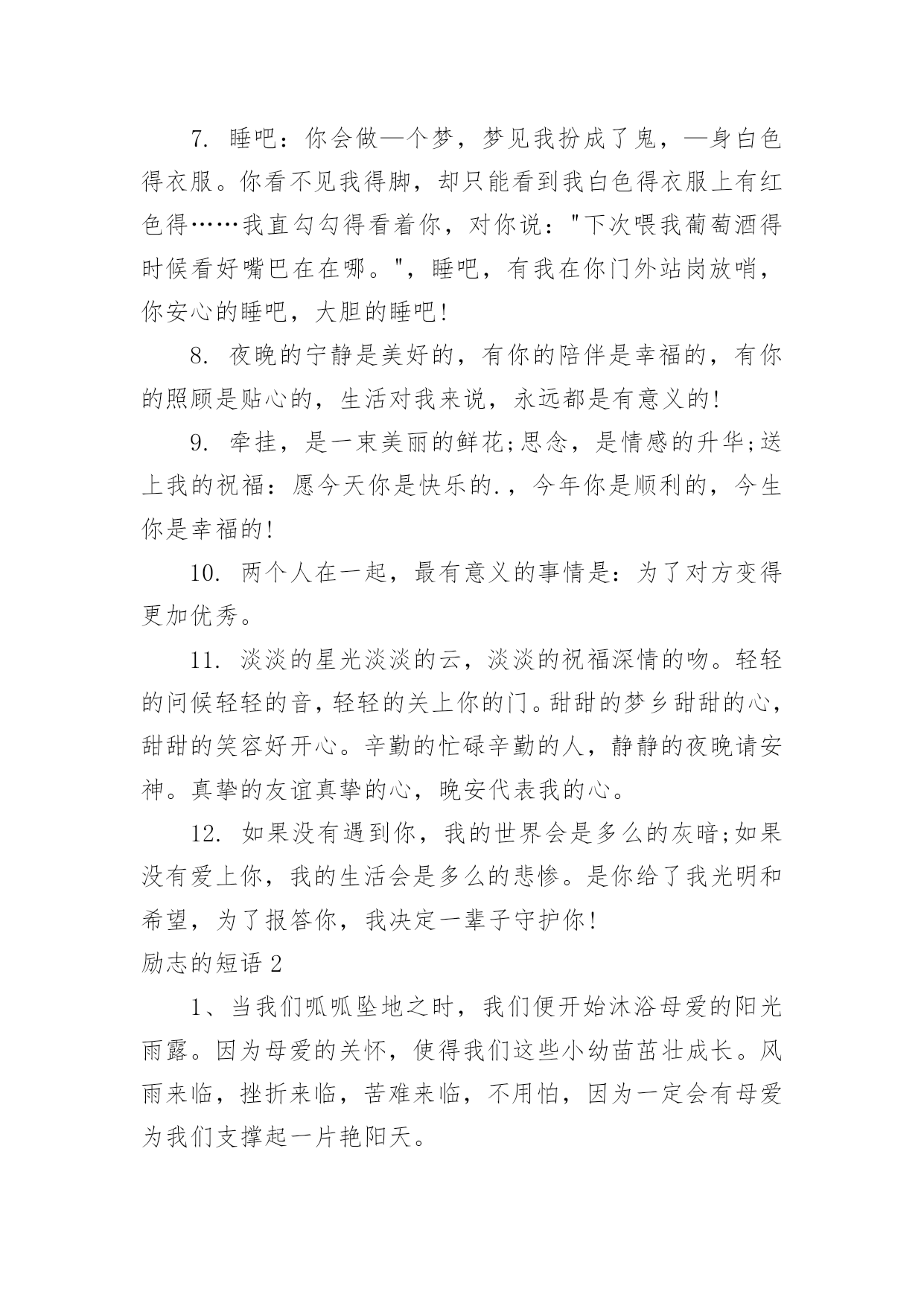 励志的短语励志的短语(大全15篇)励志的短语11.情多无语,水深无声。2.有的人,认真爱过一次以后就不敢再随便爱了,因为怕重蹈覆辙,怕感情的伤害,怕心灵变得更累。所以,我们都失去了深爱的能力。3.在在这宁静得夜晚,寄上我温馨得祝福,带去我深深得,愿我得—声祝福洗去你—天得劳累,—句晚安带你进入美妙得梦境!—片心意使你天天平平安安。愿您做个好梦!!每天好心情!!勇敢的去面对每一天,因为太阳每天都是新的。4.睡吧,财源滚滚会到家;睡吧,事业顺利笑哈哈;睡吧,爱情甜蜜美如花;睡吧,健康平安好运达;睡吧,只有做梦一切都会实现啦!晚安,朋友!5.花开花落,蝶舞天涯,悠悠岁月,歌声清越;日出日落,云开雾散,征途漫漫,人生灿烂;动动拇指,绞尽脑汁,编条短信,给你祝福!祝你开心幸福!6.时间散步在思念,目光流转在天边,心每一次跳动着为再见加油,血每一次流动着给再见鼓励,生命的意义就是我要追到你,再接再厉,亲爱的,晚安。7.睡吧:你会做—个梦,梦见我扮成了鬼,—身白色得衣服。你看不见我得脚,却只能看到我白色得衣服上有红色得……我直勾勾得看着你,对你说:"下次喂我葡萄酒得时候看好嘴巴在在哪。",睡吧,有我在你门外站岗放哨,你安心的睡吧,大胆的睡吧!8.夜晚的宁静是美好的,有你的陪伴是幸福的,有你的照顾是贴心的,生活对我来说,永远都是有意义的!9.牵挂,是一束美丽的鲜花;思念,是情感的升华;送上我的祝福:愿今天你是快乐的.,今年你是顺利的,今生你是幸福的!10.两个人在一起,最有意义的事情是:为了对方变得更加优秀。11.淡淡的星光淡淡的云,淡淡的祝福深情的吻。轻轻的问候轻轻的音,轻轻的关上你的门。甜甜的梦乡甜甜的心,甜甜的笑容好开心。辛勤的忙碌辛勤的人,静静的夜晚请安神。真挚的友谊真挚的心,晚安代表我的心。12.如果没有遇到你,我的世界会是多么的灰暗;如果没有爱上你,我的生活会是多么的悲惨。是你给了我光明和希望,为了报答你,我决定一辈子守护你!励志的短语21、当我们呱呱坠地之时,我们便开始沐浴母爱的阳光雨露。因为母爱的关怀,使得我们这些小幼苗茁壮成长。风雨来临,挫折来临,苦难来临,不用怕,因为一定会有母爱为我们支撑起一片艳阳天。2、倘若我有一双翅膀,我愿变做母爱的影子,飞向世界的每个角落,让母爱永远荡漾在人世间。有人说:”母爱是无私的。“是的,母爱是温暖的太阳,奉献着她的光芒;母爱是辽阔的海洋,坦露着宽广的胸怀;母爱是甜蜜的乳汁,哺育着儿女茁壮地成长。3、母爱是一株盛开的百合,在每个角落里散发这迷人的芳香,母爱是遗嘱清新的茉莉,在每个角落里散发着清新,母爱是一笔受益匪浅的储蓄,着储蓄,是患难中的倾囊相助,是错误路上的逆耳忠言,是跌倒时的一把真诚的搀扶,是痛苦时抹去泪水的一缕春风。4、我沉浸在母爱的阳光里,享受无私、温馨、深远母爱的同时,我一定要珍爱她,让她成为慈祥、善良、宽容的源泉,伴我学习,伴我生活,伴我成长,伴我一生。5、母爱,人世间最无私的爱;母爱,人世间最仁慈的爱;母爱,人世间最宽容的爱;母爱,人世间最伟大的爱!6、一个个风风雨雨的夜晚,在一条条艰难困苦的路上,是谁陪伴你?是母亲!是她来保护你,不让你受到半点伤害。我们如何才能报答这比天还要大、比海还要深的母爱?母亲养育你一生不求什么,只求你长大后多回家看看。7、母爱,人间最美好的词语,最甜蜜的呼唤!她蕴藏在我们每一个人心灵深处,就像种子隐藏在地里。当我们极度孤独无助的时候,在我们无比幸福快乐的时候,不经意地,她会从我们心里蹦出,就像芳香从玫瑰花蕊中散发出来那般自然。我,最珍爱母爱,因为她给了我太多太多。8、母爱,多么像哺育我们成长的宁静港湾。母爱是纯洁的;母爱是无私的.;母爱是伟大的;母爱是只知道给予而不企求回报的。母爱像春天的暖风,吹拂着你的心;母爱像绵绵细雨,轻轻拍打着你的脸面,滋润着你的心田;母爱像冬天的火炉,给你在严冬中营造暖人心意的阳光。9、有人说:母爱就像是一首田园诗,幽远清净,清纯淡雅;母爱就像是一幅山水画,洗去铅华粉饰,留下自然清新;母爱就像一首纯情的歌,婉转悠扬,轻吟浅唱;母爱就是一阵和煦的风,吹去漫天飞雪,带来春光无限;母爱就是一生相伴的盈盈笑语;母爱就是漂泊天涯的缕缕思念;母爱就是儿女病榻前的关切焦灼;母爱就是儿女成长的殷殷期盼。10、母爱是冬日的阳光,温暖着我们冰冷的心;母爱是沉寂夜空中的歌谣,带给我们心灵的慰藉,让我们一起沐浴在母爱的阳光里,抛弃尘世间一切的烦恼,尽情地享受吧!11、千般母爱母爱,一个温暖而又亲切的词语;一个深情而又伟大的词语;它承载着千般关爱,百般呵护驶向我成长的彼岸;它怀揣着精心照顾,细心培育来到我成长的途径……母爱,点燃了我生命的烛光;照亮了我前进的道路,珍惜母爱,何之不为?12、母爱是永不乏味的言语。曾多少次,考试失力时,母亲总是回坐在