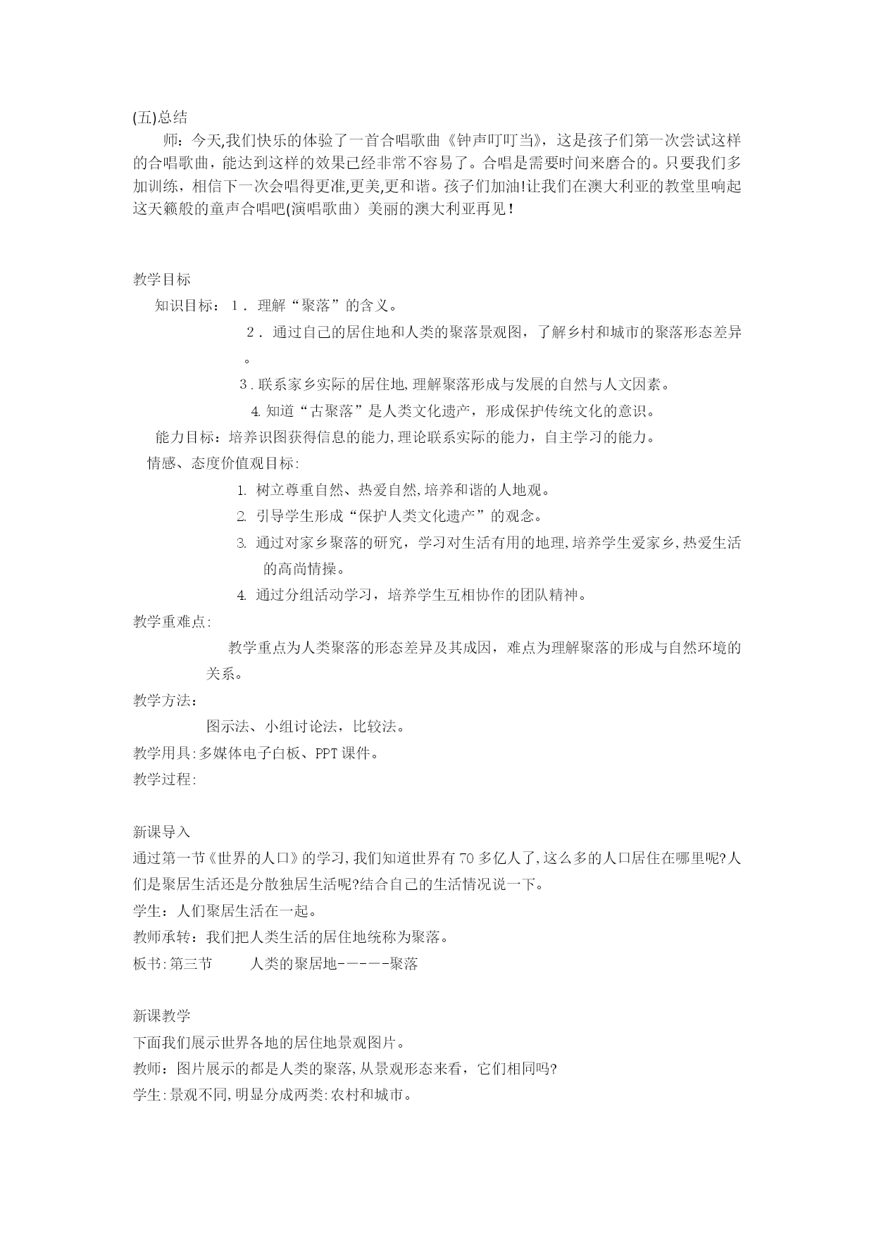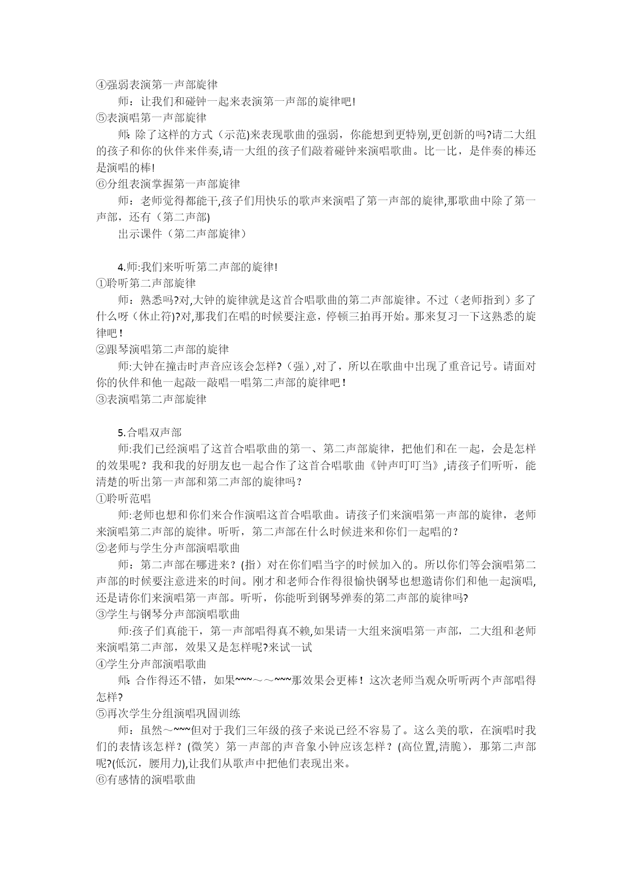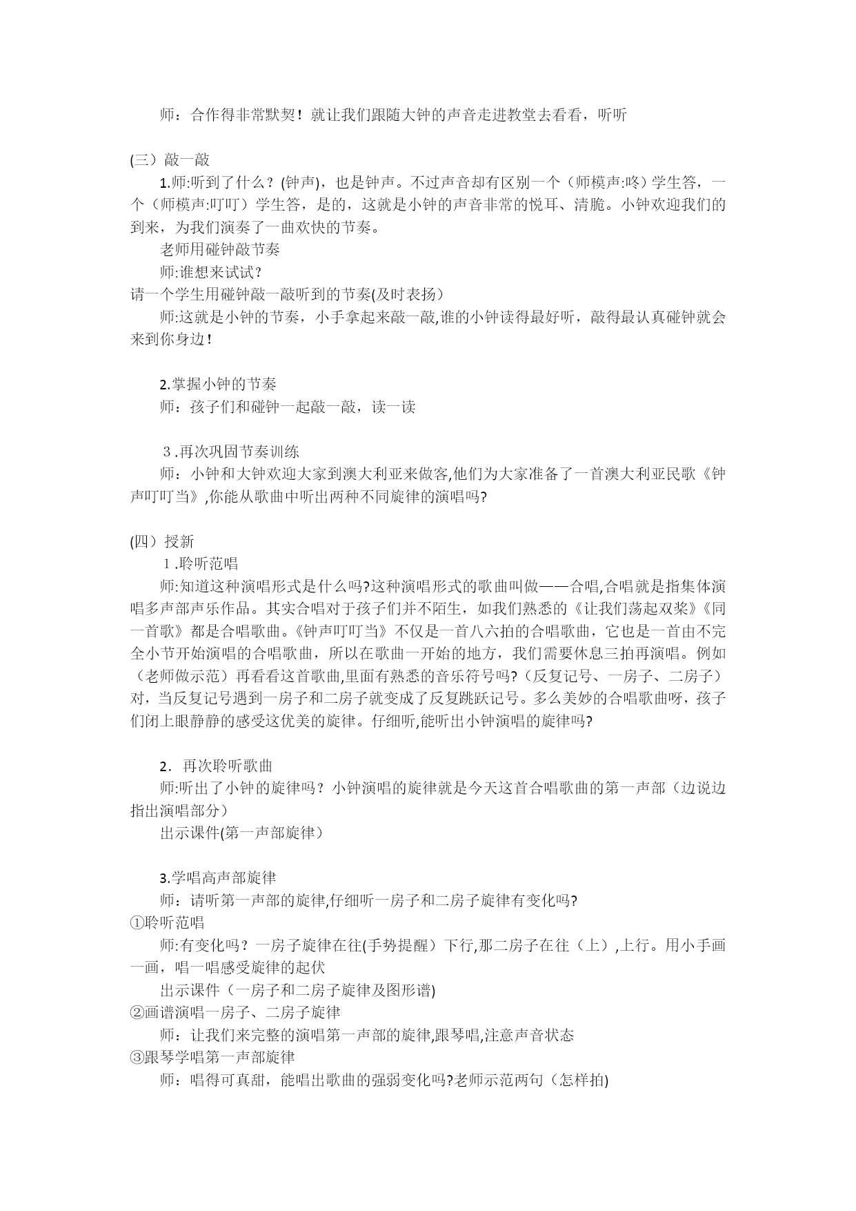 《钟声叮叮当》教学设计一、教学目标1.引导学生认真地聆听音乐作品,感受6/8拍的韵律美、旋律美、强弱的美,能用自然优美的声音来演唱歌曲《钟声叮叮当》。2.引导学生初步尝试表现二声部合唱歌曲的音准和声部间的和谐。3.感受和体验美妙的钟声,使之乐于参与音乐活动,增强音乐学习的热情和兴趣。评论二、教学重点难点能准确演唱歌曲的第一、第二声部旋律并合唱双声部三、教学过程(一)导入1.师:孩子们,瞧,谁来了?(小袋鼠)可爱的小袋鼠将带着大家去它美丽的家乡澳大利亚旅游,让我们一起去感受一下异国风情吧!出示课件(观看澳大利亚风景图)2.师:这就是美丽的澳大利亚,现在我们来到的是澳大利亚的首都——堪培拉,这是一座美丽的花园城市;听,海浪轻轻拍击海岸,这就是澳大利亚最著名的海港城市——悉尼,美丽的悉尼歌剧院就是这座城市的标志性建筑。呼吸着带着青草味的芳香,静静地躺在绿茵茵的草坪上,听,耳畔传来了什么?(二)唱一唱1.师:听到了什么?简单的模仿一下。这钟声听起来怎样?生答。师:对,低沉的钟声从远处传来。好像是教堂里有人在敲击大钟呢。听听大钟的旋律有什么变化?2.聆听大钟的旋律出示课件(大钟的简谱旋律)师:有变化吗?先唱的“1”音,再唱低音“5”最后回到“1”,看这是什么符号(休止符),因为有了休止符所以最后的“1”只唱3拍就停。那我们来唱唱旋律中的这两个音。3.跟琴唱“1”和低音“5”师:让我们来唱唱大钟的旋律吧!演唱时注意旋律的变化。4.跟琴学唱大钟的旋律师:多么浑厚的大钟,让我们用跺脚的方式来为旋律伴奏吧!注意这是一首6/8拍的歌曲在唱歌时注意有6拍的地方要唱够。5.跺脚表演唱大钟的旋律师:十分精彩!配上词再唱唱,看谁的大钟唱得最低沉,浑厚!6.带词演唱大钟的旋律师:孩子们表现得真不错,我觉得二大组的孩子们唱得最认真,请你们再来唱唱,一大组的孩子咱们也别闲着,和同伴用击掌的方式来为他们伴奏吧!师:合作得非常默契!就让我们跟随大钟的声音走进教堂去看看,听听(三)敲一敲1.师:听到了什么?(钟声),也是钟声。不过声音却有区别一个(师模声:咚)学生答,一个(师模声:叮叮)学生答,是的,这就是小钟的声音非常的悦耳、清脆。小钟欢迎我们的到来,为我们演奏了一曲欢快的节奏。老师用碰钟敲节奏师:谁想来试试?请一个学生用碰钟敲一敲听到的节奏(及时表扬)师:这就是小钟的节奏,小手拿起来敲一敲,谁的小钟读得最好听,敲得最认真碰钟就会来到你身边!2.掌握小钟的节奏师:孩子们和碰钟一起敲一敲,读一读3.再次巩固节奏训练师:小钟和大钟欢迎大家到澳大利亚来做客,他们为大家准备了一首澳大利亚民歌《钟声叮叮当》,你能从歌曲中听出两种不同旋律的演唱吗?(四)授新1.聆听范唱师:知道这种演唱形式是什么吗?这种演唱形式的歌曲叫做——合唱,合唱就是指集体演唱多声部声乐作品。其实合唱对于孩子们并不陌生,如我们熟悉的《让我们荡起双桨》《同一首歌》都是合唱歌曲。《钟声叮叮当》不仅是一首八六拍的合唱歌曲,它也是一首由不完全小节开始演唱的合唱歌曲,所以在歌曲一开始的地方,我们需要休息三拍再演唱。例如(老师做示范)再看看这首歌曲,里面有熟悉的音乐符号吗?(反复记号、一房子、二房子)对,当反复记号遇到一房子和二房子就变成了反复跳跃记号。多么美妙的合唱歌曲呀,孩子们闭上眼静静的感受这优美的旋律。仔细听,能听出小钟演唱的旋律吗?2.再次聆听歌曲师:听出了小钟的旋律吗?小钟演唱的旋律就是今天这首合唱歌曲的第一声部(边说边指出演唱部分)出示课件(第一声部旋律)3.学唱高声部旋律师:请听第一声部的旋律,仔细听一房子和二房子旋律有变化吗?①聆听范唱师:有变化吗?一房子旋律在往(手势提醒)下行,那二房子在往(上),上行。用小手画一画,唱一唱感受旋律的起伏出示课件(一房子和二房子旋律及图形谱)②画谱演唱一房子、二房子旋律师:让我们来完整的演唱第一声部的旋律,跟琴唱,注意声音状态③跟琴学唱第一声部旋律师:唱得可真甜,能唱出歌曲的强弱变化吗?老师示范两句(怎样拍)④强弱表演第一声部旋律师:让我们和碰钟一起来表演第一声部的旋律吧!⑤表演唱第一声部旋律师:除了这样的方式(示范)来表现歌曲的强弱,你能想到更特别,更创新的吗?请二大组的孩子和你的伙伴来伴奏,请一大组的孩子们敲着碰钟来演唱歌曲。比一比,是伴奏的棒还是演唱的棒!⑥分组表演掌握第一声部旋律师:老师觉得都能干,孩子们用快乐的歌声来演唱了第一声部的旋律,那歌曲中除了第一声部,还有(第二声部)出示课件(第二声部旋律)4.师:我们来听听第二声部的旋律!①聆听第二声部旋律师:熟悉吗?对,大钟的旋律就是这首合唱歌曲的第二声部旋