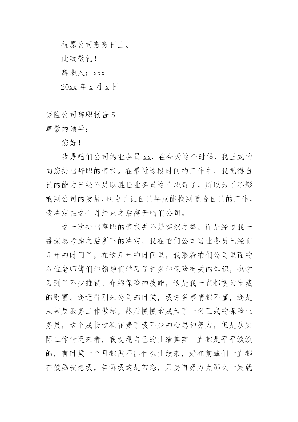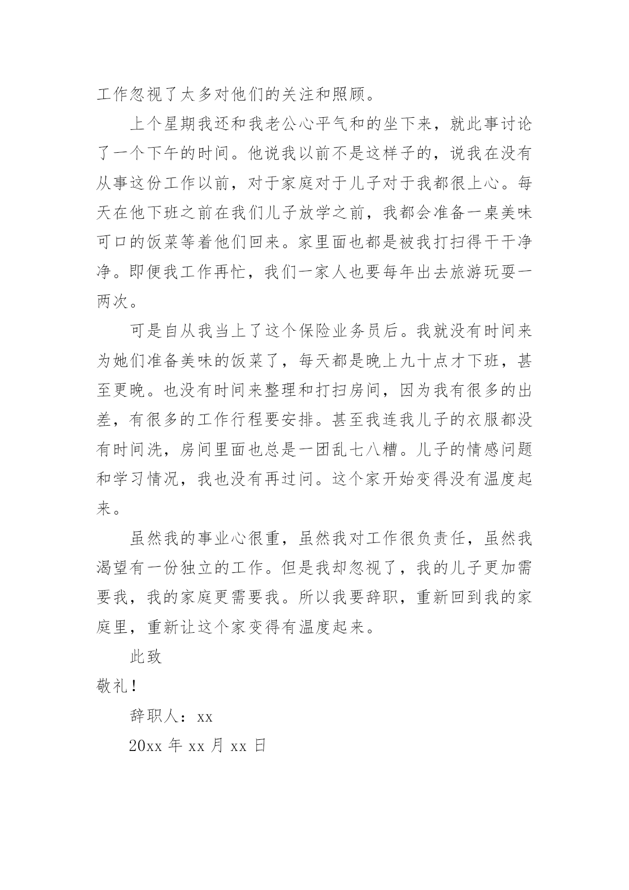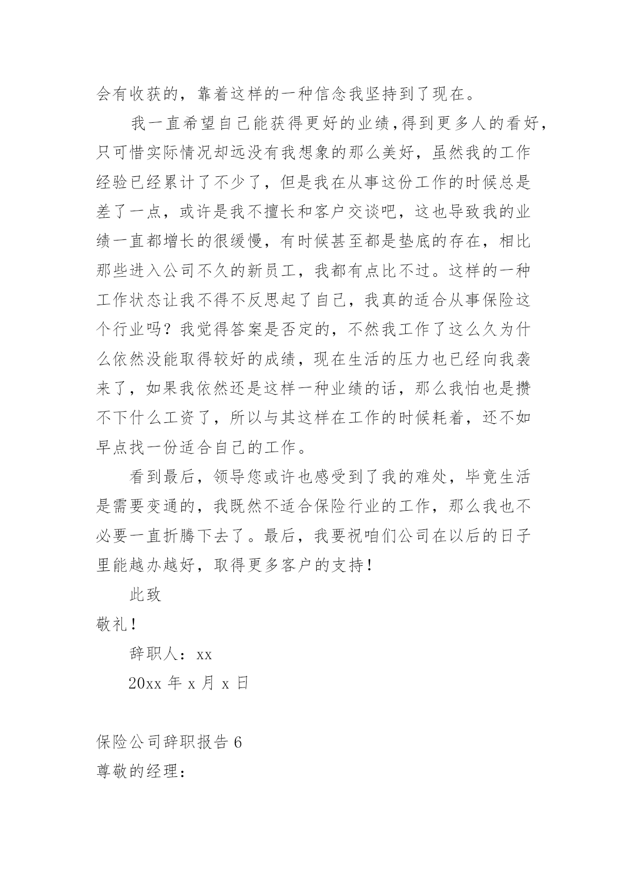 保险公司辞职报告现今,换工作是一件再正常不过的事了,有时会因为一些原因离开岗位,这时候领导就会要求我们写好辞职报告了。那么辞职报告应该包括什么内容呢?以下是小编精心整理的保险公司辞职报告,欢迎大家分享。保险公司辞职报告1尊敬的领导:您好!我是公司里的一名保险业务员,我叫xx。自从来到我们公司以后,我就为了公司的业绩,为了自己的目标而努力奋斗着。我虽然是位女性,但是我从来不甘落后于男性。我觉得女性也可以拥有事业,不仅要拥有自己的事业,还要在自己的事业里干出一番成就出来。所以这几年我为了打拼自己的事业,为了做出一点成绩,我每天除了工作就是工作。甚至把吃饭睡觉的时间都用来花在工作上。甚至我没有时间再来管我儿子的学业,也没能好好的照顾我儿子的生活。答应了她一起去游乐园玩耍的事情也一拖再拖。答应了我老公,全家一起出去旅游的事情,也全部被我出差的计划打乱了。所以这几年下来,我虽然在工作上有了一些成就,但是我的家庭却和我的距离越来越远了。直到上个月我老公跟我提出离婚的事情,而我儿子在知道后也愿意跟他爸爸一起走。我这才意识到这个问题的严重性,才领悟过来这几年我为了工作忽视了太多对他们的关注和照顾。上个星期我还和我老公心平气和的坐下来,就此事讨论了一个下午的时间。他说我以前不是这样子的,说我在没有从事这份工作以前,对于家庭对于儿子对于我都很上心。每天在他下班之前在我们儿子放学之前,我都会准备一桌美味可口的饭菜等着他们回来。家里面也都是被我打扫得干干净净。即便我工作再忙,我们一家人也要每年出去旅游玩耍一两次。可是自从我当上了这个保险业务员后。我就没有时间来为她们准备美味的饭菜了,每天都是晚上九十点才下班,甚至更晚。也没有时间来整理和打扫房间,因为我有很多的出差,有很多的工作行程要安排。甚至我连我儿子的衣服都没有时间洗,房间里面也总是一团乱七八糟。儿子的情感问题和学习情况,我也没有再过问。这个家开始变得没有温度起来。虽然我的事业心很重,虽然我对工作很负责任,虽然我渴望有一份独立的工作。但是我却忽视了,我的儿子更加需要我,我的家庭更需要我。所以我要辞职,重新回到我的家庭里,重新让这个家变得有温度起来。此致敬礼!辞职人:xx20xx年xx月xx日保险公司辞职报告2尊敬的组长、班长、部门经理、人事部经理:你们好,我将于30日后离职,与公司解除劳动关系,依据中华人民共和国劳动合同法第四章第三十七条,现正式予以告知,请尽快安排人员交接相关工作。请上级批准我的申请!谢谢!此致敬礼!辞职人:xxx20xx年xx月xx日保险公司辞职报告3**分公司:因个人职业选择的原因,我现在请求辞去在人保财险××支公司的职位。公司的企业文化感化了我,我对公司是深有感情的。来到人保公司两年了,正是在这里我开始踏上了社会,完成了自己从一个学生到社会人的转变。公司平等的人际关系和开明的工作作风,一度让我有着找到了依靠的感觉,在这里我能开心的工作,开心的学习。我要感谢人保公司两年来对我的培养,从试用到转正,公司给予了我成长的机会和学习发展的平台,各级领导和同事对我的指导、关心和帮助,将使我受益终身。在工作中我不断得到了张经理、汪经理以及各位部门经理的的教导与点拨、指点与帮助;在参加监护人责任险、学幼险承保时,团队合作中得到同事的帮助与协同;在进行疑案调查、代理××支公司出庭应诉处理保险诉讼案件过程中的收获,都使我受益菲浅。而工作之余同事之间亲密友好的关系,则使我终身难忘。离开保险公司的辞职报告辞职信和申请书范文离开保险公司的辞职报告辞职信和申请书范文我从xx年进入公司,正是××支公司经营最困难的时候,我亲身经历了公司摆脱被动不利局面、走上发展的正轨的全过程,同时我也为能在这样一个英明果断的领导班子和团结协作的同事之中工作过而骄傲。我清楚省公司接纳我们这批新人的决策眼光,公司正值用人之际,我很遗憾自己在这个时候向公司正式提出辞职。人保财险××支公司美好的发展前景及良好的合作氛围让我在即将离去之际仍感不舍,但今因个人原因,我已决定离开公司,希望我的离去不会给公司带来任何不便;对分公司各位领导、张经理的赏识与信任,我将终抱感激之情。今后,无论我将怎样生活,我都会永远感激人保公司对我的培养,在我困难的时候,工作中不成熟的时候给我的帮助和宽容。是人保公司给了我现在拥有的一切。我保证并宣誓:一、遵守法律法规、遵守保险职业道德规范。二、保守人保公司商业秘密及各项管理。离开保险公司的辞职报告辞职信和申请书范文各类报告请接受我的辞职请求。人保财险××支公司王××保险公司辞职报告4尊敬的领导:您好!自xx年4月初入职至今,两年多的时间里我在公司策划部担任策划专员期间得到了公司领导的关怀和各位同事热心帮助,在此表示感谢。过去两年多时间里,公司给予了我良好的学习环境和学习机会,部门工作氛围也非常和谐融洽。
