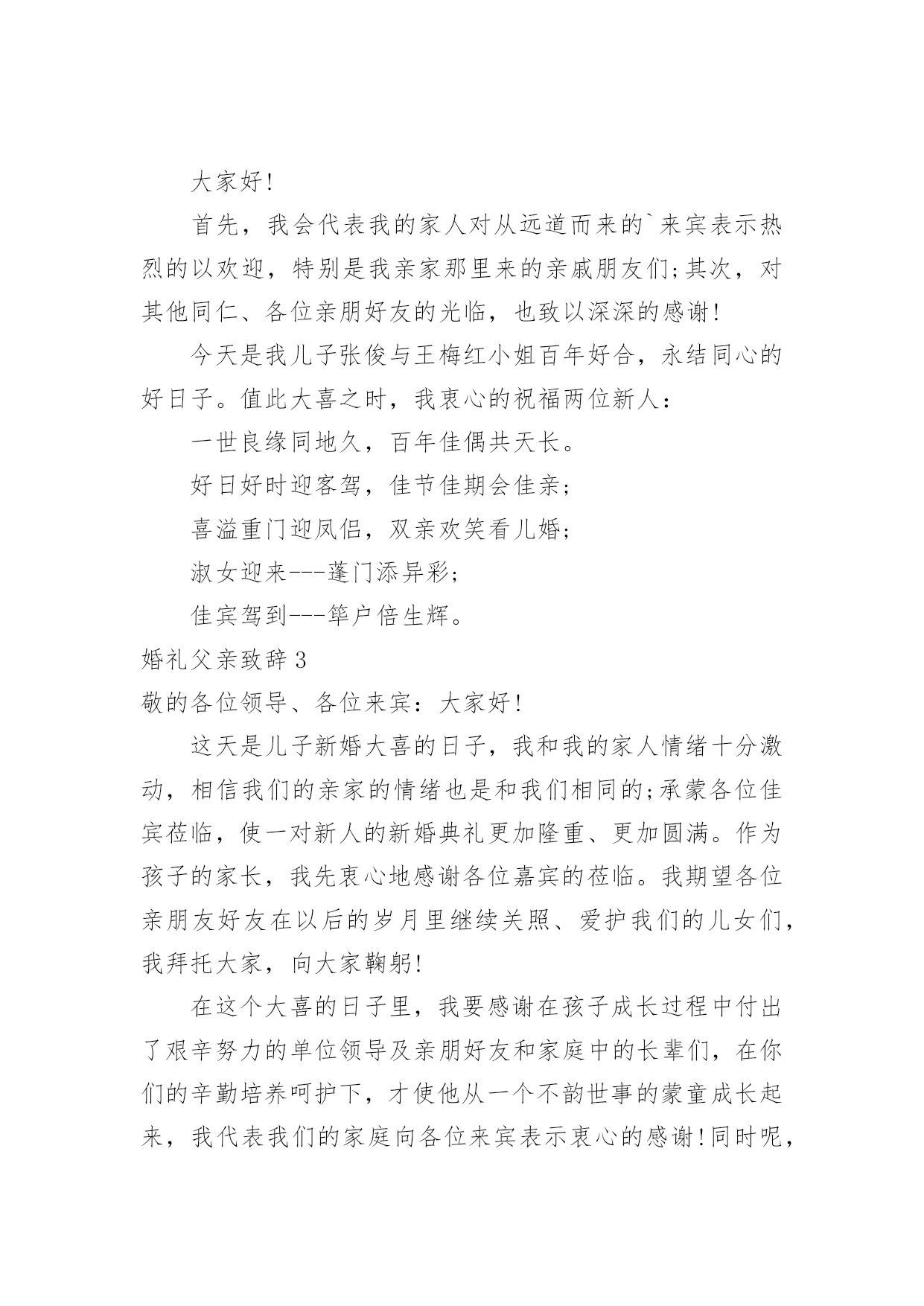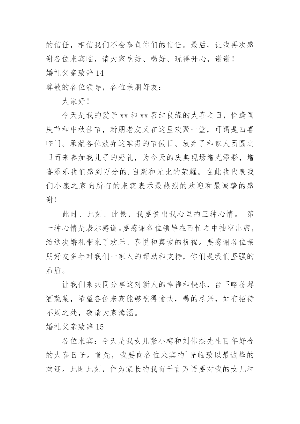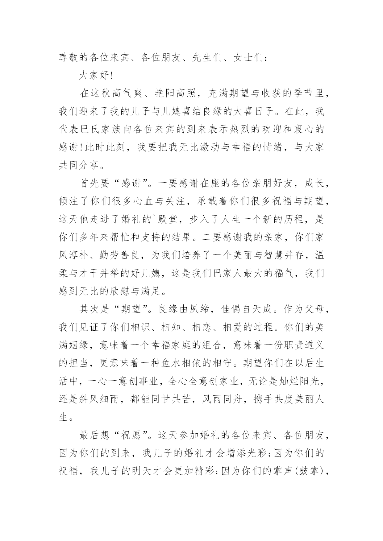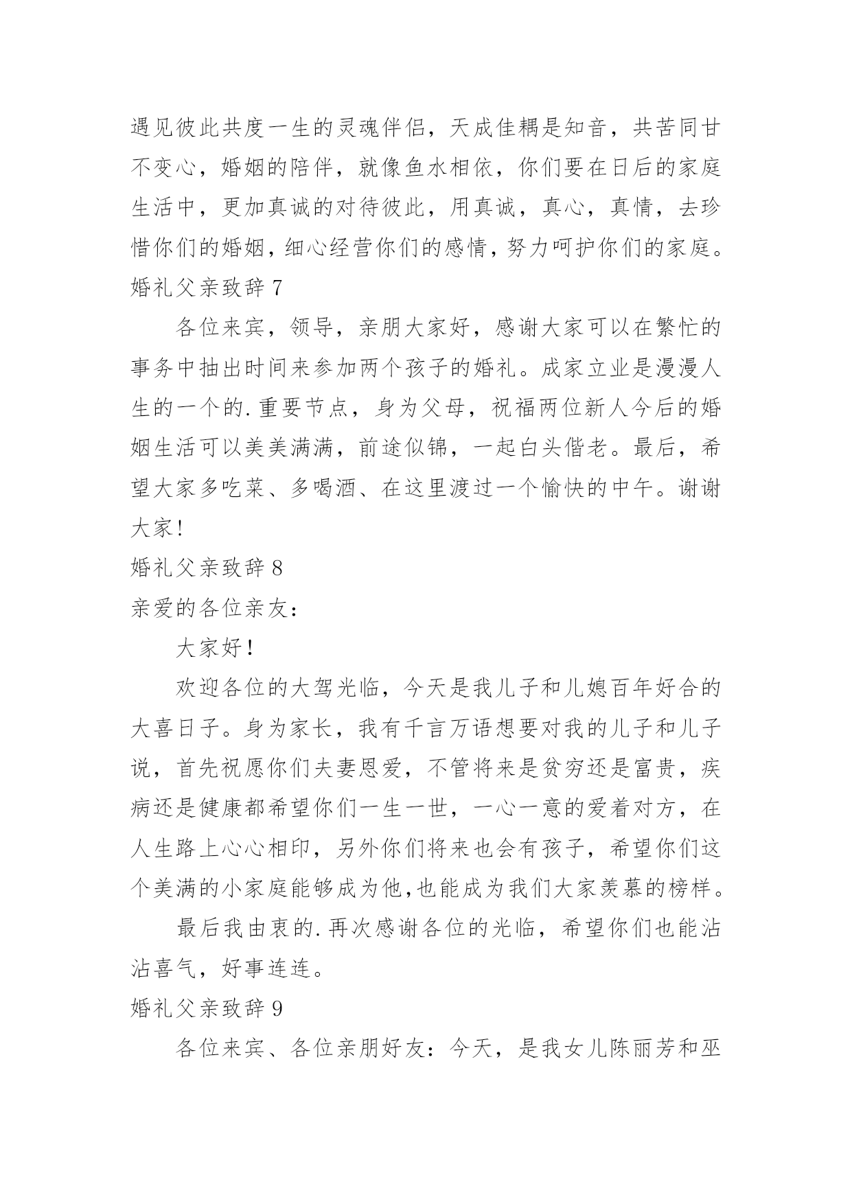 婚礼父亲致辞婚礼父亲致辞在现实生活或工作学习中,大家都不可避免地要接触到致辞吧,致辞要求风格的雅、俗、庄、谐要适当。那什么样的致辞才规范呢?以下是小编整理的婚礼父亲致辞,希望对大家有所帮助。婚礼父亲致辞1尊敬的亲朋好友、各位来宾:大家好!今天是爱女xx和爱婿xx百年好合的大喜日子,作为女方的父亲,我的心情非常激动,我首先代表我全家对大家的到来表示最热烈的欢迎和诚挚的感谢!此时此刻,我要嘱咐我的女儿及女婿,希望他们婚后要多孝敬父母长辈,要互敬互爱、互相关心、互相帮助,共同努力建立一个幸福美满的家庭,希望女儿常回家看看。如此美好的时刻,再多的语言也难以表达我此时此刻的'心情,我希望在座的亲朋好友和来宾们,能够尽情的享受这里的一切,喝的尽兴,吃得高兴!谢谢大家!婚礼父亲致辞2尊敬的各位来宾、各位亲朋好友!女士们,先生们!大家好!首先,我会代表我的家人对从远道而来的`来宾表示热烈的以欢迎,特别是我亲家那里来的亲戚朋友们;其次,对其他同仁、各位亲朋好友的光临,也致以深深的感谢!今天是我儿子张俊与王梅红小姐百年好合,永结同心的好日子。值此大喜之时,我衷心的祝福两位新人:一世良缘同地久,百年佳偶共天长。好日好时迎客驾,佳节佳期会佳亲;喜溢重门迎凤侣,双亲欢笑看儿婚;淑女迎来---蓬门添异彩;佳宾驾到---筚户倍生辉。婚礼父亲致辞3敬的各位领导、各位来宾:大家好!这天是儿子新婚大喜的日子,我和我的家人情绪十分激动,相信我们的亲家的情绪也是和我们相同的;承蒙各位佳宾莅临,使一对新人的新婚典礼更加隆重、更加圆满。作为孩子的家长,我先衷心地感谢各位嘉宾的莅临。我期望各位亲朋友好友在以后的岁月里继续关照、爱护我们的儿女们,我拜托大家,向大家鞠躬!在这个大喜的日子里,我要感谢在孩子成长过程中付出了艰辛努力的单位领导及亲朋好友和家庭中的长辈们,在你们的辛勤培养呵护下,才使他从一个不韵世事的蒙童成长起来,我代表我们的家庭向各位来宾表示衷心的感谢!同时呢,这天我还要向亲家表示衷心的感谢,谢谢你们培养出了这么好的一个女儿当新人携手步入神圣的婚礼殿堂的那一刻,不但意味着一个幸福家庭的妙合,更意味着一份义务道义的担任。我们祝福你们:今日赤绳系足,未来白首齐心。我们期望你们:在以后漫漫的'人生路途中,无论是乘良马驰于驿道,还是举步于泥泞崎岖,你们都要同心同德,患难与共,风雨同舟同舟共济期望你们不要忘记双方父母的养育之恩,前辈的提携之情,朋友的相助之意最后,让我再次感谢各位来宾的光临,祝大家身体康泰、万事亨通。期望大家吃的开心、喝的尽兴。婚礼父亲致辞4尊敬的女士们、先生们:大家好!今天是爱女xxx和爱婿xxx百年好合的大喜日子,作为女方的母亲,我首先代表我全家感谢各位亲朋好友的热情光临。同时,借此机会,我要嘱咐我的'女儿及女婿,希望他们婚后要多孝顺父母长辈,要互敬互爱。如此美好的时刻,再多的语言无以表达我此刻的好心情,我希望在座的亲朋好友能够尽情的享受这里的一切,喝的尽兴,吃的高兴。婚礼父亲致辞5尊敬的各位来宾、各位朋友、先生们、女士们:大家好!在这秋高气爽、艳阳高照,充满期望与收获的季节里,我们迎来了我的儿子与儿媳喜结良缘的大喜日子。在此,我代表巴氏家族向各位来宾的到来表示热烈的欢迎和衷心的感谢!此时此刻,我要把我无比激动与幸福的情绪,与大家共同分享。首先要“感谢”。一要感谢在座的各位亲朋好友,成长,倾注了你们很多心血与关注,承载着你们很多祝福与期望,这天他走进了婚礼的`殿堂,步入了人生一个新的历程,是你们多年来帮忙和支持的结果。二要感谢我的亲家,你们家风淳朴、勤劳善良,为我们培养了一个美丽与智慧并存,温柔与才干并举的好儿媳,这是我们巴家人最大的福气,我们感到无比的欣慰与满足。其次是“期望”。良缘由夙缔,佳偶自天成。作为父母,我们见证了你们相识、相知、相恋、相爱的过程。你们的美满姻缘,意味着一个幸福家庭的组合,意味着一份职责道义的担当,更意味着一种鱼水相依的相守。期望你们在以后生活中,一心一意创事业,全心全意创家业,无论是灿烂阳光,还是斜风细雨,都能同甘共苦,风雨同舟,携手共度美丽人生。最后想“祝愿”。这天参加婚礼的各位来宾、各位朋友,因为你们的到来,我儿子的婚礼才会增添光彩;因为你们的祝福,我儿子的明天才会更加精彩;因为你们的掌声(鼓掌),我儿子的生活才会更加幸福多彩。我代表巴氏家族祝愿各位来宾和朋友,笑口常开,幸福常在,干啥啥顺,想啥啥来,打麻将把把自摸,买彩排回回中奖(台下鼓掌)。为了感谢各位的到来,我们准备了薄酒素菜,祝大家吃得愉快、聊得开心、喝的尽兴。谢谢大家!婚礼父亲致辞6友爱的现场来宾,大家好!今天是我养育多年的儿子xxx和期盼已久的儿媳妇喜结良缘的美好日子,承蒙各位来宾千里迢迢来参加他们二人的婚礼,在此我代表全家对大家的到来表示热烈的欢迎。此时此