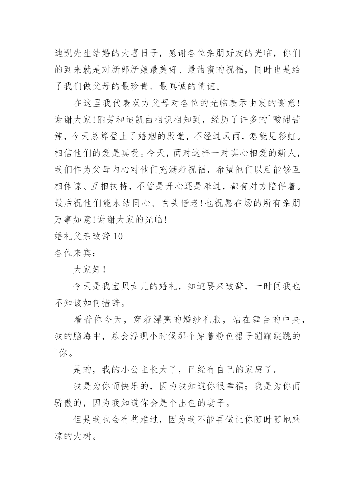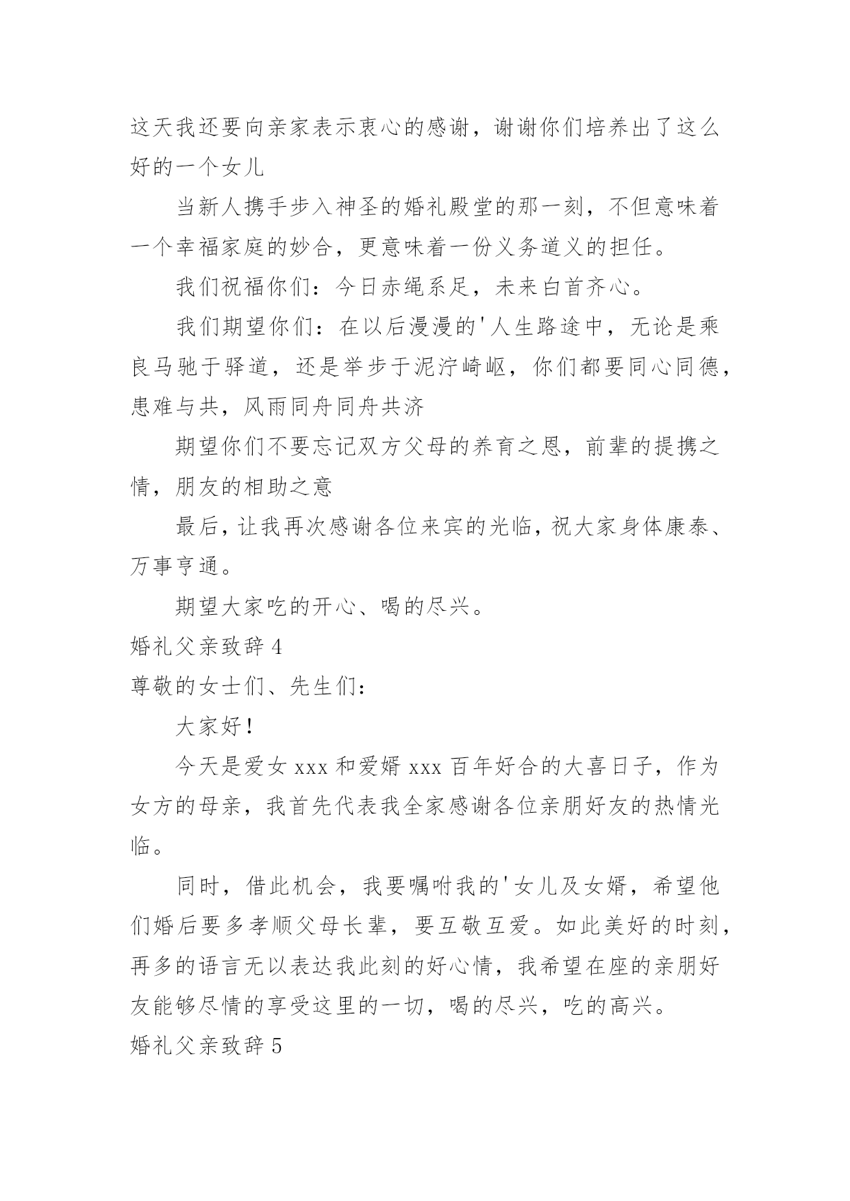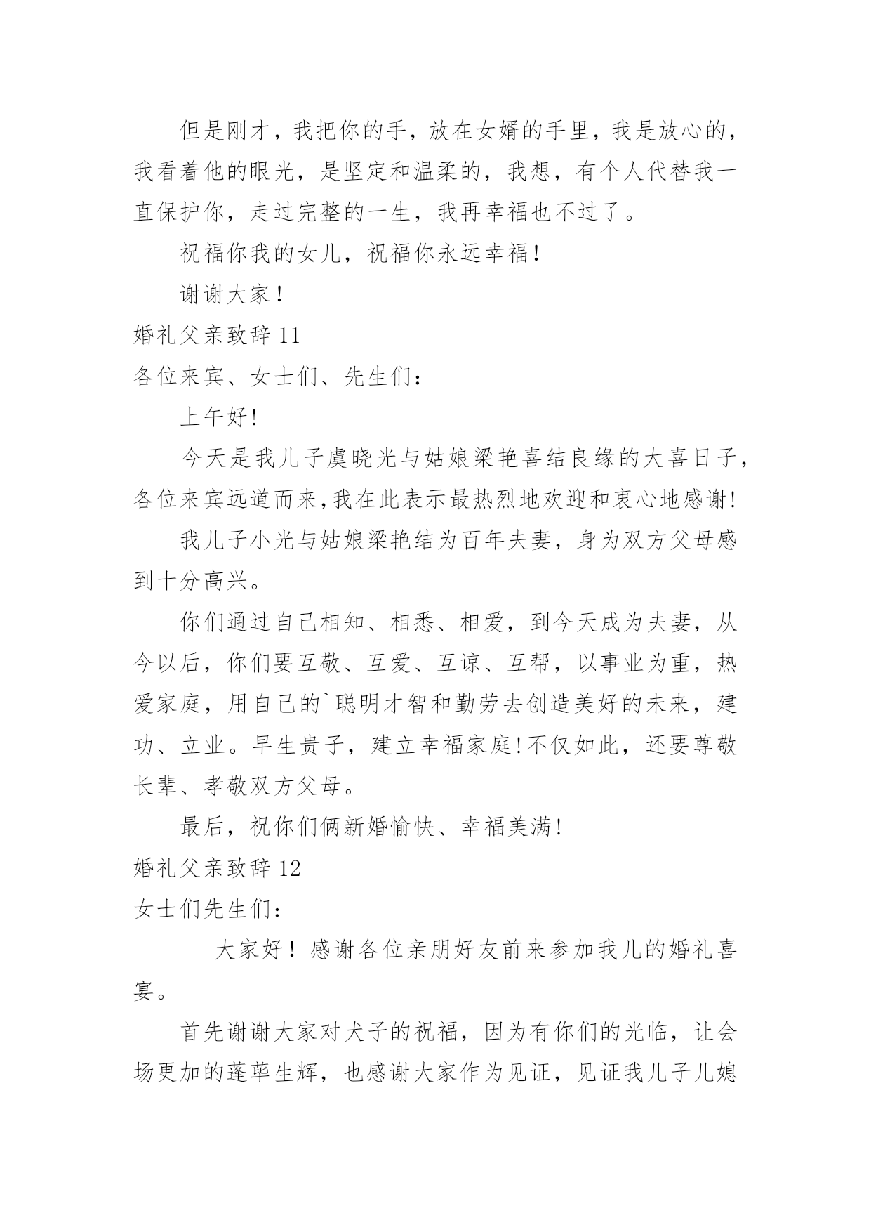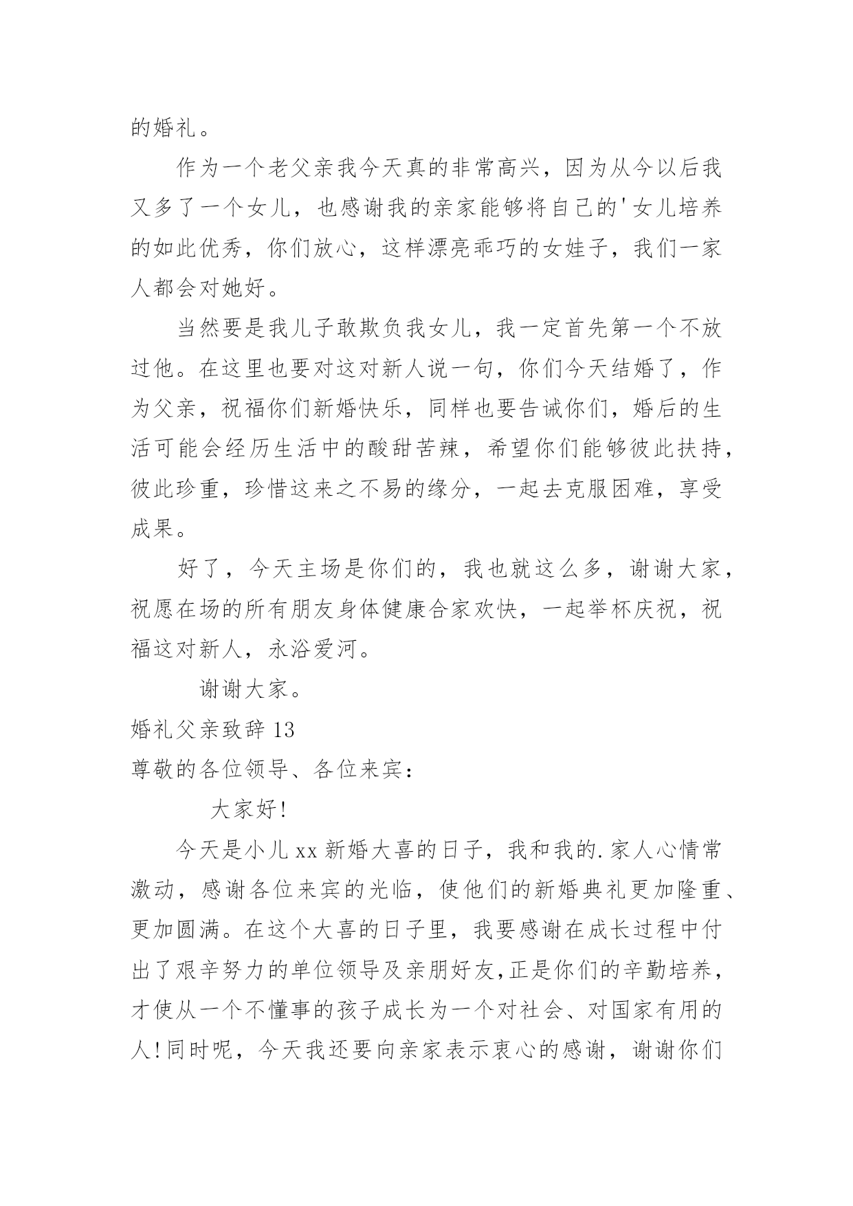 婚礼父亲致辞婚礼父亲致辞在现实生活或工作学习中,大家都不可避免地要接触到致辞吧,致辞要求风格的雅、俗、庄、谐要适当。那什么样的致辞才规范呢?以下是小编整理的婚礼父亲致辞,希望对大家有所帮助。婚礼父亲致辞1尊敬的亲朋好友、各位来宾:大家好!今天是爱女xx和爱婿xx百年好合的大喜日子,作为女方的父亲,我的心情非常激动,我首先代表我全家对大家的到来表示最热烈的欢迎和诚挚的感谢!此时此刻,我要嘱咐我的女儿及女婿,希望他们婚后要多孝敬父母长辈,要互敬互爱、互相关心、互相帮助,共同努力建立一个幸福美满的家庭,希望女儿常回家看看。如此美好的时刻,再多的语言也难以表达我此时此刻的'心情,我希望在座的亲朋好友和来宾们,能够尽情的享受这里的一切,喝的尽兴,吃得高兴!谢谢大家!婚礼父亲致辞2尊敬的各位来宾、各位亲朋好友!女士们,先生们!大家好!首先,我会代表我的家人对从远道而来的`来宾表示热烈的以欢迎,特别是我亲家那里来的亲戚朋友们;其次,对其他同仁、各位亲朋好友的光临,也致以深深的感谢!今天是我儿子张俊与王梅红小姐百年好合,永结同心的好日子。值此大喜之时,我衷心的祝福两位新人:一世良缘同地久,百年佳偶共天长。好日好时迎客驾,佳节佳期会佳亲;喜溢重门迎凤侣,双亲欢笑看儿婚;淑女迎来---蓬门添异彩;佳宾驾到---筚户倍生辉。婚礼父亲致辞3敬的各位领导、各位来宾:大家好!这天是儿子新婚大喜的日子,我和我的家人情绪十分激动,相信我们的亲家的情绪也是和我们相同的;承蒙各位佳宾莅临,使一对新人的新婚典礼更加隆重、更加圆满。作为孩子的家长,我先衷心地感谢各位嘉宾的莅临。我期望各位亲朋友好友在以后的岁月里继续关照、爱护我们的儿女们,我拜托大家,向大家鞠躬!在这个大喜的日子里,我要感谢在孩子成长过程中付出了艰辛努力的单位领导及亲朋好友和家庭中的长辈们,在你们的辛勤培养呵护下,才使他从一个不韵世事的蒙童成长起来,我代表我们的家庭向各位来宾表示衷心的感谢!同时呢,这天我还要向亲家表示衷心的感谢,谢谢你们培养出了这么好的一个女儿当新人携手步入神圣的婚礼殿堂的那一刻,不但意味着一个幸福家庭的妙合,更意味着一份义务道义的担任。我们祝福你们:今日赤绳系足,未来白首齐心。我们期望你们:在以后漫漫的'人生路途中,无论是乘良马驰于驿道,还是举步于泥泞崎岖,你们都要同心同德,患难与共,风雨同舟同舟共济期望你们不要忘记双方父母的养育之恩,前辈的提携之情,朋友的相助之意最后,让我再次感谢各位来宾的光临,祝大家身体康泰、万事亨通。期望大家吃的开心、喝的尽兴。婚礼父亲致辞4尊敬的女士们、先生们:大家好!今天是爱女xxx和爱婿xxx百年好合的大喜日子,作为女方的母亲,我首先代表我全家感谢各位亲朋好友的热情光临。同时,借此机会,我要嘱咐我的'女儿及女婿,希望他们婚后要多孝顺父母长辈,要互敬互爱。如此美好的时刻,再多的语言无以表达我此刻的好心情,我希望在座的亲朋好友能够尽情的享受这里的一切,喝的尽兴,吃的高兴。婚礼父亲致辞5尊敬的各位来宾、各位朋友、先生们、女士们:大家好!在这秋高气爽、艳阳高照,充满期望与收获的季节里,我们迎来了我的儿子与儿媳喜结良缘的大喜日子。在此,我代表巴氏家族向各位来宾的到来表示热烈的欢迎和衷心的感谢!此时此刻,我要把我无比激动与幸福的情绪,与大家共同分享。首先要“感谢”。一要感谢在座的各位亲朋好友,成长,倾注了你们很多心血与关注,承载着你们很多祝福与期望,这天他走进了婚礼的`殿堂,步入了人生一个新的历程,是你们多年来帮忙和支持的结果。二要感谢我的亲家,你们家风淳朴、勤劳善良,为我们培养了一个美丽与智慧并存,温柔与才干并举的好儿媳,这是我们巴家人最大的福气,我们感到无比的欣慰与满足。其次是“期望”。良缘由夙缔,佳偶自天成。作为父母,我们见证了你们相识、相知、相恋、相爱的过程。你们的美满姻缘,意味着一个幸福家庭的组合,意味着一份职责道义的担当,更意味着一种鱼水相依的相守。期望你们在以后生活中,一心一意创事业,全心全意创家业,无论是灿烂阳光,还是斜风细雨,都能同甘共苦,风雨同舟,携手共度美丽人生。最后想“祝愿”。这天参加婚礼的各位来宾、各位朋友,因为你们的到来,我儿子的婚礼才会增添光彩;因为你们的祝福,我儿子的明天才会更加精彩;因为你们的掌声(鼓掌),我儿子的生活才会更加幸福多彩。我代表巴氏家族祝愿各位来宾和朋友,笑口常开,幸福常在,干啥啥顺,想啥啥来,打麻将把把自摸,买彩排回回中奖(台下鼓掌)。为了感谢各位的到来,我们准备了薄酒素菜,祝大家吃得愉快、聊得开心、喝的尽兴。谢谢大家!婚礼父亲致辞6友爱的现场来宾,大家好!今天是我养育多年的儿子xxx和期盼已久的儿媳妇喜结良缘的美好日子,承蒙各位来宾千里迢迢来参加他们二人的婚礼,在此我代表全家对大家的到来表示热烈的欢迎。此时此
