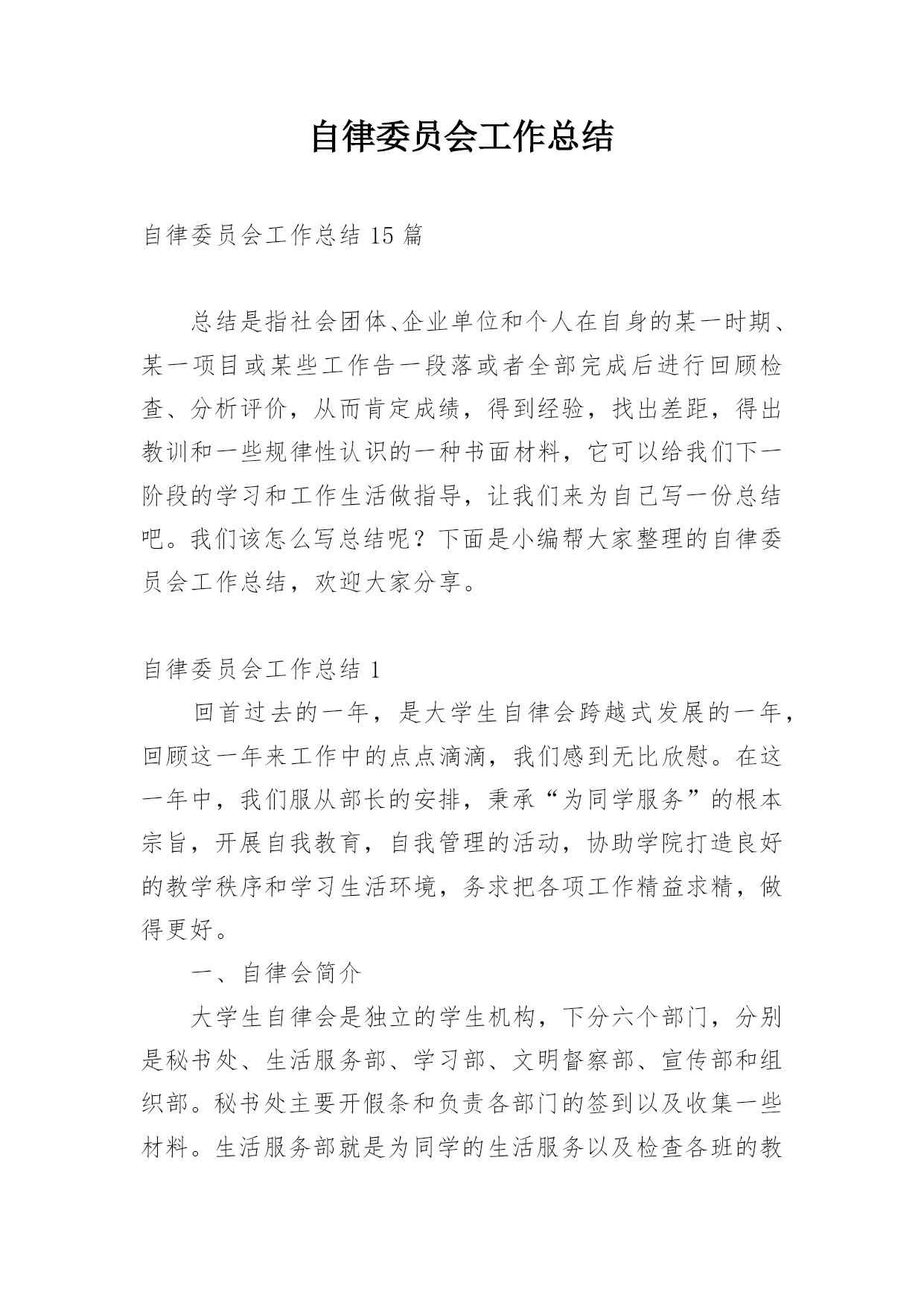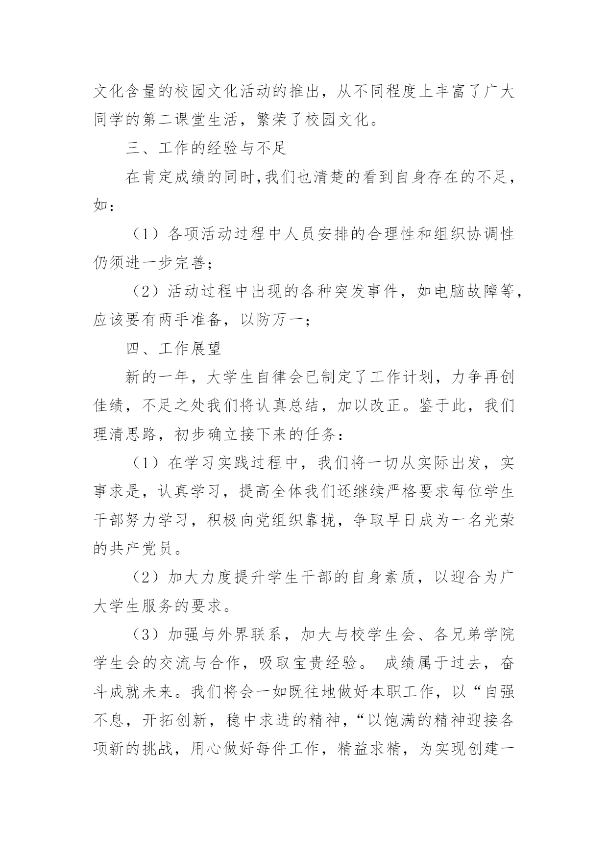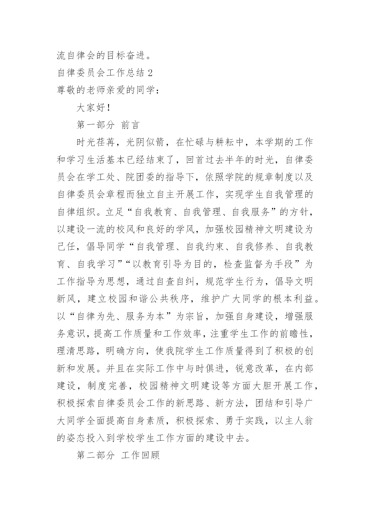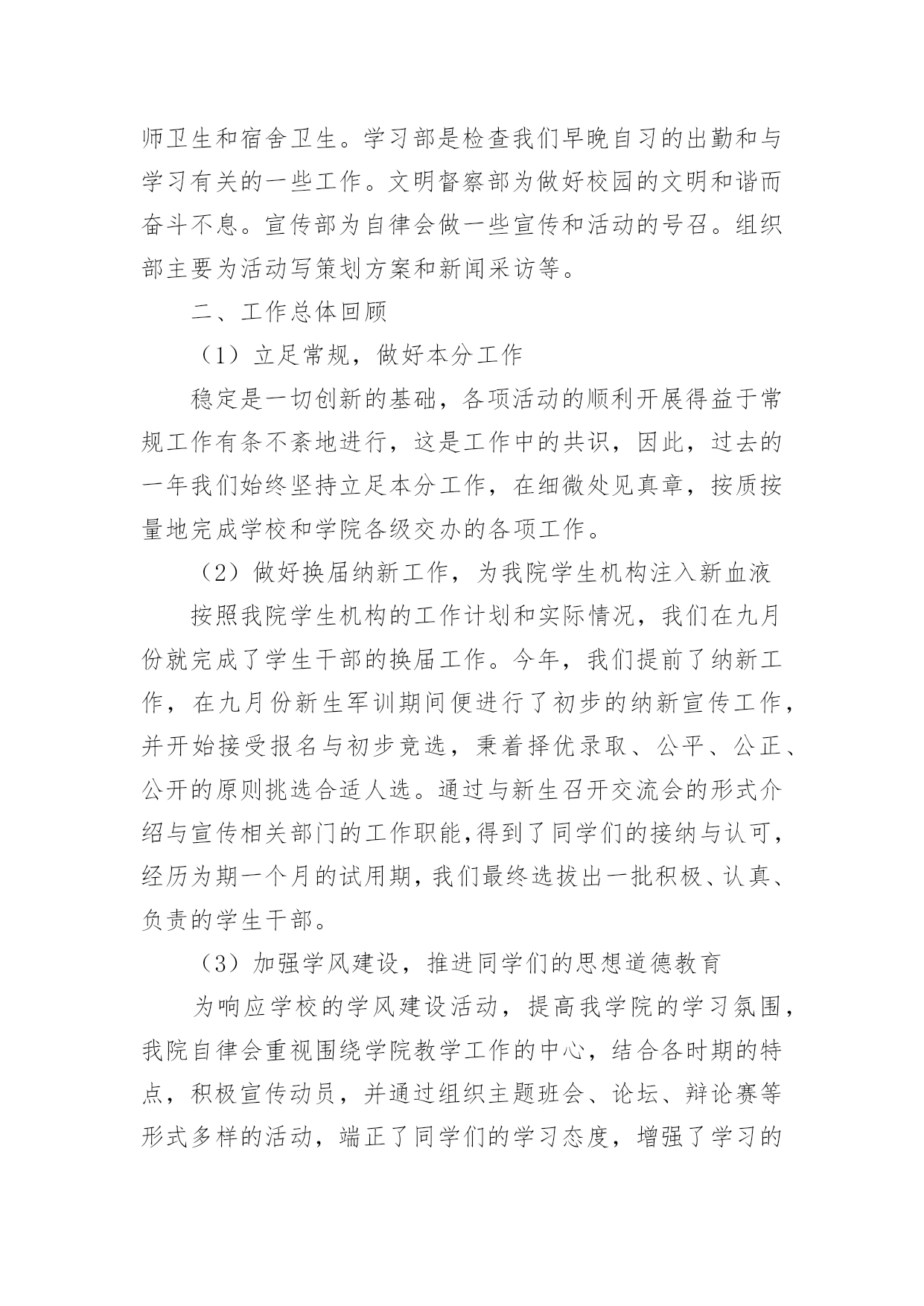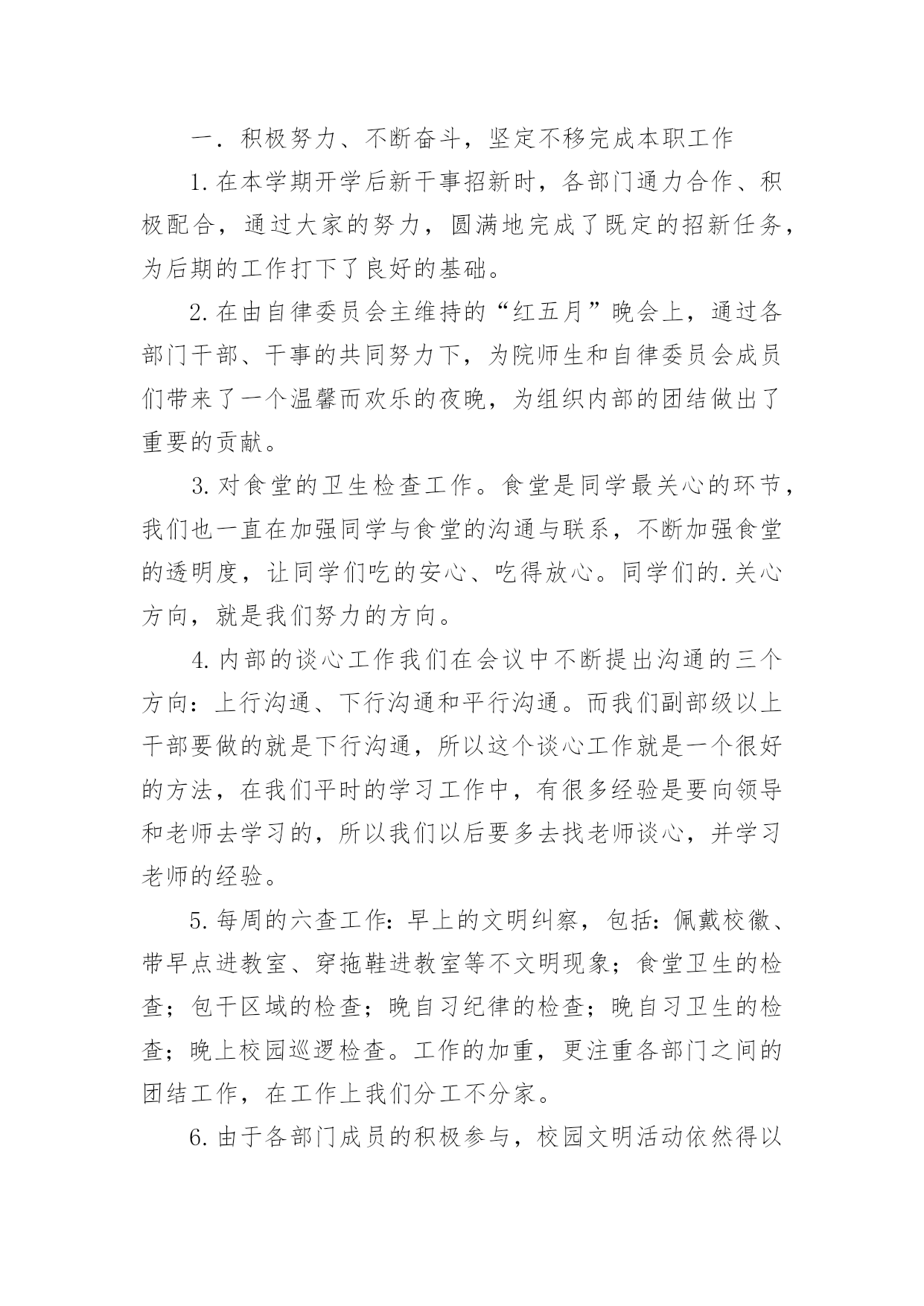 自律委员会工作总结自律委员会工作总结15篇总结是指社会团体、企业单位和个人在自身的某一时期、某一项目或某些工作告一段落或者全部完成后进行回顾检查、分析评价,从而肯定成绩,得到经验,找出差距,得出教训和一些规律性认识的一种书面材料,它可以给我们下一阶段的学习和工作生活做指导,让我们来为自己写一份总结吧。我们该怎么写总结呢?下面是小编帮大家整理的自律委员会工作总结,欢迎大家分享。自律委员会工作总结1回首过去的一年,是大学生自律会跨越式发展的一年,回顾这一年来工作中的点点滴滴,我们感到无比欣慰。在这一年中,我们服从部长的安排,秉承“为同学服务”的根本宗旨,开展自我教育,自我管理的活动,协助学院打造良好的教学秩序和学习生活环境,务求把各项工作精益求精,做得更好。一、自律会简介大学生自律会是独立的学生机构,下分六个部门,分别是秘书处、生活服务部、学习部、文明督察部、宣传部和组织部。秘书处主要开假条和负责各部门的签到以及收集一些材料。生活服务部就是为同学的生活服务以及检查各班的教师卫生和宿舍卫生。学习部是检查我们早晚自习的出勤和与学习有关的一些工作。文明督察部为做好校园的文明和谐而奋斗不息。宣传部为自律会做一些宣传和活动的号召。组织部主要为活动写策划方案和新闻采访等。二、工作总体回顾(1)立足常规,做好本分工作稳定是一切创新的基础,各项活动的顺利开展得益于常规工作有条不紊地进行,这是工作中的共识,因此,过去的一年我们始终坚持立足本分工作,在细微处见真章,按质按量地完成学校和学院各级交办的各项工作。(2)做好换届纳新工作,为我院学生机构注入新血液按照我院学生机构的工作计划和实际情况,我们在九月份就完成了学生干部的换届工作。今年,我们提前了纳新工作,在九月份新生军训期间便进行了初步的纳新宣传工作,并开始接受报名与初步竞选,秉着择优录取、公平、公正、公开的原则挑选合适人选。通过与新生召开交流会的形式介绍与宣传相关部门的工作职能,得到了同学们的接纳与认可,经历为期一个月的试用期,我们最终选拔出一批积极、认真、负责的学生干部。(3)加强学风建设,推进同学们的思想道德教育为响应学校的学风建设活动,提高我学院的学习氛围,我院自律会重视围绕学院教学工作的中心,结合各时期的特点,积极宣传动员,并通过组织主题班会、论坛、辩论赛等形式多样的活动,端正了同学们的学习态度,增强了学习的内在动力,养成了“惜时、勤学”及自觉遵守校纪校规的良好学风,这一举措达到了良好的效果,一年来,我院的很多同学养成了坚持晚自习和晨读的习惯,违反校规校纪的现象也得到了有效的控制,学风建设的成果得到了各级部门的.认可,部分经验也在各二级学院中推广。(4)完善内部管理机制,促进学生会不断发展事物是不断发展的,只有不断学习与创新,才能适应时代发展的要求!由于我院自律会尚处于发展时期,各项规章制度仍然不够完善,所以我们根据实际情况,不断提出新要求,完善原有制度,实现学生机构管理的制度化,使自律师会的工作有法可依,有章可循;此外,各部门除了做好本职工作外,还不断深化改进内部工作机制,如分工合作制,很好地优化分工,充分发挥各部门每一位成员的潜力,使得大家在工作过程中既感到充实又没有负担,同时,大家也可以互相学习,集众人智慧于一体,共同把工作做好。此外,我们始终重视每年一度的学生机构干部培训,在今年的干部培训中,我们从制度规定工作计划、读书心得、个人素质等几个方面着眼,以此加强我院学生机构的内部管理,增强机构内部的沟通与交流,同时也让全体学生干部进一步了解相关的工作管理制度和程序,激发了学生干部的工作热情和创新意识,也增强了学生机构的凝聚力。(5)举办特色活动,丰富校园生活一年时间匆匆而过,但各部门的活动可以说是有条不紊、紧跟步伐,且越发丰富多彩,我院一批高品位、高层次、高文化含量的校园文化活动的推出,从不同程度上丰富了广大同学的第二课堂生活,繁荣了校园文化。三、工作的经验与不足在肯定成绩的同时,我们也清楚的看到自身存在的不足,如:(1)各项活动过程中人员安排的合理性和组织协调性仍须进一步完善;(2)活动过程中出现的各种突发事件,如电脑故障等,应该要有两手准备,以防万一;四、工作展望新的一年,大学生自律会已制定了工作计划,力争再创佳绩,不足之处我们将认真总结,加以改正。鉴于此,我们理清思路,初步确立接下来的任务:(1)在学习实践过程中,我们将一切从实际出发,实事求是,认真学习,提高全体我们还继续严格要求每位学生干部努力学习,积极向党组织靠拢,争取早日成为一名光荣的共产党员。(2)加大力度提升学生干部的自身素质,以迎合为广大学生服务的要求。(3)加强与外界联系,加大与校学生会、各兄弟学院学生会的交流与合作,吸取宝贵经验。成绩属于过去,奋斗成就未来。我们将会一如既往地做好本职工作,以“自强不息,开拓