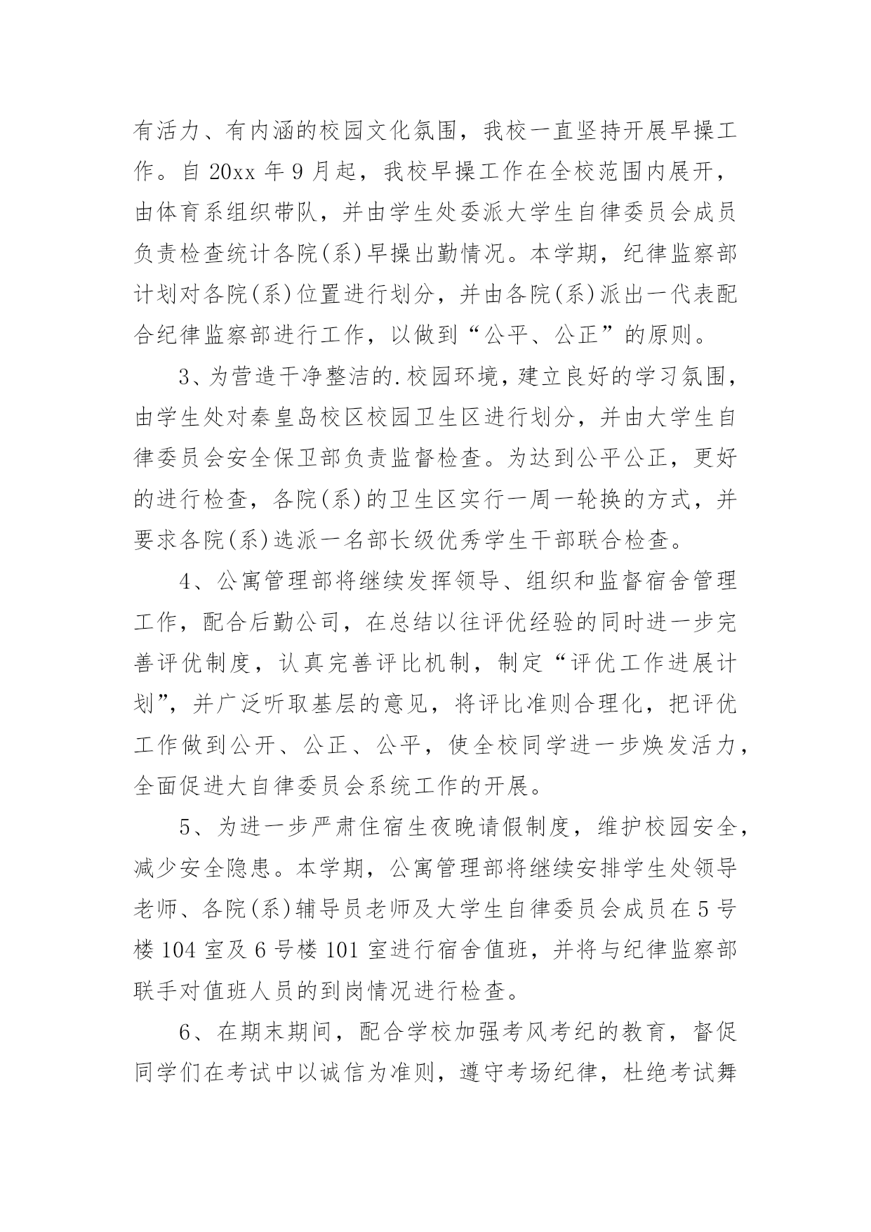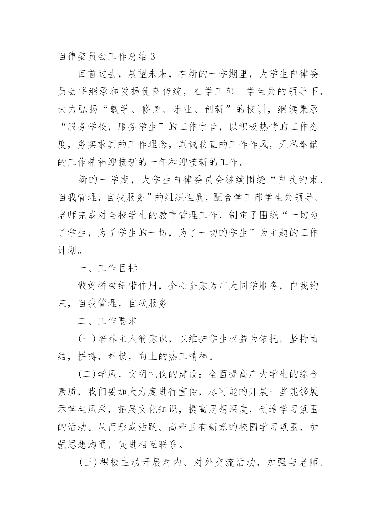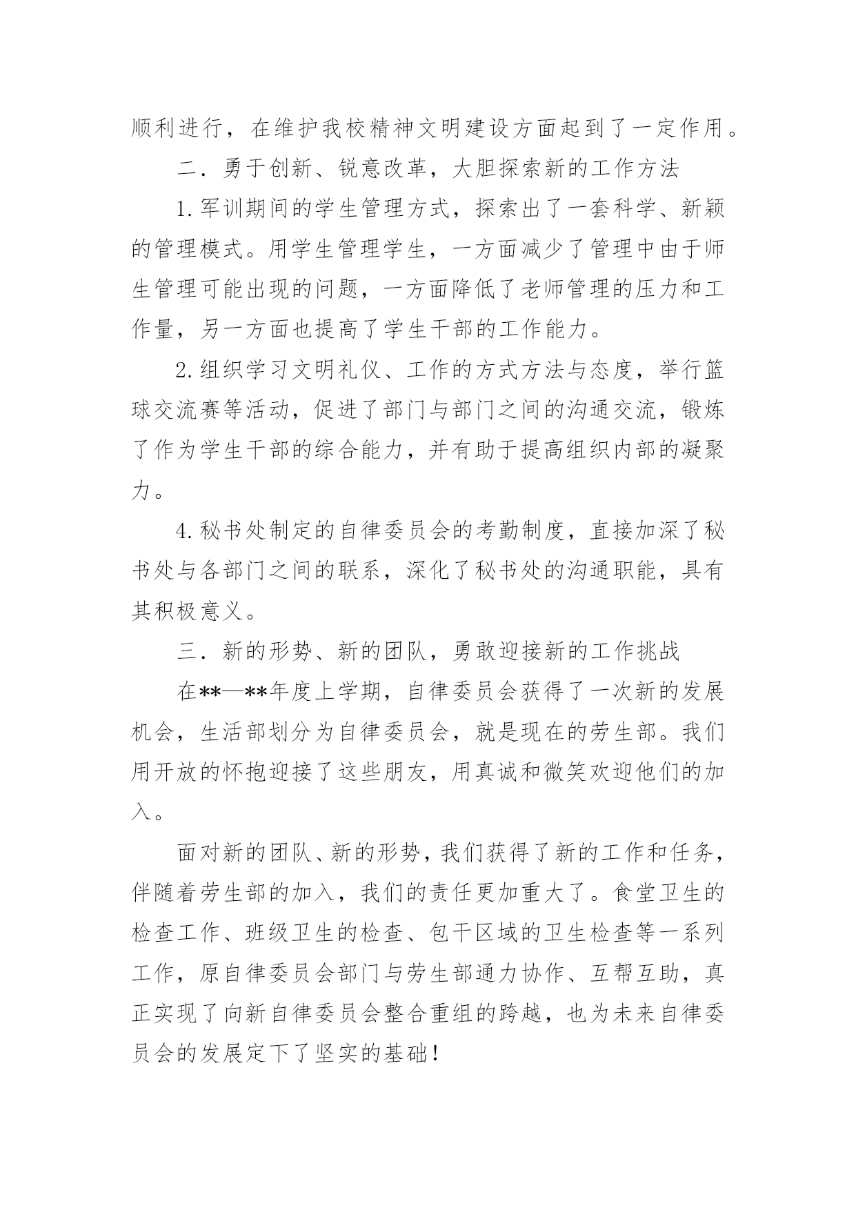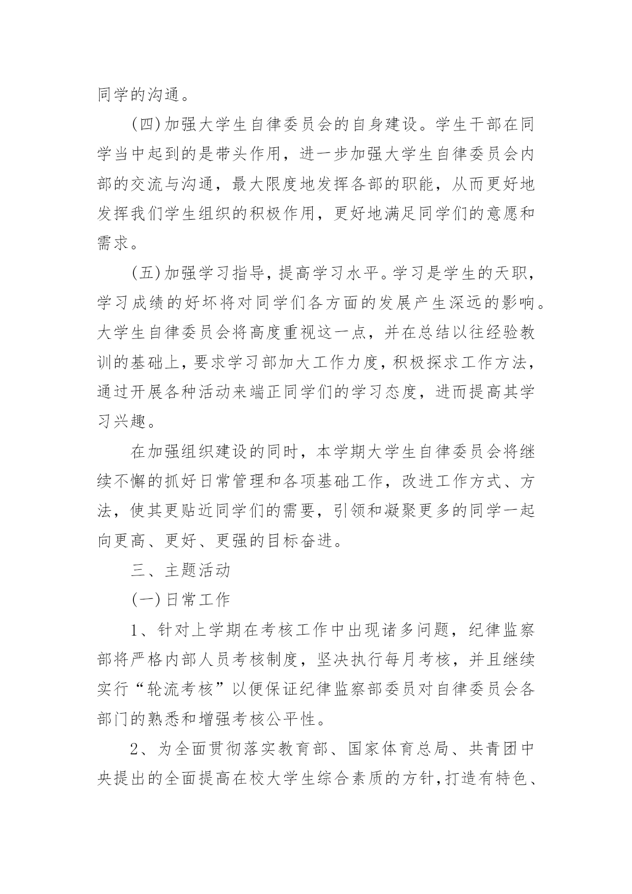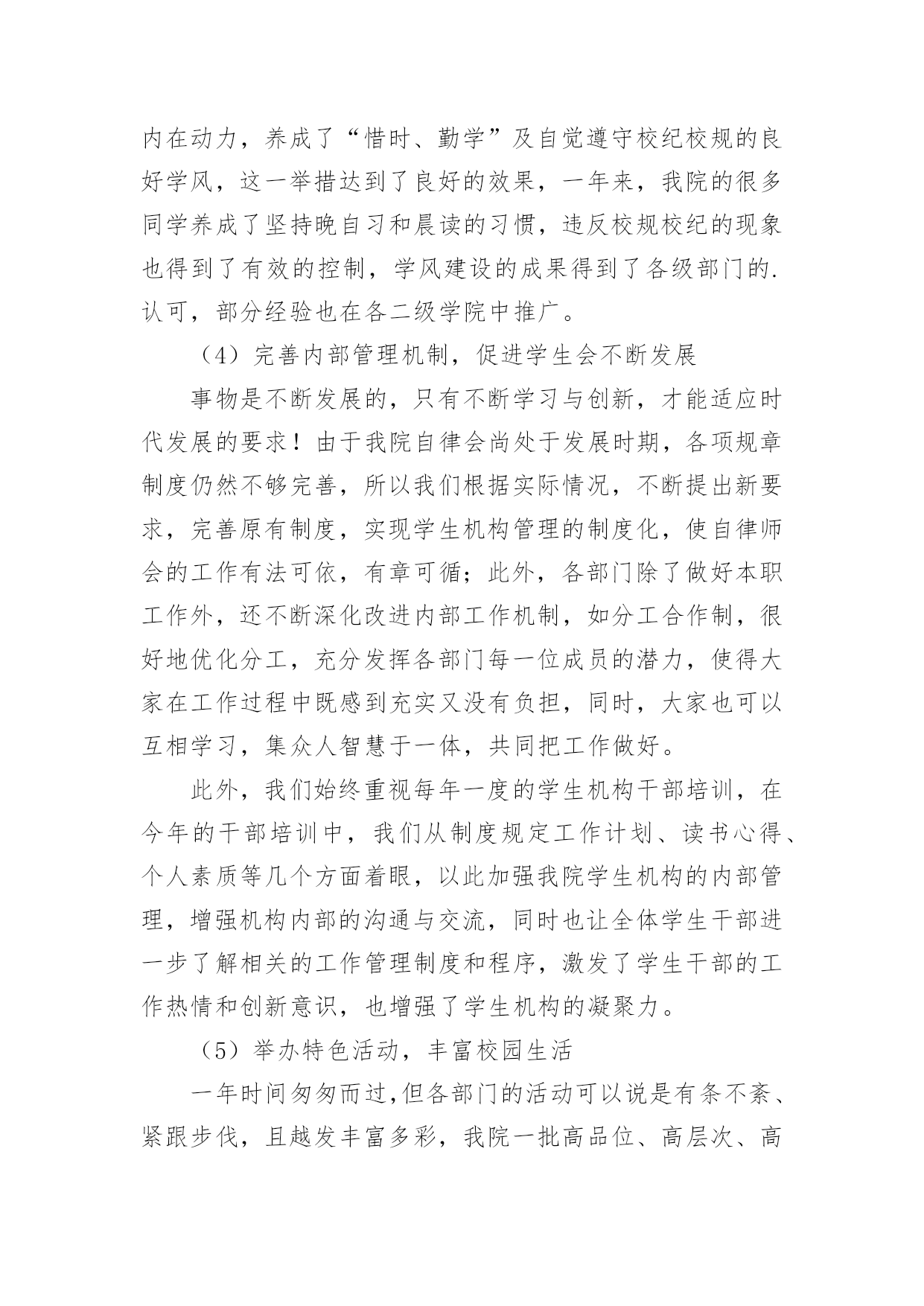 自律委员会工作总结自律委员会工作总结15篇总结是指社会团体、企业单位和个人在自身的某一时期、某一项目或某些工作告一段落或者全部完成后进行回顾检查、分析评价,从而肯定成绩,得到经验,找出差距,得出教训和一些规律性认识的一种书面材料,它可以给我们下一阶段的学习和工作生活做指导,让我们来为自己写一份总结吧。我们该怎么写总结呢?下面是小编帮大家整理的自律委员会工作总结,欢迎大家分享。自律委员会工作总结1回首过去的一年,是大学生自律会跨越式发展的一年,回顾这一年来工作中的点点滴滴,我们感到无比欣慰。在这一年中,我们服从部长的安排,秉承“为同学服务”的根本宗旨,开展自我教育,自我管理的活动,协助学院打造良好的教学秩序和学习生活环境,务求把各项工作精益求精,做得更好。一、自律会简介大学生自律会是独立的学生机构,下分六个部门,分别是秘书处、生活服务部、学习部、文明督察部、宣传部和组织部。秘书处主要开假条和负责各部门的签到以及收集一些材料。生活服务部就是为同学的生活服务以及检查各班的教师卫生和宿舍卫生。学习部是检查我们早晚自习的出勤和与学习有关的一些工作。文明督察部为做好校园的文明和谐而奋斗不息。宣传部为自律会做一些宣传和活动的号召。组织部主要为活动写策划方案和新闻采访等。二、工作总体回顾(1)立足常规,做好本分工作稳定是一切创新的基础,各项活动的顺利开展得益于常规工作有条不紊地进行,这是工作中的共识,因此,过去的一年我们始终坚持立足本分工作,在细微处见真章,按质按量地完成学校和学院各级交办的各项工作。(2)做好换届纳新工作,为我院学生机构注入新血液按照我院学生机构的工作计划和实际情况,我们在九月份就完成了学生干部的换届工作。今年,我们提前了纳新工作,在九月份新生军训期间便进行了初步的纳新宣传工作,并开始接受报名与初步竞选,秉着择优录取、公平、公正、公开的原则挑选合适人选。通过与新生召开交流会的形式介绍与宣传相关部门的工作职能,得到了同学们的接纳与认可,经历为期一个月的试用期,我们最终选拔出一批积极、认真、负责的学生干部。(3)加强学风建设,推进同学们的思想道德教育为响应学校的学风建设活动,提高我学院的学习氛围,我院自律会重视围绕学院教学工作的中心,结合各时期的特点,积极宣传动员,并通过组织主题班会、论坛、辩论赛等形式多样的活动,端正了同学们的学习态度,增强了学习的内在动力,养成了“惜时、勤学”及自觉遵守校纪校规的良好学风,这一举措达到了良好的效果,一年来,我院的很多同学养成了坚持晚自习和晨读的习惯,违反校规校纪的现象也得到了有效的控制,学风建设的成果得到了各级部门的.认可,部分经验也在各二级学院中推广。(4)完善内部管理机制,促进学生会不断发展事物是不断发展的,只有不断学习与创新,才能适应时代发展的要求!由于我院自律会尚处于发展时期,各项规章制度仍然不够完善,所以我们根据实际情况,不断提出新要求,完善原有制度,实现学生机构管理的制度化,使自律师会的工作有法可依,有章可循;此外,各部门除了做好本职工作外,还不断深化改进内部工作机制,如分工合作制,很好地优化分工,充分发挥各部门每一位成员的潜力,使得大家在工作过程中既感到充实又没有负担,同时,大家也可以互相学习,集众人智慧于一体,共同把工作做好。此外,我们始终重视每年一度的学生机构干部培训,在今年的干部培训中,我们从制度规定工作计划、读书心得、个人素质等几个方面着眼,以此加强我院学生机构的内部管理,增强机构内部的沟通与交流,同时也让全体学生干部进一步了解相关的工作管理制度和程序,激发了学生干部的工作热情和创新意识,也增强了学生机构的凝聚力。(5)举办特色活动,丰富校园生活一年时间匆匆而过,但各部门的活动可以说是有条不紊、紧跟步伐,且越发丰富多彩,我院一批高品位、高层次、高文化含量的校园文化活动的推出,从不同程度上丰富了广大同学的第二课堂生活,繁荣了校园文化。三、工作的经验与不足在肯定成绩的同时,我们也清楚的看到自身存在的不足,如:(1)各项活动过程中人员安排的合理性和组织协调性仍须进一步完善;(2)活动过程中出现的各种突发事件,如电脑故障等,应该要有两手准备,以防万一;四、工作展望新的一年,大学生自律会已制定了工作计划,力争再创佳绩,不足之处我们将认真总结,加以改正。鉴于此,我们理清思路,初步确立接下来的任务:(1)在学习实践过程中,我们将一切从实际出发,实事求是,认真学习,提高全体我们还继续严格要求每位学生干部努力学习,积极向党组织靠拢,争取早日成为一名光荣的共产党员。(2)加大力度提升学生干部的自身素质,以迎合为广大学生服务的要求。(3)加强与外界联系,加大与校学生会、各兄弟学院学生会的交流与合作,吸取宝贵经验。成绩属于过去,奋斗成就未来。我们将会一如既往地做好本职工作,以“自强不息,开拓