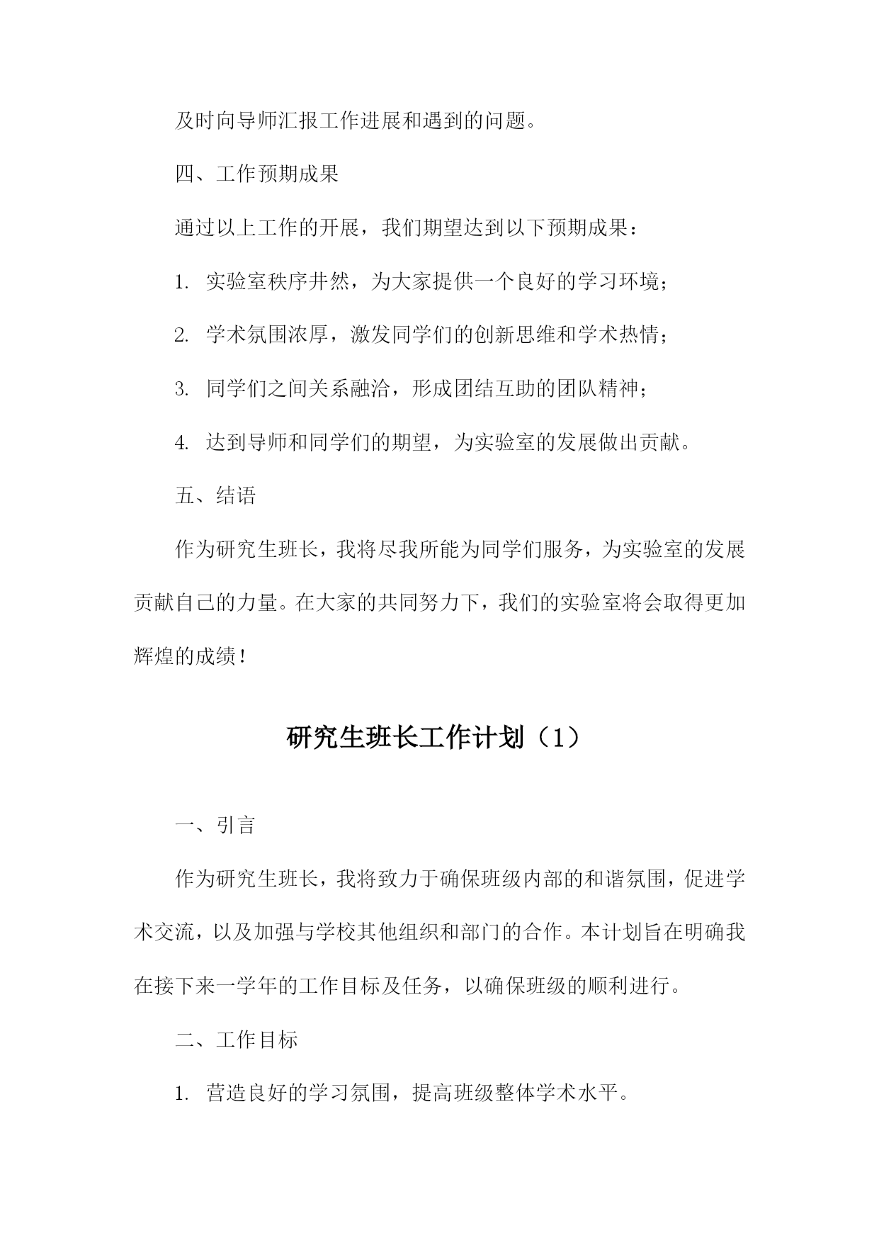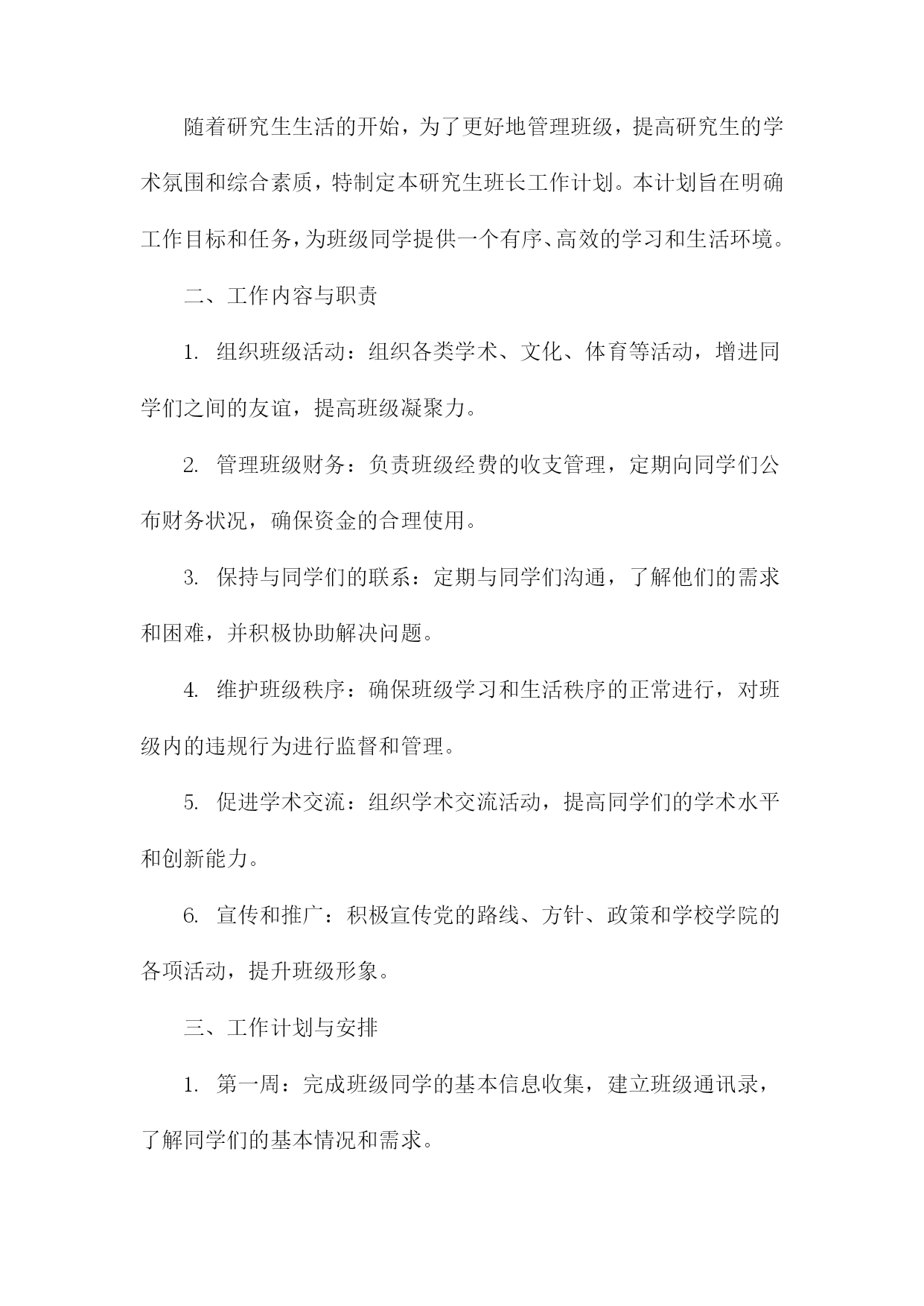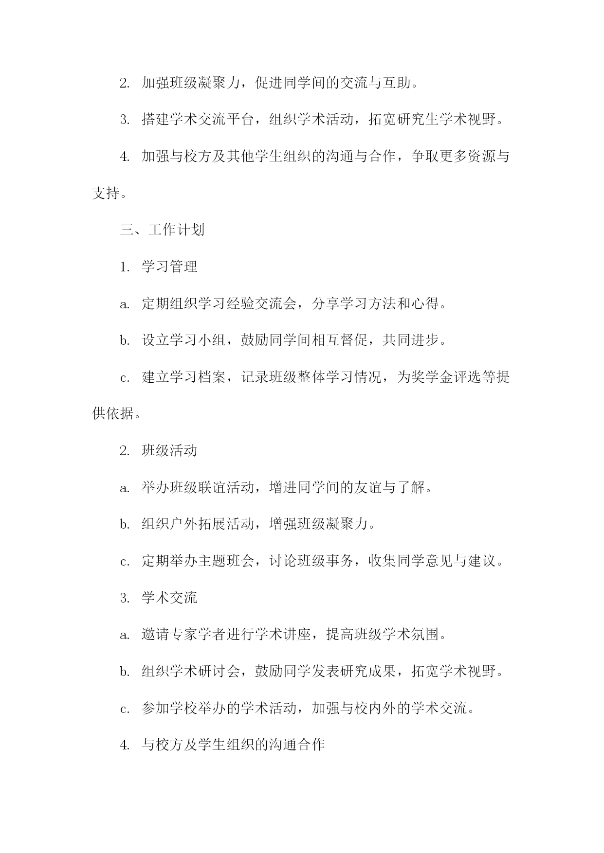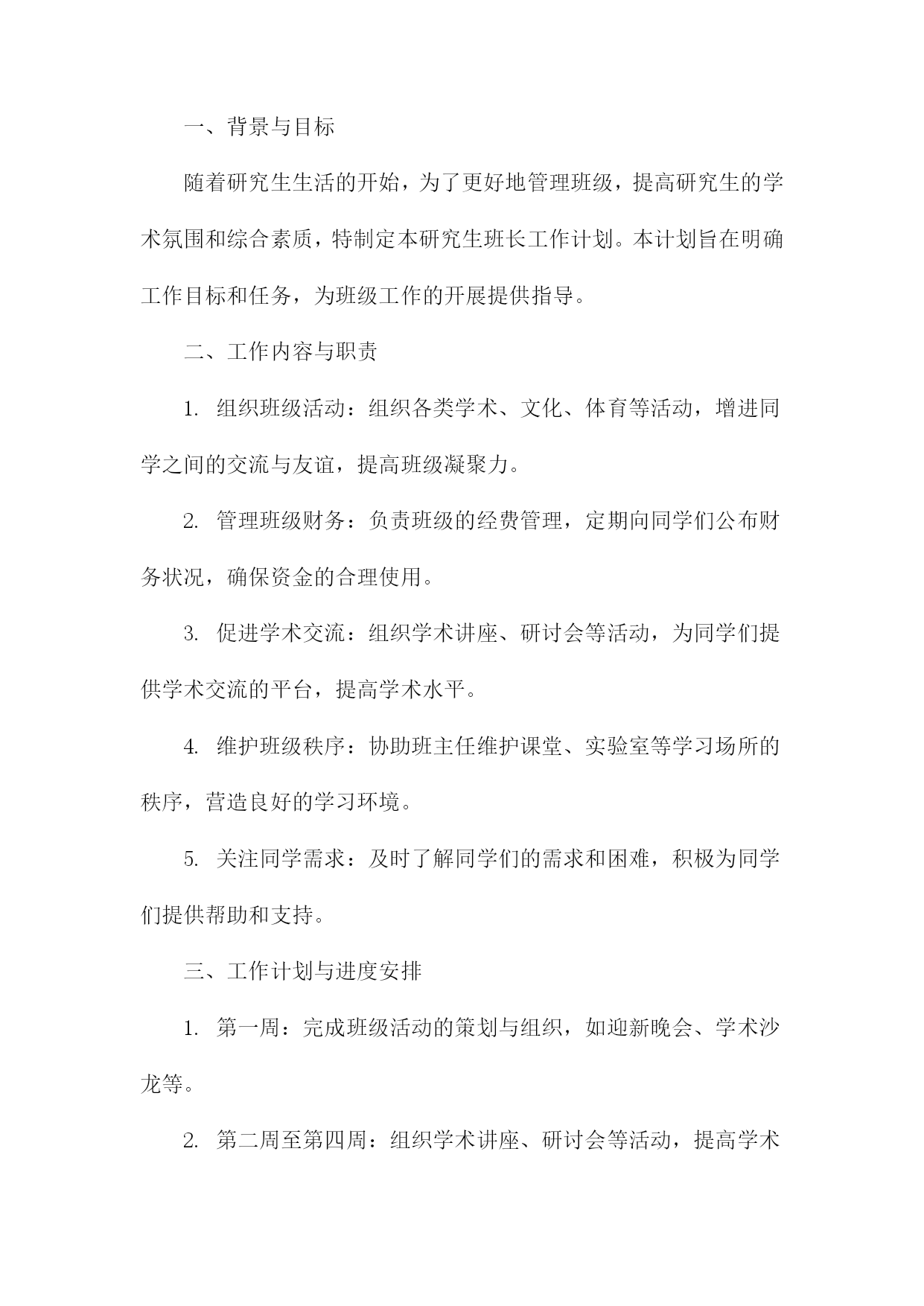 研究生班长工作计划一、背景与目标二、工作内容概述1.维护实验室秩序:确保实验室内务整洁,提醒大家遵守实验室规章制度,维护实验室的安全与卫生。2.举办学术活动:策划并组织学术交流活动,提升实验室的学术氛围,促进学术交流与合作。3.了解同学需求:定期与同学们沟通,了解他们的学习、生活及科研进展,提供必要的帮助和支持。4.组织团队建设:加强团队凝聚力,组织团队活动,增进同学们之间的了解和友谊。5.协助导师工作:协助导师进行实验室日常管理工作,完成导师分配的任务。三、具体工作计划1.维护实验室秩序(1学期)每周定期检查实验室卫生,确保环境整洁;每周至少巡查实验室一次,确保设备正常运行和安全;对违规电器使用情况进行定期通报和处理;鼓励大家共同维护实验室秩序,共同营造良好的学习环境。2.举办学术活动(每学期)策划并组织至少一次大型学术讲座或研讨会;邀请国内外知名专家进行学术交流;组织实验室内部学术讨论会,促进同学们之间的学术交流;鼓励同学们参加国内外的学术会议和研讨会。3.了解同学需求(每月)每周与至少10名同学进行一对一交流,了解他们的学习、生活及科研进展;建立同学需求反馈机制,及时收集并解决问题;定期与导师沟通,汇报同学们的情况,并寻求建议和支持。4.组织团队建设(每学期)组织至少一次团队建设活动,如户外拓展、团队游戏等;加强团队成员之间的了解和信任;定期召开团队会议,分享交流心得和经验;鼓励团队成员发挥各自特长,为实验室的发展贡献力量。5.协助导师工作(日常)协助导师管理实验室日常事务,如设备采购、资料整理等;完成导师分配的其他任务,如组织实验室活动等;及时向导师汇报工作进展和遇到的问题。四、工作预期成果通过以上工作的开展,我们期望达到以下预期成果:1.实验室秩序井然,为大家提供一个良好的学习环境;2.学术氛围浓厚,激发同学们的创新思维和学术热情;3.同学们之间关系融洽,形成团结互助的团队精神;4.达到导师和同学们的期望,为实验室的发展做出贡献。五、结语作为研究生班长,我将尽我所能为同学们服务,为实验室的发展贡献自己的力量。在大家的共同努力下,我们的实验室将会取得更加辉煌的成绩!研究生班长工作计划(1)一、引言作为研究生班长,我将致力于确保班级内部的和谐氛围,促进学术交流,以及加强与学校其他组织和部门的合作。本计划旨在明确我在接下来一学年的工作目标及任务,以确保班级的顺利进行。二、工作目标1.营造良好的学习氛围,提高班级整体学术水平。2.加强班级凝聚力,促进同学间的交流与互助。3.搭建学术交流平台,组织学术活动,拓宽研究生学术视野。4.加强与校方及其他学生组织的沟通与合作,争取更多资源与支持。三、工作计划1.学习管理a.定期组织学习经验交流会,分享学习方法和心得。b.设立学习小组,鼓励同学间相互督促,共同进步。c.建立学习档案,记录班级整体学习情况,为奖学金评选等提供依据。2.班级活动a.举办班级联谊活动,增进同学间的友谊与了解。b.组织户外拓展活动,增强班级凝聚力。c.定期举办主题班会,讨论班级事务,收集同学意见与建议。3.学术交流a.邀请专家学者进行学术讲座,提高班级学术氛围。b.组织学术研讨会,鼓励同学发表研究成果,拓宽学术视野。c.参加学校举办的学术活动,加强与校内外的学术交流。4.与校方及学生组织的沟通合作a.与学校管理部门保持密切联系,反馈班级情况,争取政策支持。b.加强与其他学生组织的合作,共同举办活动,拓宽资源渠道。c.建立良好的沟通机制,确保信息的及时传达与反馈。四、时间安排1.第一季度:完成学习管理计划的制定与实施,开展班级活动。2.第二季度:开始实施学术交流计划,加强与校方及学生组织的沟通合作。3.第三季度:继续落实学术交流计划,深化与校方及学生组织的合作。4.第四季度:总结全年工作,收集同学意见与建议,为下一年工作提供参考。五、总结作为研究生班长,我将全力以赴,为实现班级工作目标而努力。本计划将作为我工作的指导方针,确保班级工作有序进行。我将不断总结经验教训,根据实际情况调整工作计划,以更好地满足班级需求。研究生班长工作计划(2)一、背景与目标随着研究生生活的开始,为了更好地管理班级,提高研究生的学术氛围和综合素质,特制定本研究生班长工作计划。本计划旨在明确工作目标和任务,为班级同学提供一个有序、高效的学习和生活环境。二、工作内容与职责1.组织班级活动:组织各类学术、文化、体育等活动,增进同学们之间的友谊,提高班级凝聚力。2.管理班级财务:负责班级经费的收支管理,定期向同学们公布财务状况,确保资金的合理使用。3.保持与同学们的联系:定期与同学们沟通,了解他
