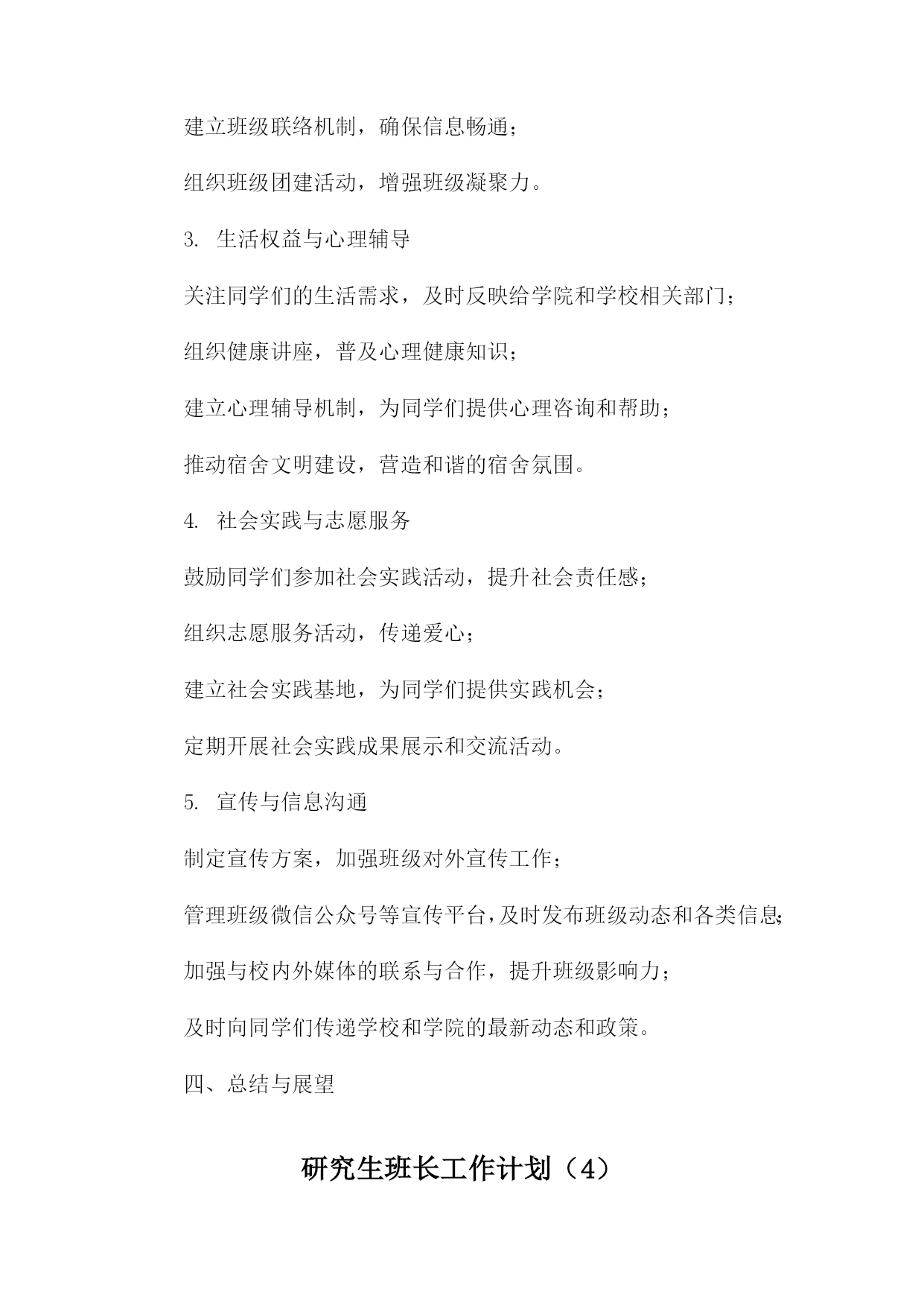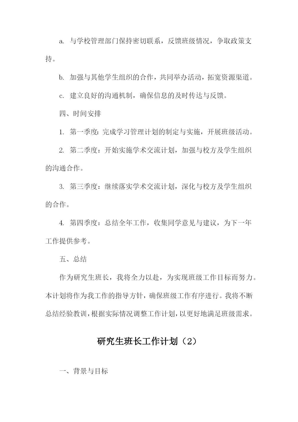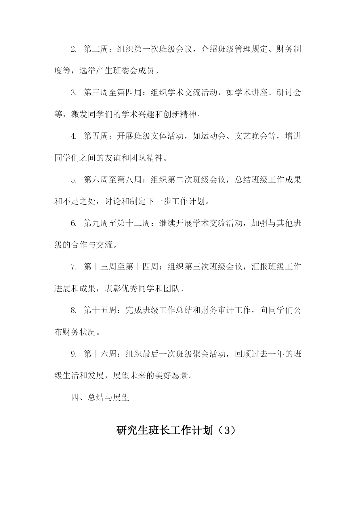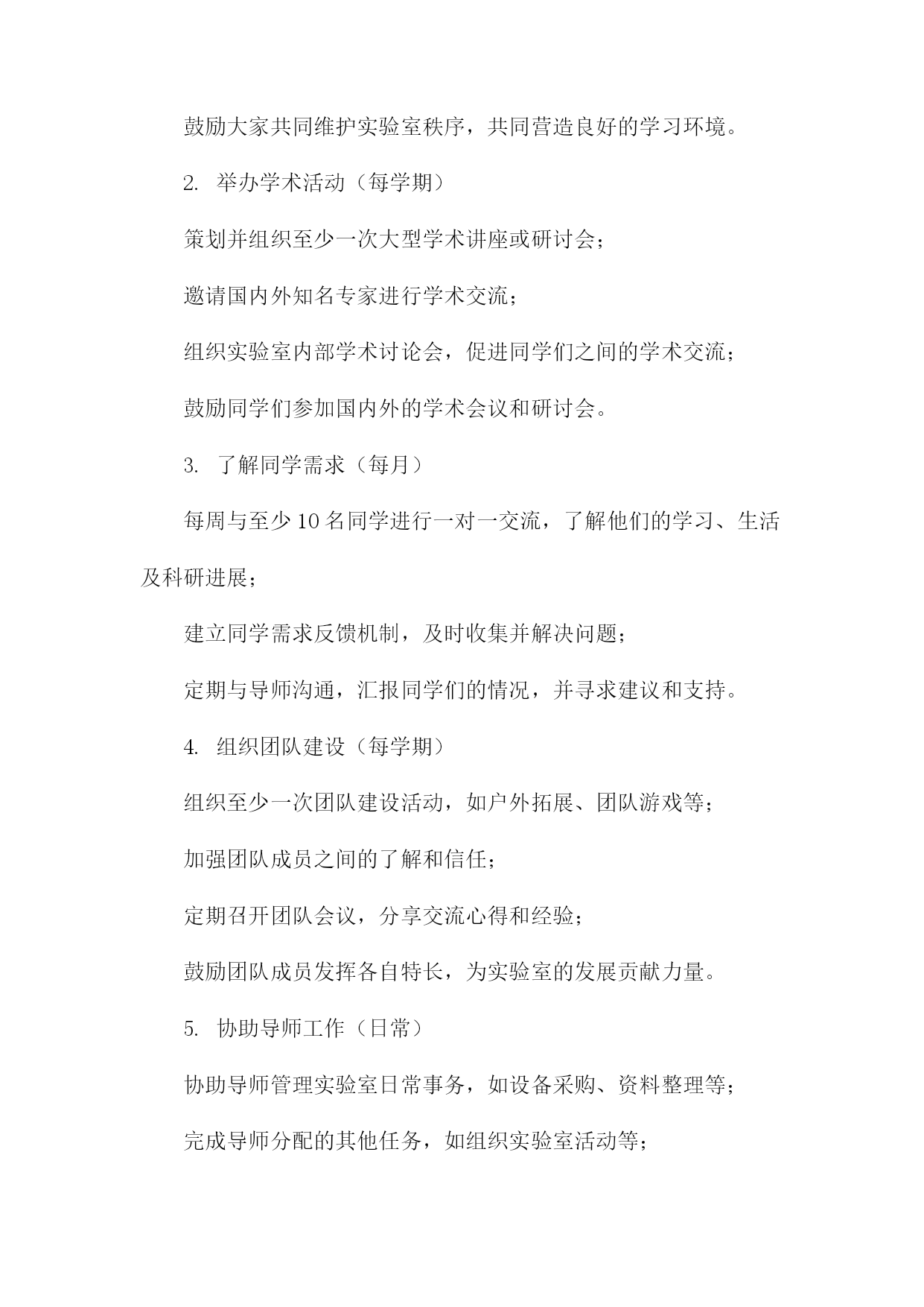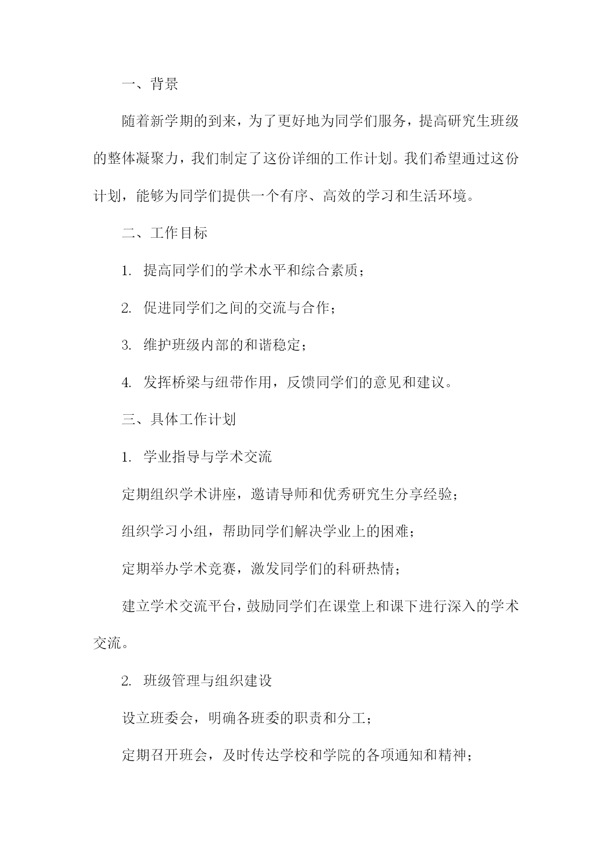 研究生班长工作计划一、背景与目标二、工作内容概述1.维护实验室秩序:确保实验室内务整洁,提醒大家遵守实验室规章制度,维护实验室的安全与卫生。2.举办学术活动:策划并组织学术交流活动,提升实验室的学术氛围,促进学术交流与合作。3.了解同学需求:定期与同学们沟通,了解他们的学习、生活及科研进展,提供必要的帮助和支持。4.组织团队建设:加强团队凝聚力,组织团队活动,增进同学们之间的了解和友谊。5.协助导师工作:协助导师进行实验室日常管理工作,完成导师分配的任务。三、具体工作计划1.维护实验室秩序(1学期)每周定期检查实验室卫生,确保环境整洁;每周至少巡查实验室一次,确保设备正常运行和安全;对违规电器使用情况进行定期通报和处理;鼓励大家共同维护实验室秩序,共同营造良好的学习环境。2.举办学术活动(每学期)策划并组织至少一次大型学术讲座或研讨会;邀请国内外知名专家进行学术交流;组织实验室内部学术讨论会,促进同学们之间的学术交流;鼓励同学们参加国内外的学术会议和研讨会。3.了解同学需求(每月)每周与至少10名同学进行一对一交流,了解他们的学习、生活及科研进展;建立同学需求反馈机制,及时收集并解决问题;定期与导师沟通,汇报同学们的情况,并寻求建议和支持。4.组织团队建设(每学期)组织至少一次团队建设活动,如户外拓展、团队游戏等;加强团队成员之间的了解和信任;定期召开团队会议,分享交流心得和经验;鼓励团队成员发挥各自特长,为实验室的发展贡献力量。5.协助导师工作(日常)协助导师管理实验室日常事务,如设备采购、资料整理等;完成导师分配的其他任务,如组织实验室活动等;及时向导师汇报工作进展和遇到的问题。四、工作预期成果通过以上工作的开展,我们期望达到以下预期成果:1.实验室秩序井然,为大家提供一个良好的学习环境;2.学术氛围浓厚,激发同学们的创新思维和学术热情;3.同学们之间关系融洽,形成团结互助的团队精神;4.达到导师和同学们的期望,为实验室的发展做出贡献。五、结语作为研究生班长,我将尽我所能为同学们服务,为实验室的发展贡献自己的力量。在大家的共同努力下,我们的实验室将会取得更加辉煌的成绩!研究生班长工作计划(1)一、引言作为研究生班长,我将致力于确保班级内部的和谐氛围,促进学术交流,以及加强与学校其他组织和部门的合作。本计划旨在明确我在接下来一学年的工作目标及任务,以确保班级的顺利进行。二、工作目标1.营造良好的学习氛围,提高班级整体学术水平。2.加强班级凝聚力,促进同学间的交流与互助。3.搭建学术交流平台,组织学术活动,拓宽研究生学术视野。4.加强与校方及其他学生组织的沟通与合作,争取更多资源与支持。三、工作计划1.学习管理a.定期组织学习经验交流会,分享学习方法和心得。b.设立学习小组,鼓励同学间相互督促,共同进步。c.建立学习档案,记录班级整体学习情况,为奖学金评选等提供依据。2.班级活动a.举办班级联谊活动,增进同学间的友谊与了解。b.组织户外拓展活动,增强班级凝聚力。c.定期举办主题班会,讨论班级事务,收集同学意见与建议。3.学术交流a.邀请专家学者进行学术讲座,提高班级学术氛围。b.组织学术研讨会,鼓励同学发表研究成果,拓宽学术视野。c.参加学校举办的学术活动,加强与校内外的学术交流。4.与校方及学生组织的沟通合作a.与学校管理部门保持密切联系,反馈班级情况,争取政策支持。b.加强与其他学生组织的合作,共同举办活动,拓宽资源渠道。c.建立良好的沟通机制,确保信息的及时传达与反馈。四、时间安排1.第一季度:完成学习管理计划的制定与实施,开展班级活动。2.第二季度:开始实施学术交流计划,加强与校方及学生组织的沟通合作。3.第三季度:继续落实学术交流计划,深化与校方及学生组织的合作。4.第四季度:总结全年工作,收集同学意见与建议,为下一年工作提供参考。五、总结作为研究生班长,我将全力以赴,为实现班级工作目标而努力。本计划将作为我工作的指导方针,确保班级工作有序进行。我将不断总结经验教训,根据实际情况调整工作计划,以更好地满足班级需求。研究生班长工作计划(2)一、背景与目标随着研究生生活的开始,为了更好地管理班级,提高研究生的学术氛围和综合素质,特制定本研究生班长工作计划。本计划旨在明确工作目标和任务,为班级同学提供一个有序、高效的学习和生活环境。二、工作内容与职责1.组织班级活动:组织各类学术、文化、体育等活动,增进同学们之间的友谊,提高班级凝聚力。2.管理班级财务:负责班级经费的收支管理,定期向同学们公布财务状况,确保资金的合理使用。3.保持与同学们的联系:定期与同学们沟通,了解他