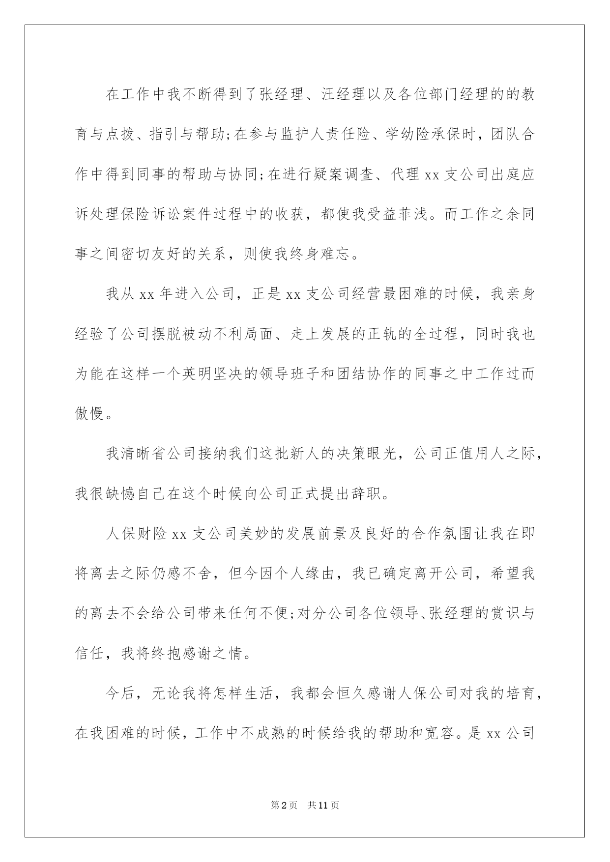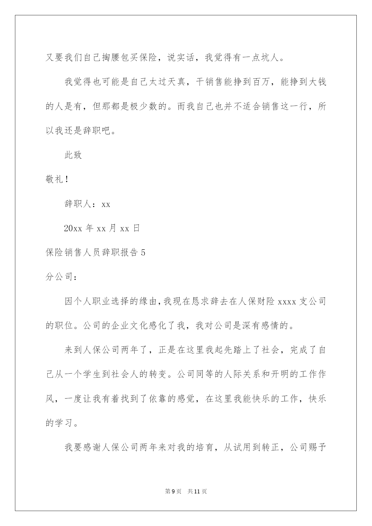 第PAGE\*Arabic\*MERGEFORMAT11页共NUMPAGES\*Arabic\*MERGEFORMAT11页第PAGE\*MERGEFORMAT11页共NUMPAGES\*MERGEFORMAT11页第PAGE\*MERGEFORMAT11页共NUMPAGES\*MERGEFORMAT11页第PAGE\*MERGEFORMAT11页共NUMPAGES\*MERGEFORMAT11页第PAGE\*MERGEFORMAT11页共NUMPAGES\*MERGEFORMAT11页第PAGE\*MERGEFORMAT11页共NUMPAGES\*MERGEFORMAT11页第PAGE\*MERGEFORMAT11页共NUMPAGES\*MERGEFORMAT11页第PAGE\*MERGEFORMAT11页共NUMPAGES\*MERGEFORMAT11页第PAGE\*MERGEFORMAT11页共NUMPAGES\*MERGEFORMAT11页第PAGE\*MERGEFORMAT11页共NUMPAGES\*MERGEFORMAT11页第PAGE\*MERGEFORMAT11页共NUMPAGES\*MERGEFORMAT11页2022保险销售人员辞职报告保险销售人员辞职报告在某个公司做时间长了,介于某些缘由我们会选择离开,这时候写好辞职报告是有必要的。我们该怎么写辞职报告呢?下面是我为大家收集的保险销售人员辞职报告,仅供参考,大家一起来看看吧。保险销售人员辞职报告1敬重的xx分公司领导:因个人职业选择的缘由,我现在恳求辞去在xx财险xx支公司的职位。公司的企业文化感化了我,我对公司是深有感情的。来到xx公司两年了,正是在这里我起先踏上了社会,完成了自己从一个学生到社会人的转变。公司同等的人际关系和开明的工作作风,一度让我有着找到了依靠的感觉,在这里我能快乐的工作,快乐的学习。我要感谢人保公司两年来对我的培育,从试用到转正,公司赐予了我成长的机会和学习发展的平台,各级领导和同事对我的指导、关切和帮助,将使我受益终身。在工作中我不断得到了张经理、汪经理以及各位部门经理的的教育与点拨、指引与帮助;在参与监护人责任险、学幼险承保时,团队合作中得到同事的帮助与协同;在进行疑案调查、代理xx支公司出庭应诉处理保险诉讼案件过程中的收获,都使我受益菲浅。而工作之余同事之间密切友好的关系,则使我终身难忘。我从xx年进入公司,正是xx支公司经营最困难的时候,我亲身经验了公司摆脱被动不利局面、走上发展的正轨的全过程,同时我也为能在这样一个英明坚决的领导班子和团结协作的同事之中工作过而傲慢。我清晰省公司接纳我们这批新人的决策眼光,公司正值用人之际,我很缺憾自己在这个时候向公司正式提出辞职。人保财险xx支公司美妙的发展前景及良好的合作氛围让我在即将离去之际仍感不舍,但今因个人缘由,我已确定离开公司,希望我的离去不会给公司带来任何不便;对分公司各位领导、张经理的赏识与信任,我将终抱感谢之情。今后,无论我将怎样生活,我都会恒久感谢人保公司对我的培育,在我困难的时候,工作中不成熟的时候给我的帮助和宽容。是xx公司给了我现在拥有的一切。我保证并宣誓:一、遵遵守法律律法规、遵守保险职业道德规范。二、保守人保公司商业隐私及各项管理。请接受我的辞职恳求。此致敬礼!辞职人:xxx辞职时间:20xx年xx月xx日保险销售人员辞职报告2敬重的领导:您好!因本人生病的公公常年卧床不能自理缘由,我现在恳求辞去在安吉县人寿保险支公司梅良区部组经理的职位。公司的企业文化感化了我,我对公司是深有感情的。本人来到国寿公司五年整,正是在这里我起先步入了这个大家庭,完成了自己从一个学生到社会人的转变。公司同等的人际关系和开朗的工作作风,一度让我有着找到乐依靠的感觉,在这里我能快乐的工作,快乐的学习。我要感谢公司五年来对我的培育,公司赐予了我成长的机会和学习发展的平台,各级领导和同事对我的指导、关切和帮助,将使我受益终身。在工作中我不断得到了邹经理、周经理以及各级部门经理的教育与点拨、指引与帮助;团队合作中得到同事的帮助与协同;在保险以及保险密切友好的关系,则使我终身难忘。我很缺憾自己在这个时候向公司正式提出辞职。公司美妙的发展前景及良好的合作氛围让我在即将离去之际仍感不舍,但今因个人缘由,我已确定离开公司,希望我的离去不会给公司带来任何不便;对公司各位领导、经理的赏识与信任,我将终抱感谢之情。今后,无论我将怎么样生活,我都会恒久感谢国寿公司对我的培育,在我困难的时候,工作中不成熟的时候给我的帮助和宽容。请接受我的辞职恳求。此致敬礼