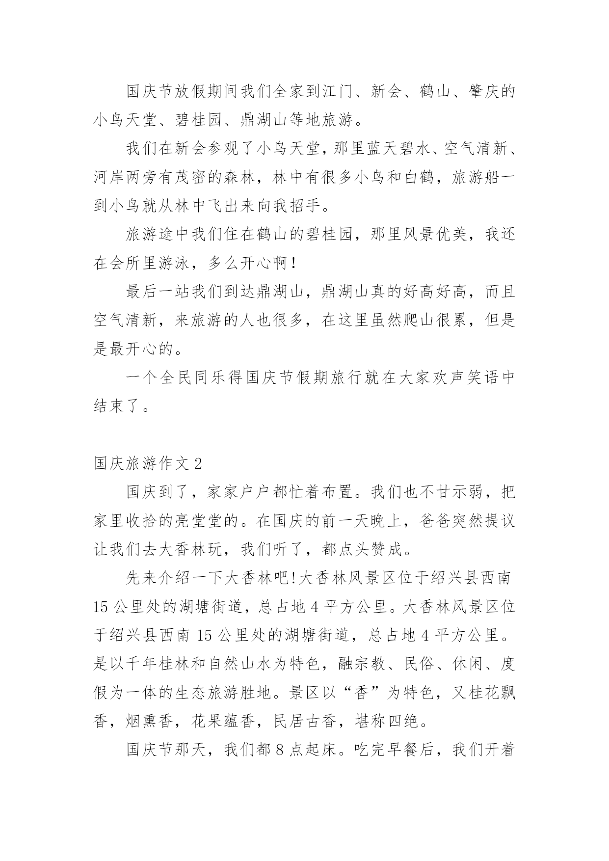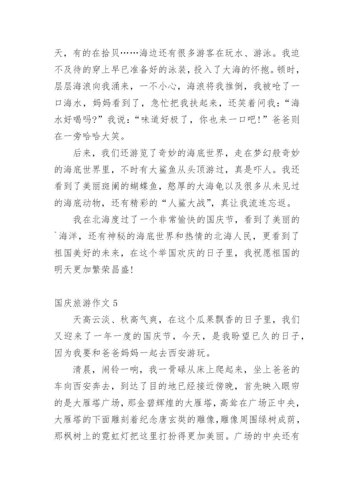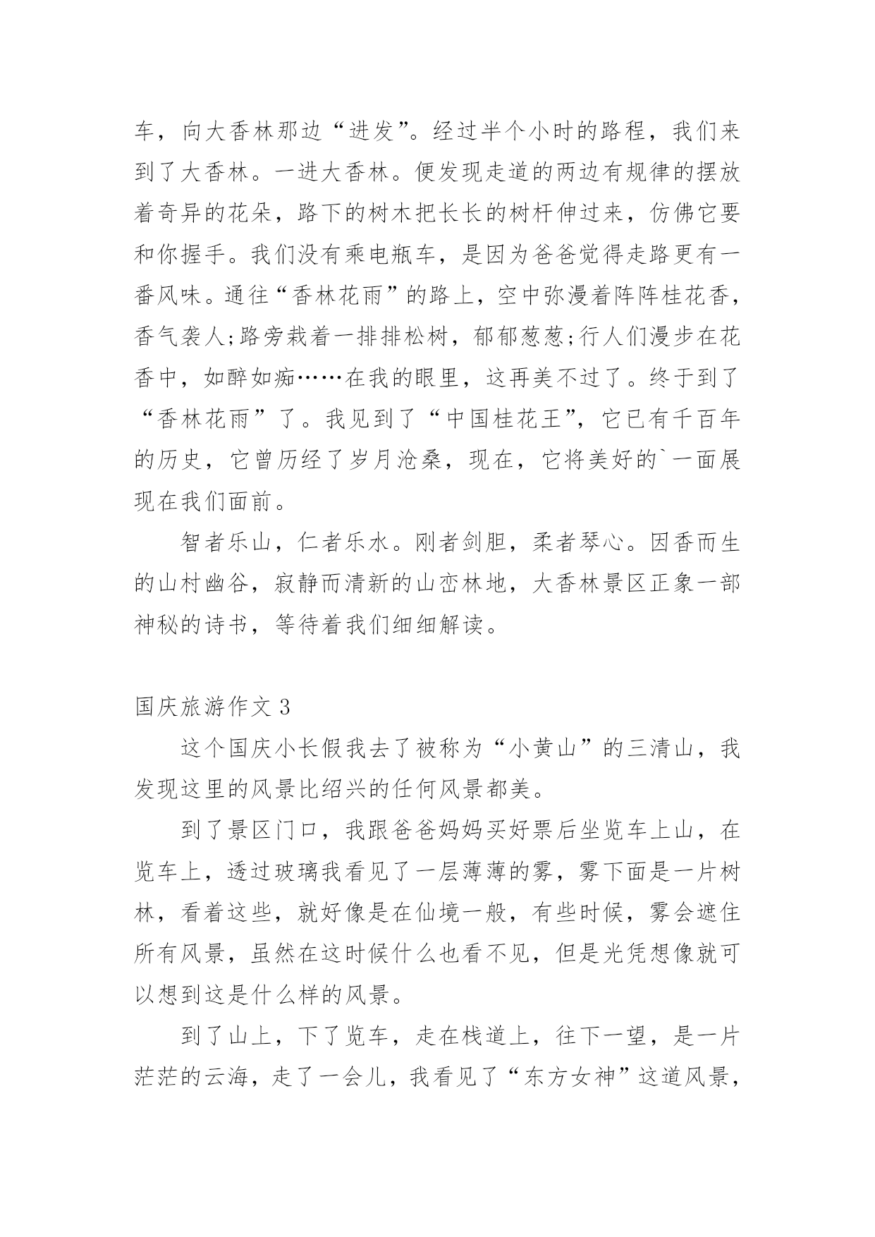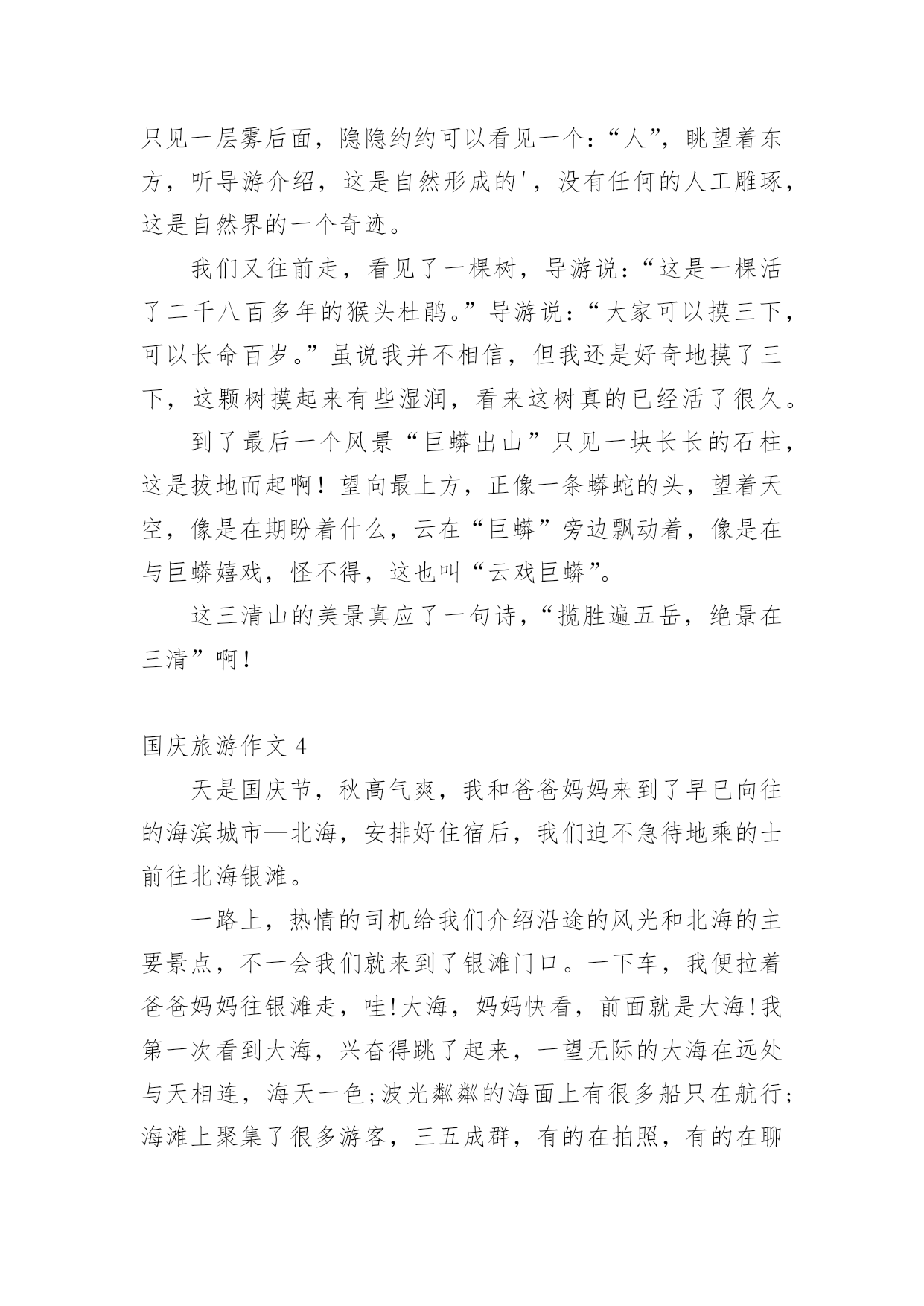 国庆旅游作文在平平淡淡的学习、工作、生活中,许多人都写过作文吧,写作文是培养人们的观察力、联想力、想象力、思考力和记忆力的重要手段。你知道作文怎样才能写的好吗?以下是小编为大家整理的国庆旅游作文,仅供参考,大家一起来看看吧。国庆旅游作文1秋假的一天,我和我的小朋友在妈妈的带领下一起去了古都西安游玩。西安繁华的大街上人来人往,车水马龙,真不愧是六朝古都啊!来到西安的第一天,我们参观了‘世界第八大奇迹’秦始皇兵马俑。它是秦始皇为自己建造的守卫陵墓的庞大“地下兵团”,目前已经发现了三个坑,占地面积有20000平方米,陶马等8000件。其中呢,一号坑面积最大,两百多个士兵手持弓箭,长矛等各种兵器,整整齐齐的站在坑里,好像马上要出发打仗似的。二号坑是一个由战车和骑兵等组成的混合方阵。面积最小的是三号坑,虽然小,但它可是另外两个坑里的部队的指挥部呢。看了这雄伟壮观的'的兵马俑,让我最佩服的是它的精雕细琢的技术,每一个兵马俑不仅神态各异,没有一个是重复的,甚至连身上的头发,衣甲上的鱼鳞纹都刻得栩栩如生。这真是中国古老的历史文明给我上的一堂生动的课啊!国庆节放假期间我们全家到江门、新会、鹤山、肇庆的小鸟天堂、碧桂园、鼎湖山等地旅游。我们在新会参观了小鸟天堂,那里蓝天碧水、空气清新、河岸两旁有茂密的森林,林中有很多小鸟和白鹤,旅游船一到小鸟就从林中飞出来向我招手。旅游途中我们住在鹤山的碧桂园,那里风景优美,我还在会所里游泳,多么开心啊!最后一站我们到达鼎湖山,鼎湖山真的好高好高,而且空气清新,来旅游的人也很多,在这里虽然爬山很累,但是是最开心的。一个全民同乐得国庆节假期旅行就在大家欢声笑语中结束了。国庆旅游作文2国庆到了,家家户户都忙着布置。我们也不甘示弱,把家里收拾的亮堂堂的。在国庆的前一天晚上,爸爸突然提议让我们去大香林玩,我们听了,都点头赞成。先来介绍一下大香林吧!大香林风景区位于绍兴县西南15公里处的湖塘街道,总占地4平方公里。大香林风景区位于绍兴县西南15公里处的湖塘街道,总占地4平方公里。是以千年桂林和自然山水为特色,融宗教、民俗、休闲、度假为一体的生态旅游胜地。景区以“香”为特色,又桂花飘香,烟熏香,花果蕴香,民居古香,堪称四绝。国庆节那天,我们都8点起床。吃完早餐后,我们开着车,向大香林那边“进发”。经过半个小时的路程,我们来到了大香林。一进大香林。便发现走道的两边有规律的摆放着奇异的花朵,路下的树木把长长的树杆伸过来,仿佛它要和你握手。我们没有乘电瓶车,是因为爸爸觉得走路更有一番风味。通往“香林花雨”的路上,空中弥漫着阵阵桂花香,香气袭人;路旁栽着一排排松树,郁郁葱葱;行人们漫步在花香中,如醉如痴……在我的眼里,这再美不过了。终于到了“香林花雨”了。我见到了“中国桂花王”,它已有千百年的历史,它曾历经了岁月沧桑,现在,它将美好的`一面展现在我们面前。智者乐山,仁者乐水。刚者剑胆,柔者琴心。因香而生的山村幽谷,寂静而清新的山峦林地,大香林景区正象一部神秘的诗书,等待着我们细细解读。国庆旅游作文3这个国庆小长假我去了被称为“小黄山”的三清山,我发现这里的风景比绍兴的任何风景都美。到了景区门口,我跟爸爸妈妈买好票后坐览车上山,在览车上,透过玻璃我看见了一层薄薄的雾,雾下面是一片树林,看着这些,就好像是在仙境一般,有些时候,雾会遮住所有风景,虽然在这时候什么也看不见,但是光凭想像就可以想到这是什么样的风景。到了山上,下了览车,走在栈道上,往下一望,是一片茫茫的云海,走了一会儿,我看见了“东方女神”这道风景,只见一层雾后面,隐隐约约可以看见一个:“人”,眺望着东方,听导游介绍,这是自然形成的',没有任何的人工雕琢,这是自然界的一个奇迹。我们又往前走,看见了一棵树,导游说:“这是一棵活了二千八百多年的猴头杜鹃。”导游说:“大家可以摸三下,可以长命百岁。”虽说我并不相信,但我还是好奇地摸了三下,这颗树摸起来有些湿润,看来这树真的已经活了很久。到了最后一个风景“巨蟒出山”只见一块长长的石柱,这是拔地而起啊!望向最上方,正像一条蟒蛇的头,望着天空,像是在期盼着什么,云在“巨蟒”旁边飘动着,像是在与巨蟒嬉戏,怪不得,这也叫“云戏巨蟒”。这三清山的美景真应了一句诗,“揽胜遍五岳,绝景在三清”啊!国庆旅游作文4天是国庆节,秋高气爽,我和爸爸妈妈来到了早已向往的海滨城市—北海,安排好住宿后,我们迫不急待地乘的士前往北海银滩。一路上,热情的司机给我们介绍沿途的风光和北海的主要景点,不一会我们就来到了银滩门口。一下车,我便拉着爸爸妈妈往银滩走,哇!大海,妈妈快看,前面就是大海!我第一次看到大海,兴奋得跳了起来,一望无际的大海在远处与天相连,海天一色;波光粼粼的海面上有很多船只在航行;海滩上聚集了很多游客,三五成群,有的在拍照,有的在聊天,有的在拾贝……