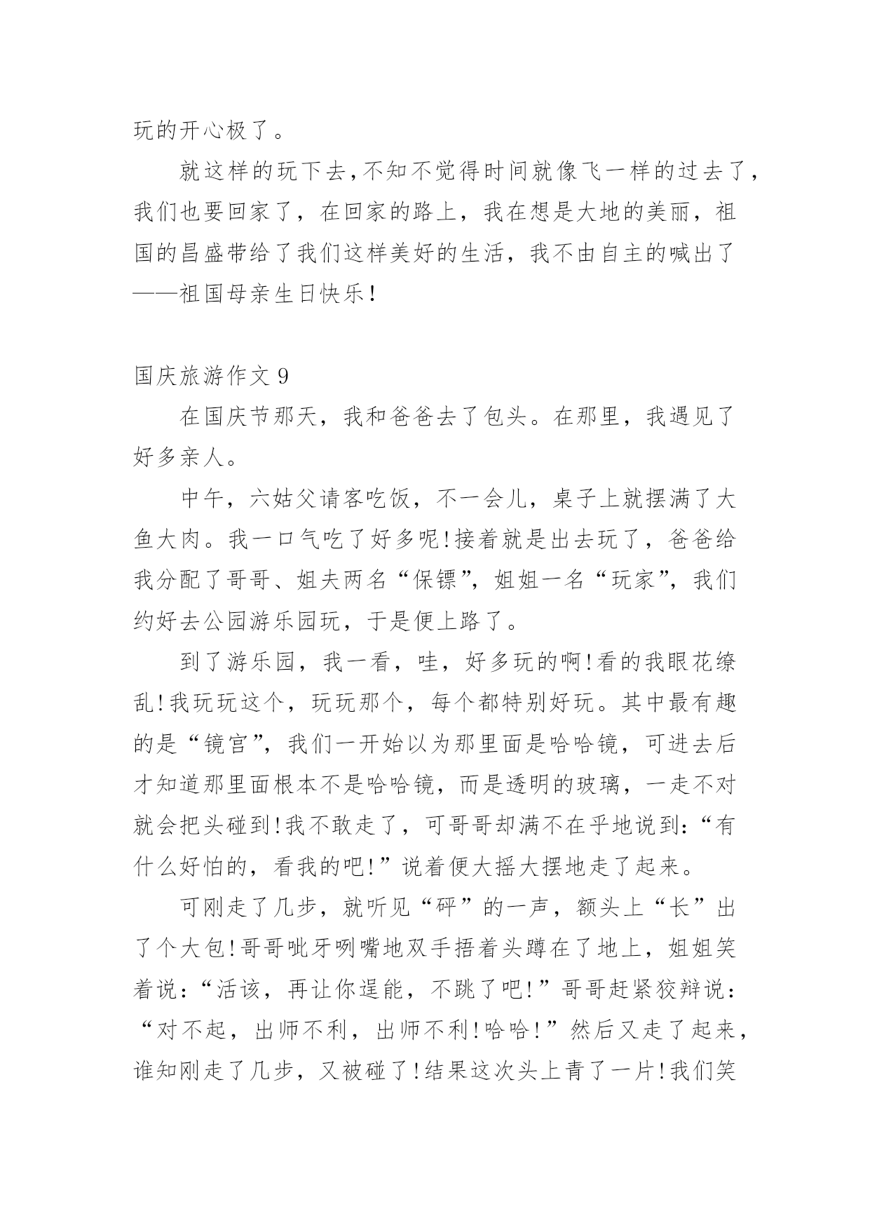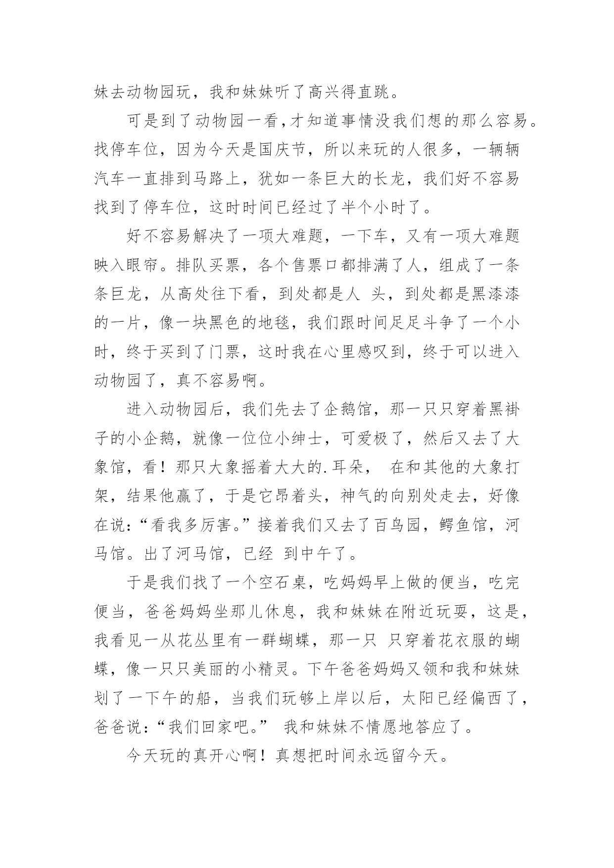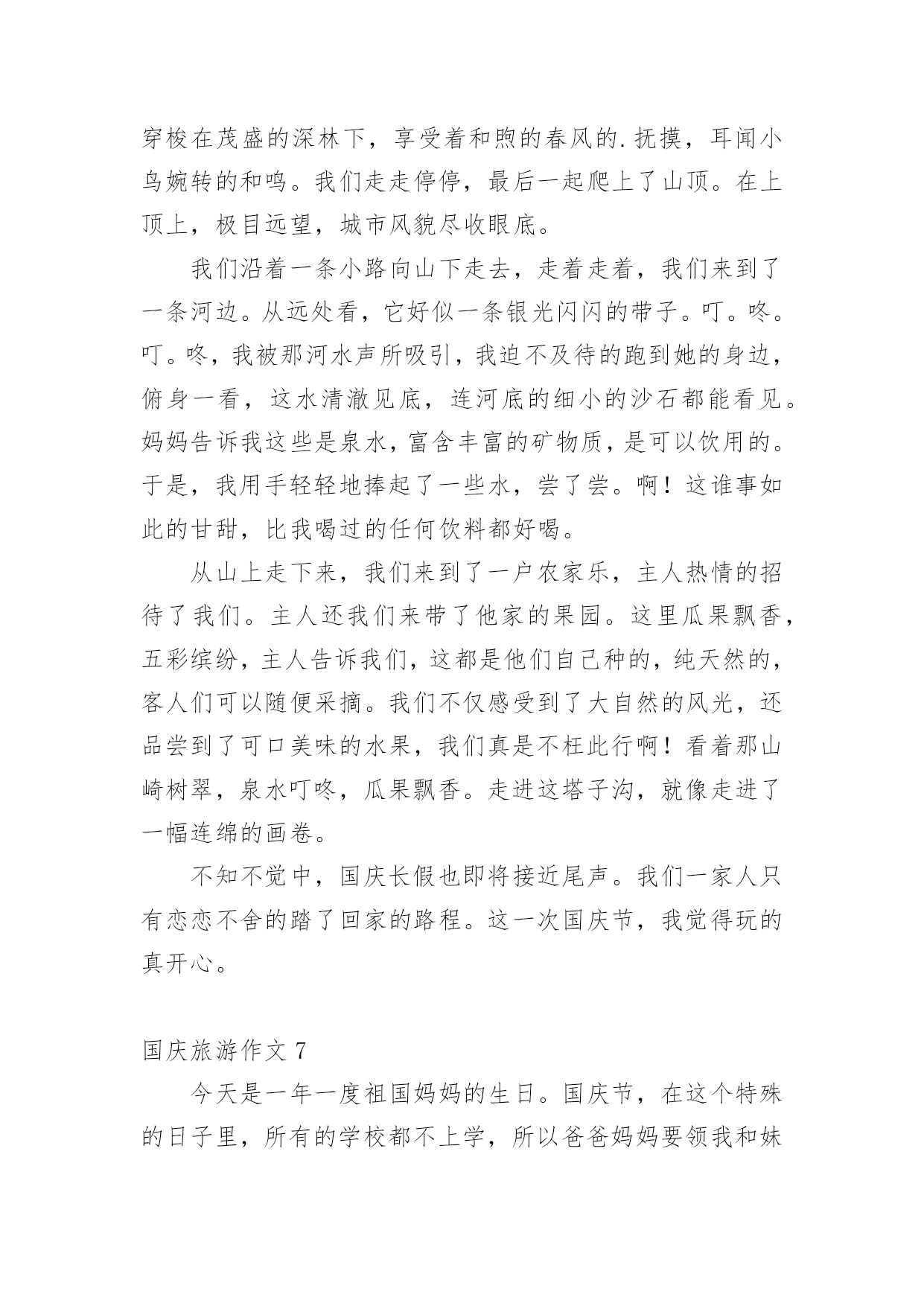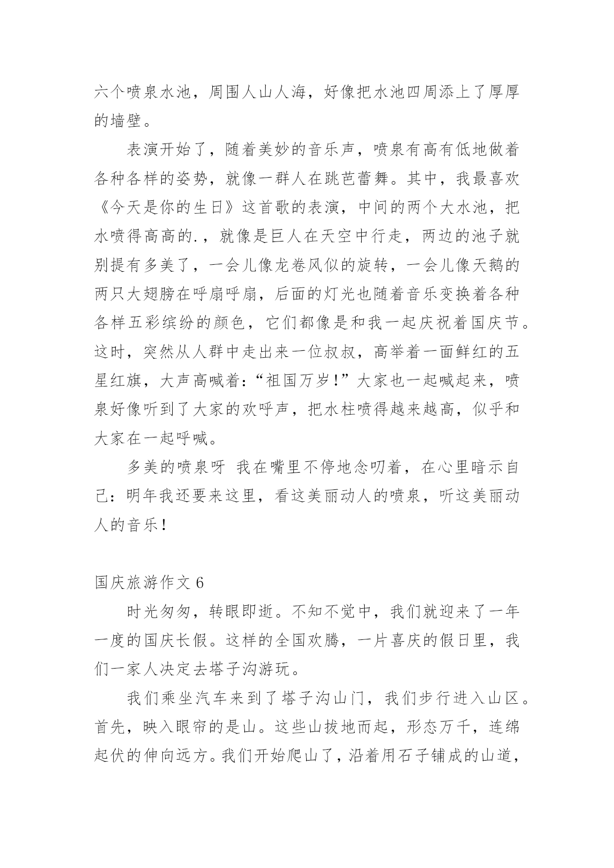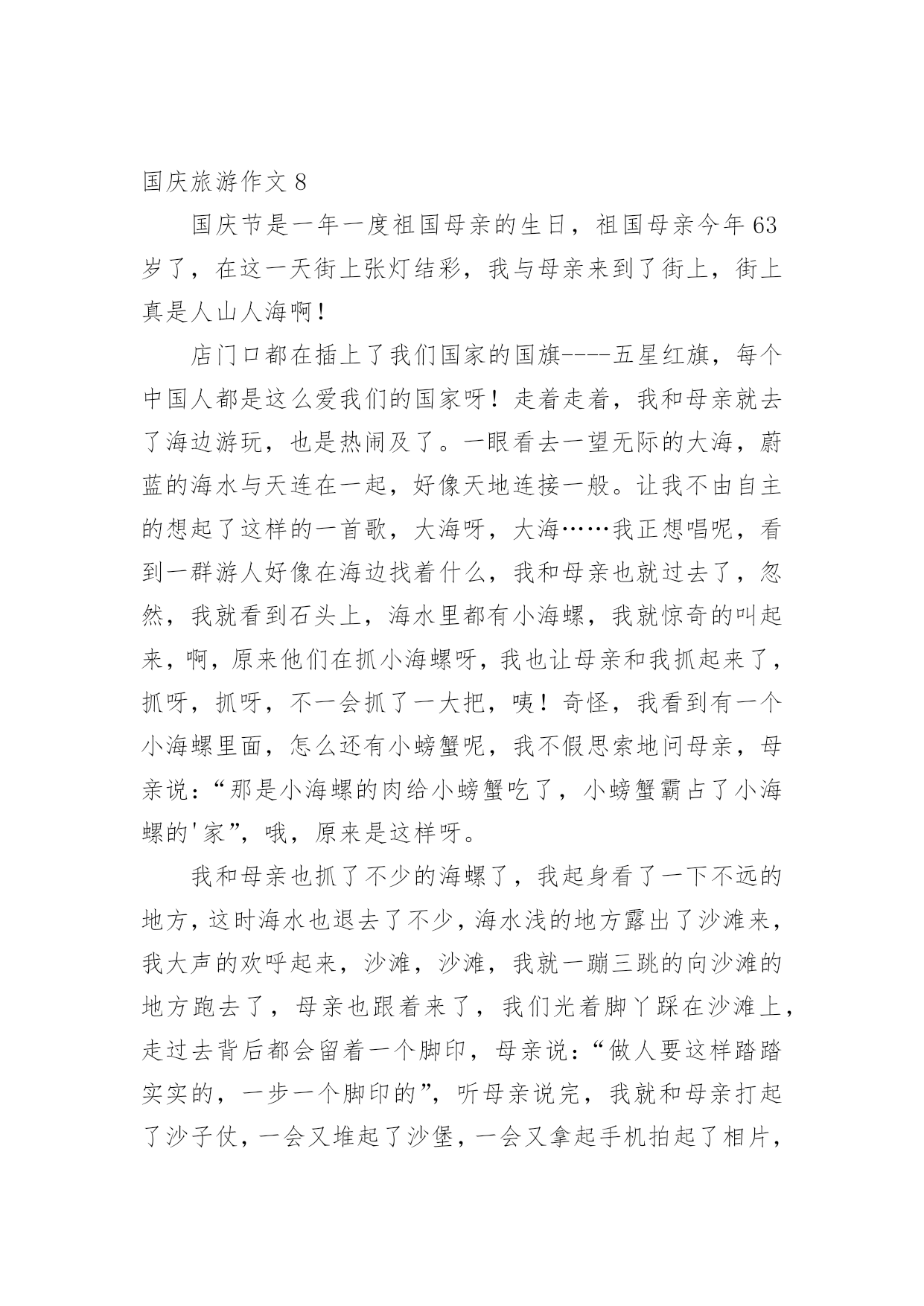 国庆旅游作文在平平淡淡的学习、工作、生活中,许多人都写过作文吧,写作文是培养人们的观察力、联想力、想象力、思考力和记忆力的重要手段。你知道作文怎样才能写的好吗?以下是小编为大家整理的国庆旅游作文,仅供参考,大家一起来看看吧。国庆旅游作文1秋假的一天,我和我的小朋友在妈妈的带领下一起去了古都西安游玩。西安繁华的大街上人来人往,车水马龙,真不愧是六朝古都啊!来到西安的第一天,我们参观了‘世界第八大奇迹’秦始皇兵马俑。它是秦始皇为自己建造的守卫陵墓的庞大“地下兵团”,目前已经发现了三个坑,占地面积有20000平方米,陶马等8000件。其中呢,一号坑面积最大,两百多个士兵手持弓箭,长矛等各种兵器,整整齐齐的站在坑里,好像马上要出发打仗似的。二号坑是一个由战车和骑兵等组成的混合方阵。面积最小的是三号坑,虽然小,但它可是另外两个坑里的部队的指挥部呢。看了这雄伟壮观的'的兵马俑,让我最佩服的是它的精雕细琢的技术,每一个兵马俑不仅神态各异,没有一个是重复的,甚至连身上的头发,衣甲上的鱼鳞纹都刻得栩栩如生。这真是中国古老的历史文明给我上的一堂生动的课啊!国庆节放假期间我们全家到江门、新会、鹤山、肇庆的小鸟天堂、碧桂园、鼎湖山等地旅游。我们在新会参观了小鸟天堂,那里蓝天碧水、空气清新、河岸两旁有茂密的森林,林中有很多小鸟和白鹤,旅游船一到小鸟就从林中飞出来向我招手。旅游途中我们住在鹤山的碧桂园,那里风景优美,我还在会所里游泳,多么开心啊!最后一站我们到达鼎湖山,鼎湖山真的好高好高,而且空气清新,来旅游的人也很多,在这里虽然爬山很累,但是是最开心的。一个全民同乐得国庆节假期旅行就在大家欢声笑语中结束了。国庆旅游作文2国庆到了,家家户户都忙着布置。我们也不甘示弱,把家里收拾的亮堂堂的。在国庆的前一天晚上,爸爸突然提议让我们去大香林玩,我们听了,都点头赞成。先来介绍一下大香林吧!大香林风景区位于绍兴县西南15公里处的湖塘街道,总占地4平方公里。大香林风景区位于绍兴县西南15公里处的湖塘街道,总占地4平方公里。是以千年桂林和自然山水为特色,融宗教、民俗、休闲、度假为一体的生态旅游胜地。景区以“香”为特色,又桂花飘香,烟熏香,花果蕴香,民居古香,堪称四绝。国庆节那天,我们都8点起床。吃完早餐后,我们开着车,向大香林那边“进发”。经过半个小时的路程,我们来到了大香林。一进大香林。便发现走道的两边有规律的摆放着奇异的花朵,路下的树木把长长的树杆伸过来,仿佛它要和你握手。我们没有乘电瓶车,是因为爸爸觉得走路更有一番风味。通往“香林花雨”的路上,空中弥漫着阵阵桂花香,香气袭人;路旁栽着一排排松树,郁郁葱葱;行人们漫步在花香中,如醉如痴……在我的眼里,这再美不过了。终于到了“香林花雨”了。我见到了“中国桂花王”,它已有千百年的历史,它曾历经了岁月沧桑,现在,它将美好的`一面展现在我们面前。智者乐山,仁者乐水。刚者剑胆,柔者琴心。因香而生的山村幽谷,寂静而清新的山峦林地,大香林景区正象一部神秘的诗书,等待着我们细细解读。国庆旅游作文3这个国庆小长假我去了被称为“小黄山”的三清山,我发现这里的风景比绍兴的任何风景都美。到了景区门口,我跟爸爸妈妈买好票后坐览车上山,在览车上,透过玻璃我看见了一层薄薄的雾,雾下面是一片树林,看着这些,就好像是在仙境一般,有些时候,雾会遮住所有风景,虽然在这时候什么也看不见,但是光凭想像就可以想到这是什么样的风景。到了山上,下了览车,走在栈道上,往下一望,是一片茫茫的云海,走了一会儿,我看见了“东方女神”这道风景,只见一层雾后面,隐隐约约可以看见一个:“人”,眺望着东方,听导游介绍,这是自然形成的',没有任何的人工雕琢,这是自然界的一个奇迹。我们又往前走,看见了一棵树,导游说:“这是一棵活了二千八百多年的猴头杜鹃。”导游说:“大家可以摸三下,可以长命百岁。”虽说我并不相信,但我还是好奇地摸了三下,这颗树摸起来有些湿润,看来这树真的已经活了很久。到了最后一个风景“巨蟒出山”只见一块长长的石柱,这是拔地而起啊!望向最上方,正像一条蟒蛇的头,望着天空,像是在期盼着什么,云在“巨蟒”旁边飘动着,像是在与巨蟒嬉戏,怪不得,这也叫“云戏巨蟒”。这三清山的美景真应了一句诗,“揽胜遍五岳,绝景在三清”啊!国庆旅游作文4天是国庆节,秋高气爽,我和爸爸妈妈来到了早已向往的海滨城市—北海,安排好住宿后,我们迫不急待地乘的士前往北海银滩。一路上,热情的司机给我们介绍沿途的风光和北海的主要景点,不一会我们就来到了银滩门口。一下车,我便拉着爸爸妈妈往银滩走,哇!大海,妈妈快看,前面就是大海!我第一次看到大海,兴奋得跳了起来,一望无际的大海在远处与天相连,海天一色;波光粼粼的海面上有很多船只在航行;海滩上聚集了很多游客,三五成群,有的在拍照,有的在聊天,有的在拾贝……
