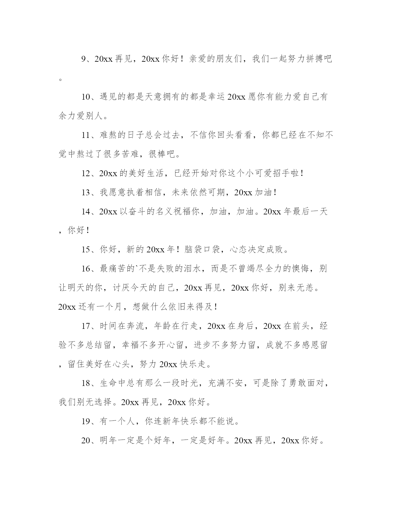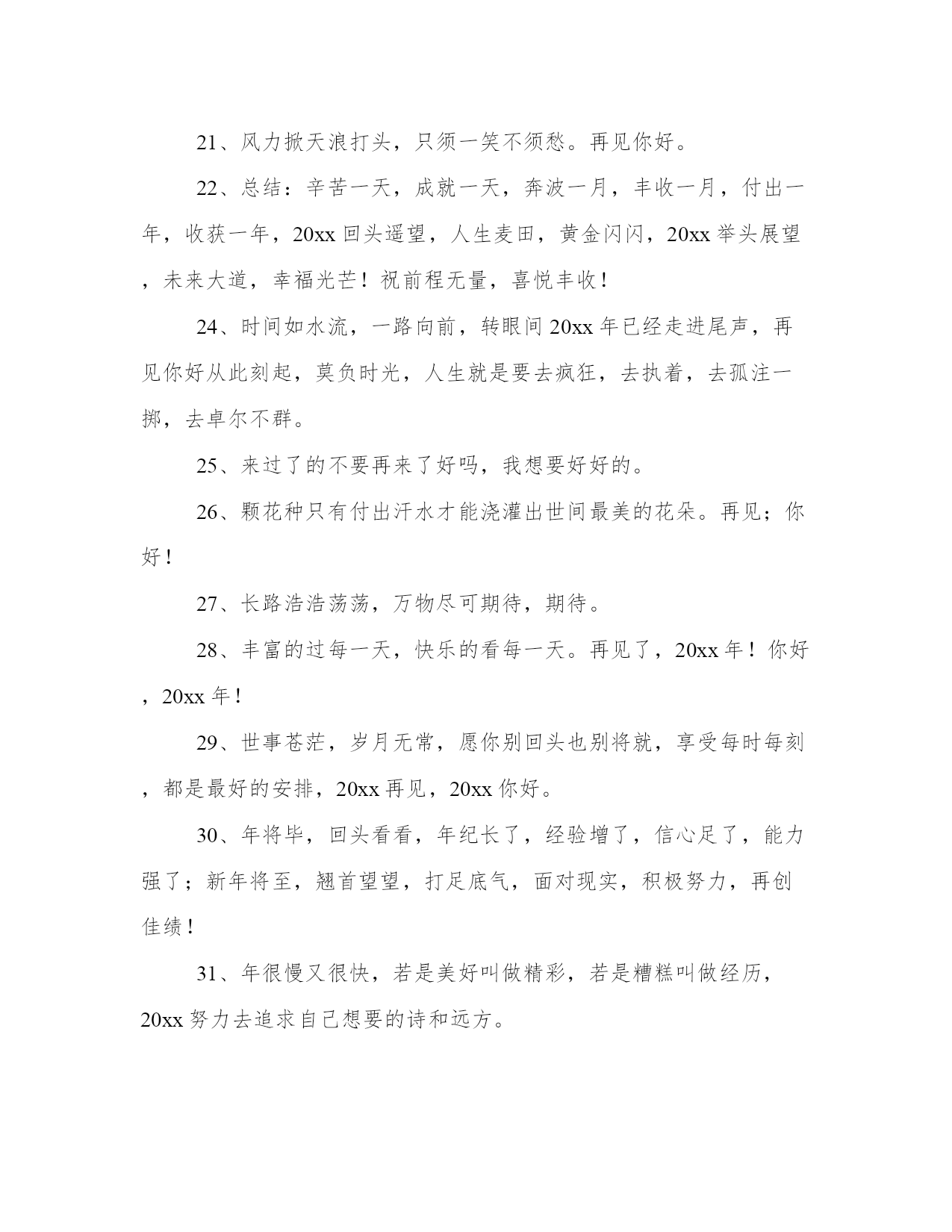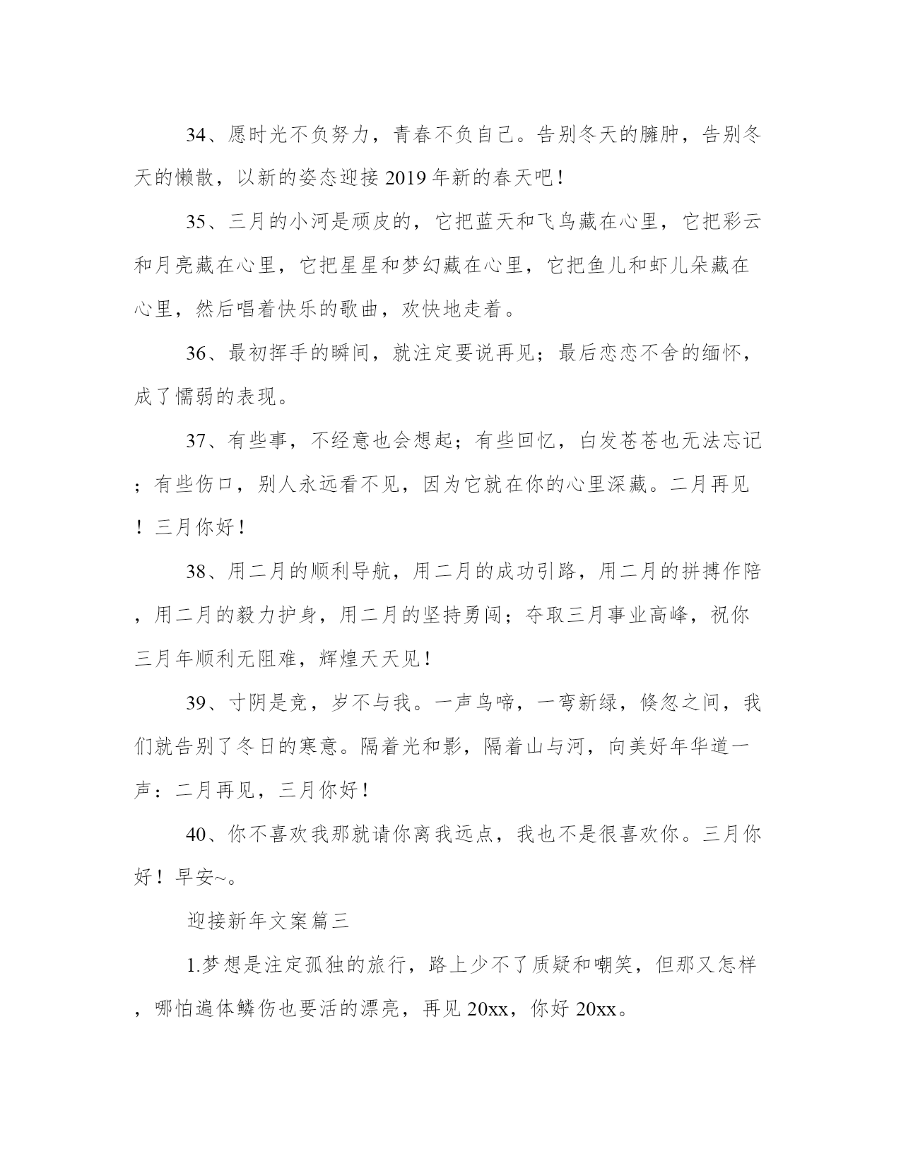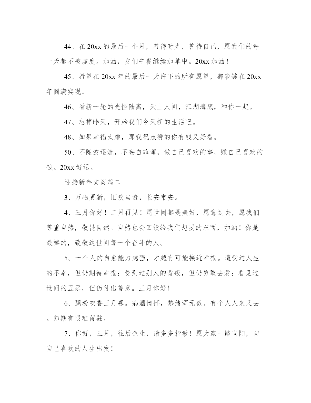 最新迎接新年文案(通用13篇)总结是对已有知识和经验的有机提炼和整体把握,有助于加深理解和记忆。突出亮点,吸引读者的眼球;借鉴这些总结范文的优点和特点,我们可以提升自己的总结写作水平。迎接新年文案篇一1、20xx年,我期望爱的人能欢乐,我期望爱我的人能觉得我值得。2、只有胜利才能生存,只有成功才有代价,只有耕耘才有收获。再见你好。3、送走喜迎在新的一年里,愿我的亲人,朋友,爱人:顺风顺水路更宽,吃嘛嘛香身康健。阖家团圆情更暖,春风得意又一年!4、当渐行渐远的今天即将成为20xx年的封底,当渐行渐近的明天即将成为20xx年的封面,奉上最衷心的祝愿:新年快乐,新年进步!5、愿生活当下如水,未来如诗,当然,始终有你。6、20xx年珍惜爱我的人,放下伤害过我的人,新的一年,应当有新的开始。7、前路浩浩荡荡,万事尽可期待。8、总结20xx年的不足,20xx年你才有更有目标的向前进。9、20xx再见,20xx你好!亲爱的朋友们,我们一起努力拼搏吧。10、遇见的都是天意拥有的都是幸运20xx愿你有能力爱自己有余力爱别人。11、难熬的日子总会过去,不信你回头看看,你都已经在不知不觉中熬过了很多苦难,很棒吧。12、20xx的美好生活,已经开始对你这个小可爱招手啦!13、我愿意执着相信,未来依然可期,20xx加油!14、20xx以奋斗的名义祝福你,加油,加油。20xx年最后一天,你好!15、你好,新的20xx年!脑袋口袋,心态决定成败。16、最痛苦的`不是失败的泪水,而是不曾竭尽全力的懊悔,别让明天的你,讨厌今天的自己,20xx再见,20xx你好,别来无恙。20xx还有一个月,想做什么依旧来得及!17、时间在奔流,年龄在行走,20xx在身后,20xx在前头,经验不多总结留,幸福不多开心留,进步不多努力留,成就不多感恩留,留住美好在心头,努力20xx快乐走。18、生命中总有那么一段时光,充满不安,可是除了勇敢面对,我们别无选择。20xx再见,20xx你好。19、有一个人,你连新年快乐都不能说。20、明年一定是个好年,一定是好年。20xx再见,20xx你好。21、风力掀天浪打头,只须一笑不须愁。再见你好。22、总结:辛苦一天,成就一天,奔波一月,丰收一月,付出一年,收获一年,20xx回头遥望,人生麦田,黄金闪闪,20xx举头展望,未来大道,幸福光芒!祝前程无量,喜悦丰收!24、时间如水流,一路向前,转眼间20xx年已经走进尾声,再见你好从此刻起,莫负时光,人生就是要去疯狂,去执着,去孤注一掷,去卓尔不群。25、来过了的不要再来了好吗,我想要好好的。26、颗花种只有付出汗水才能浇灌出世间最美的花朵。再见;你好!27、长路浩浩荡荡,万物尽可期待,期待。28、丰富的过每一天,快乐的看每一天。再见了,20xx年!你好,20xx年!29、世事苍茫,岁月无常,愿你别回头也别将就,享受每时每刻,都是最好的安排,20xx再见,20xx你好。30、年将毕,回头看看,年纪长了,经验增了,信心足了,能力强了;新年将至,翘首望望,打足底气,面对现实,积极努力,再创佳绩!31、年很慢又很快,若是美好叫做精彩,若是糟糕叫做经历,20xx努力去追求自己想要的诗和远方。32、希望每个人身边唯有一些特别的人他们用心告诉你一句话“我又陪了你一年”33、寒来暑往秋收冬藏,希望我们来日方长。34、囤年货,过好年,20xx理想成真越来越好咸鱼翻身。35、你走你的路,我也走你的路。36、生活中并不全是艰辛和困难,它同时存在舒适与欢乐。就像我们经历的季节,严冬过后是春天,风雪过后艳阳天。20xx再见,20xx你好。37、早睡避免所有矫情。20xx更爱自己。38、怀念总在离别时,就要和20xx说再见了,蓦然发现,太多不舍,这一年,我许下愿望,让20xx永远珍藏于记忆中,亲爱的朋友你要永远快乐健康!39、如果遇见你需要花光我所有的运气那请你离我远一点因为我跨年要打牌。40、当我们什么都做过了还剩下什么可以值得我们留恋。再见你好。41、有时候看到自己的故事,我都替自己感到心酸。42、往后的日子是崭新的,谁也不要回头看了。43、新的一年总会有新的挑战,愿自己还能够保持一个好的心态。再见你好20xx!44、在20xx的最后一个月,善待时光,善待自己,愿我们的每一天都不被虚度。加油,友们午餐继续加单中。20xx加油!45、希望在20xx年的最后一天许下的所有愿望,都能够在20xx年圆满实现。46、看新一轮的光怪陆离,天上人间,江湖海底,和你一起。47、忘掉昨天,开始我们今天新的生活吧。48、如果幸福太难,那我祝点赞的你有钱又好看。50、不随波逐流,不妄自菲薄,做自己喜欢的事,赚自己喜欢的钱。20xx好运。