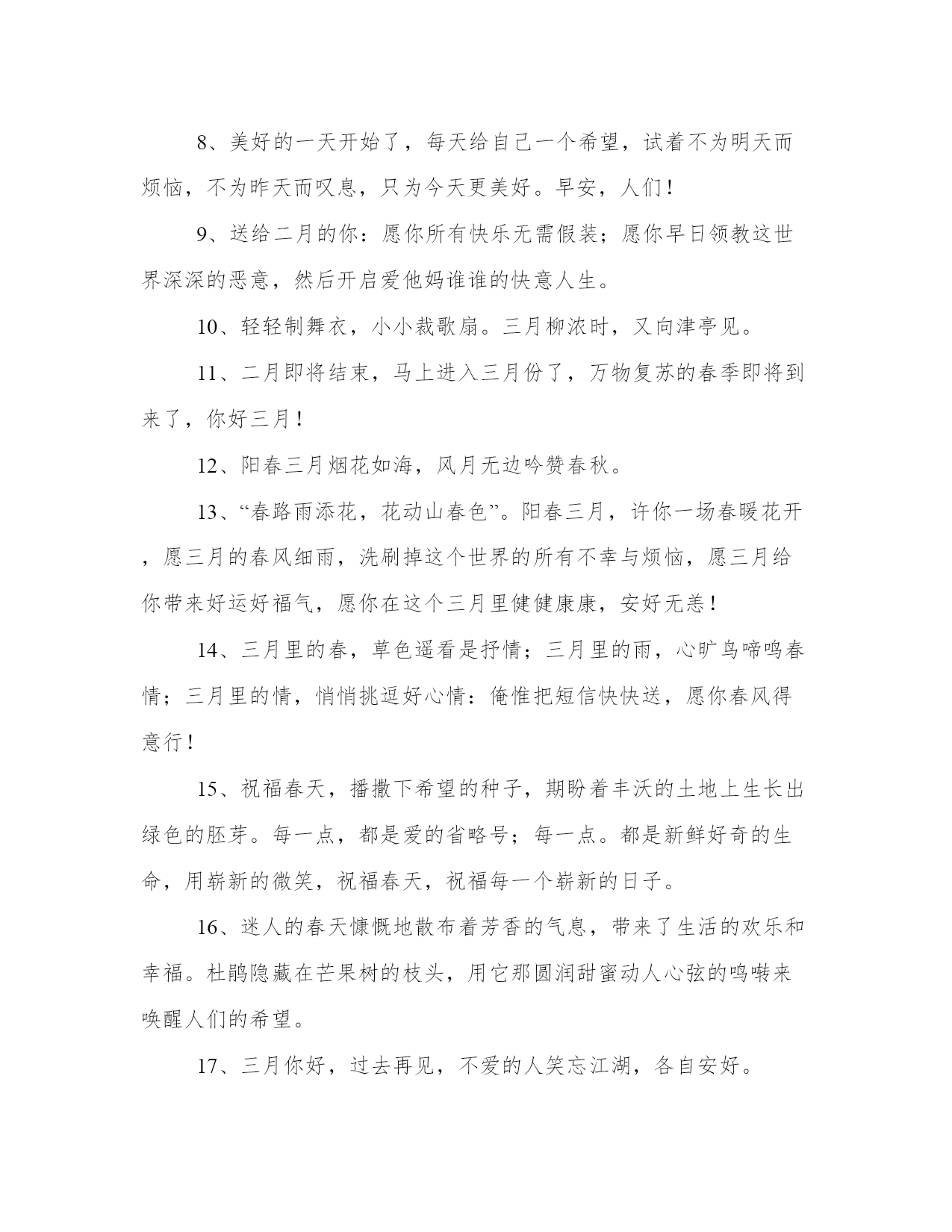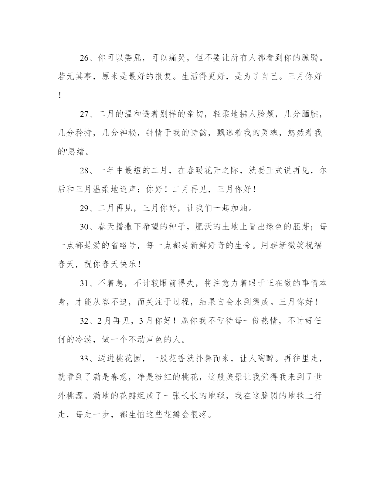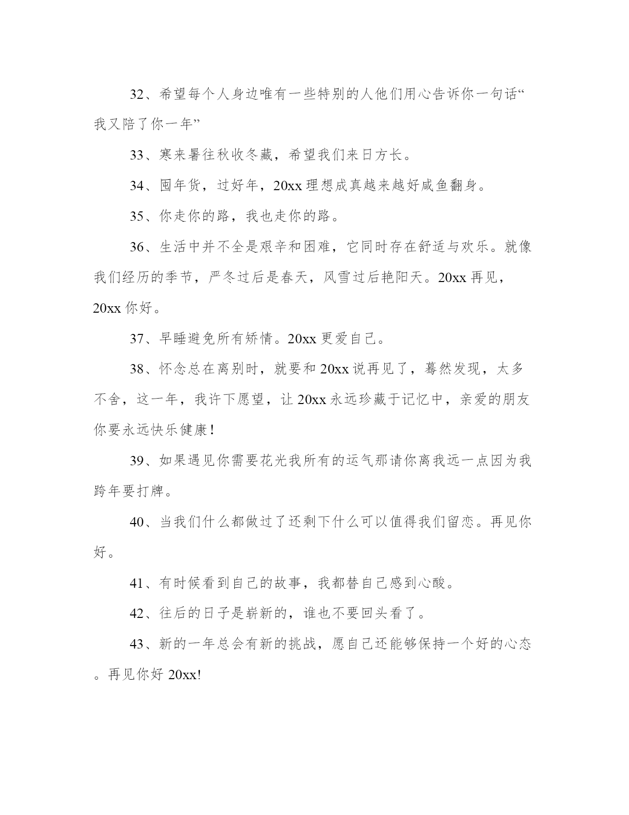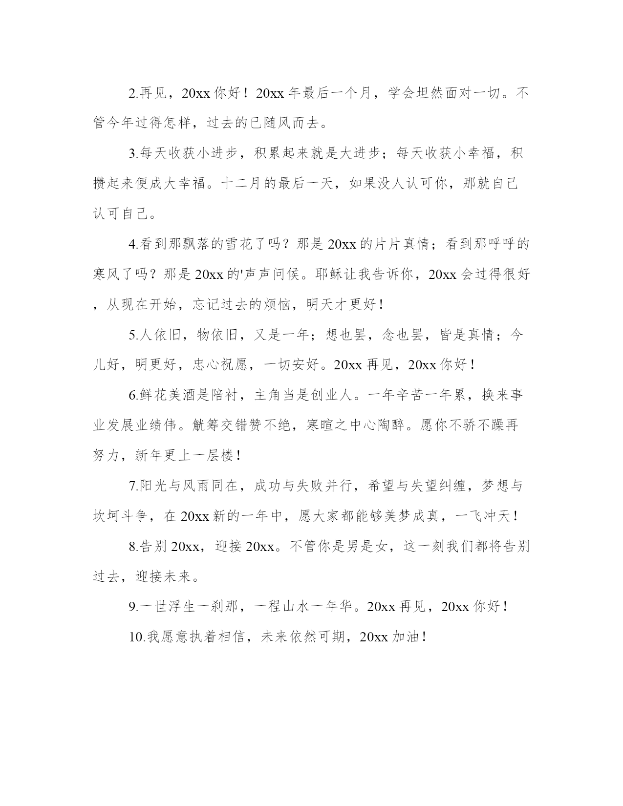 最新迎接新年文案(通用13篇)总结是对已有知识和经验的有机提炼和整体把握,有助于加深理解和记忆。突出亮点,吸引读者的眼球;借鉴这些总结范文的优点和特点,我们可以提升自己的总结写作水平。迎接新年文案篇一1、20xx年,我期望爱的人能欢乐,我期望爱我的人能觉得我值得。2、只有胜利才能生存,只有成功才有代价,只有耕耘才有收获。再见你好。3、送走喜迎在新的一年里,愿我的亲人,朋友,爱人:顺风顺水路更宽,吃嘛嘛香身康健。阖家团圆情更暖,春风得意又一年!4、当渐行渐远的今天即将成为20xx年的封底,当渐行渐近的明天即将成为20xx年的封面,奉上最衷心的祝愿:新年快乐,新年进步!5、愿生活当下如水,未来如诗,当然,始终有你。6、20xx年珍惜爱我的人,放下伤害过我的人,新的一年,应当有新的开始。7、前路浩浩荡荡,万事尽可期待。8、总结20xx年的不足,20xx年你才有更有目标的向前进。9、20xx再见,20xx你好!亲爱的朋友们,我们一起努力拼搏吧。10、遇见的都是天意拥有的都是幸运20xx愿你有能力爱自己有余力爱别人。11、难熬的日子总会过去,不信你回头看看,你都已经在不知不觉中熬过了很多苦难,很棒吧。12、20xx的美好生活,已经开始对你这个小可爱招手啦!13、我愿意执着相信,未来依然可期,20xx加油!14、20xx以奋斗的名义祝福你,加油,加油。20xx年最后一天,你好!15、你好,新的20xx年!脑袋口袋,心态决定成败。16、最痛苦的`不是失败的泪水,而是不曾竭尽全力的懊悔,别让明天的你,讨厌今天的自己,20xx再见,20xx你好,别来无恙。20xx还有一个月,想做什么依旧来得及!17、时间在奔流,年龄在行走,20xx在身后,20xx在前头,经验不多总结留,幸福不多开心留,进步不多努力留,成就不多感恩留,留住美好在心头,努力20xx快乐走。18、生命中总有那么一段时光,充满不安,可是除了勇敢面对,我们别无选择。20xx再见,20xx你好。19、有一个人,你连新年快乐都不能说。20、明年一定是个好年,一定是好年。20xx再见,20xx你好。21、风力掀天浪打头,只须一笑不须愁。再见你好。22、总结:辛苦一天,成就一天,奔波一月,丰收一月,付出一年,收获一年,20xx回头遥望,人生麦田,黄金闪闪,20xx举头展望,未来大道,幸福光芒!祝前程无量,喜悦丰收!24、时间如水流,一路向前,转眼间20xx年已经走进尾声,再见你好从此刻起,莫负时光,人生就是要去疯狂,去执着,去孤注一掷,去卓尔不群。25、来过了的不要再来了好吗,我想要好好的。26、颗花种只有付出汗水才能浇灌出世间最美的花朵。再见;你好!27、长路浩浩荡荡,万物尽可期待,期待。28、丰富的过每一天,快乐的看每一天。再见了,20xx年!你好,20xx年!29、世事苍茫,岁月无常,愿你别回头也别将就,享受每时每刻,都是最好的安排,20xx再见,20xx你好。30、年将毕,回头看看,年纪长了,经验增了,信心足了,能力强了;新年将至,翘首望望,打足底气,面对现实,积极努力,再创佳绩!31、年很慢又很快,若是美好叫做精彩,若是糟糕叫做经历,20xx努力去追求自己想要的诗和远方。32、希望每个人身边唯有一些特别的人他们用心告诉你一句话“我又陪了你一年”33、寒来暑往秋收冬藏,希望我们来日方长。34、囤年货,过好年,20xx理想成真越来越好咸鱼翻身。35、你走你的路,我也走你的路。36、生活中并不全是艰辛和困难,它同时存在舒适与欢乐。就像我们经历的季节,严冬过后是春天,风雪过后艳阳天。20xx再见,20xx你好。37、早睡避免所有矫情。20xx更爱自己。38、怀念总在离别时,就要和20xx说再见了,蓦然发现,太多不舍,这一年,我许下愿望,让20xx永远珍藏于记忆中,亲爱的朋友你要永远快乐健康!39、如果遇见你需要花光我所有的运气那请你离我远一点因为我跨年要打牌。40、当我们什么都做过了还剩下什么可以值得我们留恋。再见你好。41、有时候看到自己的故事,我都替自己感到心酸。42、往后的日子是崭新的,谁也不要回头看了。43、新的一年总会有新的挑战,愿自己还能够保持一个好的心态。再见你好20xx!44、在20xx的最后一个月,善待时光,善待自己,愿我们的每一天都不被虚度。加油,友们午餐继续加单中。20xx加油!45、希望在20xx年的最后一天许下的所有愿望,都能够在20xx年圆满实现。46、看新一轮的光怪陆离,天上人间,江湖海底,和你一起。47、忘掉昨天,开始我们今天新的生活吧。48、如果幸福太难,那我祝点赞的你有钱又好看。50、不随波逐流,不妄自菲薄,做自己喜欢的事,赚自己喜欢的钱。20xx好运。