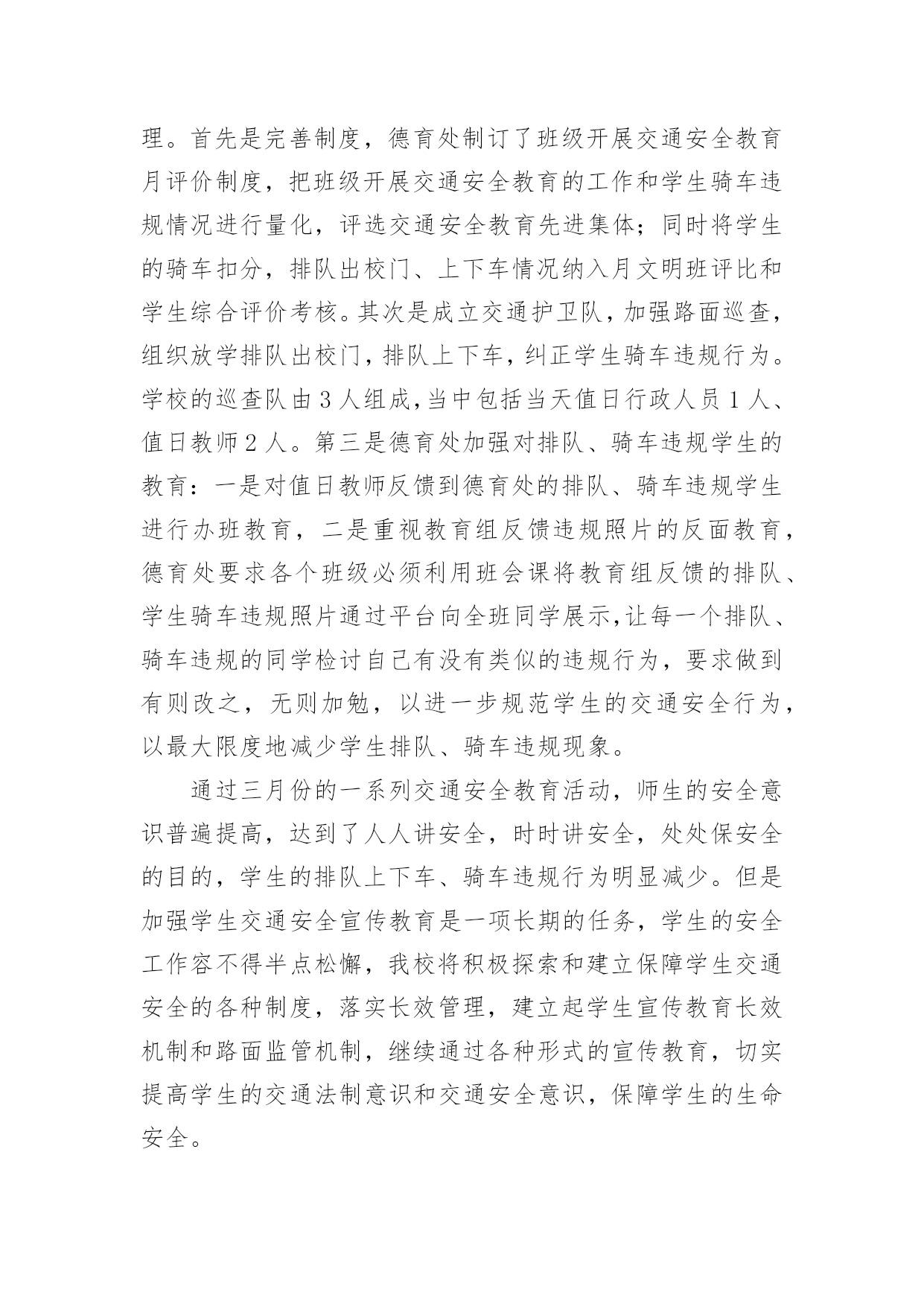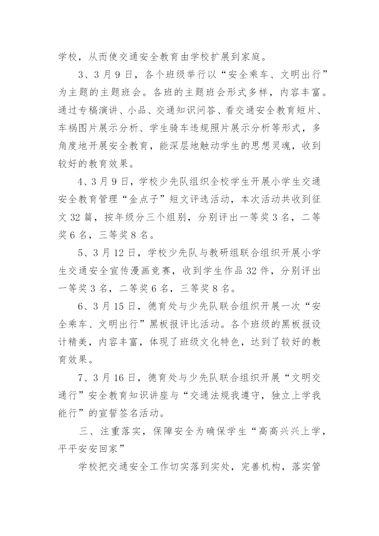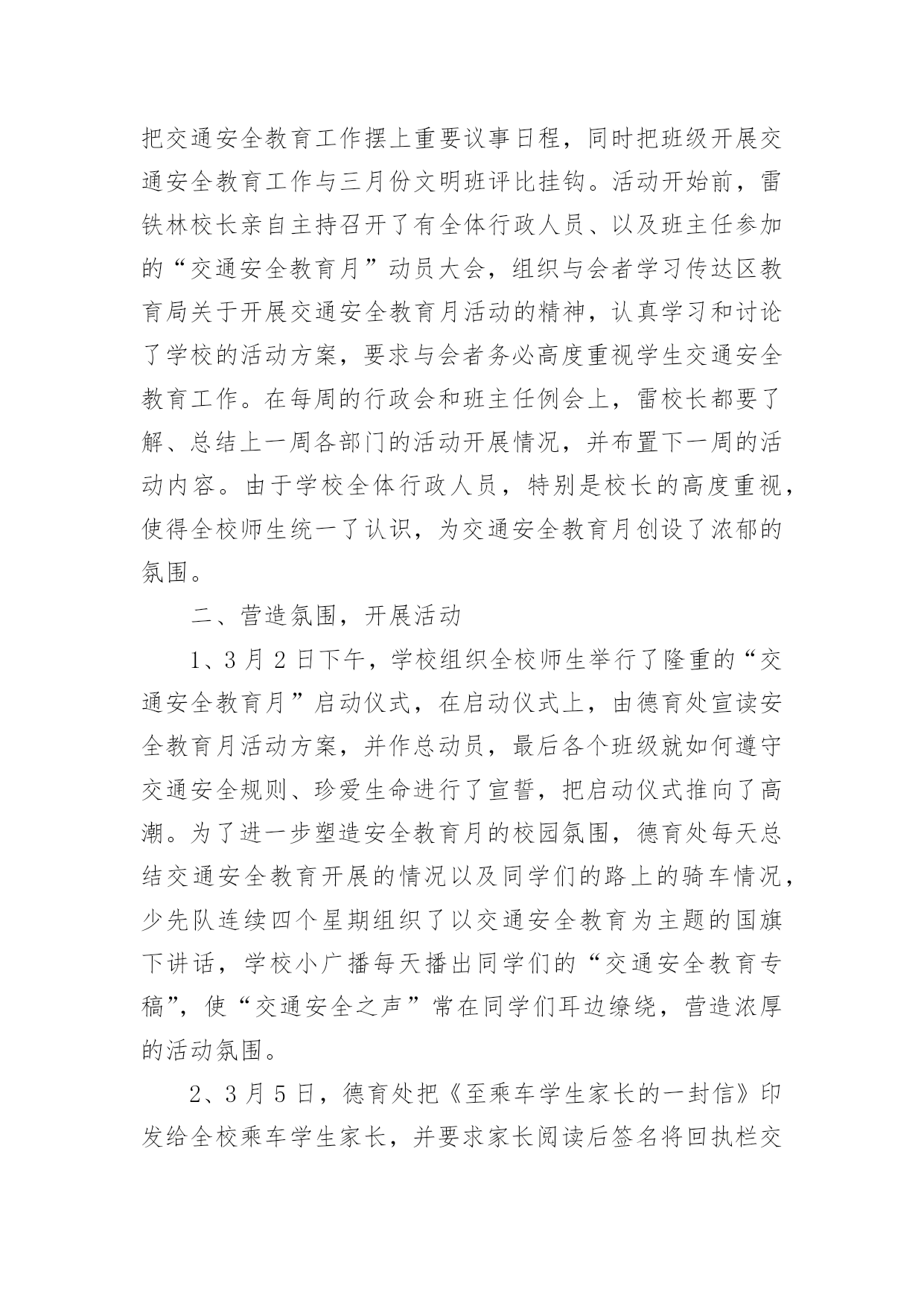 交通安全生产月工作总结交通安全生产月工作总结通用总结是在一段时间内对学习和工作生活等表现加以总结和概括的一种书面材料,它可以促使我们思考,不妨坐下来好好写写总结吧。总结怎么写才不会千篇一律呢?下面是小编精心整理的交通安全生产月工作总结通用,欢迎阅读,希望大家能够喜欢。为了全面落实区教育局关于在三月份开展交通安全教育月的相关要求,切实增强我校师生交通安全法制意识,提高学生的自我保护能力,预防涉及师生的交通事故,最大限度地减少涉及学生交通事故的发生,我校在过去的一个月,结合学校的实际,按照《学校交通安全教育活动方案》,开展了一系列交通安全教育活动。现就本项工作作如下总结:一、加强领导,统一思想1、成立领导小组。学校成立校宣传月活动领导小组,由雷铁林校长任组长,蒋利文副校长任任副组长、其他行政人员、班主任、值日教师为成员,负责组织实施全校交通安全教育月活动工作。同时设置交通安全教育月工作办公室,办公地点设在德育处,负责宣传月活动具体工作,并由德育处负责,拟订了《交通安全教育活动方案》。2、领导重视。安全工作重于泰山,生命安全大于天。学校全体行政视交通安全教育工作为学校三月份之重心,并把交通安全教育工作摆上重要议事日程,同时把班级开展交通安全教育工作与三月份文明班评比挂钩。活动开始前,雷铁林校长亲自主持召开了有全体行政人员、以及班主任参加的“交通安全教育月”动员大会,组织与会者学习传达区教育局关于开展交通安全教育月活动的精神,认真学习和讨论了学校的活动方案,要求与会者务必高度重视学生交通安全教育工作。在每周的行政会和班主任例会上,雷校长都要了解、总结上一周各部门的活动开展情况,并布置下一周的活动内容。由于学校全体行政人员,特别是校长的高度重视,使得全校师生统一了认识,为交通安全教育月创设了浓郁的氛围。二、营造氛围,开展活动1、3月2日下午,学校组织全校师生举行了隆重的“交通安全教育月”启动仪式,在启动仪式上,由德育处宣读安全教育月活动方案,并作总动员,最后各个班级就如何遵守交通安全规则、珍爱生命进行了宣誓,把启动仪式推向了高潮。为了进一步塑造安全教育月的校园氛围,德育处每天总结交通安全教育开展的情况以及同学们的路上的骑车情况,少先队连续四个星期组织了以交通安全教育为主题的国旗下讲话,学校小广播每天播出同学们的“交通安全教育专稿”,使“交通安全之声”常在同学们耳边缭绕,营造浓厚的活动氛围。2、3月5日,德育处把《至乘车学生家长的一封信》印发给全校乘车学生家长,并要求家长阅读后签名将回执栏交学校,从而使交通安全教育由学校扩展到家庭。3、3月9日,各个班级举行以“安全乘车、文明出行”为主题的主题班会。各班的主题班会形式多样,内容丰富。通过专稿演讲、小品、交通知识问答、看交通安全教育短片、车祸图片展示分析、学生骑车违规照片展示分析等形式,多角度地开展安全教育,能深层地触动学生的思想灵魂,收到较好的教育效果。4、3月9日,学校少先队组织全校学生开展小学生交通安全教育管理“金点子”短文评选活动,本次活动共收到征文32篇,按年级分三个组别,分别评出一等奖3名,二等奖6名,三等奖8名。5、3月12日,学校少先队与教研组联合组织开展小学生交通安全宣传漫画竞赛,收到学生作品32件,分别评出一等奖3名,二等奖6名,三等奖8名。6、3月15日,德育处与少先队联合组织开展一次“安全乘车、文明出行”黑板报评比活动。各个班级的黑板报设计精美,内容丰富,体现了班级文化特色,达到了较好的教育效果。7、3月16日,德育处与少先队联合组织开展“文明交通行”安全教育知识讲座与“交通法规我遵守,独立上学我能行”的宣誓签名活动。三、注重落实,保障安全为确保学生“高高兴兴上学,平平安安回家”学校把交通安全工作切实落到实处,完善机构,落实管理。首先是完善制度,德育处制订了班级开展交通安全教育月评价制度,把班级开展交通安全教育的工作和学生骑车违规情况进行量化,评选交通安全教育先进集体;同时将学生的骑车扣分,排队出校门、上下车情况纳入月文明班评比和学生综合评价考核。其次是成立交通护卫队,加强路面巡查,组织放学排队出校门,排队上下车,纠正学生骑车违规行为。学校的巡查队由3人组成,当中包括当天值日行政人员1人、值日教师2人。第三是德育处加强对排队、骑车违规学生的教育:一是对值日教师反馈到德育处的排队、骑车违规学生进行办班教育,二是重视教育组反馈违规照片的反面教育,德育处要求各个班级必须利用班会课将教育组反馈的排队、学生骑车违规照片通过平台向全班同学展示,让每一个排队、骑车违规的同学检讨自己有没有类似的违规行为,要求做到有则改之,无则加勉,以进一步规范学生的交通安全行为,以最大限度地减少学生排队、骑车违规现象。通过三月份的一系列交通安全教育活动,师生的安全意识普遍提高,达到了人人讲安全,