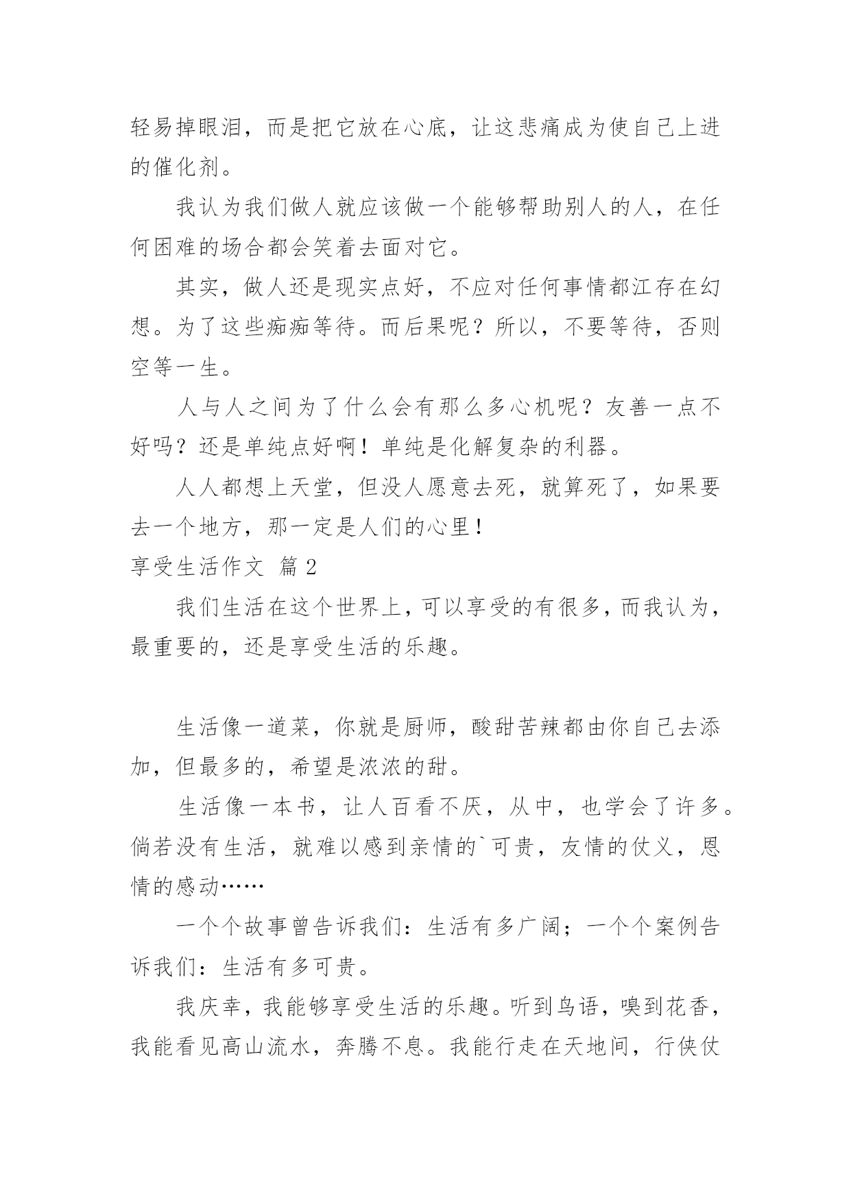 享受生活作文【精选】享受生活作文4篇在平平淡淡的日常中,大家都经常看到作文的身影吧,作文一定要做到主题集中,围绕同一主题作深入阐述,切忌东拉西扯,主题涣散甚至无主题。如何写一篇有思想、有文采的作文呢?下面是小编为大家整理的享受生活作文4篇,仅供参考,欢迎大家阅读。享受生活作文篇1还记得吗?向着流星许下的心愿,人生难免经历重重>挫折。人生浪潮时而潮起时而潮落。但面对这些千万不要退缩,而是要笑着去迎接它,向它挑战。一路上的风雨再艰辛都不要害怕,面对这些,你对自己说:“这些都没什么了不起,我能战胜它。“生命像烟火,一闪即逝,然而这短暂的`人生应该如何才过的有意义呢?不需要烘烘烈烈,永远不息不来才最重要,不是吗?“在徘徊孤单中坚强,就算很受伤也不闪泪光,总有一天,所有梦想都会开花“人生不也是这样吗?不要每天抱怨自己的不幸,那样你会活的很辛苦,阳光总在风雨后,不经历风雨怎么见彩。我们是21世纪的青少年就应该多经历挫折,经过风雨的洗涤,那样才会变的更坚强,真所谓"吃苦也是一种知识"眼泪是懦弱的标志。任何事情,一量遇到挫折,都不要轻易掉眼泪,而是把它放在心底,让这悲痛成为使自己上进的催化剂。我认为我们做人就应该做一个能够帮助别人的人,在任何困难的场合都会笑着去面对它。其实,做人还是现实点好,不应对任何事情都江存在幻想。为了这些痴痴等待。而后果呢?所以,不要等待,否则空等一生。人与人之间为了什么会有那么多心机呢?友善一点不好吗?还是单纯点好啊!单纯是化解复杂的利器。人人都想上天堂,但没人愿意去死,就算死了,如果要去一个地方,那一定是人们的心里!享受生活作文篇2我们生活在这个世界上,可以享受的有很多,而我认为,最重要的,还是享受生活的乐趣。生活像一道菜,你就是厨师,酸甜苦辣都由你自己去添加,但最多的,希望是浓浓的甜。生活像一本书,让人百看不厌,从中,也学会了许多。倘若没有生活,就难以感到亲情的`可贵,友情的仗义,恩情的感动……一个个故事曾告诉我们:生活有多广阔;一个个案例告诉我们:生活有多可贵。我庆幸,我能够享受生活的乐趣。听到鸟语,嗅到花香,我能看见高山流水,奔腾不息。我能行走在天地间,行侠仗义,生活的乐趣有许多,帮助别人是一种快乐,受人帮助是一种快乐。与人交流是一种快乐,回报社会更是一种快乐。既能享受到成功的喜悦,也能享受到失败的无奈,这也是一种难得的快乐。当你饥饿时,有人会为你做饭。当你生病时,有人会为你着急。当天气转凉时,有人会提醒你加衣。当你遭遇困难时,有人会为你献上一份力。这些都是生活的乐趣。虽然生活有时会遭遇挫折,但你一定要相信,你一定会成功的。永远不要放弃生的希望,尽情享受生活的乐趣吧!享受生活作文篇3毕业考试结束了,我取得了全班第一的成绩,此时,我的心情十分愉悦,到现在也还有几丝快意。上午,我见窗外阳光明媚,于是来到阳台上欣赏风景。只见楼外的大草地上撒满了光芒,绿油油的草似乎被染上了金灿灿的油丝,小草颗颗都是齐刷刷的,笔挺笔挺的,十分有精神。草地的外围是一圈跑道,跑道的一侧有一块草地,草地上种了许多花和树。六棵树紧紧地挨在一起,它们枝繁叶茂,有的树上开了红花,花是由四片长的红叶组合起来的;有的树上开了粉花,花是由几朵小粉花挤在一起的。在树的旁边,有一丛月牙形的花,前半部分的花是白色的.,花瓣向四周展开,它的叶子又长又绿;而它的尖尖部分种的是黄花,很有新意。这时一阵微风吹过,陆续不断,一只蝴蝶的影子在跑道上蠕动,原来是一只菜蝶。菜蝶伴随着风飞过停歇在一棵树上,洁白的翅膀合拢着,一动不动。跑道上,一只小麻雀在阳光下蹦跳了几下,脑袋左右望了望后,便扇动着它那轻巧的翅膀,飞走了。我看着这一切,感到很快乐,心情也十分舒畅。大自然多神奇啊!它用这些植物美化了世界,改变了生活,让我尽情地享受,这是大自然对我们的恩赐!我抬头望了望天,天是那么蓝,云是那么白,除此之外还有在天空飞翔的鸟,这一切没有一点瑕疵;再看看地上,刚考完试的一、二年级小朋友在树下追逐、嬉戏,几个老奶奶坐在椅子上一边乘凉一边聊天,好不自大!近处,一辆崭新的白色车停泊在两棵树之间,是那么的耀眼。这样,在我眼里的景物都成为了美的化身。那么美丽的景色,我们应该要抽出时间多欣赏。欣赏景色,就是在享受生活。享受生活作文篇4他是一个很聪明的男孩子,一点就通,无论什么事情什么工作,跟他稍微说一说,他就能明白个大概。我知道在这个过程当中很多决定对他来说并不公平,但是他却心胸坦荡,面色从容的接受了所有一切。所以从那个时候开始,我对他的印象是慢慢的变得越来越好的。我知道在这个世界上很多事情都不容易,包括那些人的决定,包括那些人不一样的`选择,他们觉得会考虑很多事情,对于他们而言梦想都并不长远,他们想要不断地去经历那些生活当中的冗杂事务,人生其实本来就是这样的一个过程,不断的失败,然后从失败当