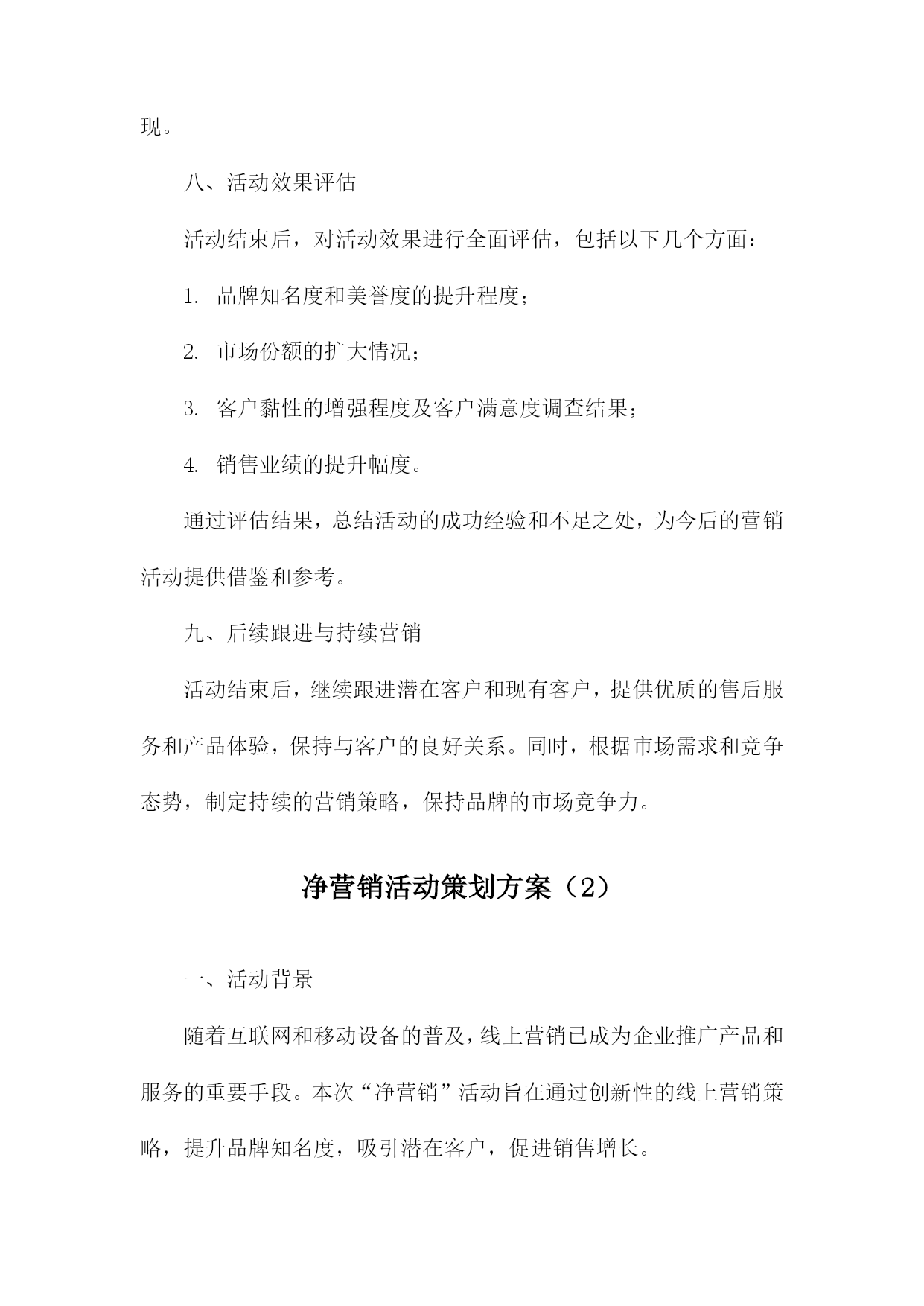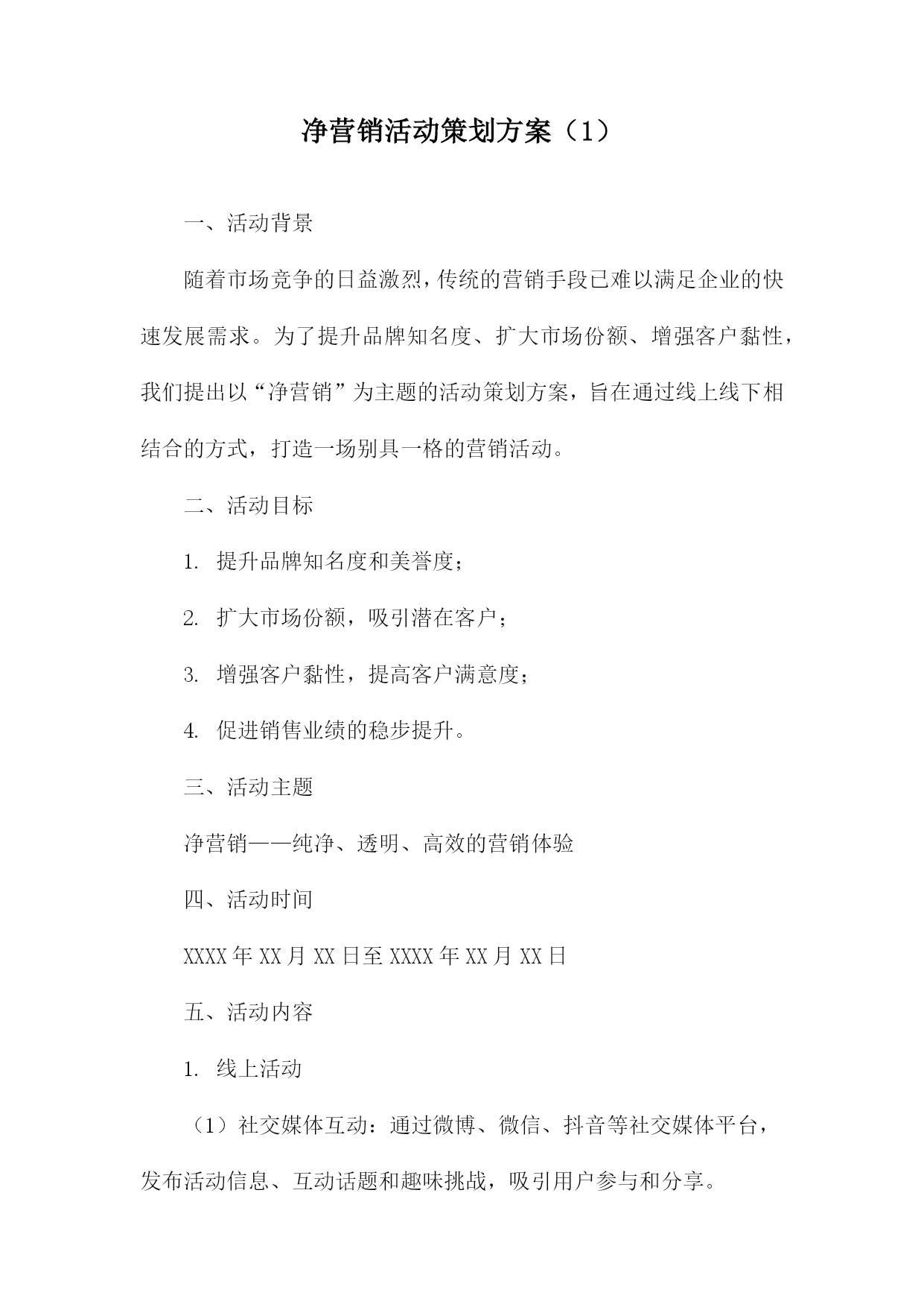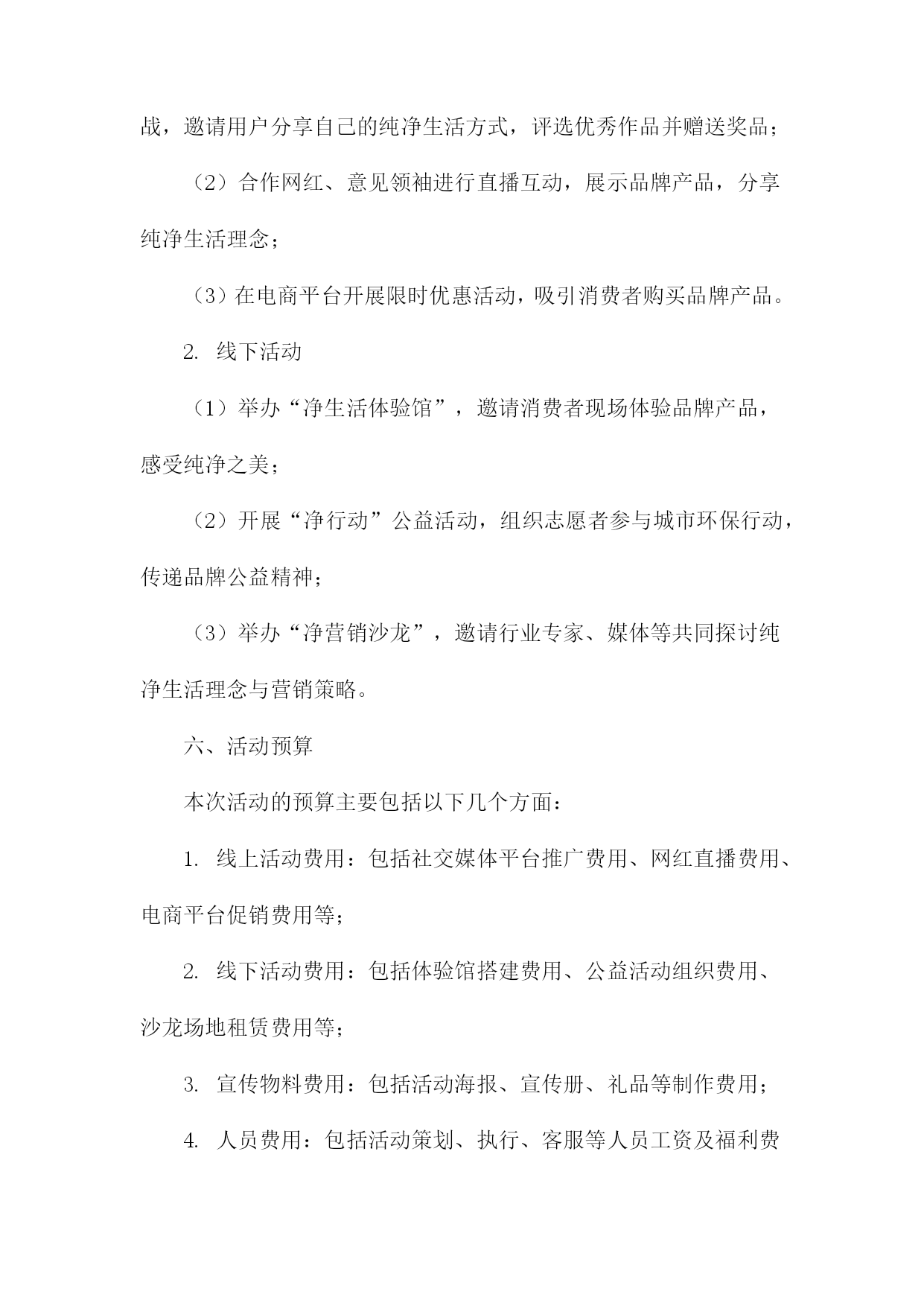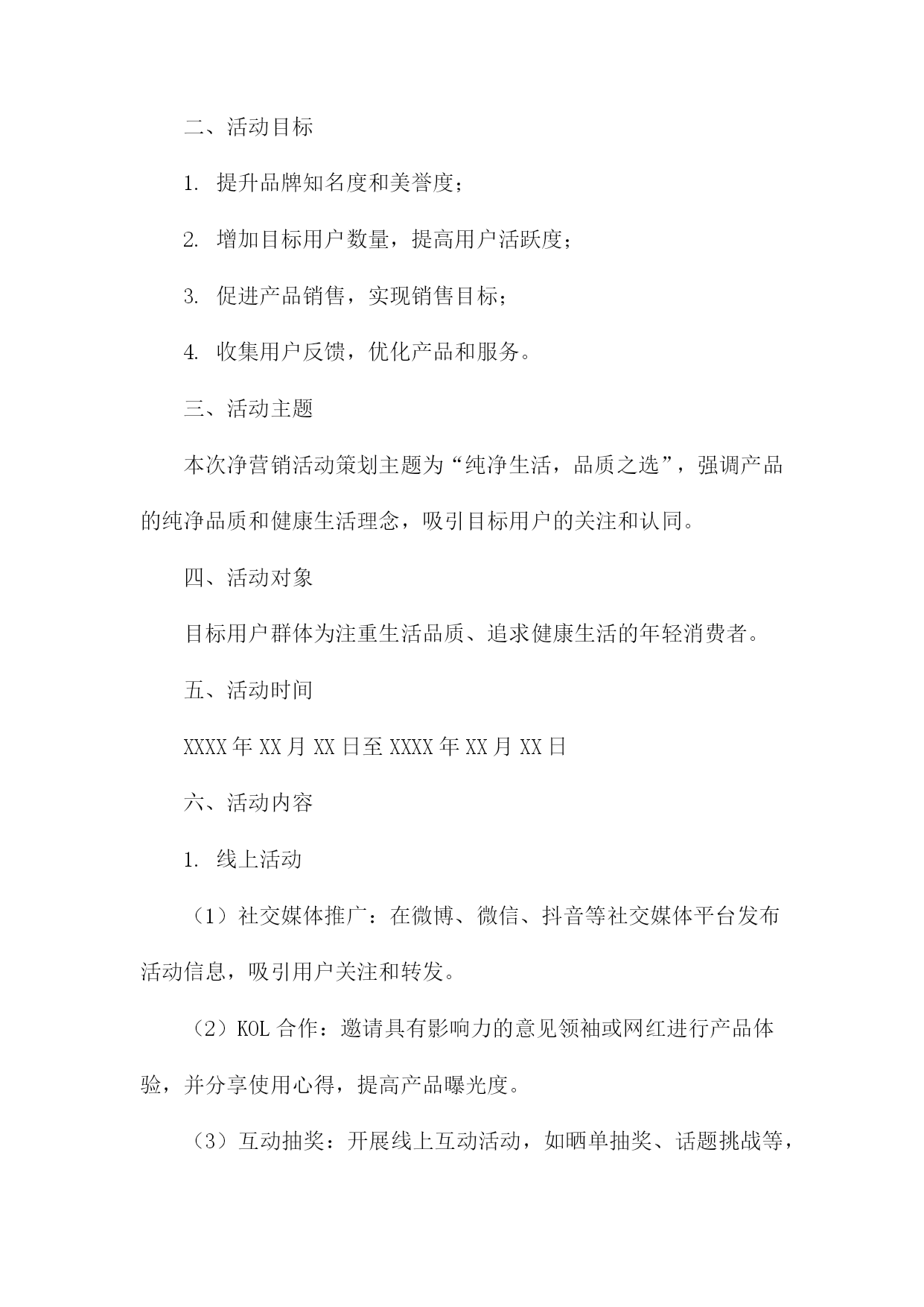 净营销活动策划方案一、活动背景随着市场竞争的加剧,品牌传播与营销手段日益多样化。为了提升品牌知名度,增强品牌影响力,同时拉近与消费者的距离,我们策划了一场以“净”为主题的营销活动。本次活动旨在通过创意、互动、体验等多维度,展现品牌的独特魅力,吸引更多潜在消费者。二、活动目标1.提升品牌知名度,树立品牌形象;2.增强品牌与消费者的互动,提升品牌忠诚度;3.吸引潜在消费者,扩大市场份额;4.传播品牌理念,提升品牌美誉度。三、活动主题“净”营销,体验纯净之美四、活动时间XXXX年XX月XX日至XXXX年XX月XX日五、活动内容1.线上活动(1)品牌官网及社交媒体平台发起“净生活,净心灵”话题挑战,邀请用户分享自己的纯净生活方式,评选优秀作品并赠送奖品;(2)合作网红、意见领袖进行直播互动,展示品牌产品,分享纯净生活理念;(3)在电商平台开展限时优惠活动,吸引消费者购买品牌产品。2.线下活动(1)举办“净生活体验馆”,邀请消费者现场体验品牌产品,感受纯净之美;(2)开展“净行动”公益活动,组织志愿者参与城市环保行动,传递品牌公益精神;(3)举办“净营销沙龙”,邀请行业专家、媒体等共同探讨纯净生活理念与营销策略。六、活动预算本次活动的预算主要包括以下几个方面:1.线上活动费用:包括社交媒体平台推广费用、网红直播费用、电商平台促销费用等;2.线下活动费用:包括体验馆搭建费用、公益活动组织费用、沙龙场地租赁费用等;3.宣传物料费用:包括活动海报、宣传册、礼品等制作费用;4.人员费用:包括活动策划、执行、客服等人员工资及福利费用。具体预算将根据实际情况进行制定,确保活动顺利进行。七、活动执行与监测1.活动执行:制定详细的活动执行计划,明确各项任务的责任人、执行时间节点和具体要求。同时,建立有效的沟通机制,确保各部门之间的协同配合,保证活动顺利进行。2.活动监测:设立活动监测小组,对活动进展进行实时监控,收集活动数据,分析活动效果。根据监测结果,及时调整活动策略,确保活动目标的顺利实现。八、活动总结与评估活动结束后,对本次活动进行全面总结与评估。分析活动成效,总结经验教训,为后续营销活动提供借鉴。同时,对活动过程中存在的问题进行梳理,提出改进措施,为品牌的长远发展奠定基础。九、活动风险与应对措施1.活动风险:可能面临的风险包括活动执行不力、宣传效果不佳、消费者参与度不高等问题;2.应对措施:制定详细的活动执行计划,确保活动顺利进行;加强宣传推广力度,提高品牌知名度;优化活动内容,提升消费者参与度。净营销活动策划方案(1)一、活动背景随着市场竞争的日益激烈,传统的营销手段已难以满足企业的快速发展需求。为了提升品牌知名度、扩大市场份额、增强客户黏性,我们提出以“净营销”为主题的活动策划方案,旨在通过线上线下相结合的方式,打造一场别具一格的营销活动。二、活动目标1.提升品牌知名度和美誉度;2.扩大市场份额,吸引潜在客户;3.增强客户黏性,提高客户满意度;4.促进销售业绩的稳步提升。三、活动主题净营销——纯净、透明、高效的营销体验四、活动时间XXXX年XX月XX日至XXXX年XX月XX日五、活动内容1.线上活动(1)社交媒体互动:通过微博、微信、抖音等社交媒体平台,发布活动信息、互动话题和趣味挑战,吸引用户参与和分享。(2)直播推广:邀请知名网红或意见领袖进行产品直播推广,展示产品特点和使用方法,吸引粉丝关注和购买。(3)线上优惠活动:设置限时折扣、满减优惠等促销政策,刺激用户下单购买。2.线下活动(1)体验店活动:在品牌体验店举办产品体验活动,邀请顾客亲身体验产品,了解产品优势。(2)户外宣传活动:在商场、步行街等人流密集区域设置宣传摊位,发放宣传资料,吸引路人关注。(3)合作伙伴联动:与相关行业品牌进行合作,共同举办联合营销活动,扩大活动影响力。六、活动预算根据活动规模和具体需求,制定详细的预算方案,包括活动场地租赁、宣传资料制作、人员费用等方面的预算。七、活动执行与监控1.设立活动执行小组,负责活动的具体执行和协调工作;2.制定详细的活动执行计划,明确各阶段的任务和时间节点;3.设立活动监控机制,对活动进展和效果进行实时跟踪和评估;4.根据活动执行情况,及时调整策略,确保活动目标的顺利实现。八、活动效果评估活动结束后,对活动效果进行全面评估,包括以下几个方面:1.品牌知名度和美誉度的提升程度;2.市场份额的扩大情况;3.客户黏性的增强程度及客户满意度调查结果;4.销售业绩的提升幅度。通过评估结果,总结活动的成功经验和不足之处,为今后的营销活动提供借鉴和参考。九、后续跟进与持续营销活动结束后,继续跟进潜在客