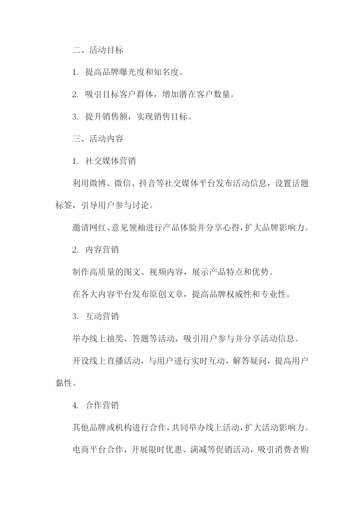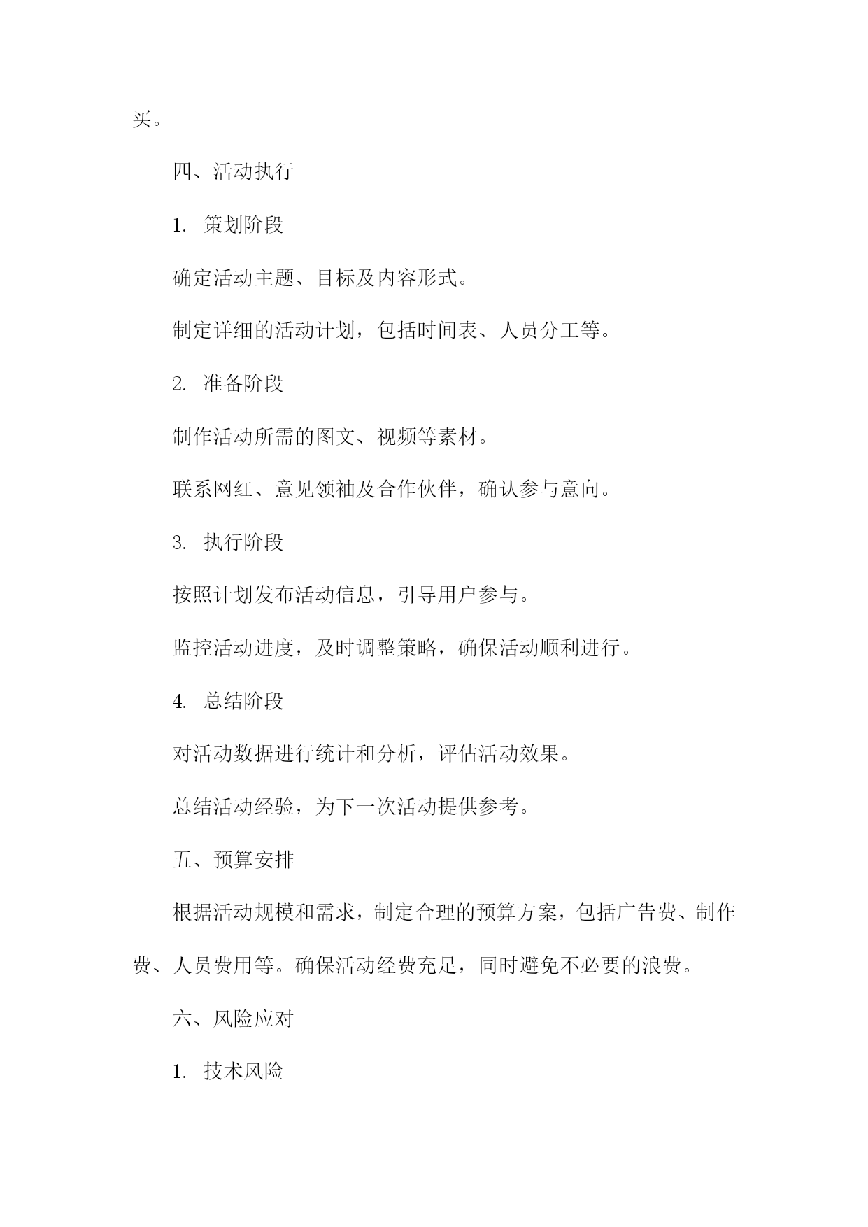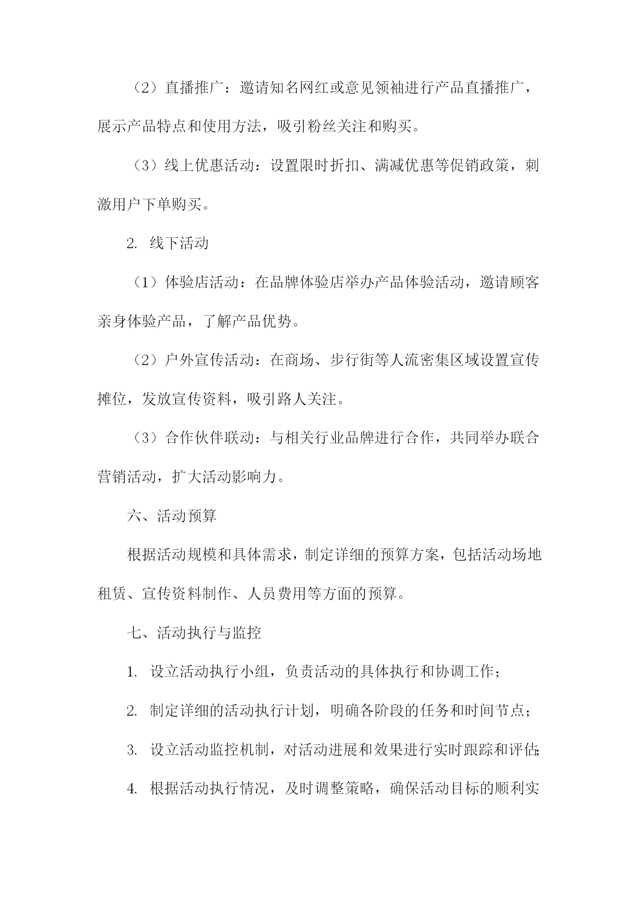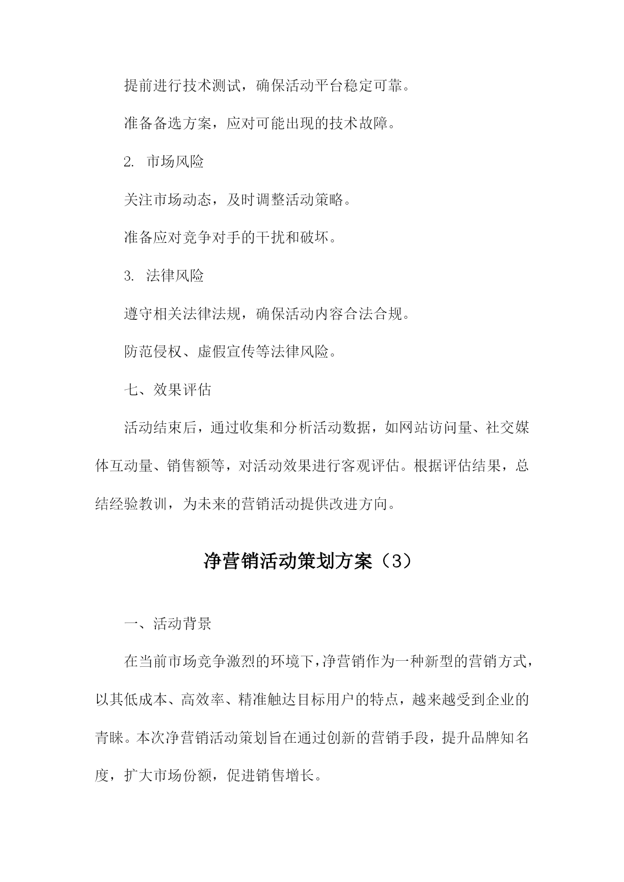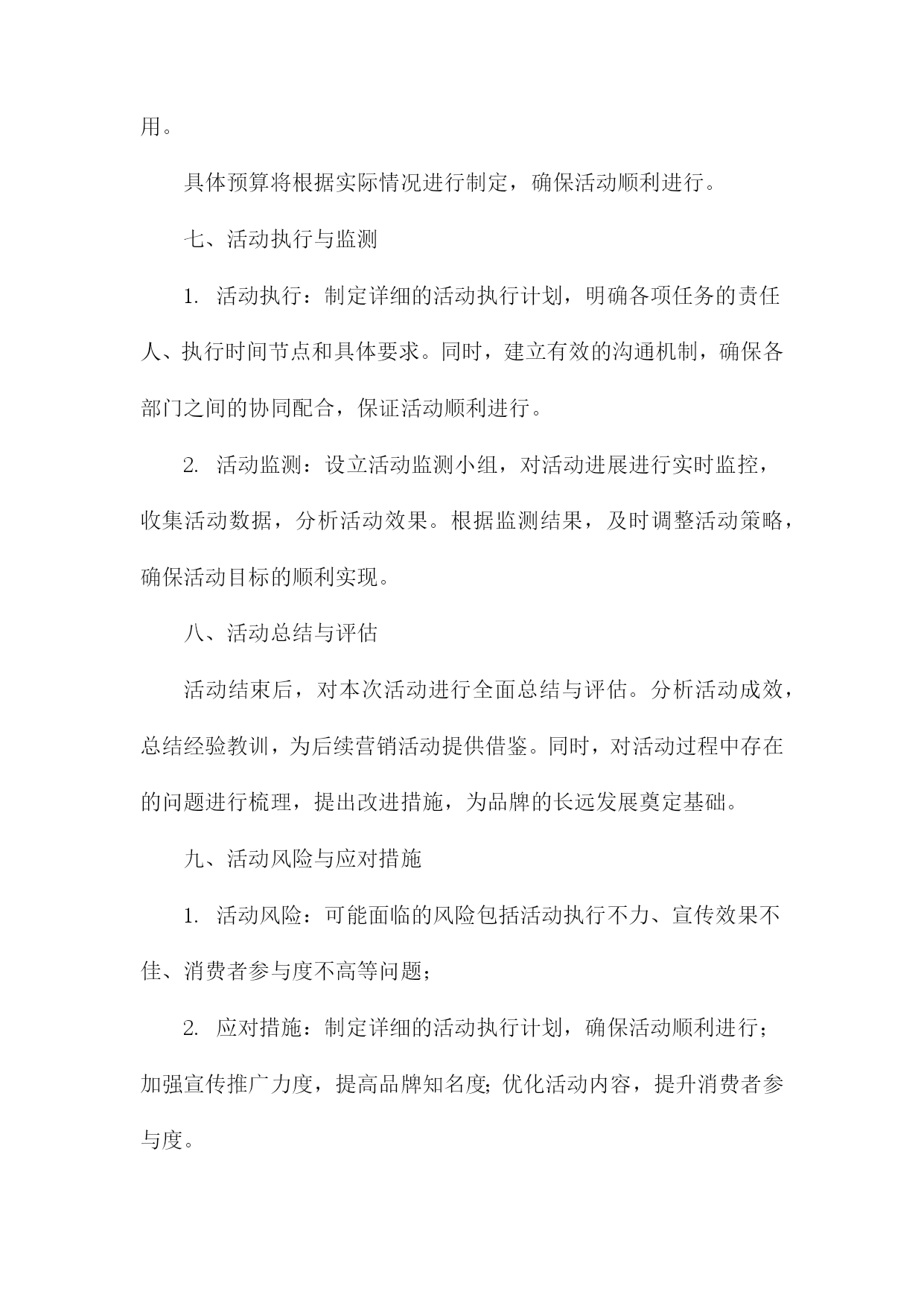 净营销活动策划方案一、活动背景随着市场竞争的加剧,品牌传播与营销手段日益多样化。为了提升品牌知名度,增强品牌影响力,同时拉近与消费者的距离,我们策划了一场以“净”为主题的营销活动。本次活动旨在通过创意、互动、体验等多维度,展现品牌的独特魅力,吸引更多潜在消费者。二、活动目标1.提升品牌知名度,树立品牌形象;2.增强品牌与消费者的互动,提升品牌忠诚度;3.吸引潜在消费者,扩大市场份额;4.传播品牌理念,提升品牌美誉度。三、活动主题“净”营销,体验纯净之美四、活动时间XXXX年XX月XX日至XXXX年XX月XX日五、活动内容1.线上活动(1)品牌官网及社交媒体平台发起“净生活,净心灵”话题挑战,邀请用户分享自己的纯净生活方式,评选优秀作品并赠送奖品;(2)合作网红、意见领袖进行直播互动,展示品牌产品,分享纯净生活理念;(3)在电商平台开展限时优惠活动,吸引消费者购买品牌产品。2.线下活动(1)举办“净生活体验馆”,邀请消费者现场体验品牌产品,感受纯净之美;(2)开展“净行动”公益活动,组织志愿者参与城市环保行动,传递品牌公益精神;(3)举办“净营销沙龙”,邀请行业专家、媒体等共同探讨纯净生活理念与营销策略。六、活动预算本次活动的预算主要包括以下几个方面:1.线上活动费用:包括社交媒体平台推广费用、网红直播费用、电商平台促销费用等;2.线下活动费用:包括体验馆搭建费用、公益活动组织费用、沙龙场地租赁费用等;3.宣传物料费用:包括活动海报、宣传册、礼品等制作费用;4.人员费用:包括活动策划、执行、客服等人员工资及福利费用。具体预算将根据实际情况进行制定,确保活动顺利进行。七、活动执行与监测1.活动执行:制定详细的活动执行计划,明确各项任务的责任人、执行时间节点和具体要求。同时,建立有效的沟通机制,确保各部门之间的协同配合,保证活动顺利进行。2.活动监测:设立活动监测小组,对活动进展进行实时监控,收集活动数据,分析活动效果。根据监测结果,及时调整活动策略,确保活动目标的顺利实现。八、活动总结与评估活动结束后,对本次活动进行全面总结与评估。分析活动成效,总结经验教训,为后续营销活动提供借鉴。同时,对活动过程中存在的问题进行梳理,提出改进措施,为品牌的长远发展奠定基础。九、活动风险与应对措施1.活动风险:可能面临的风险包括活动执行不力、宣传效果不佳、消费者参与度不高等问题;2.应对措施:制定详细的活动执行计划,确保活动顺利进行;加强宣传推广力度,提高品牌知名度;优化活动内容,提升消费者参与度。净营销活动策划方案(1)一、活动背景随着市场竞争的日益激烈,传统的营销手段已难以满足企业的快速发展需求。为了提升品牌知名度、扩大市场份额、增强客户黏性,我们提出以“净营销”为主题的活动策划方案,旨在通过线上线下相结合的方式,打造一场别具一格的营销活动。二、活动目标1.提升品牌知名度和美誉度;2.扩大市场份额,吸引潜在客户;3.增强客户黏性,提高客户满意度;4.促进销售业绩的稳步提升。三、活动主题净营销——纯净、透明、高效的营销体验四、活动时间XXXX年XX月XX日至XXXX年XX月XX日五、活动内容1.线上活动(1)社交媒体互动:通过微博、微信、抖音等社交媒体平台,发布活动信息、互动话题和趣味挑战,吸引用户参与和分享。(2)直播推广:邀请知名网红或意见领袖进行产品直播推广,展示产品特点和使用方法,吸引粉丝关注和购买。(3)线上优惠活动:设置限时折扣、满减优惠等促销政策,刺激用户下单购买。2.线下活动(1)体验店活动:在品牌体验店举办产品体验活动,邀请顾客亲身体验产品,了解产品优势。(2)户外宣传活动:在商场、步行街等人流密集区域设置宣传摊位,发放宣传资料,吸引路人关注。(3)合作伙伴联动:与相关行业品牌进行合作,共同举办联合营销活动,扩大活动影响力。六、活动预算根据活动规模和具体需求,制定详细的预算方案,包括活动场地租赁、宣传资料制作、人员费用等方面的预算。七、活动执行与监控1.设立活动执行小组,负责活动的具体执行和协调工作;2.制定详细的活动执行计划,明确各阶段的任务和时间节点;3.设立活动监控机制,对活动进展和效果进行实时跟踪和评估;4.根据活动执行情况,及时调整策略,确保活动目标的顺利实现。八、活动效果评估活动结束后,对活动效果进行全面评估,包括以下几个方面:1.品牌知名度和美誉度的提升程度;2.市场份额的扩大情况;3.客户黏性的增强程度及客户满意度调查结果;4.销售业绩的提升幅度。通过评估结果,总结活动的成功经验和不足之处,为今后的营销活动提供借鉴和参考。九、后续跟进与持续营销活动结束后,继续跟进潜在客