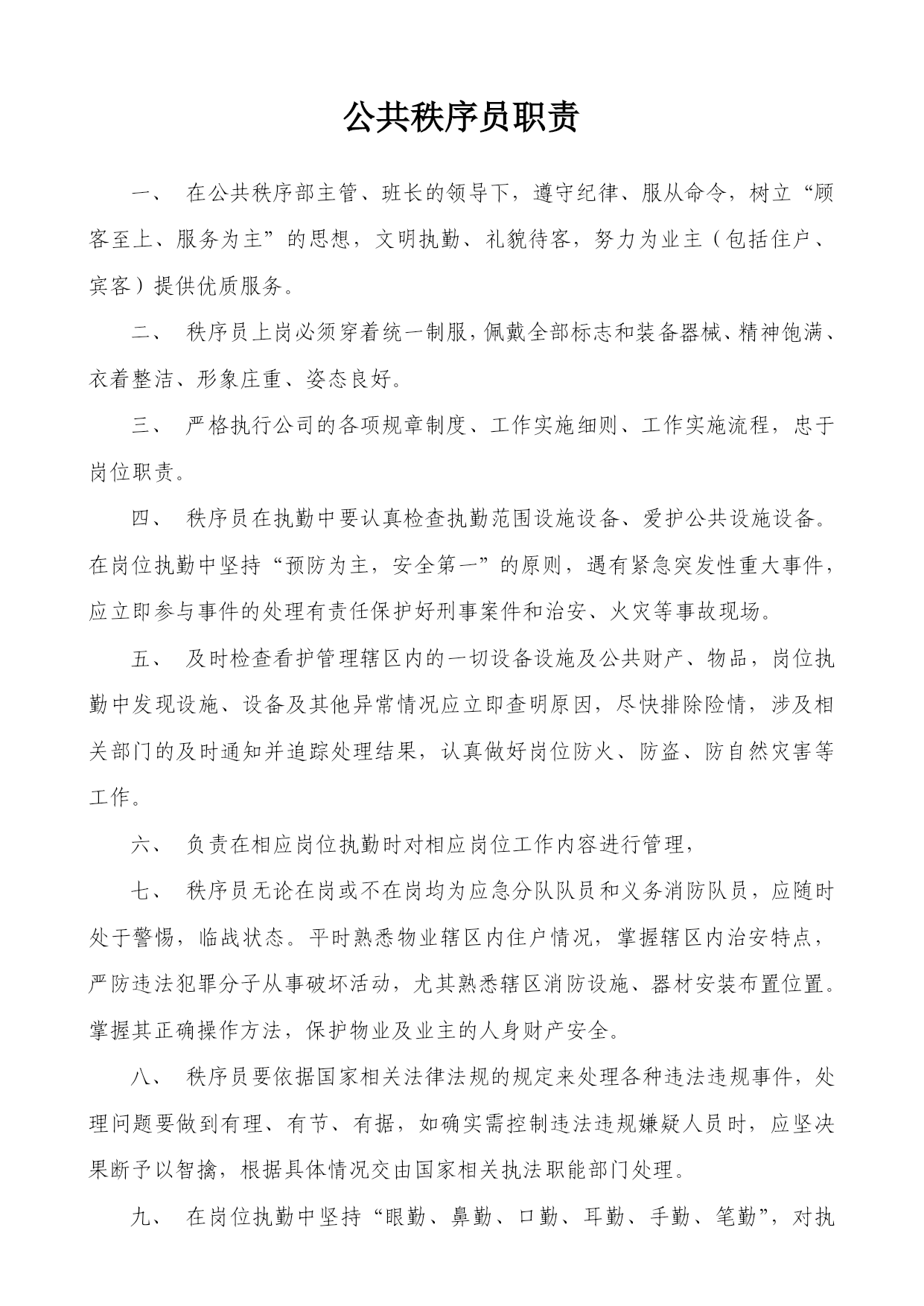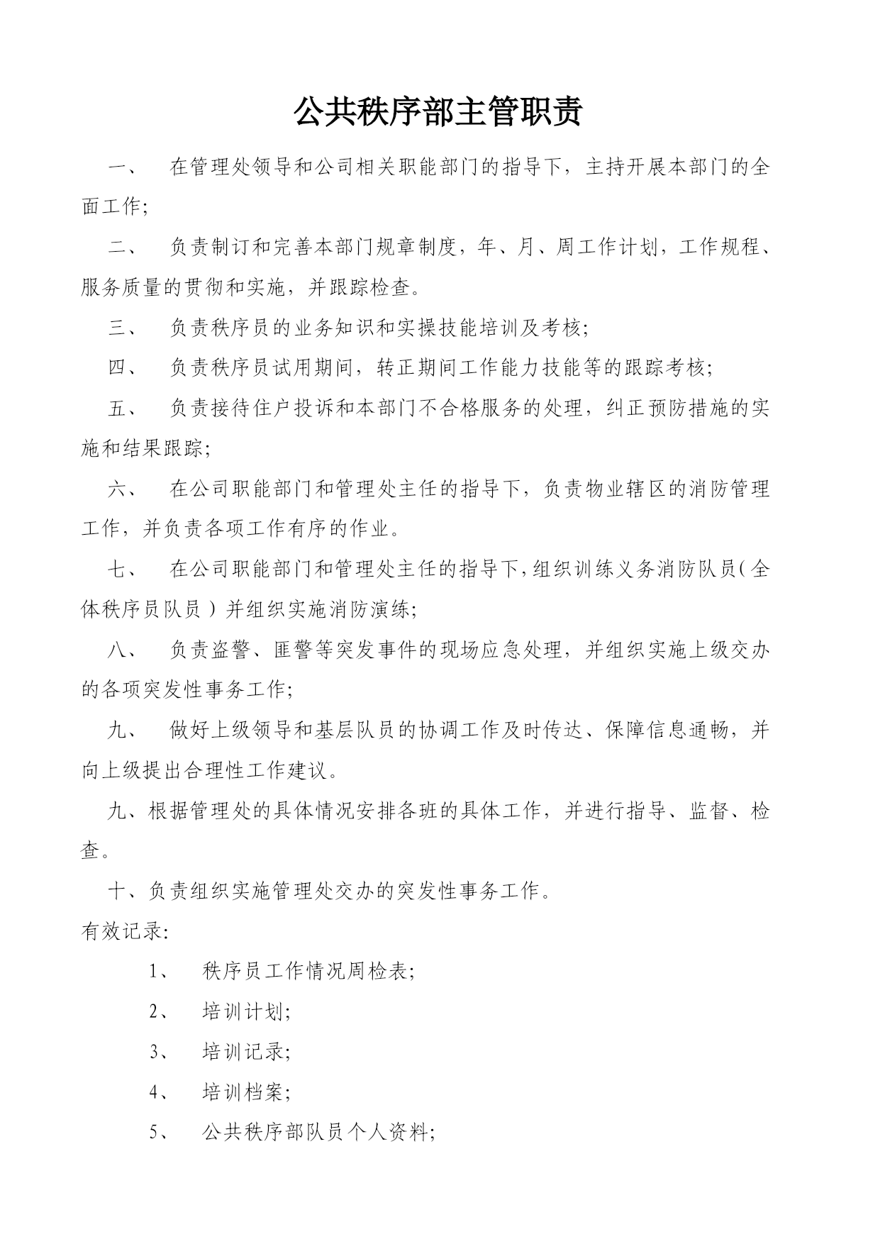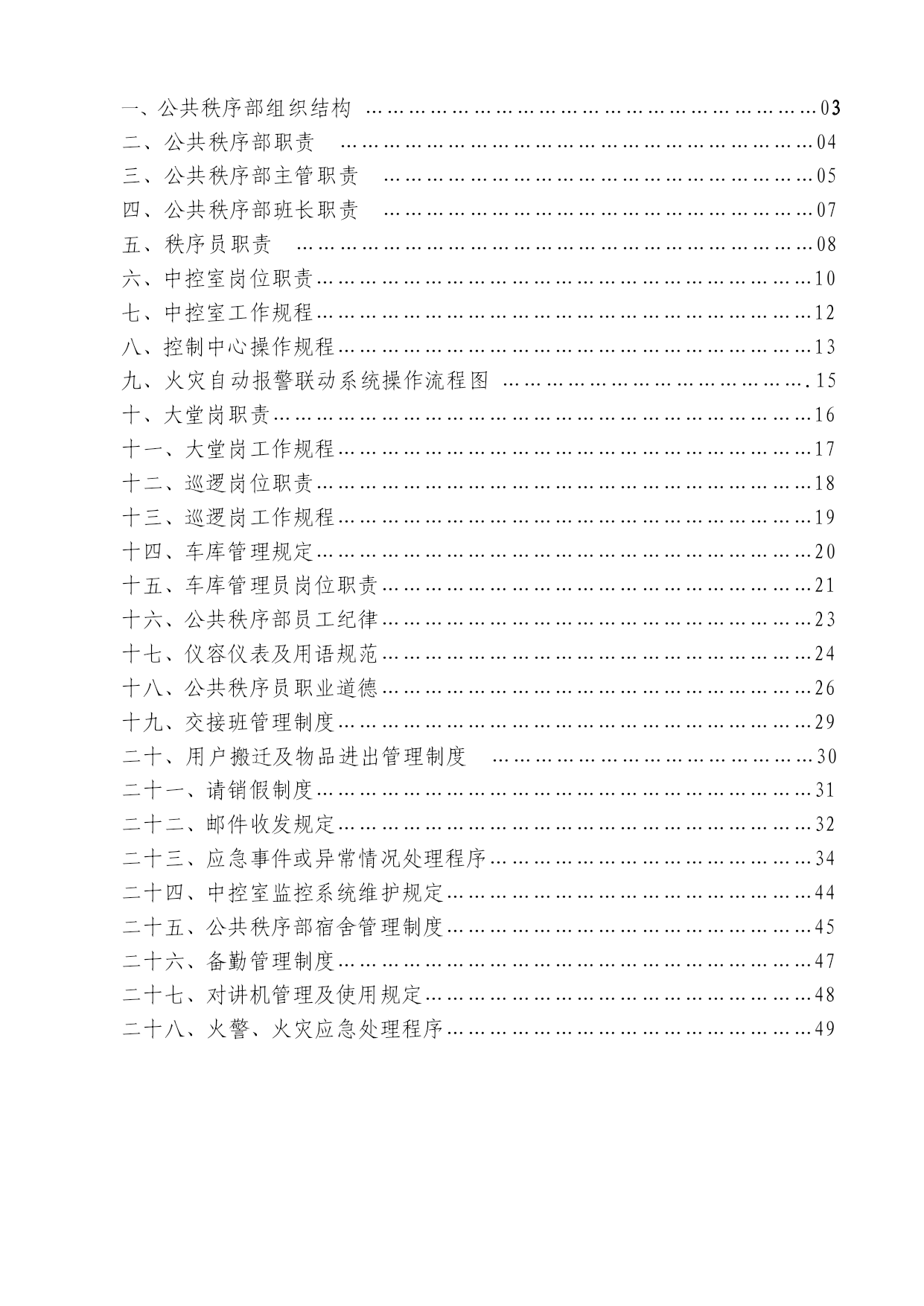 重庆xx物业管理有限公司xx公共秩序部工作手册编号:WY/JT-1-xxx审核:赵学高批准:戚莉日期:xxx年8月20日受控状态:文件发放号:02目录一、公共秩序部组织结构………………………………………………………03二、公共秩序部职责…………………………………………………………04三、公共秩序部主管职责……………………………………………………05四、公共秩序部班长职责……………………………………………………07五、秩序员职责………………………………………………………………08六、中控室岗位职责……………………………………………………………10七、中控室工作规程……………………………………………………………12八、控制中心操作规程…………………………………………………………13九、火灾自动报警联动系统操作流程图…………………………………….15十、大堂岗职责…………………………………………………………………16十一、大堂岗工作规程…………………………………………………………17十二、巡逻岗位职责……………………………………………………………18十三、巡逻岗工作规程…………………………………………………………19十四、车库管理规定……………………………………………………………20十五、车库管理员岗位职责……………………………………………………21十六、公共秩序部员工纪律……………………………………………………23十七、仪容仪表及用语规范……………………………………………………24十八、公共秩序员职业道德……………………………………………………26十九、交接班管理制度…………………………………………………………29二十、用户搬迁及物品进出管理制度………………………………………30二十一、请销假制度……………………………………………………………31二十二、邮件收发规定…………………………………………………………32二十三、应急事件或异常情况处理程序………………………………………34二十四、中控室监控系统维护规定……………………………………………44二十五、公共秩序部宿舍管理制度……………………………………………45二十六、备勤管理制度…………………………………………………………47二十七、对讲机管理及使用规定………………………………………………48二十八、火警、火灾应急处理程序……………………………………………49公共秩序部组织结构主管班长监控秩序员大堂秩序员车库秩序员巡逻秩序员外围秩序员车库引车员公共秩序部职责负责辖区治安保卫巡逻工作。负责辖区消防工作,进行日常巡检及火灾时的灭火工作。负责盗警、匪警、水警、火警、水浸、骤风、暴雨等突发事件的应急处理。确保无重大治安案件及火灾发生。负责对闲杂人员、可疑人员的调查清理工作及闲杂人员、可疑人员的盘查清理工作。依法办事,文明执勤、礼貌待人。坚持对进出人员热情引导,对物业使用人提供可行的服务。熟悉大厦内电梯、防火卷帘闸门、消防器具、报警系统的操作规程。八、负责物业辖区的道路、车辆管理,确保人流、车流的有序。九、积极配合国家执法部门的相关工作。公共秩序部主管职责在管理处领导和公司相关职能部门的指导下,主持开展本部门的全面工作;负责制订和完善本部门规章制度,年、月、周工作计划,工作规程、服务质量的贯彻和实施,并跟踪检查。负责秩序员的业务知识和实操技能培训及考核;负责秩序员试用期间,转正期间工作能力技能等的跟踪考核;负责接待住户投诉和本部门不合格服务的处理,纠正预防措施的实施和结果跟踪;在公司职能部门和管理处主任的指导下,负责物业辖区的消防管理工作,并负责各项工作有序的作业。在公司职能部门和管理处主任的指导下,组织训练义务消防队员(全体秩序员队员)并组织实施消防演练;负责盗警、匪警等突发事件的现场应急处理,并组织实施上级交办的各项突发性事务工作;做好上级领导和基层队员的协调工作及时传达、保障信息通畅,并向上级提出合理性工作建议。九、根据管理处的具体情况安排各班的具体工作,并进行指导、监督、检查。十、负责组织实施管理处交办的突发性事务工作。有效记录:秩序员工作情况周检表;培训计划;培训记录;培训档案;公共秩序部队员个人资料;停车一览表;周消防检查表;月消防检查表;季消防检查表;灭火器材配置记录表;消防安全检查整改通知书;消防演练记录表;消防演练方案;公共秩序部班长职责在公共秩序部主管的领导下,主持开展本班的全面工作,对主管负责;负责本班