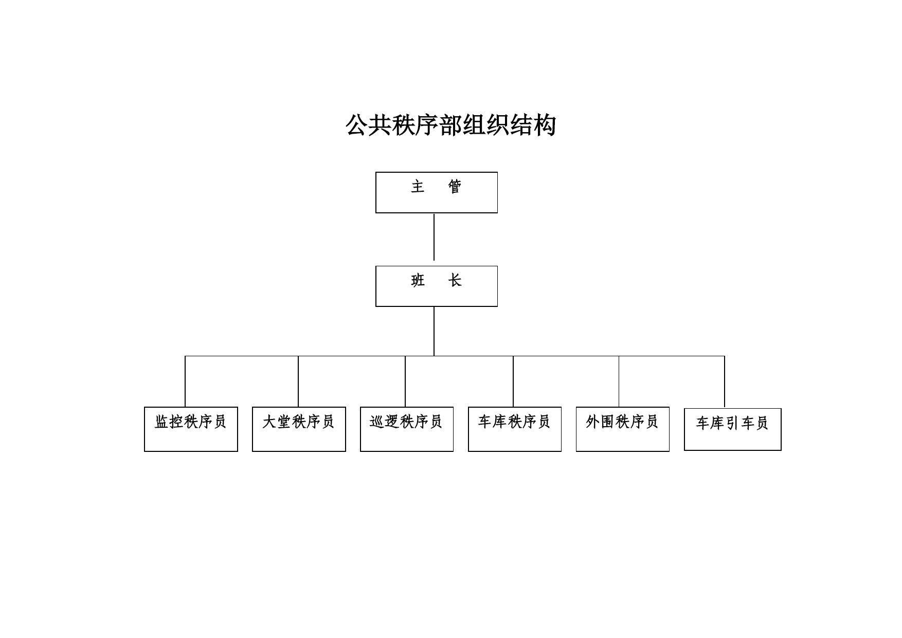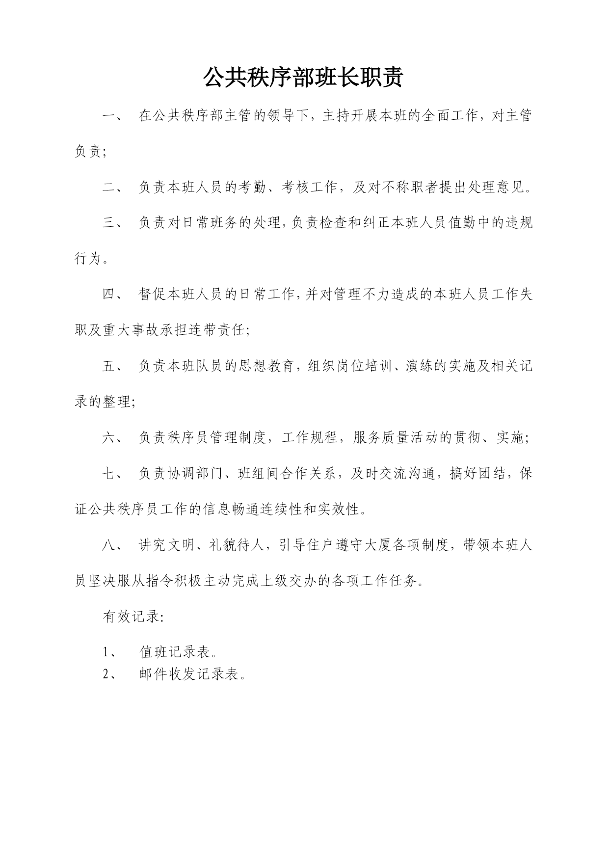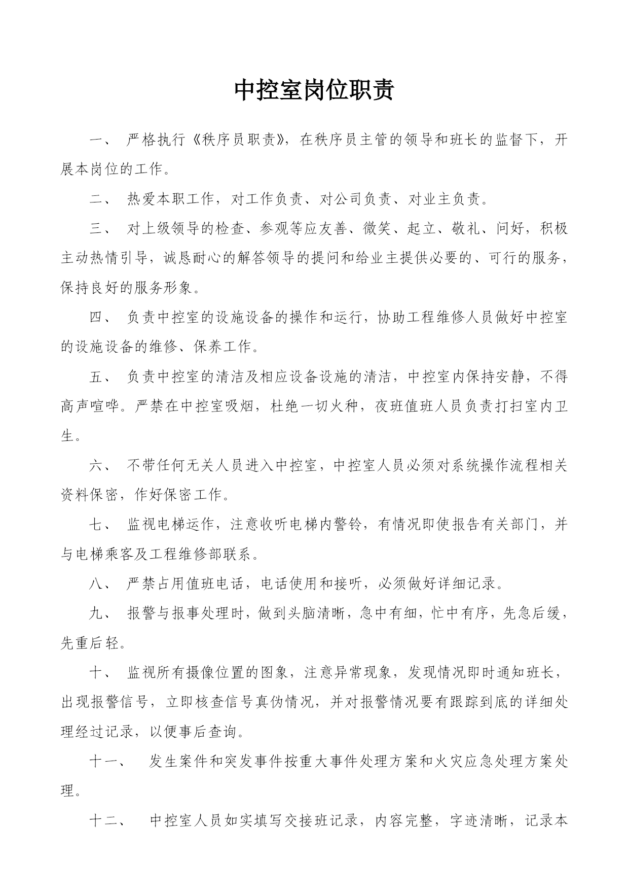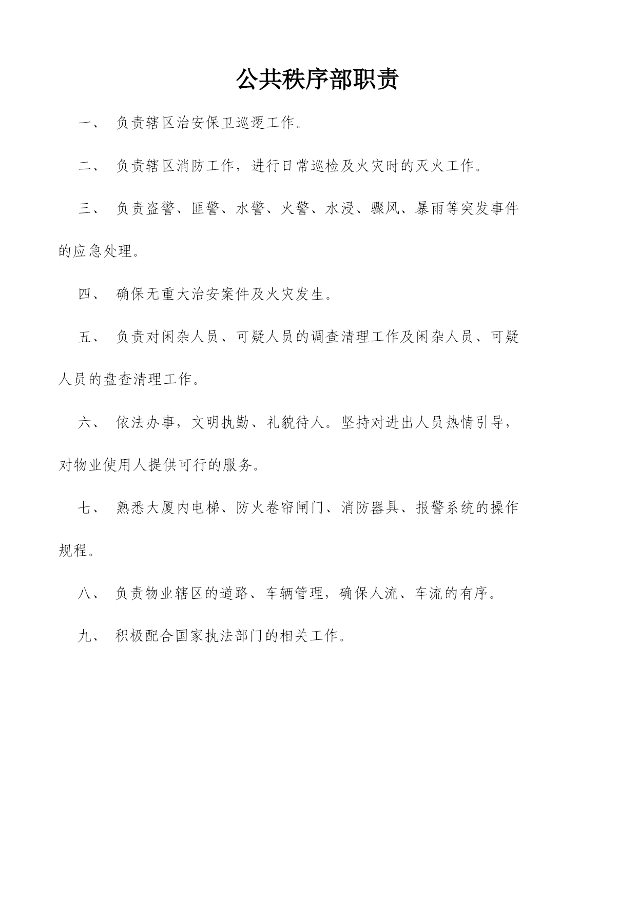 重庆xx物业管理有限公司xx公共秩序部工作手册编号:WY/JT-1-xxx审核:赵学高批准:戚莉日期:xxx年8月20日受控状态:文件发放号:02目录一、公共秩序部组织结构………………………………………………………03二、公共秩序部职责…………………………………………………………04三、公共秩序部主管职责……………………………………………………05四、公共秩序部班长职责……………………………………………………07五、秩序员职责………………………………………………………………08六、中控室岗位职责……………………………………………………………10七、中控室工作规程……………………………………………………………12八、控制中心操作规程…………………………………………………………13九、火灾自动报警联动系统操作流程图…………………………………….15十、大堂岗职责…………………………………………………………………16十一、大堂岗工作规程…………………………………………………………17十二、巡逻岗位职责……………………………………………………………18十三、巡逻岗工作规程…………………………………………………………19十四、车库管理规定……………………………………………………………20十五、车库管理员岗位职责……………………………………………………21十六、公共秩序部员工纪律……………………………………………………23十七、仪容仪表及用语规范……………………………………………………24十八、公共秩序员职业道德……………………………………………………26十九、交接班管理制度…………………………………………………………29二十、用户搬迁及物品进出管理制度………………………………………30二十一、请销假制度……………………………………………………………31二十二、邮件收发规定…………………………………………………………32二十三、应急事件或异常情况处理程序………………………………………34二十四、中控室监控系统维护规定……………………………………………44二十五、公共秩序部宿舍管理制度……………………………………………45二十六、备勤管理制度…………………………………………………………47二十七、对讲机管理及使用规定………………………………………………48二十八、火警、火灾应急处理程序……………………………………………49公共秩序部组织结构主管班长监控秩序员大堂秩序员车库秩序员巡逻秩序员外围秩序员车库引车员公共秩序部职责负责辖区治安保卫巡逻工作。负责辖区消防工作,进行日常巡检及火灾时的灭火工作。负责盗警、匪警、水警、火警、水浸、骤风、暴雨等突发事件的应急处理。确保无重大治安案件及火灾发生。负责对闲杂人员、可疑人员的调查清理工作及闲杂人员、可疑人员的盘查清理工作。依法办事,文明执勤、礼貌待人。坚持对进出人员热情引导,对物业使用人提供可行的服务。熟悉大厦内电梯、防火卷帘闸门、消防器具、报警系统的操作规程。八、负责物业辖区的道路、车辆管理,确保人流、车流的有序。九、积极配合国家执法部门的相关工作。公共秩序部主管职责在管理处领导和公司相关职能部门的指导下,主持开展本部门的全面工作;负责制订和完善本部门规章制度,年、月、周工作计划,工作规程、服务质量的贯彻和实施,并跟踪检查。负责秩序员的业务知识和实操技能培训及考核;负责秩序员试用期间,转正期间工作能力技能等的跟踪考核;负责接待住户投诉和本部门不合格服务的处理,纠正预防措施的实施和结果跟踪;在公司职能部门和管理处主任的指导下,负责物业辖区的消防管理工作,并负责各项工作有序的作业。在公司职能部门和管理处主任的指导下,组织训练义务消防队员(全体秩序员队员)并组织实施消防演练;负责盗警、匪警等突发事件的现场应急处理,并组织实施上级交办的各项突发性事务工作;做好上级领导和基层队员的协调工作及时传达、保障信息通畅,并向上级提出合理性工作建议。九、根据管理处的具体情况安排各班的具体工作,并进行指导、监督、检查。十、负责组织实施管理处交办的突发性事务工作。有效记录:秩序员工作情况周检表;培训计划;培训记录;培训档案;公共秩序部队员个人资料;停车一览表;周消防检查表;月消防检查表;季消防检查表;灭火器材配置记录表;消防安全检查整改通知书;消防演练记录表;消防演练方案;公共秩序部班长职责在公共秩序部主管的领导下,主持开展本班的全面工作,对主管负责;负责本班
