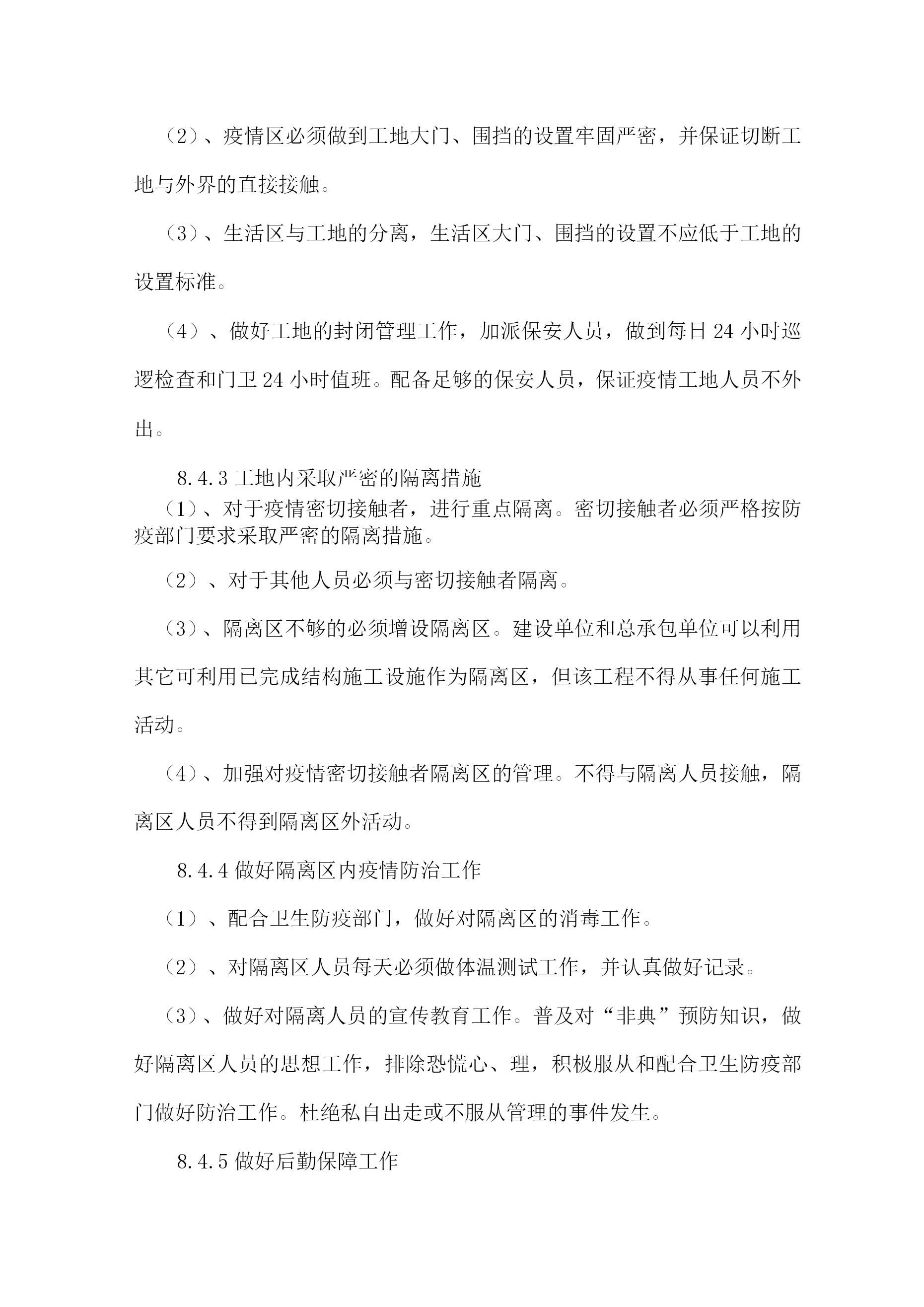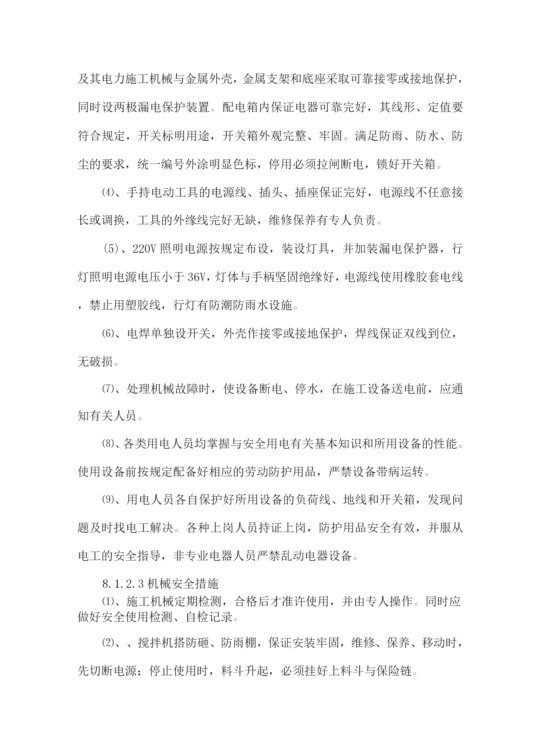 安全、文明施工及环保措施本工程地处怀柔县,搞好施工现场安全管理、文明施工和环境保护成为我们工作的重点。同时作好这些工作是社会的基本要求,是企业素质的体现,它有利于创造良好的内部施工环境,并对企业形象的树立起到不可忽视的作用。因此,必须严格按照有关法规、条例精心组织现场施工。8.1安全生产保证措施8.1.1安全生产目标本工程安全目标:无工程事故和重大设备、人身伤害事故。杜绝因工死亡事故,年重伤率控制在0.03%,年负伤率控制在0.3%以内,确保安全生产指标达国标。8.1.2安全生产保证措施8.1.2.1安全技术措施⑴、安全人员均持证上岗,认真负责。⑵、施工操作人员佩带安全防护工具,现场操作人员戴安全帽。吊装作业起重臂下严禁站人,并有专人指挥。⑶、技术交底单中必须有安全交底内容,保证施工人员安全操作。8.1.2.2临时用电措施(1)、工程施工中建立定期检查线路、设施制度,并把检查结果存档备查。保证用电安全。⑵、临时配电线路按规范架设,架空线路采用绝缘导线,禁止使用塑胶软线,成束架空及沿地敷设。⑶、配电系统采用分级配电、三相五线制的接零保护。各种电器设备及其电力施工机械与金属外壳,金属支架和底座采取可靠接零或接地保护,同时设两极漏电保护装置。配电箱内保证电器可靠完好,其线形、定值要符合规定,开关标明用途,开关箱外观完整、牢固。满足防雨、防水、防尘的要求,统一编号外涂明显色标,停用必须拉闸断电,锁好开关箱。⑷、手持电动工具的电源线、插头、插座保证完好,电源线不任意接长或调换,工具的外缘线完好无缺,维修保养有专人负责。(5)、220V照明电源按规定布设,装设灯具,并加装漏电保护器,行灯照明电源电压小于36V,灯体与手柄坚固绝缘好,电源线使用橡胶套电线,禁止用塑胶线,行灯有防潮防雨水设施。⑹、电焊单独设开关,外壳作接零或接地保护,焊线保证双线到位,无破损。⑺、处理机械故障时,使设备断电、停水,在施工设备送电前,应通知有关人员。⑻、各类用电人员均掌握与安全用电有关基本知识和所用设备的性能。使用设备前按规定配备好相应的劳动防护用品,严禁设备带病运转。⑼、用电人员各自保护好所用设备的负荷线、地线和开关箱,发现问题及时找电工解决。各种上岗人员持证上岗,防护用品安全有效,并服从电工的安全指导,非专业电器人员严禁乱动电器设备。8.1.2.3机械安全措施⑴、施工机械定期检测,合格后才准许使用,并由专人操作。同时应做好安全使用检测、自检记录。⑵、、搅拌机搭防砸、防雨棚,保证安装牢固,维修、保养、移动时,先切断电源;停止使用时,料斗升起,必须挂好上料斗与保险链。⑶、蛙式打夯机由两人操作,操作时穿戴绝缘手套和绝缘鞋,操作手套采用绝缘措施。夯机用后切断电源,严禁在夯机运转时清理积土。⑷、乙炔灭火器采用金属防爆膜,禁止使用胶皮薄膜代替。氧气瓶与乙炔瓶间距大于5m,两瓶同焊时,间距大于10m,严禁用浮筒式乙炔灭火器。⑸、机动翻斗车时速不超过5公里,行车中不准带人,卸料时保持安全距离并设挡墩。(6)、工程设备施工前进行性能检测,合格后才准许使用,专人操作。⑺、加强对司机的教育。8.1.2.4消防保卫措施⑴、实行消防保卫负责制,建立消防保卫领导小组,派专人负责。现场建立巡逻护场制度,护场守卫佩带值勤标志,非工作人员禁止进入现场,职工佩带出入证。⑵、以现场施工便道为消防通道,保证消防通道的畅通。⑶、现场布设防火宣传标志,配备足够的消防设备。库房及居住房屋按防火要求搭建,保证良好的通风。⑷、现场严禁使用电热器具,禁止吸烟,从事设备安装及焊接作业时,人员持证上岗,须有安全交底记录。。⑸、施工材料的存放、保管符合防火要求;施工中防火器材防止丢失,如果丢失要及时配备不可耽误。严格防火措施,施工作业用火时必须持有用火证。⑹、使用电器设备符合技术规范及操作规程,严格防火措施,施工作业用火时必须持有用火证⑺、现场建立门卫和巡逻护场制度,护场守卫佩带值勤标志,非工作人员禁止进入现场,职工佩带出入证。⑻、禁止赌博、酗酒、传播淫秽物品和打架斗殴,发生案件和灾害事故,配合公安机关查破。8.1.2.5现场管理⑴、施工工地建立大门,对现场进行围挡。⑵、施工现场的机械、消防、安全等都要指定专人负责,并定期检查作好记录。8.2降低环境污染和噪音、文明施工、减少扰民的措施8.2.1成立项目经理为组长的施工现场管理及文明施工领导小组,分工明确,责任到人,对施工现场进行全面的规范化管理。8.2.2施工现场设一图四板(即:施工平面图、安全生产制度板、文明施工制度板、消防保卫制度板、环境保护制度板)及施工标志牌,内容符合实际,项目齐全。严格按照施工平面图布设临建设施,办公区和生活区相对集中统一管理。8.2.3严格按照文明工地