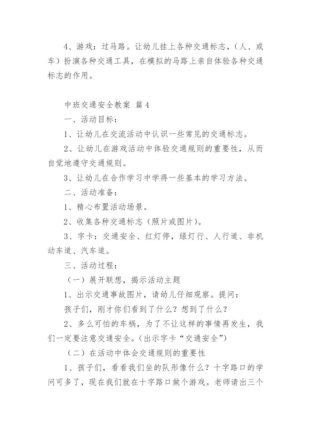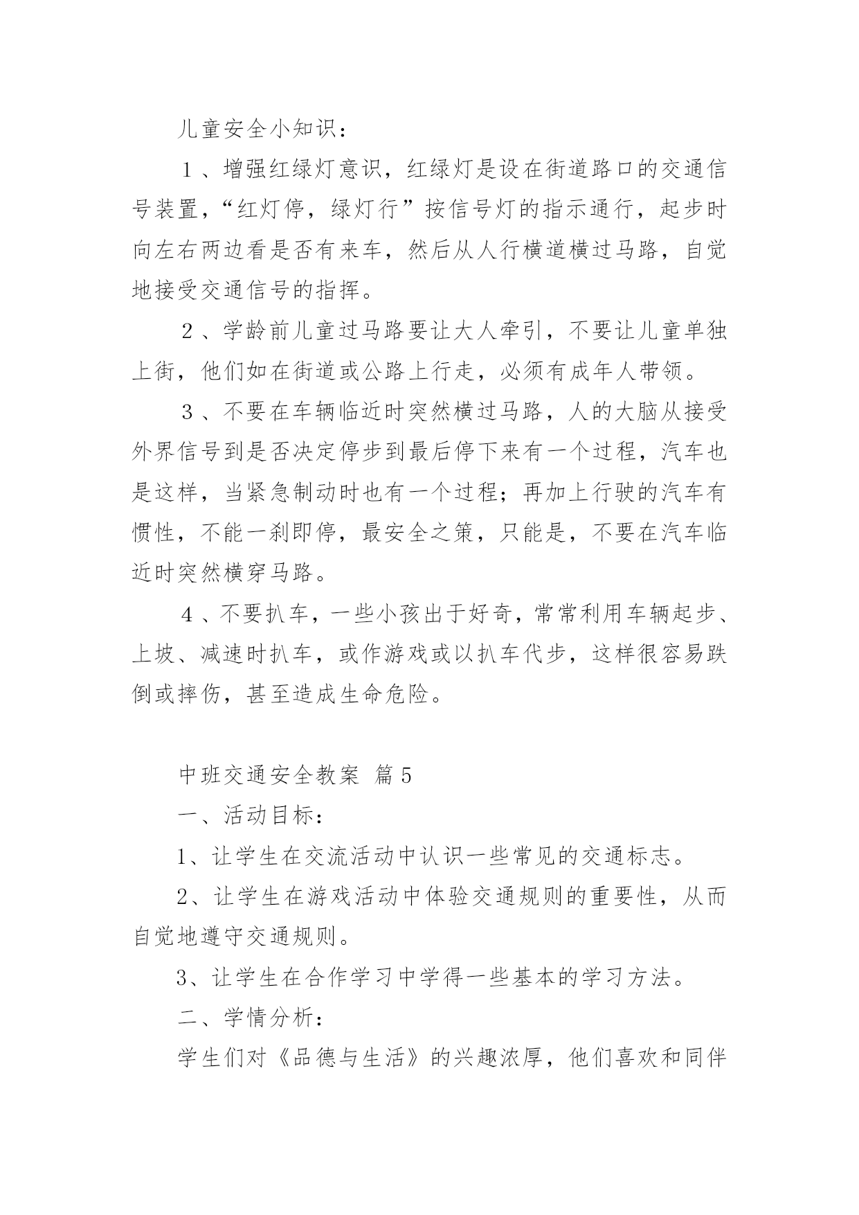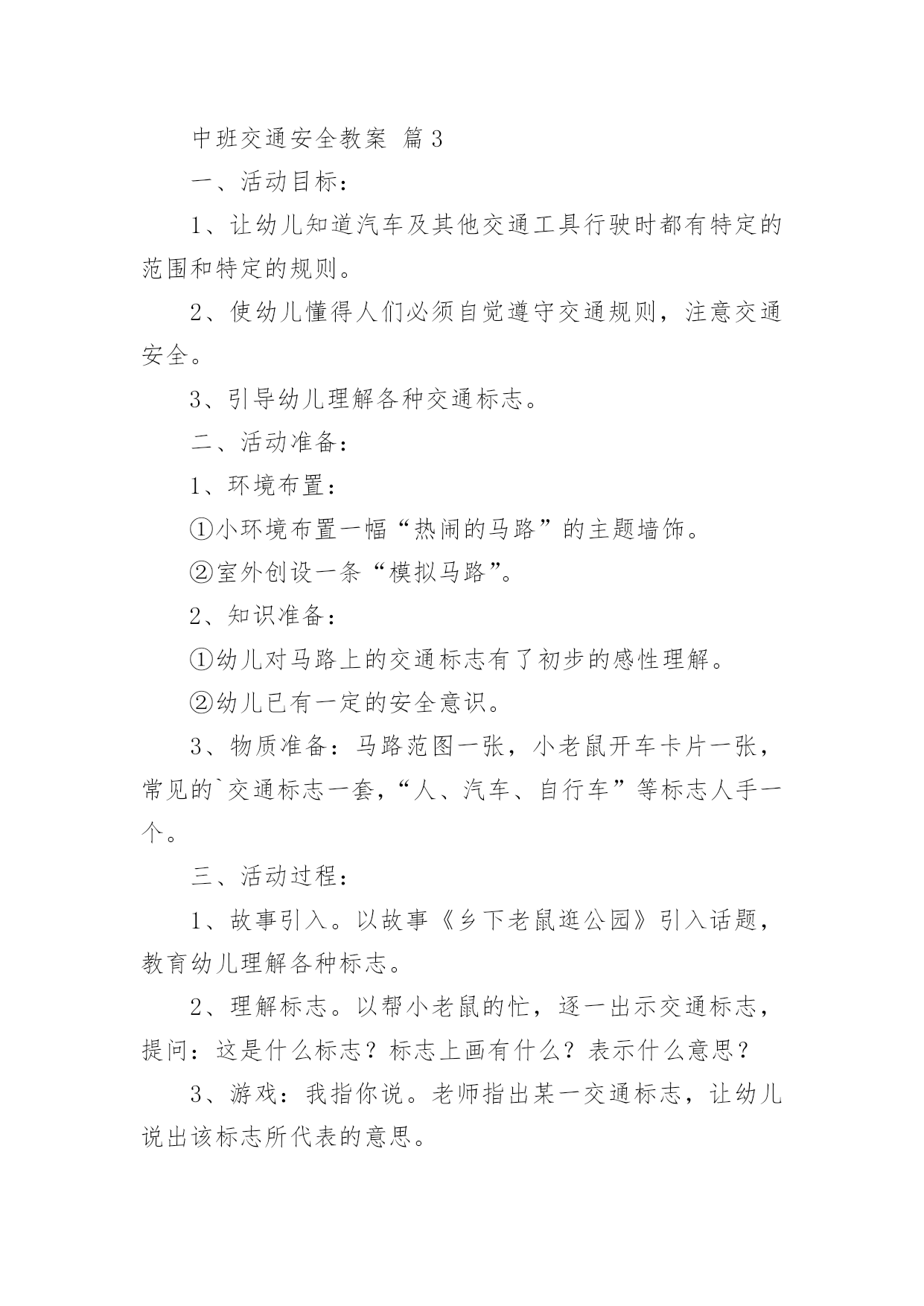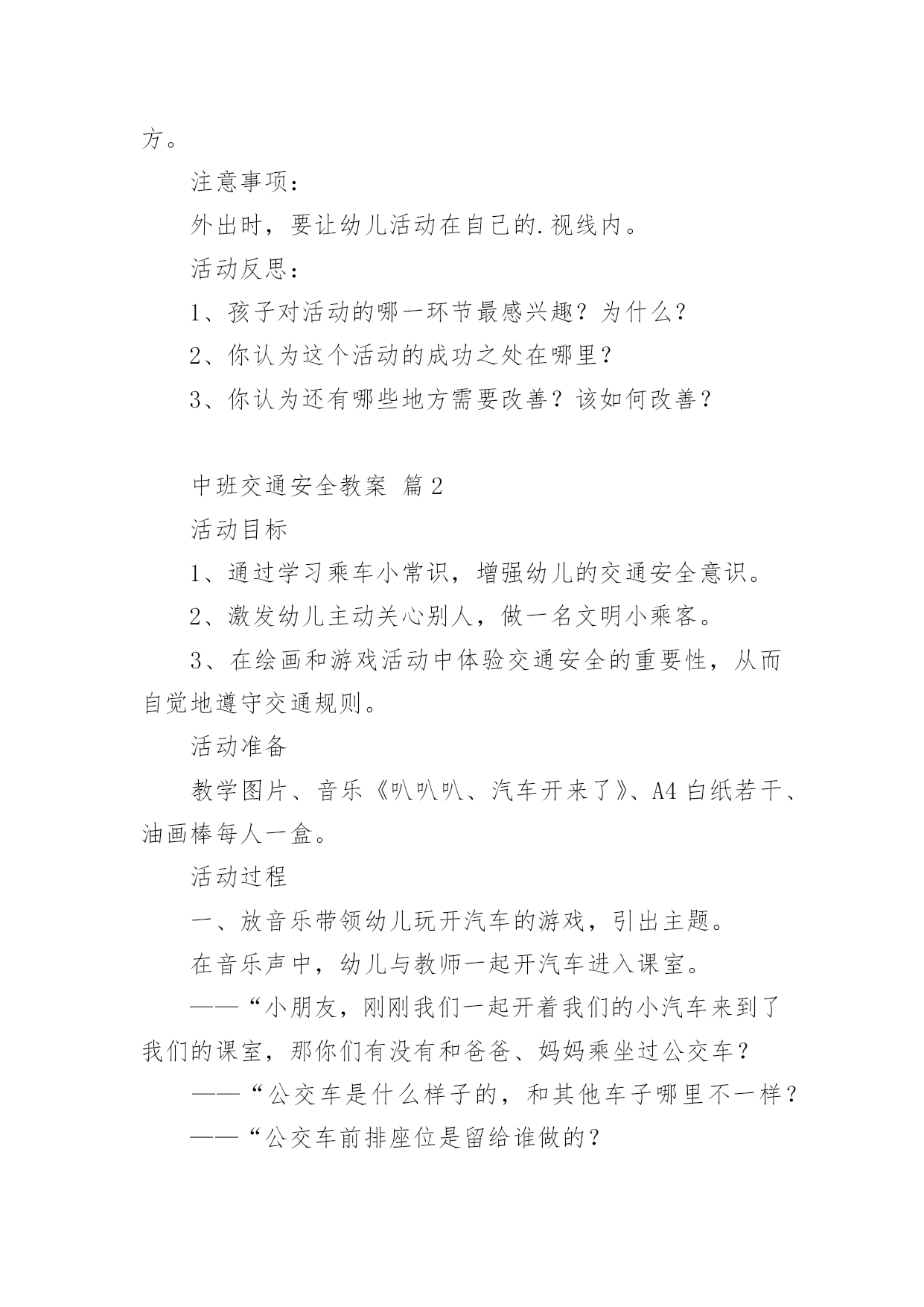 中班交通安全教案中班交通安全教案(通用13篇)作为一名专为他人授业解惑的人民教师,通常需要用到教案来辅助教学,教案是教学蓝图,可以有效提高教学效率。那么应当如何写教案呢?以下是小编为大家收集的中班交通安全教案(通用13篇),仅供参考,希望能够帮助到大家。中班交通安全教案篇1教学形式:团体或小组教学教学方法:情景表演法行为辨析法故事启迪法。活动目标:1、让幼儿明白一些和父母一同出游时的安全常识。2、培养幼儿的安全意识及自我保护潜力。核心要素:游玩时应注意跟爸妈不远离陌生地,不乱去为安全要牢记。活动准备:兔子头饰,提前组织幼儿排练情景剧。基本过程:(一)导入活动:1、这天,我请来了兔妈妈和她的孩子(小灰、小白),她们要给小朋友们表演节目,请大家必须要仔细看喔。2、邀请一位老师和小朋友一齐表演。(二)关键步骤:1、情境表演:兔妈妈带两只小兔去森林里采蘑菇。妈妈告诉孩子们必须要在自己身边,不要独自到危险的地方去。小灰兔在妈妈的身边采蘑菇,小白兔悄悄地离开了。它只顾自己去捉蝴蝶了,最后迷了路。兔妈妈找了很久才找到它,小白兔哭着对妈妈说:“妈妈,我错了。以后,我再也不离开妈妈了。”2、讨论:(1)两只小兔谁做得对?(2)我们和父母出游时应注意什么?就应怎样做?活动延伸:1、可透过游戏对幼儿进行安全意识的礼仪教育。例如:游戏《老猫睡觉醒不了》幼儿在猫妈妈身边说儿歌:“老猫睡觉醒不了,小猫偷偷往外瞧,因为小猫爱游戏,悄悄走到外面去”小猫说完,轻轻离开妈妈,猫妈妈叫小猫,小猫快速回到猫妈妈身边。2、带领幼儿出游,出游前对幼儿进行安全教育,进一步培养幼儿的安全意识,提高自我保护潜力。家园互动:1、家长带幼儿出游前,给幼儿提出具体要求。2、出游时,引导幼儿要注意安全,不独自去危险的地方。注意事项:外出时,要让幼儿活动在自己的.视线内。活动反思:1、孩子对活动的哪一环节最感兴趣?为什么?2、你认为这个活动的成功之处在哪里?3、你认为还有哪些地方需要改善?该如何改善?中班交通安全教案篇2活动目标1、通过学习乘车小常识,增强幼儿的交通安全意识。2、激发幼儿主动关心别人,做一名文明小乘客。3、在绘画和游戏活动中体验交通安全的重要性,从而自觉地遵守交通规则。活动准备教学图片、音乐《叭叭叭、汽车开来了》、A4白纸若干、油画棒每人一盒。活动过程一、放音乐带领幼儿玩开汽车的游戏,引出主题。在音乐声中,幼儿与教师一起开汽车进入课室。——“小朋友,刚刚我们一起开着我们的小汽车来到了我们的课室,那你们有没有和爸爸、妈妈乘坐过公交车?——“公交车是什么样子的,和其他车子哪里不一样?——“公交车前排座位是留给谁做的?——“我们在乘车时需要注意什么呢?二、教师出示教学图片,与幼儿一起讨论图片上的幼儿做得对不对?为什么?我们怎样做才能成为一名文明小乘客呢?(1)出示图1:有个小朋友在公交车上与其他小朋友大声吵闹,走来走去的。——教师:这样的小乘客能做文明小乘客吗?为什么?他该怎么做?(2)出示图2:有个小朋友把头伸到窗外东张西望,而且把手伸出去。——教师:这样的小乘客能做文明小乘客吗?为什么?他该怎么做?(3)出示图3:有个小朋友在公交车上吃东西,而且把垃圾乱扔。——教师:这样的小乘客能做文明小乘客吗?为什么?他该怎么做?三、教师:我们在乘坐公交车时都要做一个注意安全,讲文明、讲礼貌的小朋友,不能像图中的小朋友那样不注意乘车安全,不讲文明礼貌。小朋友你下次乘车时,你会怎么做?请个别小朋友讲述正确的乘车方法,然后让全班小朋友用绘画的形式,表现自己乘车的行为。四、幼儿绘画,教师指导。引导幼儿发挥想象把自己的'想法画出来。教师鼓励、启发幼儿根据自己的想法,大胆的绘画,同时细心的添画细节部分,丰富内容。活动延伸1、展示幼儿作品,讲述作品内容。2、在交通安全模拟城,组织幼儿玩“文明小乘客”的模拟游戏。活动反思首先,我通过提问,了解孩子们平时乘坐公交车的经验,让幼儿说说他们在车上看到什么?都坐过哪路车?公交车是什么样子的?车里的前排座位是留给谁坐的……,鼓励孩子们能大胆、积极说己的经历和想法。在看图讲述的过程中,孩子们都能积极讲述图中所发生的事,并能正确判断图中的小朋友的行为对不对,为什么做得不对,这样做有哪些危险,从而了解正确的乘车规则。活动时,我请幼儿说说自己乘坐公交车有没有注意礼貌,遵守交通安全守则,大部分小朋友都能积极回答,有的幼儿还说:“以后我要主动为老爷爷、老奶奶、还有行走不方便的人让座。”在绘画的过程中大部分幼儿都能将自己的想法用绘画的方式表现出来,但有些幼儿的画较空洞,没有画出具体的内容,还需要更多的启发、引导。通过这次活动,我班幼儿对安全乘车有了一定的认识和了解,知道乘坐交通工具时应遵守的交通规则。中班交通安全教案篇3一、活动目标:1、让幼儿知道汽车及其他交通工具行驶