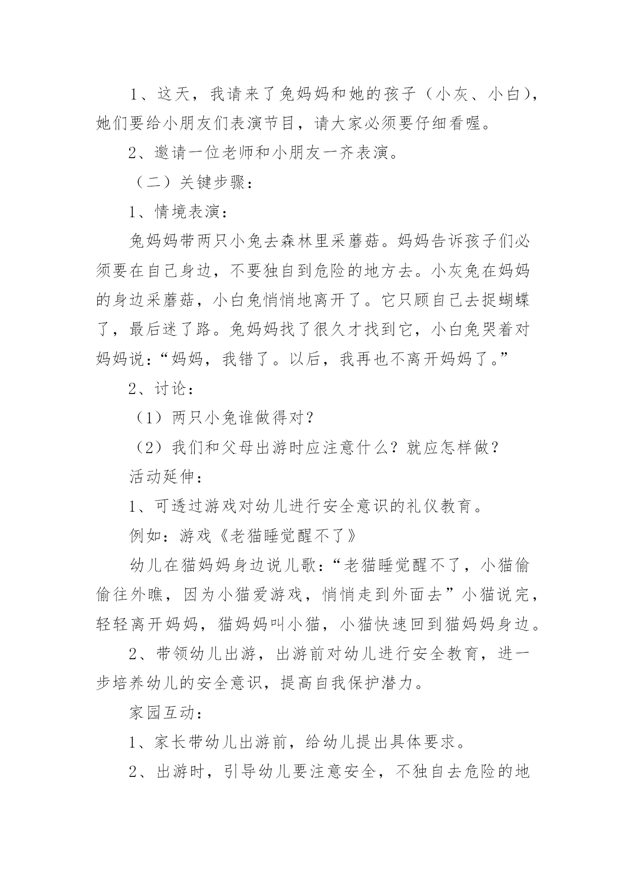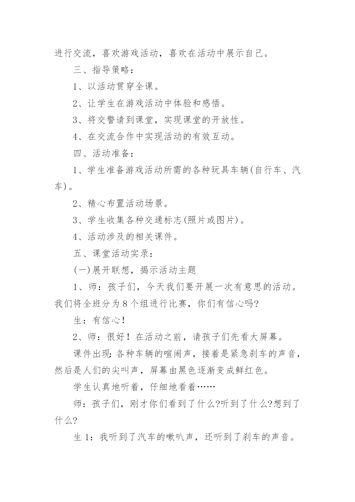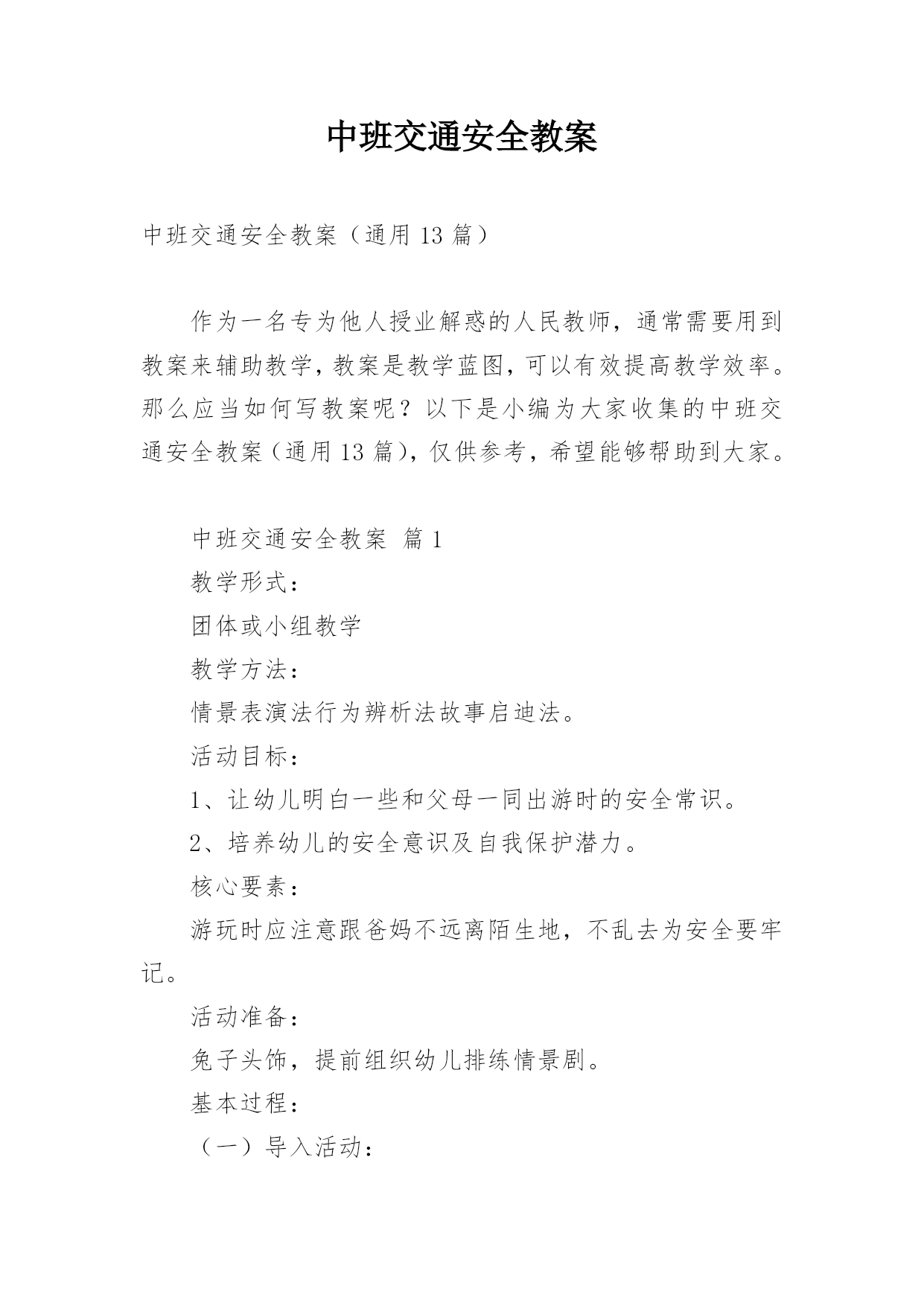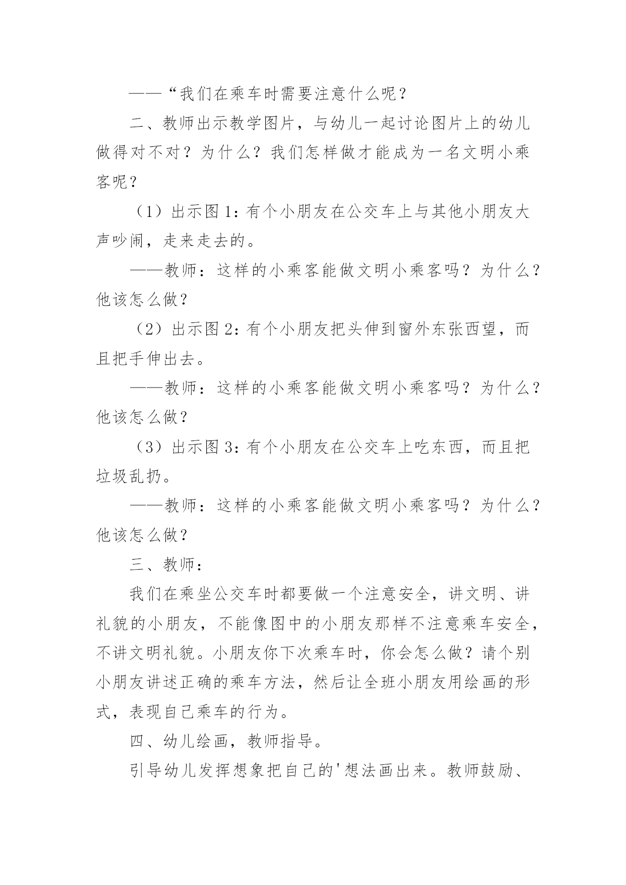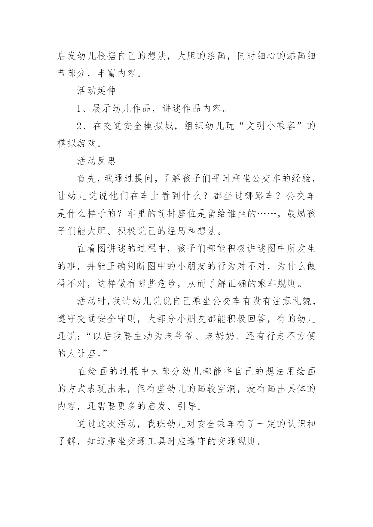 中班交通安全教案中班交通安全教案(通用13篇)作为一名专为他人授业解惑的人民教师,通常需要用到教案来辅助教学,教案是教学蓝图,可以有效提高教学效率。那么应当如何写教案呢?以下是小编为大家收集的中班交通安全教案(通用13篇),仅供参考,希望能够帮助到大家。中班交通安全教案篇1教学形式:团体或小组教学教学方法:情景表演法行为辨析法故事启迪法。活动目标:1、让幼儿明白一些和父母一同出游时的安全常识。2、培养幼儿的安全意识及自我保护潜力。核心要素:游玩时应注意跟爸妈不远离陌生地,不乱去为安全要牢记。活动准备:兔子头饰,提前组织幼儿排练情景剧。基本过程:(一)导入活动:1、这天,我请来了兔妈妈和她的孩子(小灰、小白),她们要给小朋友们表演节目,请大家必须要仔细看喔。2、邀请一位老师和小朋友一齐表演。(二)关键步骤:1、情境表演:兔妈妈带两只小兔去森林里采蘑菇。妈妈告诉孩子们必须要在自己身边,不要独自到危险的地方去。小灰兔在妈妈的身边采蘑菇,小白兔悄悄地离开了。它只顾自己去捉蝴蝶了,最后迷了路。兔妈妈找了很久才找到它,小白兔哭着对妈妈说:“妈妈,我错了。以后,我再也不离开妈妈了。”2、讨论:(1)两只小兔谁做得对?(2)我们和父母出游时应注意什么?就应怎样做?活动延伸:1、可透过游戏对幼儿进行安全意识的礼仪教育。例如:游戏《老猫睡觉醒不了》幼儿在猫妈妈身边说儿歌:“老猫睡觉醒不了,小猫偷偷往外瞧,因为小猫爱游戏,悄悄走到外面去”小猫说完,轻轻离开妈妈,猫妈妈叫小猫,小猫快速回到猫妈妈身边。2、带领幼儿出游,出游前对幼儿进行安全教育,进一步培养幼儿的安全意识,提高自我保护潜力。家园互动:1、家长带幼儿出游前,给幼儿提出具体要求。2、出游时,引导幼儿要注意安全,不独自去危险的地方。注意事项:外出时,要让幼儿活动在自己的.视线内。活动反思:1、孩子对活动的哪一环节最感兴趣?为什么?2、你认为这个活动的成功之处在哪里?3、你认为还有哪些地方需要改善?该如何改善?中班交通安全教案篇2活动目标1、通过学习乘车小常识,增强幼儿的交通安全意识。2、激发幼儿主动关心别人,做一名文明小乘客。3、在绘画和游戏活动中体验交通安全的重要性,从而自觉地遵守交通规则。活动准备教学图片、音乐《叭叭叭、汽车开来了》、A4白纸若干、油画棒每人一盒。活动过程一、放音乐带领幼儿玩开汽车的游戏,引出主题。在音乐声中,幼儿与教师一起开汽车进入课室。——“小朋友,刚刚我们一起开着我们的小汽车来到了我们的课室,那你们有没有和爸爸、妈妈乘坐过公交车?——“公交车是什么样子的,和其他车子哪里不一样?——“公交车前排座位是留给谁做的?——“我们在乘车时需要注意什么呢?二、教师出示教学图片,与幼儿一起讨论图片上的幼儿做得对不对?为什么?我们怎样做才能成为一名文明小乘客呢?(1)出示图1:有个小朋友在公交车上与其他小朋友大声吵闹,走来走去的。——教师:这样的小乘客能做文明小乘客吗?为什么?他该怎么做?(2)出示图2:有个小朋友把头伸到窗外东张西望,而且把手伸出去。——教师:这样的小乘客能做文明小乘客吗?为什么?他该怎么做?(3)出示图3:有个小朋友在公交车上吃东西,而且把垃圾乱扔。——教师:这样的小乘客能做文明小乘客吗?为什么?他该怎么做?三、教师:我们在乘坐公交车时都要做一个注意安全,讲文明、讲礼貌的小朋友,不能像图中的小朋友那样不注意乘车安全,不讲文明礼貌。小朋友你下次乘车时,你会怎么做?请个别小朋友讲述正确的乘车方法,然后让全班小朋友用绘画的形式,表现自己乘车的行为。四、幼儿绘画,教师指导。引导幼儿发挥想象把自己的'想法画出来。教师鼓励、启发幼儿根据自己的想法,大胆的绘画,同时细心的添画细节部分,丰富内容。活动延伸1、展示幼儿作品,讲述作品内容。2、在交通安全模拟城,组织幼儿玩“文明小乘客”的模拟游戏。活动反思首先,我通过提问,了解孩子们平时乘坐公交车的经验,让幼儿说说他们在车上看到什么?都坐过哪路车?公交车是什么样子的?车里的前排座位是留给谁坐的……,鼓励孩子们能大胆、积极说己的经历和想法。在看图讲述的过程中,孩子们都能积极讲述图中所发生的事,并能正确判断图中的小朋友的行为对不对,为什么做得不对,这样做有哪些危险,从而了解正确的乘车规则。活动时,我请幼儿说说自己乘坐公交车有没有注意礼貌,遵守交通安全守则,大部分小朋友都能积极回答,有的幼儿还说:“以后我要主动为老爷爷、老奶奶、还有行走不方便的人让座。”在绘画的过程中大部分幼儿都能将自己的想法用绘画的方式表现出来,但有些幼儿的画较空洞,没有画出具体的内容,还需要更多的启发、引导。通过这次活动,我班幼儿对安全乘车有了一定的认识和了解,知道乘坐交通工具时应遵守的交通规则。中班交通安全教案篇3一、活动目标:1、让幼儿知道汽车及其他交通工具行驶