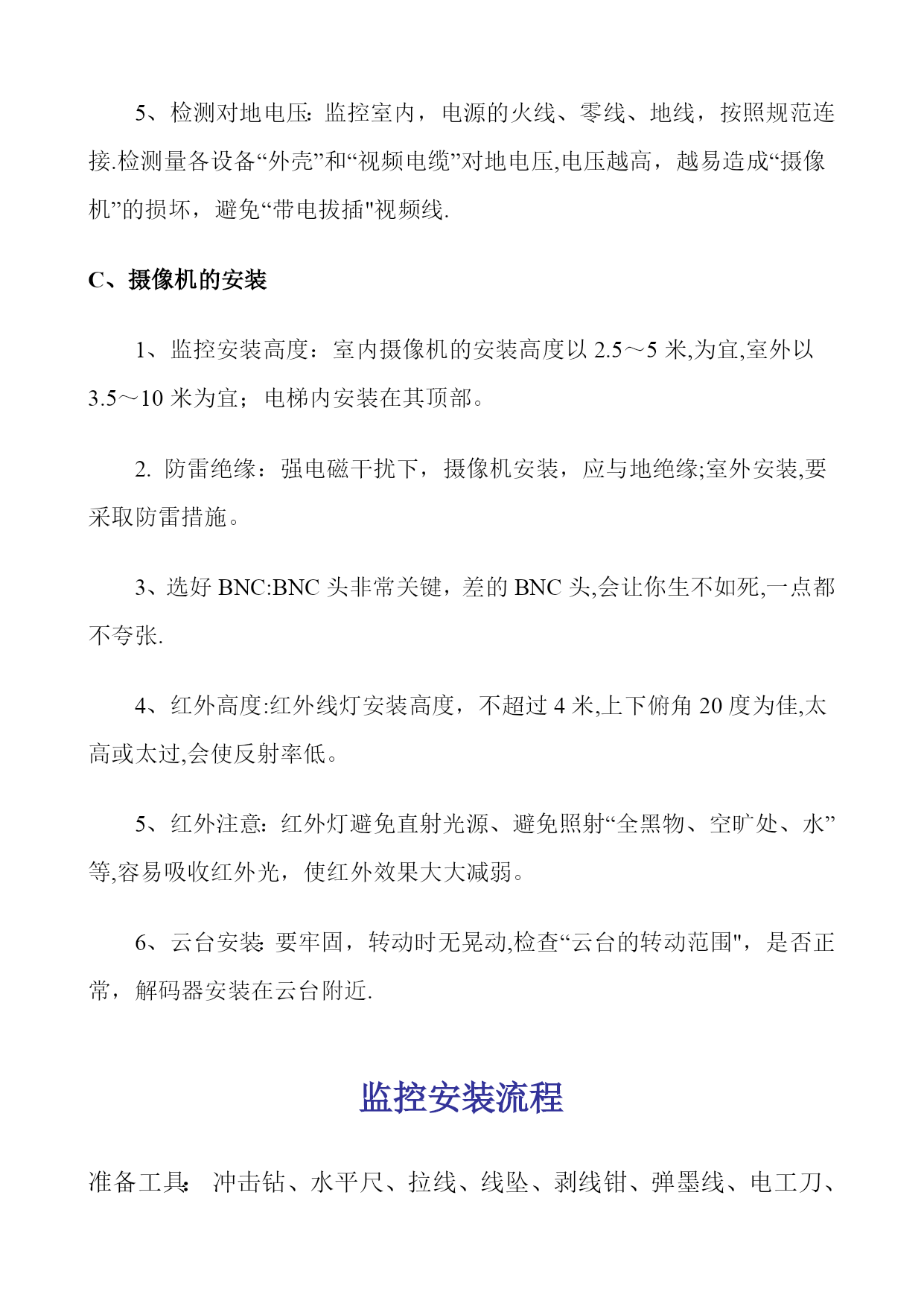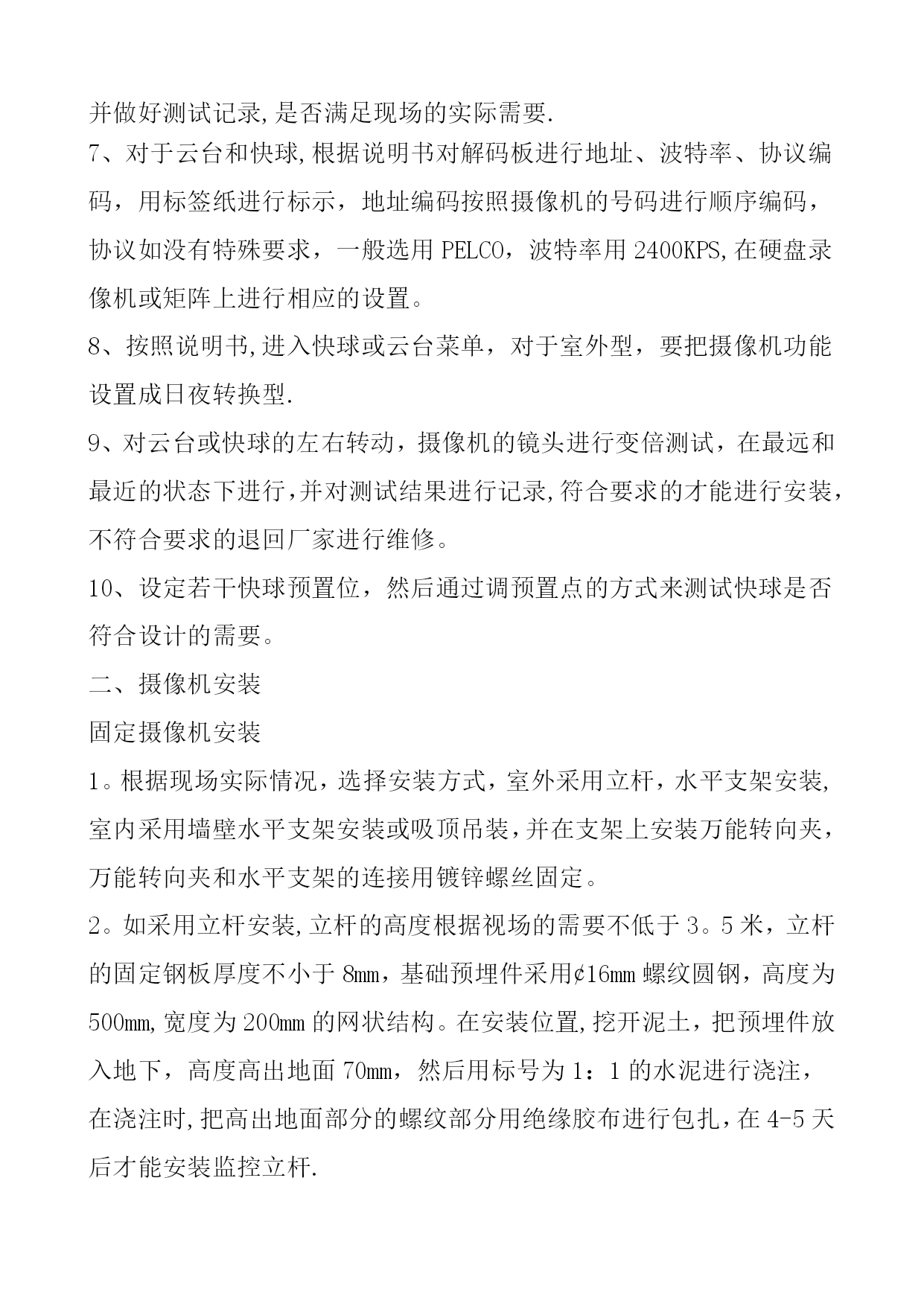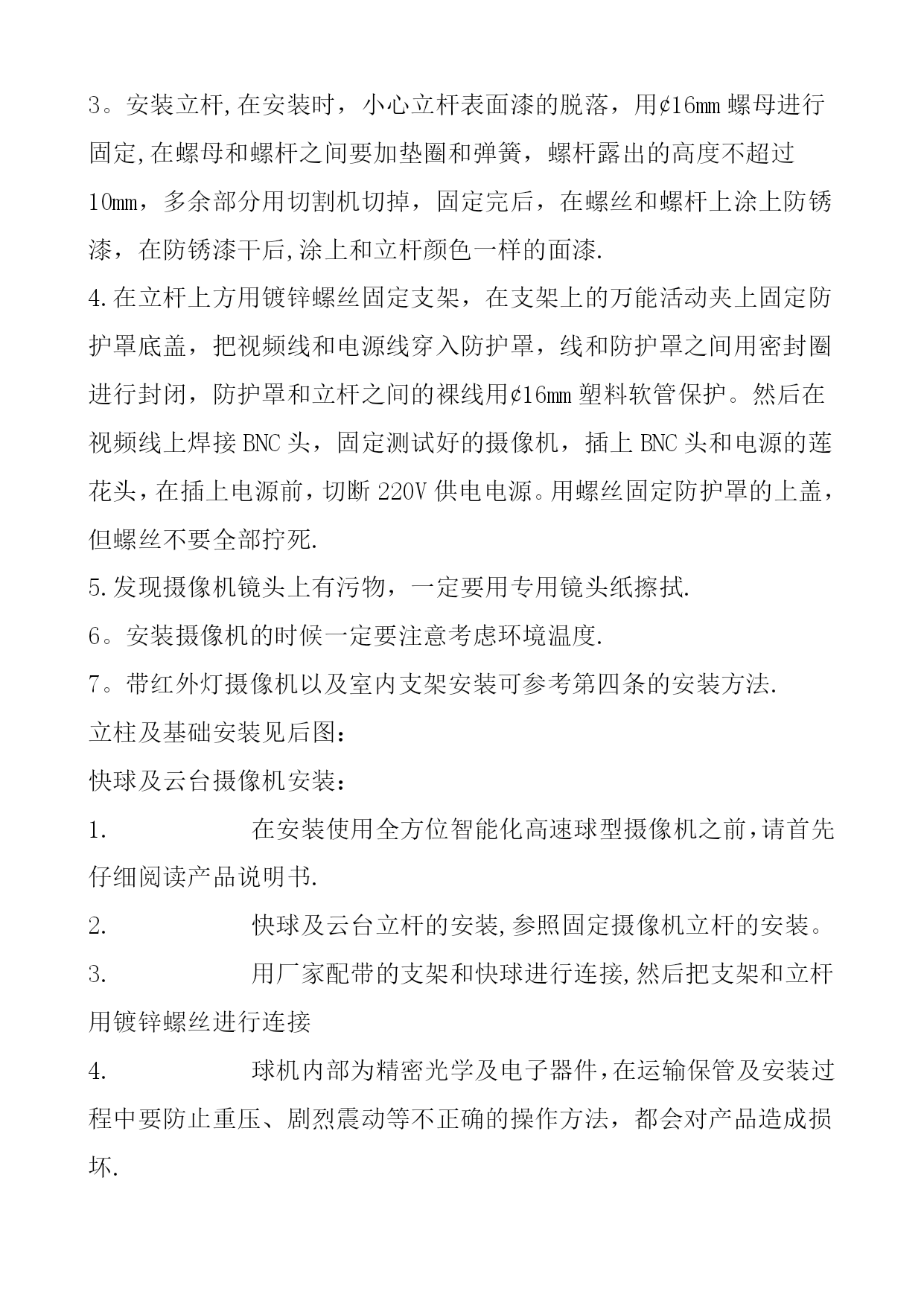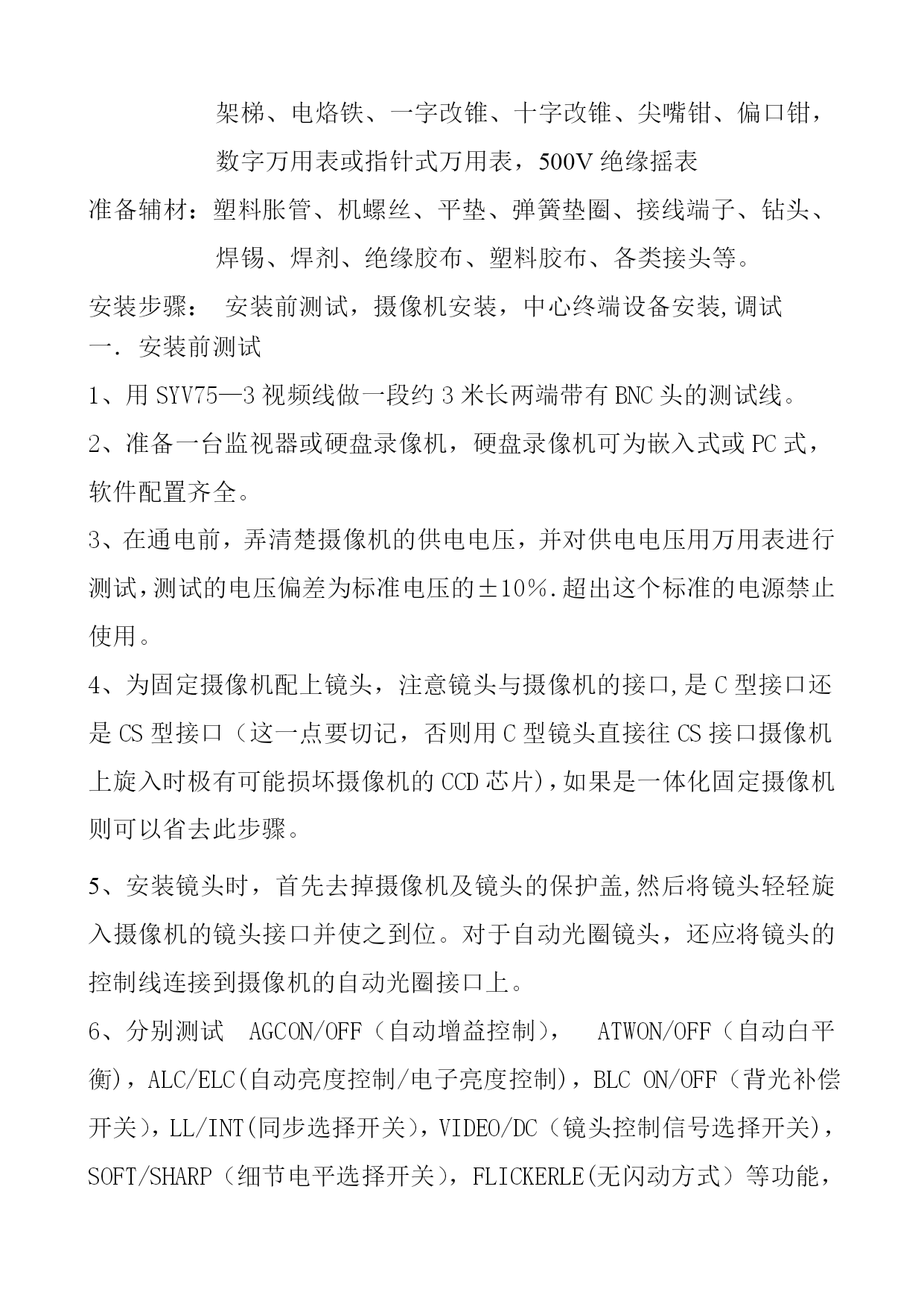 监控系统安装流程(视频监控安装教程)实用文档(实用文档,可以直接使用,可编辑优秀版资料,欢迎下载)监控安装指导与注意事项A、线路安装与选材1、电源线:要选“阻燃"电缆,皮结实,在省成本前提下,尽量用粗点的,以减少电源的衰减。2、视频线:SYV75—3线传输在300米内,75-5线传输500米内,75-7的线可传输800米;超过500米距离,就要考虑采用“光缆”。另外,要注意“同轴电缆”的质量。3、控制线:一般选用“带屏蔽”2*1。0的线缆,RVVP2*1。0。4、穿线管:一般用“PVC管”即可,要“埋地、防爆"的工程,要选“镀锌”钢管。B、控制设备安装1、控制台与机柜:安装应平稳牢固,高度适当,便于操作维护。机柜架的背面、侧面,离墙距离,考虑到便于维修。2、控制显示设备:安装应便于操作、牢靠,监视器应避免“外来光”直射,设备应有“通风散热"措施。3、设置线槽线孔:机柜内所有线缆,依位置,设备电缆槽和进线孔,捆扎整齐、编号、标志。4、设备散热通风:控制设备的工作环境,要在空调室内,并要清洁,设备间要留的空间,可加装风扇通风。5、检测对地电压:监控室内,电源的火线、零线、地线,按照规范连接.检测量各设备“外壳”和“视频电缆”对地电压,电压越高,越易造成“摄像机”的损坏,避免“带电拔插"视频线.C、摄像机的安装1、监控安装高度:室内摄像机的安装高度以2.5~5米,为宜,室外以3.5~10米为宜;电梯内安装在其顶部。2.防雷绝缘:强电磁干扰下,摄像机安装,应与地绝缘;室外安装,要采取防雷措施。3、选好BNC:BNC头非常关键,差的BNC头,会让你生不如死,一点都不夸张.4、红外高度:红外线灯安装高度,不超过4米,上下俯角20度为佳,太高或太过,会使反射率低。5、红外注意:红外灯避免直射光源、避免照射“全黑物、空旷处、水”等,容易吸收红外光,使红外效果大大减弱。6、云台安装:要牢固,转动时无晃动,检查“云台的转动范围",是否正常,解码器安装在云台附近.监控安装流程准备工具:冲击钻、水平尺、拉线、线坠、剥线钳、弹墨线、电工刀、架梯、电烙铁、一字改锥、十字改锥、尖嘴钳、偏口钳,数字万用表或指针式万用表,500V绝缘摇表准备辅材:塑料胀管、机螺丝、平垫、弹簧垫圈、接线端子、钻头、焊锡、焊剂、绝缘胶布、塑料胶布、各类接头等。安装步骤:安装前测试,摄像机安装,中心终端设备安装,调试一.安装前测试1、用SYV75—3视频线做一段约3米长两端带有BNC头的测试线。2、准备一台监视器或硬盘录像机,硬盘录像机可为嵌入式或PC式,软件配置齐全。3、在通电前,弄清楚摄像机的供电电压,并对供电电压用万用表进行测试,测试的电压偏差为标准电压的±10%.超出这个标准的电源禁止使用。4、为固定摄像机配上镜头,注意镜头与摄像机的接口,是C型接口还是CS型接口(这一点要切记,否则用C型镜头直接往CS接口摄像机上旋入时极有可能损坏摄像机的CCD芯片),如果是一体化固定摄像机则可以省去此步骤。5、安装镜头时,首先去掉摄像机及镜头的保护盖,然后将镜头轻轻旋入摄像机的镜头接口并使之到位。对于自动光圈镜头,还应将镜头的控制线连接到摄像机的自动光圈接口上。6、分别测试AGCON/OFF(自动增益控制),ATWON/OFF(自动白平衡),ALC/ELC(自动亮度控制/电子亮度控制),BLCON/OFF(背光补偿开关),LL/INT(同步选择开关),VIDEO/DC(镜头控制信号选择开关),SOFT/SHARP(细节电平选择开关),FLICKERLE(无闪动方式)等功能,并做好测试记录,是否满足现场的实际需要.7、对于云台和快球,根据说明书对解码板进行地址、波特率、协议编码,用标签纸进行标示,地址编码按照摄像机的号码进行顺序编码,协议如没有特殊要求,一般选用PELCO,波特率用2400KPS,在硬盘录像机或矩阵上进行相应的设置。8、按照说明书,进入快球或云台菜单,对于室外型,要把摄像机功能设置成日夜转换型.9、对云台或快球的左右转动,摄像机的镜头进行变倍测试,在最远和最近的状态下进行,并对测试结果进行记录,符合要求的才能进行安装,不符合要求的退回厂家进行维修。10、设定若干快球预置位,然后通过调预置点的方式来测试快球是否符合设计的需要。二、摄像机安装固定摄像机安装1。根据现场实际情况,选择安装方式,室外采用立杆,水平支架安装,室内采用墙壁水平支架安装或吸顶吊装,并在支架上安装万能转向夹,万能转向夹和水平支架的连接用镀锌螺丝固定。2。如采用立杆安装,立杆的高度根据视场的需要不低于3。5米,立杆的固定钢板厚度不小于8mm,基础预埋件采用¢16mm螺纹圆钢,高度为500mm,宽度为200mm的网状结构。在安装位