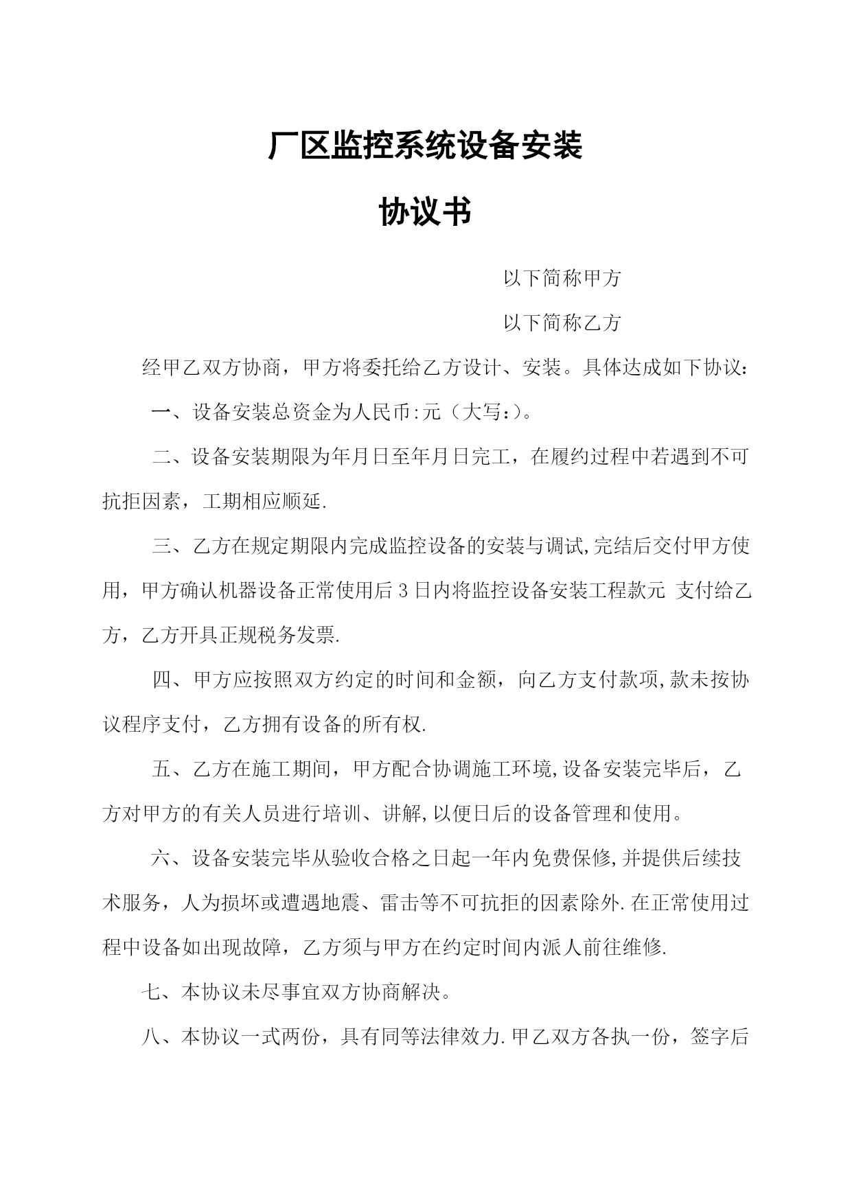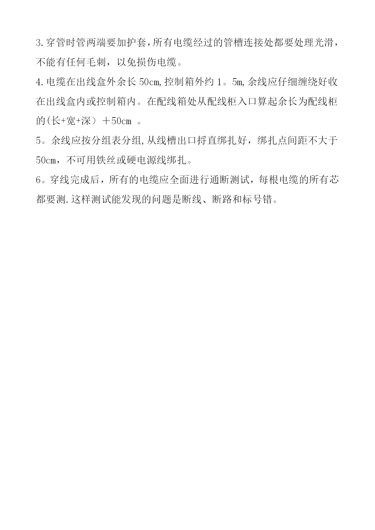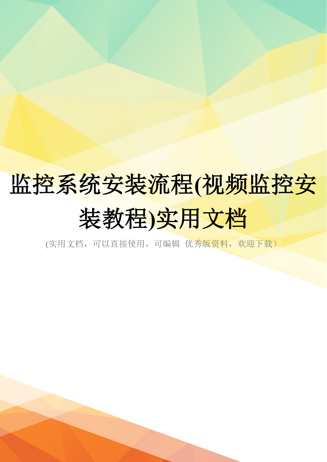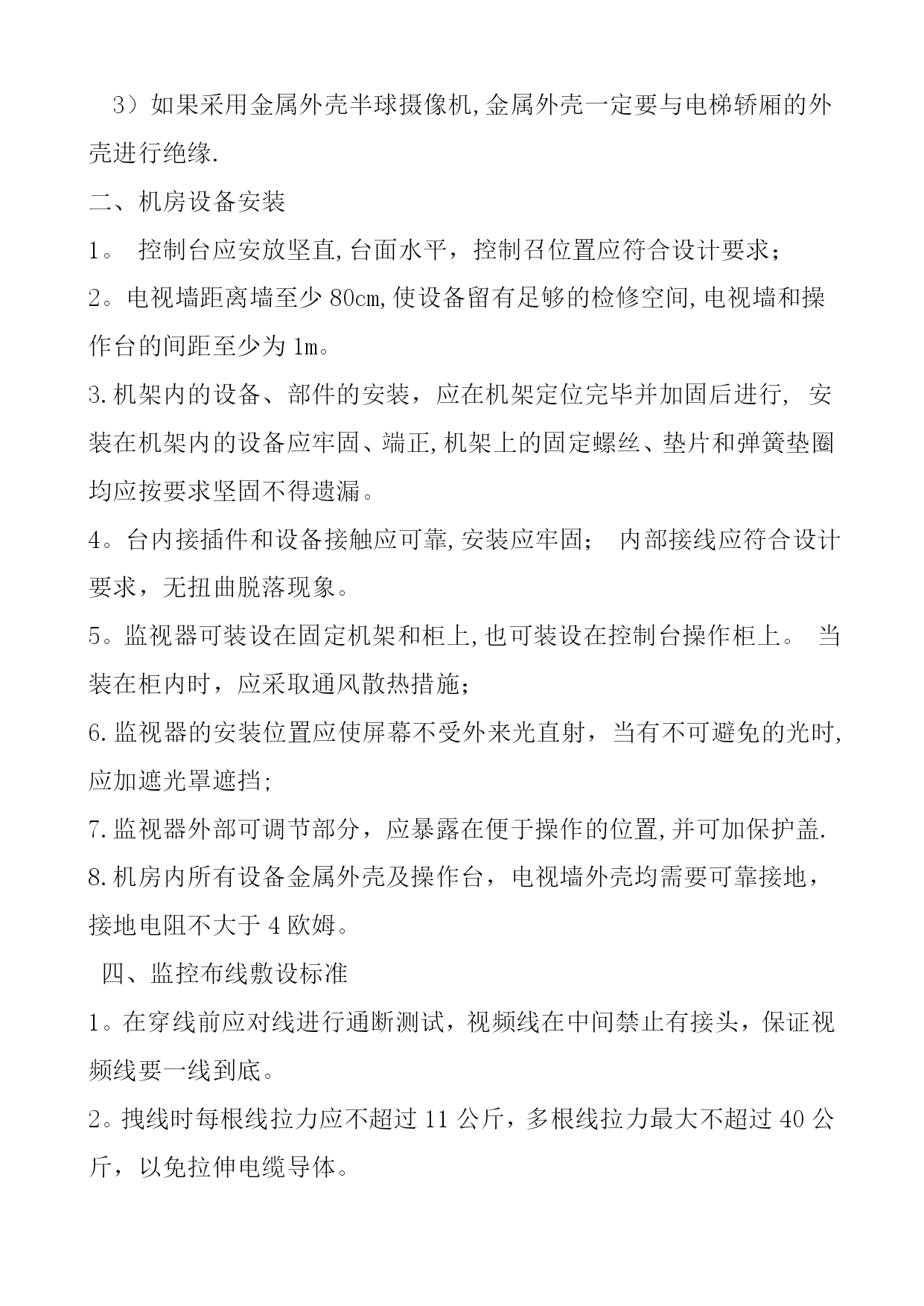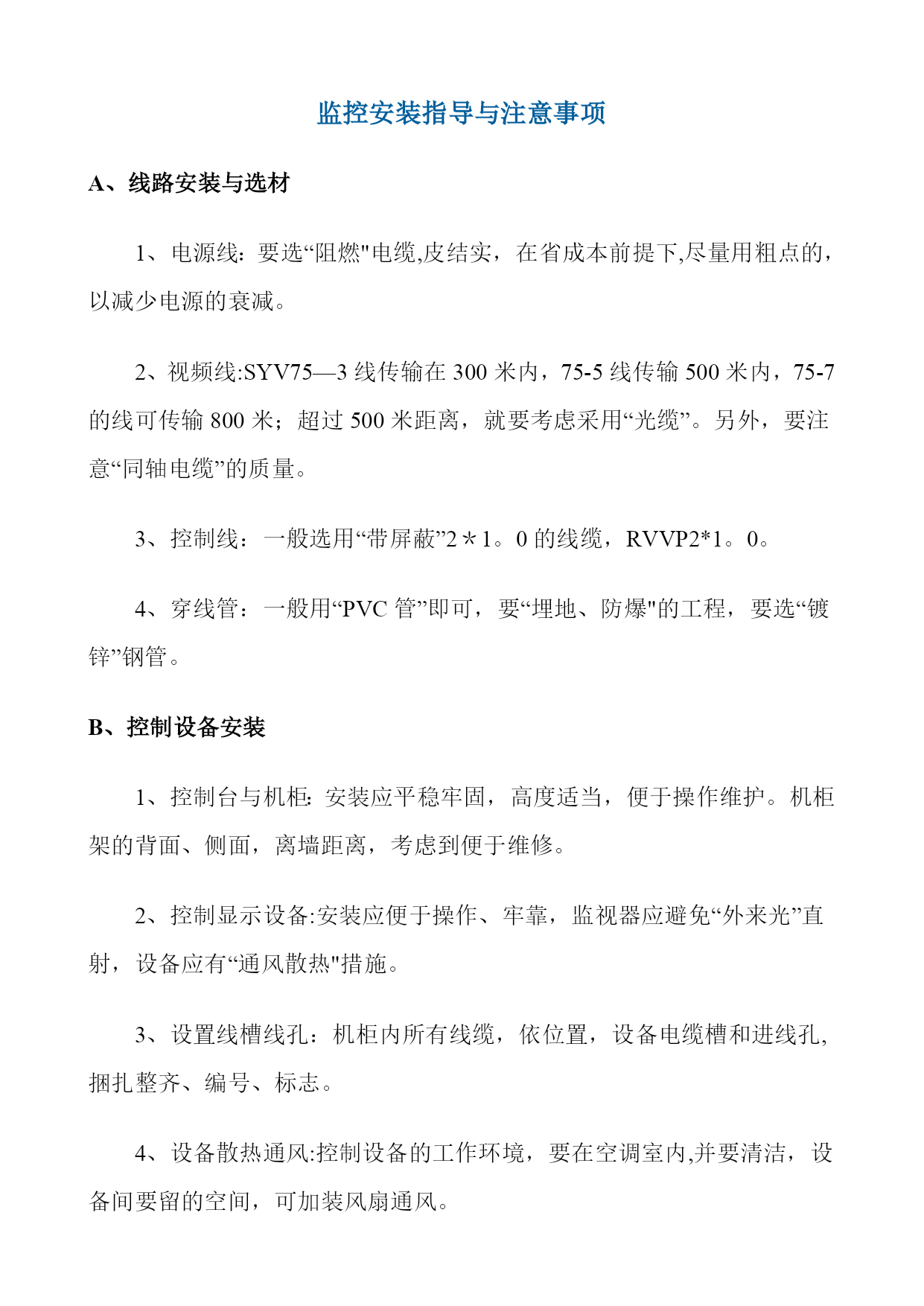 监控系统安装流程(视频监控安装教程)实用文档(实用文档,可以直接使用,可编辑优秀版资料,欢迎下载)监控安装指导与注意事项A、线路安装与选材1、电源线:要选“阻燃"电缆,皮结实,在省成本前提下,尽量用粗点的,以减少电源的衰减。2、视频线:SYV75—3线传输在300米内,75-5线传输500米内,75-7的线可传输800米;超过500米距离,就要考虑采用“光缆”。另外,要注意“同轴电缆”的质量。3、控制线:一般选用“带屏蔽”2*1。0的线缆,RVVP2*1。0。4、穿线管:一般用“PVC管”即可,要“埋地、防爆"的工程,要选“镀锌”钢管。B、控制设备安装1、控制台与机柜:安装应平稳牢固,高度适当,便于操作维护。机柜架的背面、侧面,离墙距离,考虑到便于维修。2、控制显示设备:安装应便于操作、牢靠,监视器应避免“外来光”直射,设备应有“通风散热"措施。3、设置线槽线孔:机柜内所有线缆,依位置,设备电缆槽和进线孔,捆扎整齐、编号、标志。4、设备散热通风:控制设备的工作环境,要在空调室内,并要清洁,设备间要留的空间,可加装风扇通风。5、检测对地电压:监控室内,电源的火线、零线、地线,按照规范连接.检测量各设备“外壳”和“视频电缆”对地电压,电压越高,越易造成“摄像机”的损坏,避免“带电拔插"视频线.C、摄像机的安装1、监控安装高度:室内摄像机的安装高度以2.5~5米,为宜,室外以3.5~10米为宜;电梯内安装在其顶部。2.防雷绝缘:强电磁干扰下,摄像机安装,应与地绝缘;室外安装,要采取防雷措施。3、选好BNC:BNC头非常关键,差的BNC头,会让你生不如死,一点都不夸张.4、红外高度:红外线灯安装高度,不超过4米,上下俯角20度为佳,太高或太过,会使反射率低。5、红外注意:红外灯避免直射光源、避免照射“全黑物、空旷处、水”等,容易吸收红外光,使红外效果大大减弱。6、云台安装:要牢固,转动时无晃动,检查“云台的转动范围",是否正常,解码器安装在云台附近.监控安装流程准备工具:冲击钻、水平尺、拉线、线坠、剥线钳、弹墨线、电工刀、架梯、电烙铁、一字改锥、十字改锥、尖嘴钳、偏口钳,数字万用表或指针式万用表,500V绝缘摇表准备辅材:塑料胀管、机螺丝、平垫、弹簧垫圈、接线端子、钻头、焊锡、焊剂、绝缘胶布、塑料胶布、各类接头等。安装步骤:安装前测试,摄像机安装,中心终端设备安装,调试一.安装前测试1、用SYV75—3视频线做一段约3米长两端带有BNC头的测试线。2、准备一台监视器或硬盘录像机,硬盘录像机可为嵌入式或PC式,软件配置齐全。3、在通电前,弄清楚摄像机的供电电压,并对供电电压用万用表进行测试,测试的电压偏差为标准电压的±10%.超出这个标准的电源禁止使用。4、为固定摄像机配上镜头,注意镜头与摄像机的接口,是C型接口还是CS型接口(这一点要切记,否则用C型镜头直接往CS接口摄像机上旋入时极有可能损坏摄像机的CCD芯片),如果是一体化固定摄像机则可以省去此步骤。5、安装镜头时,首先去掉摄像机及镜头的保护盖,然后将镜头轻轻旋入摄像机的镜头接口并使之到位。对于自动光圈镜头,还应将镜头的控制线连接到摄像机的自动光圈接口上。6、分别测试AGCON/OFF(自动增益控制),ATWON/OFF(自动白平衡),ALC/ELC(自动亮度控制/电子亮度控制),BLCON/OFF(背光补偿开关),LL/INT(同步选择开关),VIDEO/DC(镜头控制信号选择开关),SOFT/SHARP(细节电平选择开关),FLICKERLE(无闪动方式)等功能,并做好测试记录,是否满足现场的实际需要.7、对于云台和快球,根据说明书对解码板进行地址、波特率、协议编码,用标签纸进行标示,地址编码按照摄像机的号码进行顺序编码,协议如没有特殊要求,一般选用PELCO,波特率用2400KPS,在硬盘录像机或矩阵上进行相应的设置。8、按照说明书,进入快球或云台菜单,对于室外型,要把摄像机功能设置成日夜转换型.9、对云台或快球的左右转动,摄像机的镜头进行变倍测试,在最远和最近的状态下进行,并对测试结果进行记录,符合要求的才能进行安装,不符合要求的退回厂家进行维修。10、设定若干快球预置位,然后通过调预置点的方式来测试快球是否符合设计的需要。二、摄像机安装固定摄像机安装1。根据现场实际情况,选择安装方式,室外采用立杆,水平支架安装,室内采用墙壁水平支架安装或吸顶吊装,并在支架上安装万能转向夹,万能转向夹和水平支架的连接用镀锌螺丝固定。2。如采用立杆安装,立杆的高度根据视场的需要不低于3。5米,立杆的固定钢板厚度不小于8mm,基础预埋件采用¢16mm螺纹圆钢,高度为500mm,宽度为200mm的网状结构。在安装位