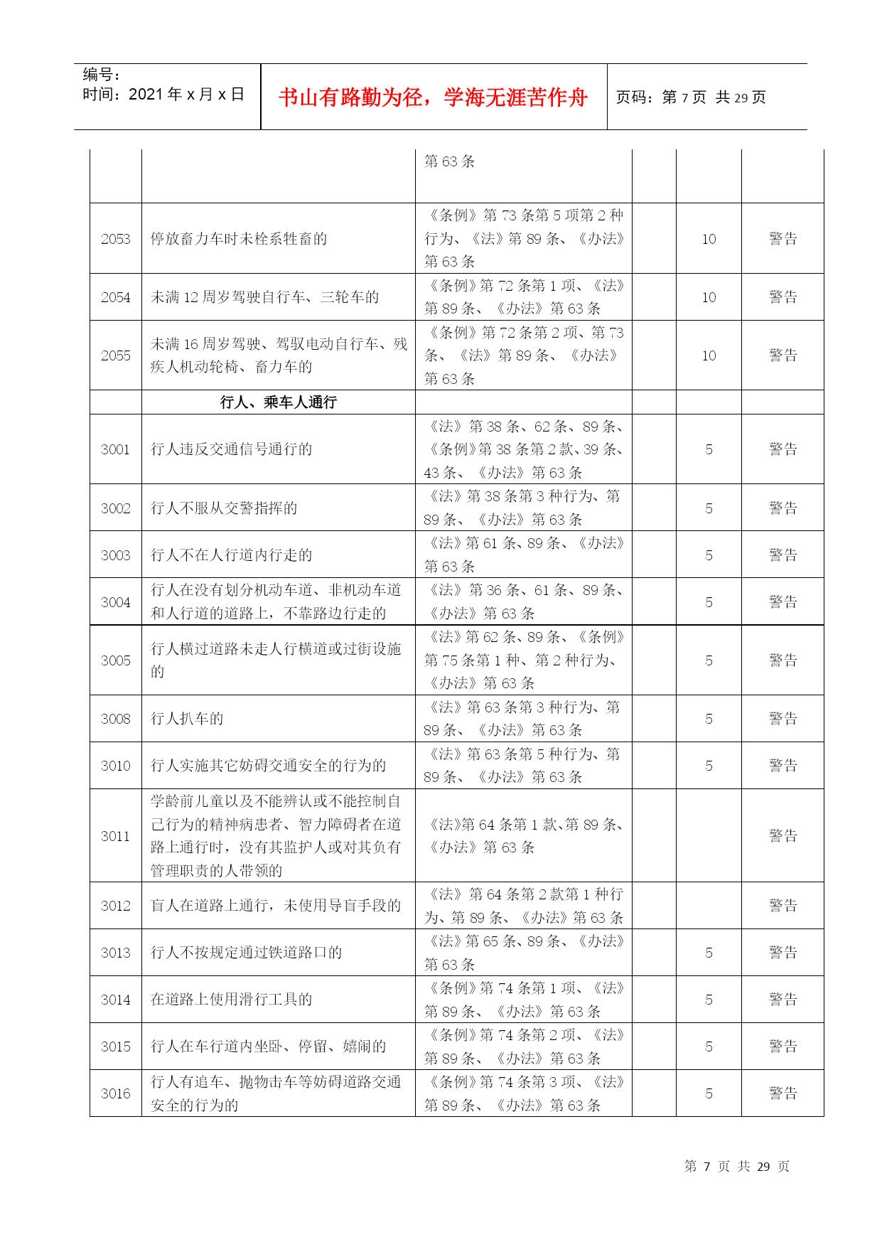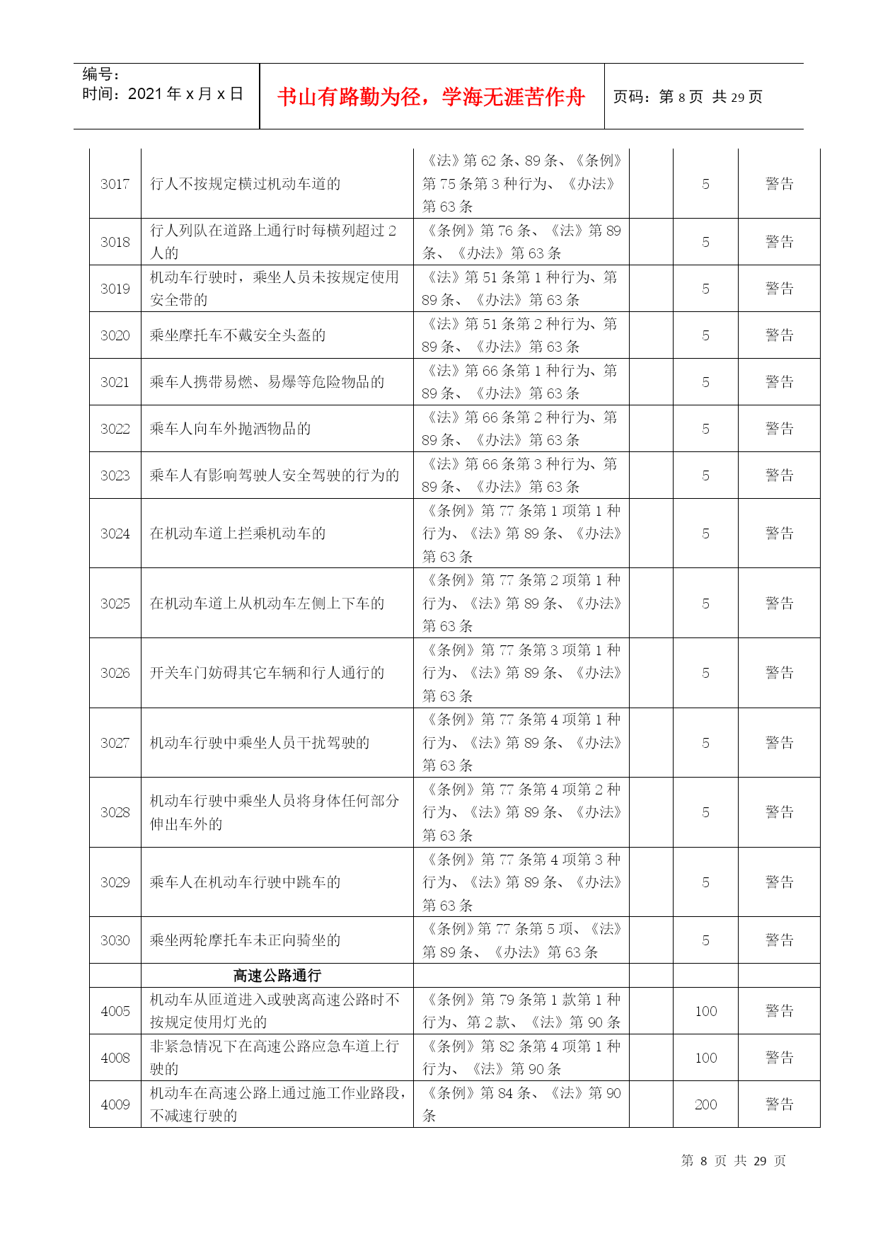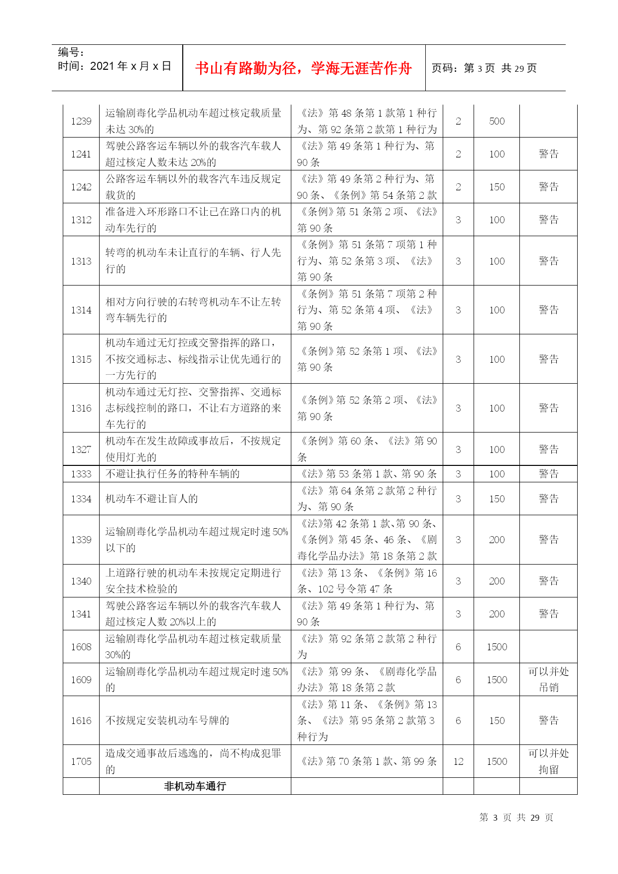 编号:时间:2021年x月x日书山有路勤为径,学海无涯苦作舟页码:第PAGE29页共NUMPAGES29页第PAGE\*MERGEFORMAT29页共NUMPAGES\*MERGEFORMAT29页湖北省交通违法行为代码武汉代码违法行为依据计分分值罚款金额(元)其他处罚机动车通行1003造成交通事故后逃逸的,构成犯罪的《法》第101条第2款吊销1004违反道路交通安全法律、法规的规定,发生重大事故,构成犯罪的《法》第101条第1款吊销1010驾驶人在驾驶证超过有效期仍驾驶机动车的《法》第99条、《条例》第28条第3种行为500可以并处拘留1015驾驶证被依法扣留期间仍驾驶机动车的《条例》第28条第4种行为、《法》第90条、95条200警告1016违法记分达到12分仍驾驶机动车的《条例》第28条第6种行为、《法》第90条200警告1017不按规定投保机动车第三者责任险的《法》第98条第1款2倍保费1019机动车违反规定使用专用车道的《法》第37条、第90条50警告1020机动车驾驶人不服从交警指挥的《法》第38条第1种行为、第90条100警告1035客运机动车违反规定载货的《法》第49条第2种行为、第90条、《条例》第54条第2款100警告1036货运机动车违反规定载人的《法》第50条、第90条、《条例》第55条第2项100警告1037未将故障车辆移到不妨碍交通的地方停放的《法》第52条第1种行为、第90条100警告1041道路养护施工作业车辆、机械作业时未开启示警灯和危险报警闪光灯的《条例》第35条第1款、《法》第90条100警告1050机动车行经漫水路或漫水桥时未低速通过的《条例》第64条、《法》第90条100警告1051机动车载运超限物品行经铁路道口时不按指定的道口通过的《条例》第65条第1款第1种行为、《法》第90条200警告1052机动车载运超限物品行经铁路道口时不按指定的时间通过的《条例》第65条第1款第2种行为、《法》第90条200警告1054上下渡船时,不低速慢行的《条例》第65条第2款第2种行为、《法》第90条100警告1057机动车在单位院内居民居住区内不低速行驶的《条例》第67条第1种行为、《法》第90条50警告1058机动车在单位院内居民居住区内不避让行人的《条例》第67条第2种行为、《法》第90条50警告1061拖拉机驶入大中城市中心城区内道路的《法》第55条第1款第2种行为、第90条100警告1062拖拉机驶入其它禁止通行道路的《法》第55条第1款第3种行为、第90条100警告1076机动车在没有划分机动车道、非机动车道和人行道的道路上,不在道路中间通行的《法》第36条第2种行为、第90条100警告1077驾驶机动车下陡坡时熄火、空档滑行的《条例》第62条第4项、《法》第90条100警告1082使用他人机动车驾驶证驾驶机动车的《法》第19条第1款、第90条、《条例》第28条100警告1083载货汽车、挂车未按照规定安装侧面及后下部防护装置、粘贴车身反光标识的102号令第47条200警告1084改变车身颜色、更换发动机、车身或者车架,未按规定时限办理变更登记的《条例》第6条,102号令第10条、第47条200警告1085机动车所有权转移后,现机动车所有人未按规定时限办理转移登记的《条例》第7条,102号令第18条、第47条200警告1086机动车所有人办理变更登记、转移登记,机动车档案转出登记地车辆管理所后,未按照规定时限到住所地车辆管理所申请机动车转入的《条例》第6条、第7条,102号令第10条、第47条200警告1087擅自改变机动车外形和已登记的有关技术数据的《法》第16条,102号令第48条500警告1088以欺骗、贿赂等不正当手段办理补、换领机动车登记证书、号牌、行驶证和检查合格标志等业务的102号令第49条200警告1112机动车载物行驶时遗洒、飘散载运物的《法》第48条第1款第3种行为、第90条1150警告1210通过路口遇放行信号不依次通过的《条例》第51条第4项、《法》第90条2100警告1212通过路口向右转弯遇同车道内有车等候放行信号时,不依次停车等候的《条例》第51条第6项、《法》第90条2100警告1225驾车时有其他妨碍安全行车的行为的《条例》第62第3项第3种行为、《法》第90条250警告1227在同车道行驶中,不按规定与前车保持必要的安全距离的《法》第43条第1项、第90条2100警告1228路口遇有交通阻塞时未依次等候的《条例》第53条第1款、《法》第90条2100警告1238机动车载人超过核定人数的《法》第49条第1种行为、第90条2100警告1239运输剧毒化学品机动车超过核定载质量未达30%的《法》第48条第1款第1种行为、第92