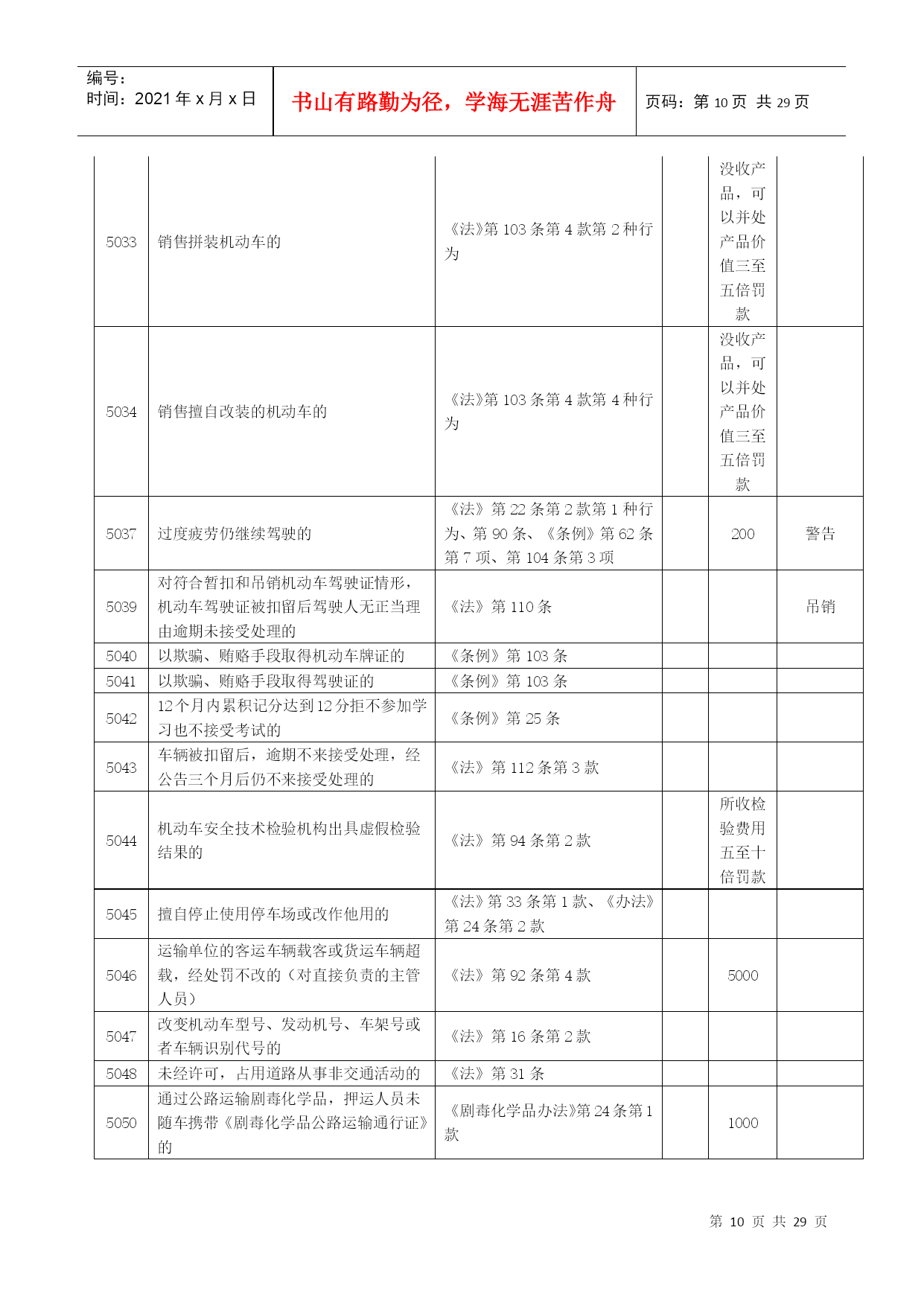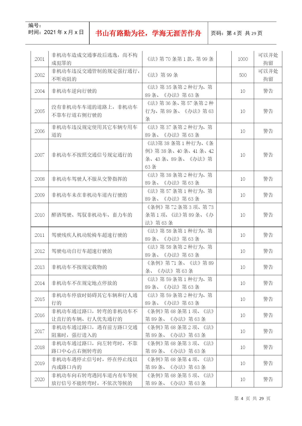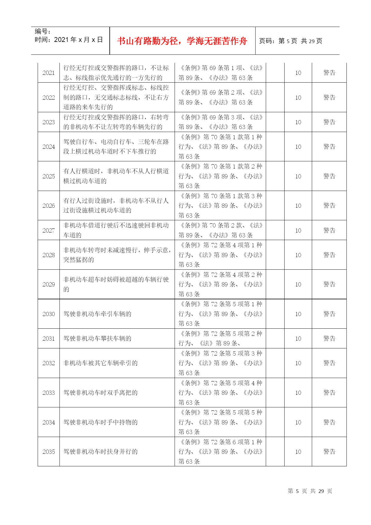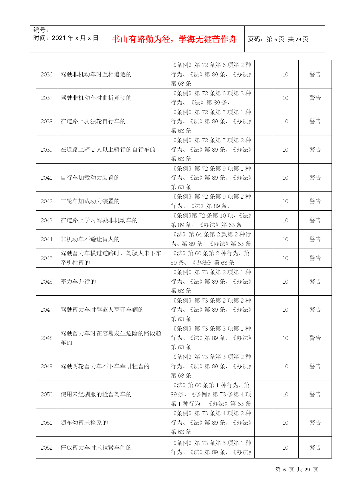 编号:时间:2021年x月x日书山有路勤为径,学海无涯苦作舟页码:第PAGE29页共NUMPAGES29页第PAGE\*MERGEFORMAT29页共NUMPAGES\*MERGEFORMAT29页湖北省交通违法行为代码武汉代码违法行为依据计分分值罚款金额(元)其他处罚机动车通行1003造成交通事故后逃逸的,构成犯罪的《法》第101条第2款吊销1004违反道路交通安全法律、法规的规定,发生重大事故,构成犯罪的《法》第101条第1款吊销1010驾驶人在驾驶证超过有效期仍驾驶机动车的《法》第99条、《条例》第28条第3种行为500可以并处拘留1015驾驶证被依法扣留期间仍驾驶机动车的《条例》第28条第4种行为、《法》第90条、95条200警告1016违法记分达到12分仍驾驶机动车的《条例》第28条第6种行为、《法》第90条200警告1017不按规定投保机动车第三者责任险的《法》第98条第1款2倍保费1019机动车违反规定使用专用车道的《法》第37条、第90条50警告1020机动车驾驶人不服从交警指挥的《法》第38条第1种行为、第90条100警告1035客运机动车违反规定载货的《法》第49条第2种行为、第90条、《条例》第54条第2款100警告1036货运机动车违反规定载人的《法》第50条、第90条、《条例》第55条第2项100警告1037未将故障车辆移到不妨碍交通的地方停放的《法》第52条第1种行为、第90条100警告1041道路养护施工作业车辆、机械作业时未开启示警灯和危险报警闪光灯的《条例》第35条第1款、《法》第90条100警告1050机动车行经漫水路或漫水桥时未低速通过的《条例》第64条、《法》第90条100警告1051机动车载运超限物品行经铁路道口时不按指定的道口通过的《条例》第65条第1款第1种行为、《法》第90条200警告1052机动车载运超限物品行经铁路道口时不按指定的时间通过的《条例》第65条第1款第2种行为、《法》第90条200警告1054上下渡船时,不低速慢行的《条例》第65条第2款第2种行为、《法》第90条100警告1057机动车在单位院内居民居住区内不低速行驶的《条例》第67条第1种行为、《法》第90条50警告1058机动车在单位院内居民居住区内不避让行人的《条例》第67条第2种行为、《法》第90条50警告1061拖拉机驶入大中城市中心城区内道路的《法》第55条第1款第2种行为、第90条100警告1062拖拉机驶入其它禁止通行道路的《法》第55条第1款第3种行为、第90条100警告1076机动车在没有划分机动车道、非机动车道和人行道的道路上,不在道路中间通行的《法》第36条第2种行为、第90条100警告1077驾驶机动车下陡坡时熄火、空档滑行的《条例》第62条第4项、《法》第90条100警告1082使用他人机动车驾驶证驾驶机动车的《法》第19条第1款、第90条、《条例》第28条100警告1083载货汽车、挂车未按照规定安装侧面及后下部防护装置、粘贴车身反光标识的102号令第47条200警告1084改变车身颜色、更换发动机、车身或者车架,未按规定时限办理变更登记的《条例》第6条,102号令第10条、第47条200警告1085机动车所有权转移后,现机动车所有人未按规定时限办理转移登记的《条例》第7条,102号令第18条、第47条200警告1086机动车所有人办理变更登记、转移登记,机动车档案转出登记地车辆管理所后,未按照规定时限到住所地车辆管理所申请机动车转入的《条例》第6条、第7条,102号令第10条、第47条200警告1087擅自改变机动车外形和已登记的有关技术数据的《法》第16条,102号令第48条500警告1088以欺骗、贿赂等不正当手段办理补、换领机动车登记证书、号牌、行驶证和检查合格标志等业务的102号令第49条200警告1112机动车载物行驶时遗洒、飘散载运物的《法》第48条第1款第3种行为、第90条1150警告1210通过路口遇放行信号不依次通过的《条例》第51条第4项、《法》第90条2100警告1212通过路口向右转弯遇同车道内有车等候放行信号时,不依次停车等候的《条例》第51条第6项、《法》第90条2100警告1225驾车时有其他妨碍安全行车的行为的《条例》第62第3项第3种行为、《法》第90条250警告1227在同车道行驶中,不按规定与前车保持必要的安全距离的《法》第43条第1项、第90条2100警告1228路口遇有交通阻塞时未依次等候的《条例》第53条第1款、《法》第90条2100警告1238机动车载人超过核定人数的《法》第49条第1种行为、第90条2100警告1239运输剧毒化学品机动车超过核定载质量未达30%的《法》第48条第1款第1种行为、第92