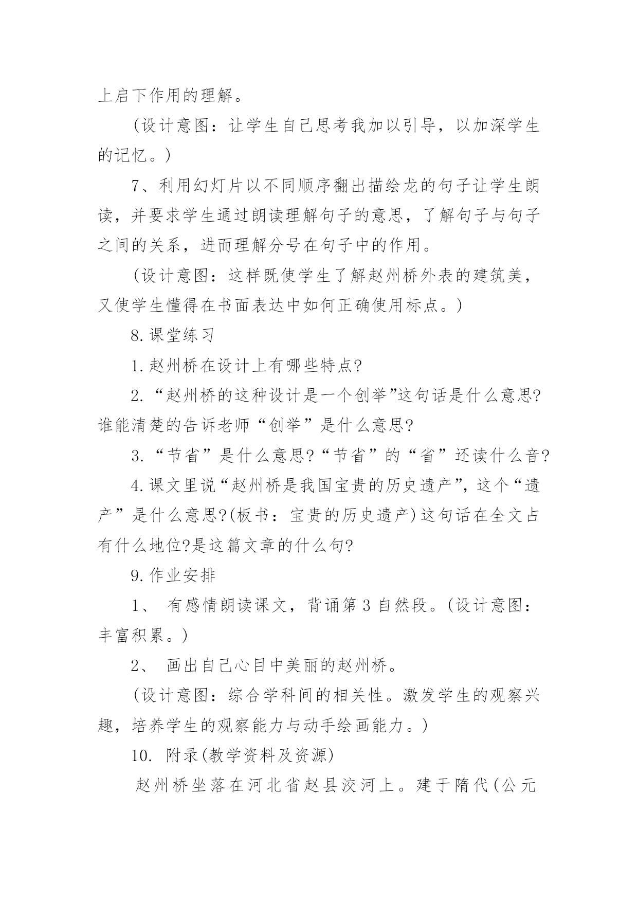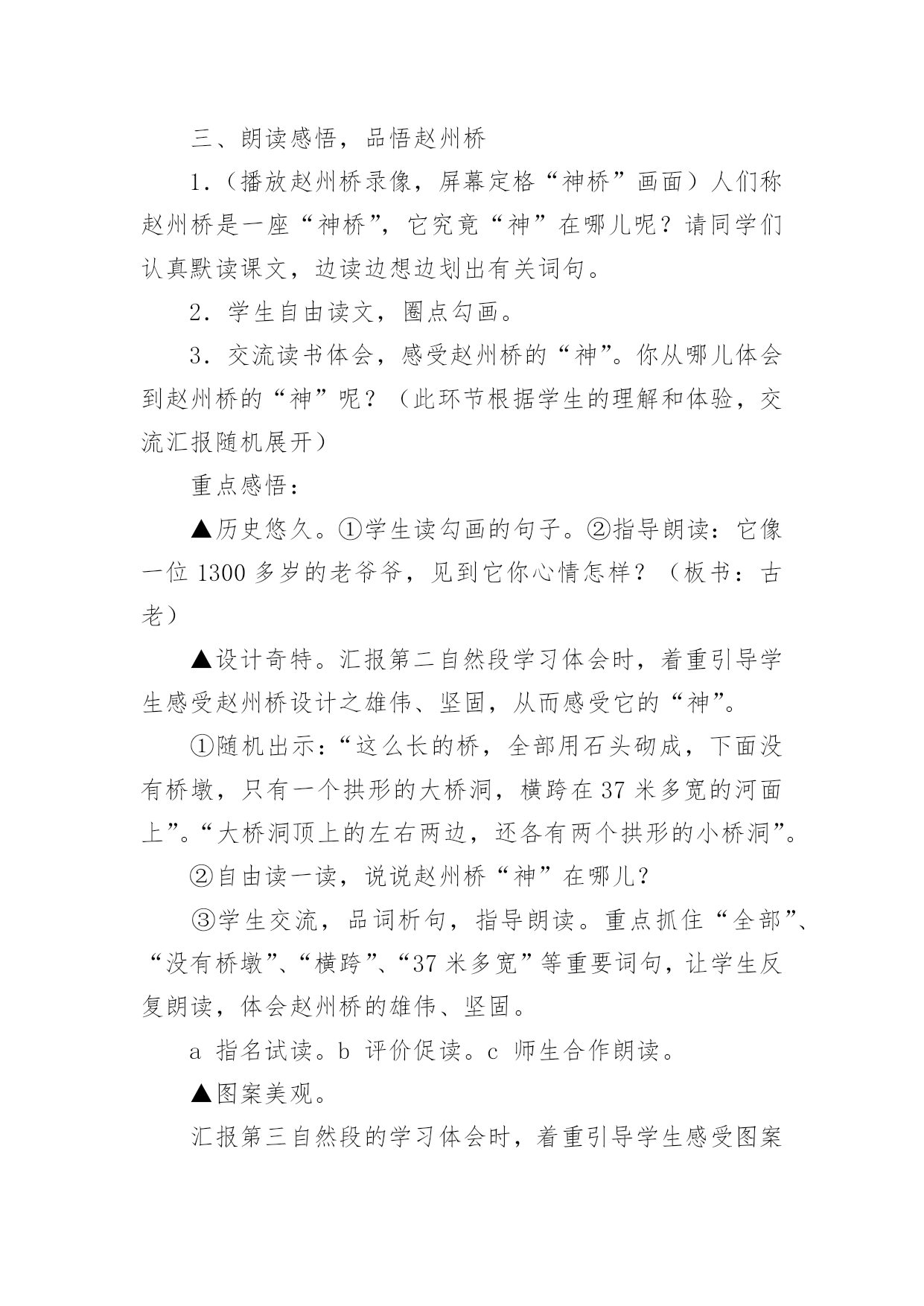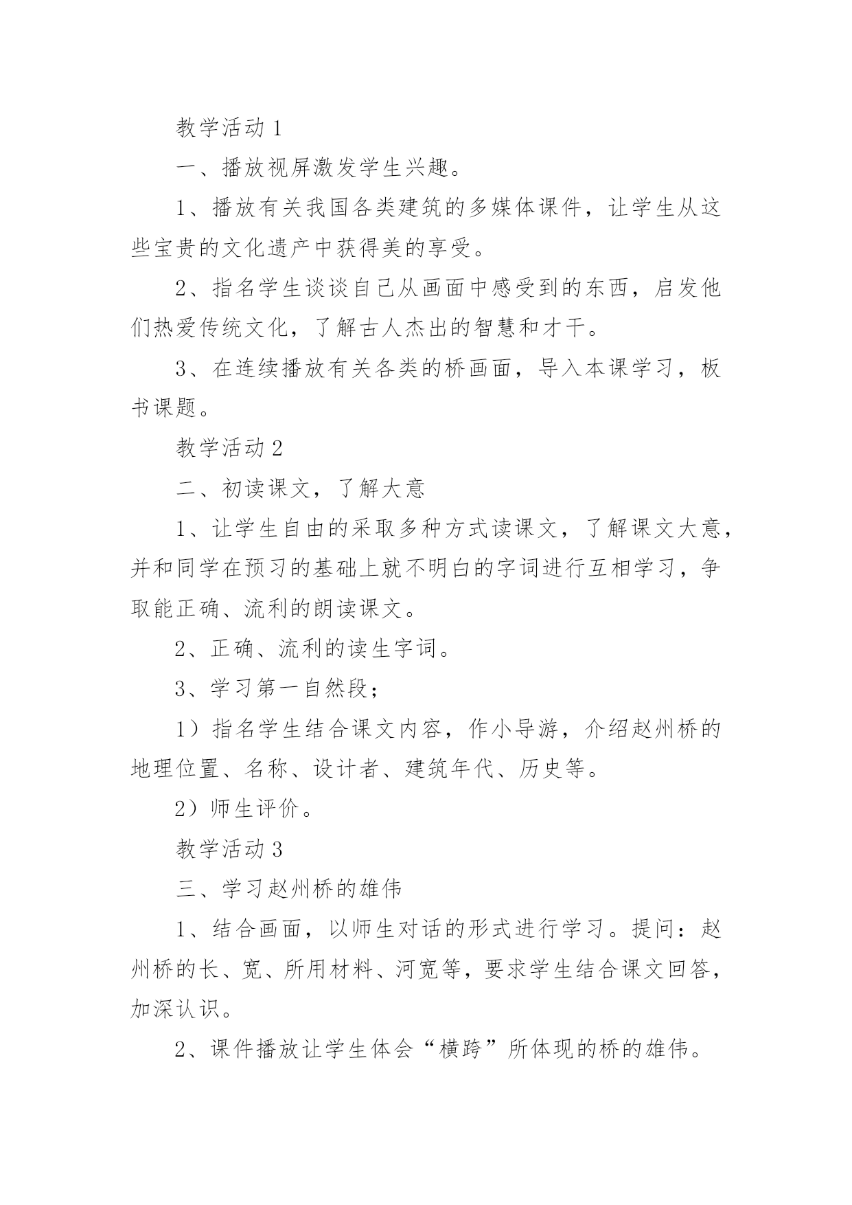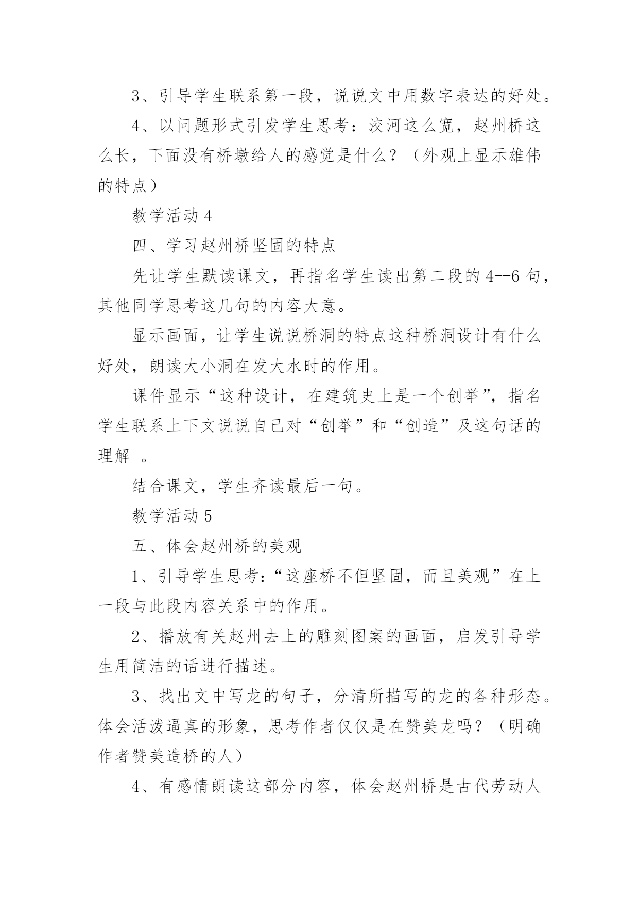 《赵州桥》的教案设计《赵州桥》的教案设计常用(15篇)作为一位杰出的老师,时常会需要准备好教案,借助教案可以恰当地选择和运用教学方法,调动学生学习的积极性。我们应该怎么写教案呢?下面是小编帮大家整理的《赵州桥》的教案设计,希望能够帮助到大家。《赵州桥》的教案设计1教学目标:1.认识10个生字,会写14个生字。能正确读写“雄伟、坚固、美观”等词语。2.正确、流利、有感情地朗读课文,并背诵自己喜欢的段落,积淀语感,积累语言。3.感受赵州桥的神奇美丽,感受古代劳动人民的智慧和才干,激发热爱祖国文化的思想感情。4.在积累语言的同时,学习怎样围绕一个意思写一段话的方法。教学重点:感受赵州桥的神奇美丽,体会作者表达方法。教学难点:理解赵州桥的设计在建桥史上是一个创举。课时安排:两课时(课前布置预习)第一课时:学习生字词,正确流利有感情地朗读课文,感受赵州桥的神奇美丽,夸赵州桥。第二课时:正确抄写词语、背诵相关段落、领悟作者写作方法。第一课时一、创设情境,走近赵州桥1.今天,老师给你们带来了一首河北民歌,请听──(课件播放)这首歌里唱的是一座桥,它的名字叫赵州桥。2.板书:赵州桥(提醒学生注意“州”字三点的写法)。3.齐读课题。二、检查预习,初知赵州桥1.认读生字词语。①自由汇报在预习中碰到的难读记的生字词。②学生相互提醒读音,交流识字办法。③教师相机点拨。④去掉拼音,全班齐读词语。⑤选词填空。选一个、两个或几个说说赵州桥是一座怎样的桥?2.自由试读课文,要求做到:①正确(不添、不漏、不改);②流利。3.检查朗读。(出示句子,学生朗读,教师随机指导)三、朗读感悟,品悟赵州桥1.(播放赵州桥录像,屏幕定格“神桥”画面)人们称赵州桥是一座“神桥”,它究竟“神”在哪儿呢?请同学们认真默读课文,边读边想边划出有关词句。2.学生自由读文,圈点勾画。3.交流读书体会,感受赵州桥的“神”。你从哪儿体会到赵州桥的“神”呢?(此环节根据学生的理解和体验,交流汇报随机展开)重点感悟:▲历史悠久。①学生读勾画的句子。②指导朗读:它像一位1300多岁的老爷爷,见到它你心情怎样?(板书:古老)▲设计奇特。汇报第二自然段学习体会时,着重引导学生感受赵州桥设计之雄伟、坚固,从而感受它的“神”。①随机出示:“这么长的桥,全部用石头砌成,下面没有桥墩,只有一个拱形的大桥洞,横跨在37米多宽的河面上”。“大桥洞顶上的左右两边,还各有两个拱形的小桥洞”。②自由读一读,说说赵州桥“神”在哪儿?③学生交流,品词析句,指导朗读。重点抓住“全部”、“没有桥墩”、“横跨”、“37米多宽”等重要词句,让学生反复朗读,体会赵州桥的雄伟、坚固。a指名试读。b评价促读。c师生合作朗读。▲图案美观。汇报第三自然段的学习体会时,着重引导学生感受图案栩栩如生的特点。①文中描写了哪些精美的.图案?②从“所有的龙似乎都在游动,真像活了一样”这句话入手,启迪学生思考:从哪些字词中感受到龙活了?(缠绕、抵、望、戏)③教师范读,学生闭眼想象画面。④指导个性化朗读。你最喜欢哪一种图案?把它读出来。(在评读中加深学生的独特体验)⑤引导想象:如果你是设计师,你会在栏板上雕刻怎样的龙呢?四、回归整体,夸夸赵州桥赵州桥以其独特的建筑风格闻名中外,它表现了古代劳动人民的智慧和才干,是我国宝贵的历史遗产。学到这儿,你想怎么夸夸赵州桥呢?五、布置作业,宣布下课1.想一想“这座桥不但坚固,而且美观”这句话这样写,好在哪儿呢?2.把自己喜欢的部分背下来。3.搜集赵州桥的其它资料。《赵州桥》的教案设计2一、提问导入(设计意图:以提问的方式引导学生各抒己见,不仅可以自然导入新课,还可以拓宽学生的知识面。)二、初读课文,整体感知1、充分运用电教设施,利用幻灯片展现赵州桥风采。(设计意图:让学生有直观的认识,有利于学生理解课文且充分调动学生学习积极性。)2、范读时给学生留有思考问题。(设计意图:避免学生不认真听讲讲。)三、再读课文,仔细品读1、此环节充分利用电教手段。(设计意图:以使课堂变得活跃、新颖、吸引学生。)2、巧妙提出问题,如:赵州桥的别名一问题采用赵州桥有问题想考考大家的方式提出。(设计意图:令学生感受到自己是在猜谜中学习的。用不同的方式将问题巧妙的提出可避免语文教学中的枯燥感,真正实现轻松学习。)3、课文中出现的多音字,注重在全班同学面前强调以引起学生重视。(设计意图:引起学生重视、并有利于学生牢记。)4、注重对学生进行写作手法的教导,如:第二自然段总写句的运用。(设计意图:帮助学生积累写作经验。)5、使学生通过读的练习,从语言的实践中来体会“既……又……”这一对关联词语的并列关系。(设计意图:避免讲语法术语,使学生更容易接受。利用幻灯片将“既”和“又”后面内容的'位置交换进行读的训练恰到好处。真正做到在读的过程中使学生充