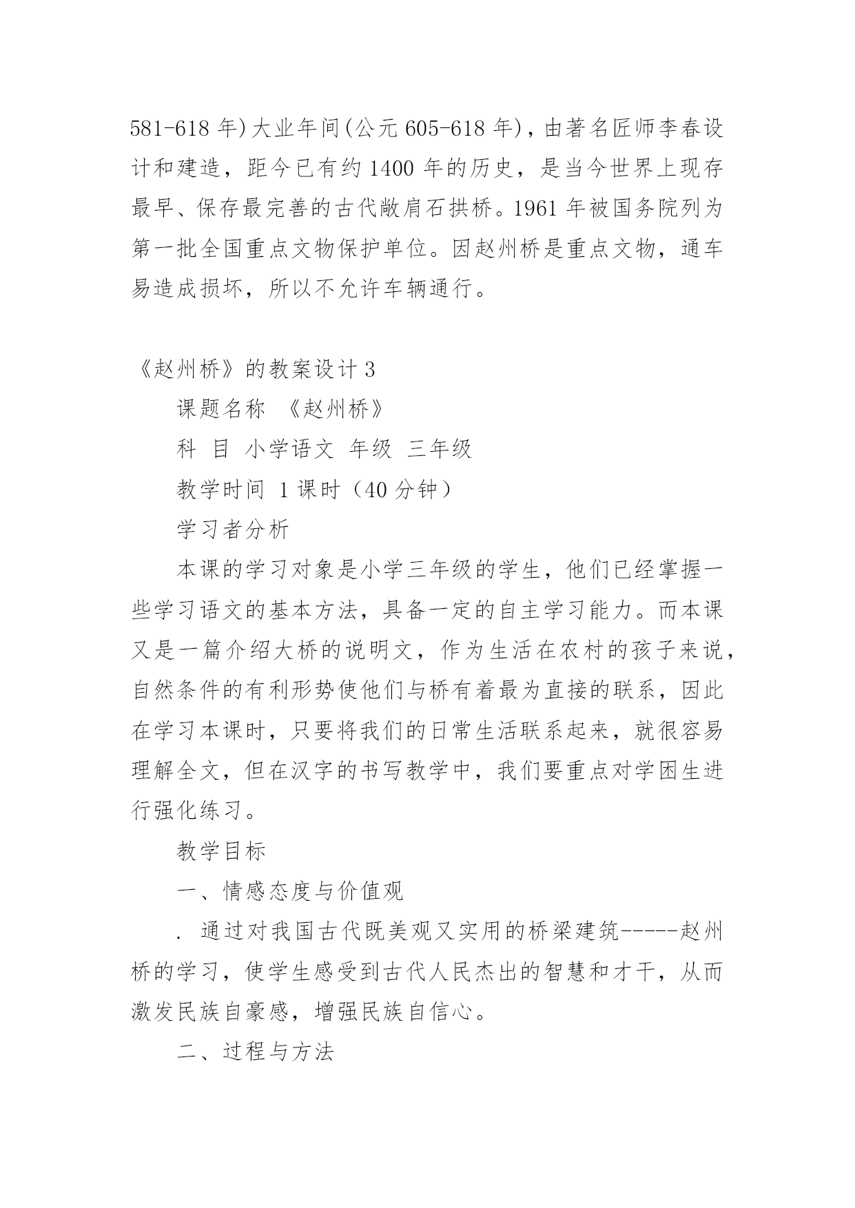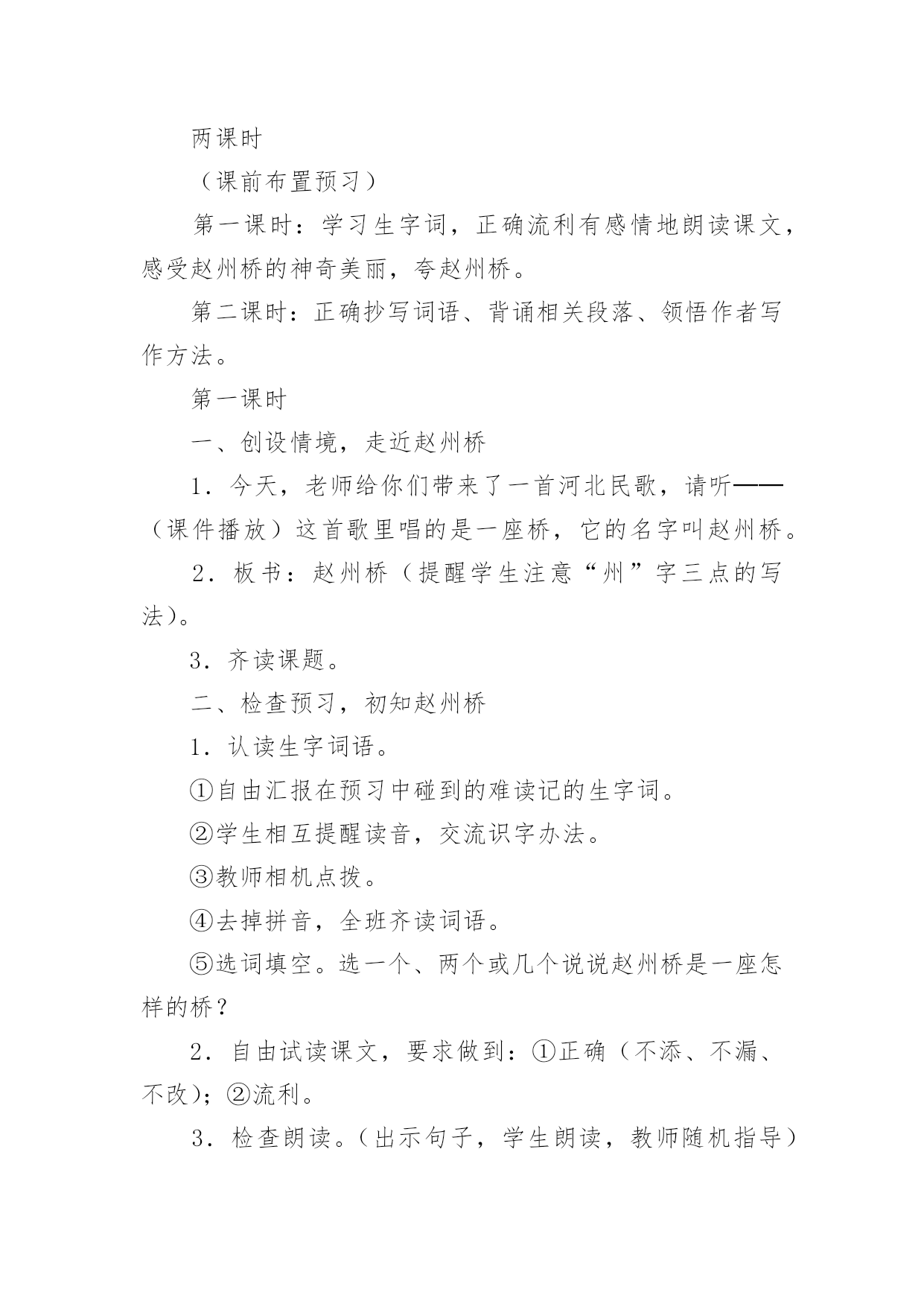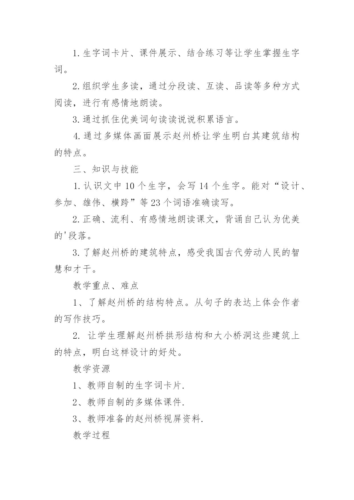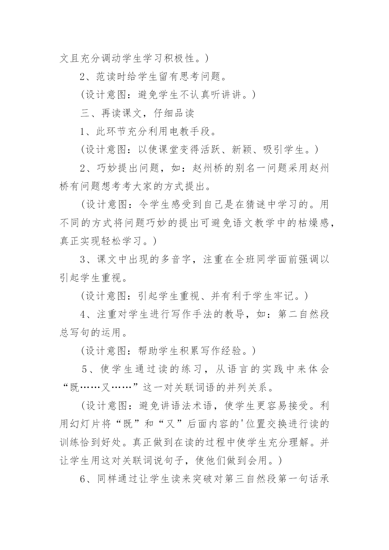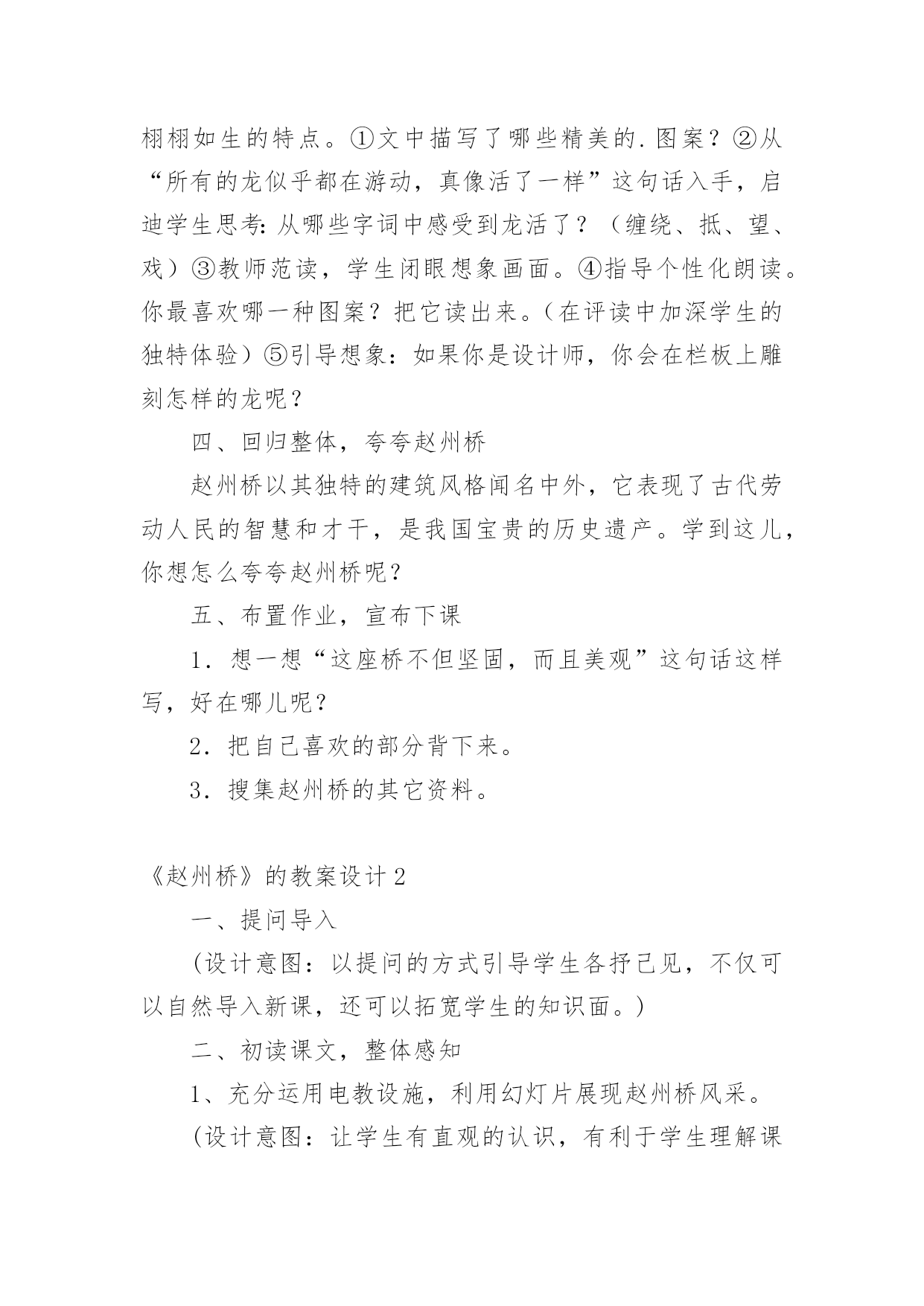 《赵州桥》的教案设计《赵州桥》的教案设计常用(15篇)作为一位杰出的老师,时常会需要准备好教案,借助教案可以恰当地选择和运用教学方法,调动学生学习的积极性。我们应该怎么写教案呢?下面是小编帮大家整理的《赵州桥》的教案设计,希望能够帮助到大家。《赵州桥》的教案设计1教学目标:1.认识10个生字,会写14个生字。能正确读写“雄伟、坚固、美观”等词语。2.正确、流利、有感情地朗读课文,并背诵自己喜欢的段落,积淀语感,积累语言。3.感受赵州桥的神奇美丽,感受古代劳动人民的智慧和才干,激发热爱祖国文化的思想感情。4.在积累语言的同时,学习怎样围绕一个意思写一段话的方法。教学重点:感受赵州桥的神奇美丽,体会作者表达方法。教学难点:理解赵州桥的设计在建桥史上是一个创举。课时安排:两课时(课前布置预习)第一课时:学习生字词,正确流利有感情地朗读课文,感受赵州桥的神奇美丽,夸赵州桥。第二课时:正确抄写词语、背诵相关段落、领悟作者写作方法。第一课时一、创设情境,走近赵州桥1.今天,老师给你们带来了一首河北民歌,请听──(课件播放)这首歌里唱的是一座桥,它的名字叫赵州桥。2.板书:赵州桥(提醒学生注意“州”字三点的写法)。3.齐读课题。二、检查预习,初知赵州桥1.认读生字词语。①自由汇报在预习中碰到的难读记的生字词。②学生相互提醒读音,交流识字办法。③教师相机点拨。④去掉拼音,全班齐读词语。⑤选词填空。选一个、两个或几个说说赵州桥是一座怎样的桥?2.自由试读课文,要求做到:①正确(不添、不漏、不改);②流利。3.检查朗读。(出示句子,学生朗读,教师随机指导)三、朗读感悟,品悟赵州桥1.(播放赵州桥录像,屏幕定格“神桥”画面)人们称赵州桥是一座“神桥”,它究竟“神”在哪儿呢?请同学们认真默读课文,边读边想边划出有关词句。2.学生自由读文,圈点勾画。3.交流读书体会,感受赵州桥的“神”。你从哪儿体会到赵州桥的“神”呢?(此环节根据学生的理解和体验,交流汇报随机展开)重点感悟:▲历史悠久。①学生读勾画的句子。②指导朗读:它像一位1300多岁的老爷爷,见到它你心情怎样?(板书:古老)▲设计奇特。汇报第二自然段学习体会时,着重引导学生感受赵州桥设计之雄伟、坚固,从而感受它的“神”。①随机出示:“这么长的桥,全部用石头砌成,下面没有桥墩,只有一个拱形的大桥洞,横跨在37米多宽的河面上”。“大桥洞顶上的左右两边,还各有两个拱形的小桥洞”。②自由读一读,说说赵州桥“神”在哪儿?③学生交流,品词析句,指导朗读。重点抓住“全部”、“没有桥墩”、“横跨”、“37米多宽”等重要词句,让学生反复朗读,体会赵州桥的雄伟、坚固。a指名试读。b评价促读。c师生合作朗读。▲图案美观。汇报第三自然段的学习体会时,着重引导学生感受图案栩栩如生的特点。①文中描写了哪些精美的.图案?②从“所有的龙似乎都在游动,真像活了一样”这句话入手,启迪学生思考:从哪些字词中感受到龙活了?(缠绕、抵、望、戏)③教师范读,学生闭眼想象画面。④指导个性化朗读。你最喜欢哪一种图案?把它读出来。(在评读中加深学生的独特体验)⑤引导想象:如果你是设计师,你会在栏板上雕刻怎样的龙呢?四、回归整体,夸夸赵州桥赵州桥以其独特的建筑风格闻名中外,它表现了古代劳动人民的智慧和才干,是我国宝贵的历史遗产。学到这儿,你想怎么夸夸赵州桥呢?五、布置作业,宣布下课1.想一想“这座桥不但坚固,而且美观”这句话这样写,好在哪儿呢?2.把自己喜欢的部分背下来。3.搜集赵州桥的其它资料。《赵州桥》的教案设计2一、提问导入(设计意图:以提问的方式引导学生各抒己见,不仅可以自然导入新课,还可以拓宽学生的知识面。)二、初读课文,整体感知1、充分运用电教设施,利用幻灯片展现赵州桥风采。(设计意图:让学生有直观的认识,有利于学生理解课文且充分调动学生学习积极性。)2、范读时给学生留有思考问题。(设计意图:避免学生不认真听讲讲。)三、再读课文,仔细品读1、此环节充分利用电教手段。(设计意图:以使课堂变得活跃、新颖、吸引学生。)2、巧妙提出问题,如:赵州桥的别名一问题采用赵州桥有问题想考考大家的方式提出。(设计意图:令学生感受到自己是在猜谜中学习的。用不同的方式将问题巧妙的提出可避免语文教学中的枯燥感,真正实现轻松学习。)3、课文中出现的多音字,注重在全班同学面前强调以引起学生重视。(设计意图:引起学生重视、并有利于学生牢记。)4、注重对学生进行写作手法的教导,如:第二自然段总写句的运用。(设计意图:帮助学生积累写作经验。)5、使学生通过读的练习,从语言的实践中来体会“既……又……”这一对关联词语的并列关系。(设计意图:避免讲语法术语,使学生更容易接受。利用幻灯片将“既”和“又”后面内容的'位置交换进行读的训练恰到好处。真正做到在读的过程中使学生充