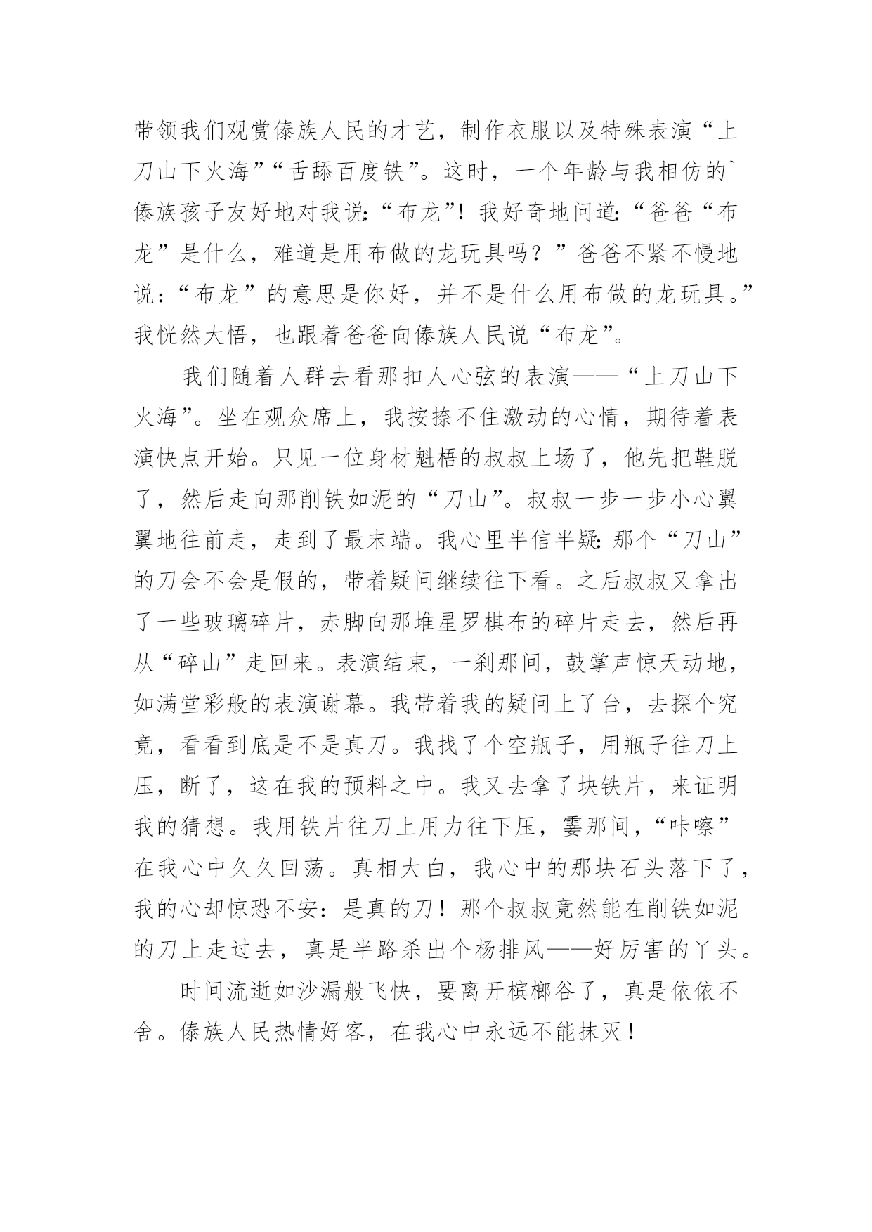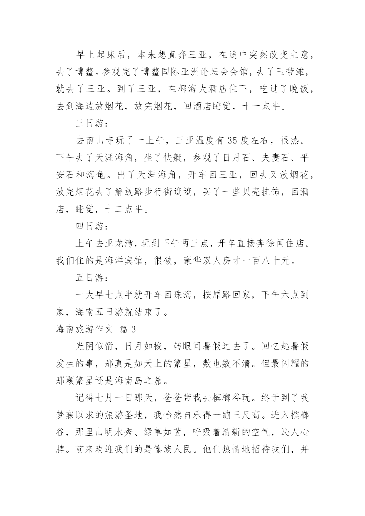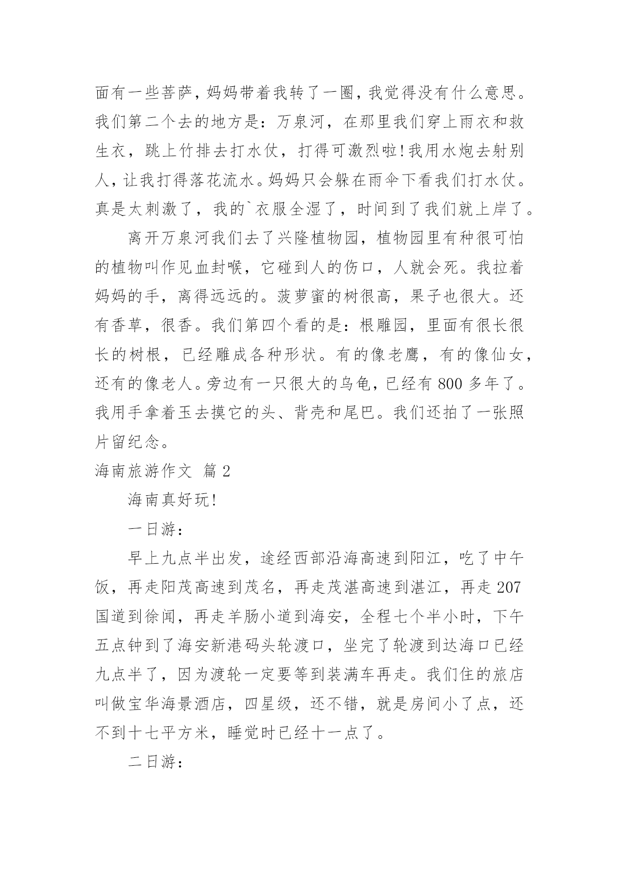 海南旅游作文【推荐】海南旅游作文3篇在生活、工作和学习中,大家都经常接触到作文吧,写作文是培养人们的观察力、联想力、想象力、思考力和记忆力的重要手段。那么问题来了,到底应如何写一篇优秀的作文呢?下面是小编为大家整理的海南旅游作文3篇,仅供参考,大家一起来看看吧。海南旅游作文篇17月6日,我和妈妈去海南。我们等了很长时间,汽车才来。在路上,我们经过了舟山跨海大桥。到了宁波飞机场,已经是8:00点多了。我们在十点多才登记,飞机要起飞的时候,我感觉身体在向后倒,还感觉耳朵隆隆响,很难受,妈妈叫我使劲嚼口香糖。后来,空姐送来了饮料和点心,我喝了两杯椰子汁。飞机在高空飞行的时候,窗外一片黑暗。飞机要飞行两个小时20分钟,我睡了一觉。等我醒来飞机飞到了海南上空了。飞机要降落的时候,我感觉身体在向前倒,还感觉耳朵很难受。随着一阵震动,飞机降落了。这时,已经是凌晨3点了。我们乘上大巴车,到了宾馆。后来,我们睡觉了。第二天,我们吃的早饭很差。昨天,宾馆也很差,居然在玻璃窗上爬着一只壁虎。吃完早饭后,我们乘上汽车,就出发了。在汽车上,妈妈给我涂了防晒霜。下车以后,我和妈妈首先是洗了手。后来,我们坐上电瓶车去看文笔峰,里面有一些菩萨,妈妈带着我转了一圈,我觉得没有什么意思。我们第二个去的地方是:万泉河,在那里我们穿上雨衣和救生衣,跳上竹排去打水仗,打得可激烈啦!我用水炮去射别人,让我打得落花流水。妈妈只会躲在雨伞下看我们打水仗。真是太刺激了,我的`衣服全湿了,时间到了我们就上岸了。离开万泉河我们去了兴隆植物园,植物园里有种很可怕的植物叫作见血封喉,它碰到人的伤口,人就会死。我拉着妈妈的手,离得远远的。菠萝蜜的树很高,果子也很大。还有香草,很香。我们第四个看的是:根雕园,里面有很长很长的树根,已经雕成各种形状。有的像老鹰,有的像仙女,还有的像老人。旁边有一只很大的乌龟,已经有800多年了。我用手拿着玉去摸它的头、背壳和尾巴。我们还拍了一张照片留纪念。海南旅游作文篇2海南真好玩!一日游:早上九点半出发,途经西部沿海高速到阳江,吃了中午饭,再走阳茂高速到茂名,再走茂湛高速到湛江,再走207国道到徐闻,再走羊肠小道到海安,全程七个半小时,下午五点钟到了海安新港码头轮渡口,坐完了轮渡到达海口已经九点半了,因为渡轮一定要等到装满车再走。我们住的旅店叫做宝华海景酒店,四星级,还不错,就是房间小了点,还不到十七平方米,睡觉时已经十一点了。二日游:早上起床后,本来想直奔三亚,在途中突然改变主意,去了博鳌。参观完了博鳌国际亚洲论坛会会馆,去了玉带滩,就去了三亚。到了三亚,在椰海大酒店住下,吃过了晚饭,去到海边放烟花,放完烟花,回酒店睡觉,十一点半。三日游:去南山寺玩了一上午,三亚温度有35度左右,很热。下午去了天涯海角,坐了快艇,参观了日月石、夫妻石、平安石和海龟。出了天涯海角,开车回三亚,回去又放烟花,放完烟花去了解放路步行街逛逛,买了一些贝壳挂饰,回酒店,睡觉,十二点半。四日游:上午去亚龙湾,玩到下午两三点,开车直接奔徐闻住店。我们住的是海洋宾馆,很破,豪华双人房才一百八十元。五日游:一大早七点半就开车回珠海,按原路回家,下午六点到家,海南五日游就结束了。海南旅游作文篇3光阴似箭,日月如梭,转眼间暑假过去了。回忆起暑假发生的事,那真是如天上的繁星,数也数不清。但最闪耀的那颗繁星还是海南岛之旅。记得七月一日那天,爸爸带我去槟榔谷玩。终于到了我梦寐以求的旅游圣地,我怡然自乐得一蹦三尺高。进入槟榔谷,那里山明水秀、绿草如茵,呼吸着清新的空气,沁人心脾。前来欢迎我们的是傣族人民。他们热情地招待我们,并带领我们观赏傣族人民的才艺,制作衣服以及特殊表演“上刀山下火海”“舌舔百度铁”。这时,一个年龄与我相仿的`傣族孩子友好地对我说:“布龙”!我好奇地问道:“爸爸“布龙”是什么,难道是用布做的龙玩具吗?”爸爸不紧不慢地说:“布龙”的意思是你好,并不是什么用布做的龙玩具。”我恍然大悟,也跟着爸爸向傣族人民说“布龙”。我们随着人群去看那扣人心弦的表演——“上刀山下火海”。坐在观众席上,我按捺不住激动的心情,期待着表演快点开始。只见一位身材魁梧的叔叔上场了,他先把鞋脱了,然后走向那削铁如泥的“刀山”。叔叔一步一步小心翼翼地往前走,走到了最末端。我心里半信半疑:那个“刀山”的刀会不会是假的,带着疑问继续往下看。之后叔叔又拿出了一些玻璃碎片,赤脚向那堆星罗棋布的碎片走去,然后再从“碎山”走回来。表演结束,一刹那间,鼓掌声惊天动地,如满堂彩般的表演谢幕。我带着我的疑问上了台,去探个究竟,看看到底是不是真刀。我找了个空瓶子,用瓶子往刀上压,断了,这在我的预料之中。我又去拿了块铁片,来证明我的猜想。我用铁片往刀上用力往下压,霎那间,“咔嚓”在我心中久久回荡。真相大白,我心中的那块石头落下了,
