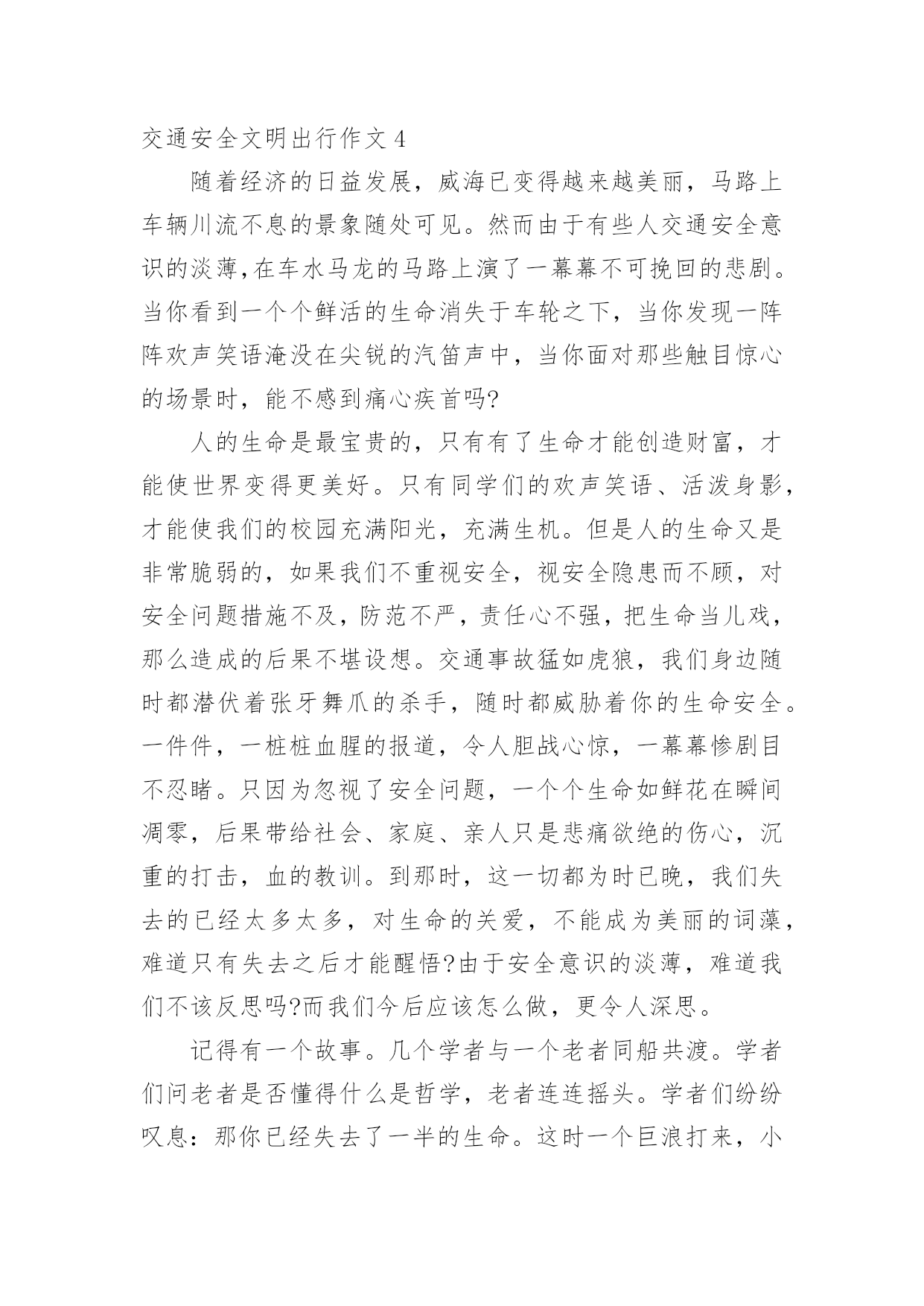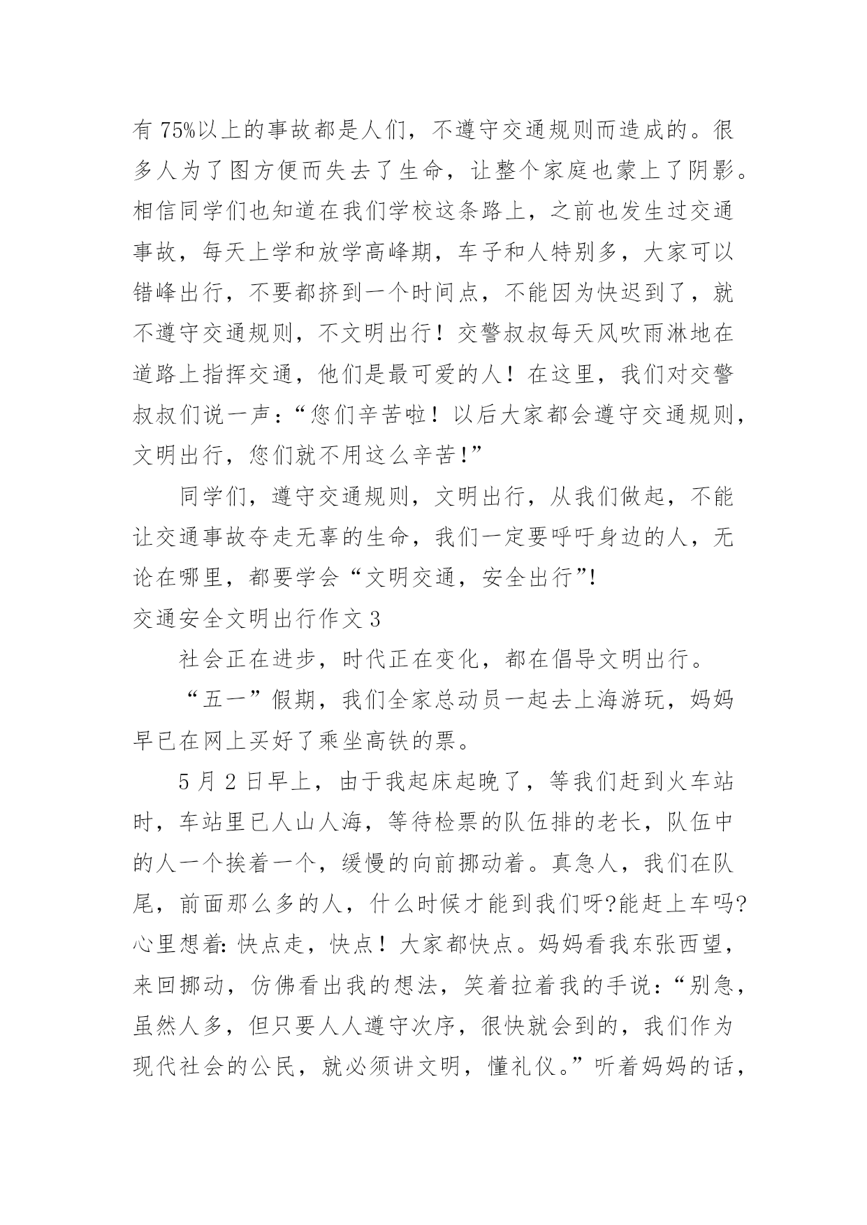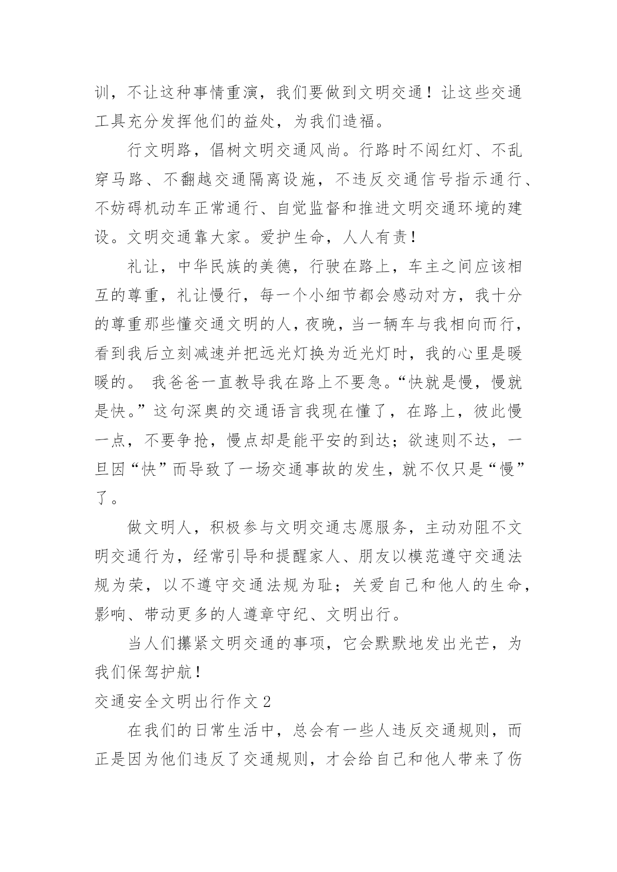 交通安全文明出行作文交通安全文明出行作文在平凡的学习、工作、生活中,大家最不陌生的就是作文了吧,写作文是培养人们的观察力、联想力、想象力、思考力和记忆力的重要手段。你写作文时总是无从下笔?下面是小编帮大家整理的交通安全文明出行作文,仅供参考,欢迎大家阅读。交通安全文明出行作文1站在发生事故的路旁,看见人心惶惶,面对惨不忍睹的车厢,我的心声在回荡……为什么!为什么许多人总是无法醒悟,一直和别人争抢这一秒甚至半秒,而让生命都失去色彩,为什么就不肯退让一丁点呢,退一步风平浪静呀,让他几秒又何妨。生命是短暂的,不要失去后才懂得珍惜,只会让亲人落下无力的泪……去年全世界交通事故死亡人数为五十万人,其中,中国交通事故死亡人数为十点四万人。交通是为“人”服务的,而交通事故的发生又让人们清楚地看到了“人”对交通法规忽视的结果。交通是为人造福的,但却又带来这么多事故,它让无数的家庭破裂,带来了无数的妻离子散,我们能够说它是罪恶的吗?维护交通安全,关爱生命久远。我们面对这惊人的数字难道只有“兴叹”吗,知错就改,善莫大焉,我们要吸取教训,不让这种事情重演,我们要做到文明交通!让这些交通工具充分发挥他们的益处,为我们造福。行文明路,倡树文明交通风尚。行路时不闯红灯、不乱穿马路、不翻越交通隔离设施,不违反交通信号指示通行、不妨碍机动车正常通行、自觉监督和推进文明交通环境的建设。文明交通靠大家。爱护生命,人人有责!礼让,中华民族的美德,行驶在路上,车主之间应该相互的尊重,礼让慢行,每一个小细节都会感动对方,我十分的尊重那些懂交通文明的人,夜晚,当一辆车与我相向而行,看到我后立刻减速并把远光灯换为近光灯时,我的心里是暖暖的。我爸爸一直教导我在路上不要急。“快就是慢,慢就是快。”这句深奥的交通语言我现在懂了,在路上,彼此慢一点,不要争抢,慢点却是能平安的到达;欲速则不达,一旦因“快”而导致了一场交通事故的发生,就不仅只是“慢”了。做文明人,积极参与文明交通志愿服务,主动劝阻不文明交通行为,经常引导和提醒家人、朋友以模范遵守交通法规为荣,以不遵守交通法规为耻;关爱自己和他人的生命,影响、带动更多的人遵章守纪、文明出行。当人们攥紧文明交通的事项,它会默默地发出光芒,为我们保驾护航!交通安全文明出行作文2在我们的日常生活中,总会有一些人违反交通规则,而正是因为他们违反了交通规则,才会给自己和他人带来了伤害。想一想,当你走在马路上的`时候,有没有看见有人在打闹?有人在边走边看书?或者,有人边走边听歌、玩手机,横穿马路,不走斑马线呢?正是因为这些人的不良行为,让我们处在未知的危险当中。所以,请大家一定要遵守交规,安全文明出行,做到以下几点:第一、我们走路的时候,过马路要走人行道,应该靠道路右边行走。走路时,注意力要集中,不能东张西望;不能边走边看书;更不能横穿马路或在路上嬉戏打闹。有的同学放学后在学校门口打闹,在行驶缓慢的车辆中穿梭,不要以为车速不快就没关系,其实是很危险的。因为驾驶员在车上有“视线死角”,要是有人在驾驶员眼睛看不见的“视线死角”穿行,很容易造成车祸。第二、乘车的时候,要等车停稳了才能上车或下车;坐在车上的时候,不能把身体的任何部分伸到窗外去,更不能往车窗外面扔垃圾和其他物品。有些同学上学和放学时是坐电瓶车的,一定要记得戴上头盔,并紧紧抱住大人的腰,以免急刹车摔倒。另外别忘记提醒自己的亲人,骑车出行一定要戴好头盔。骑车的时候,必须靠右走,车速不能过快,不能单手骑车,更不能双手离车把、逆行和骑“英雄车”。自行车的后座是不能带人的,骑车拐弯时要伸手示意。最后还要注意的就是天气,在雷雨、暴雨等恶劣的天气下,最好不要出行,很可能会有滑倒的危险。在20xx年,我国一共发生道路交通事故21万多起,造成62000多人死亡,237000多人受伤。据交通部门统计,有75%以上的事故都是人们,不遵守交通规则而造成的。很多人为了图方便而失去了生命,让整个家庭也蒙上了阴影。相信同学们也知道在我们学校这条路上,之前也发生过交通事故,每天上学和放学高峰期,车子和人特别多,大家可以错峰出行,不要都挤到一个时间点,不能因为快迟到了,就不遵守交通规则,不文明出行!交警叔叔每天风吹雨淋地在道路上指挥交通,他们是最可爱的人!在这里,我们对交警叔叔们说一声:“您们辛苦啦!以后大家都会遵守交通规则,文明出行,您们就不用这么辛苦!”同学们,遵守交通规则,文明出行,从我们做起,不能让交通事故夺走无辜的生命,我们一定要呼吁身边的人,无论在哪里,都要学会“文明交通,安全出行”!交通安全文明出行作文3社会正在进步,时代正在变化,都在倡导文明出行。“五一”假期,我们全家总动员一起去上海游玩,妈妈早已在网上买好了乘坐高铁的票。5月2日早上,由于我起床起晚了,等我们赶到火车站时,车站里已人山人海,等待检票