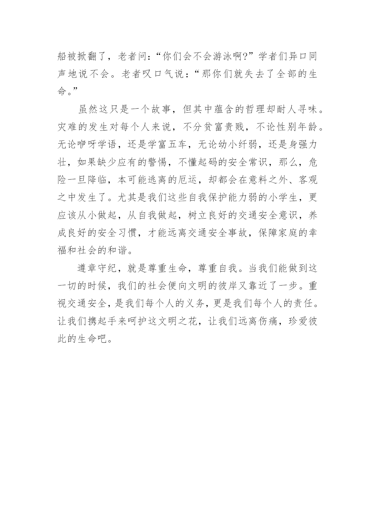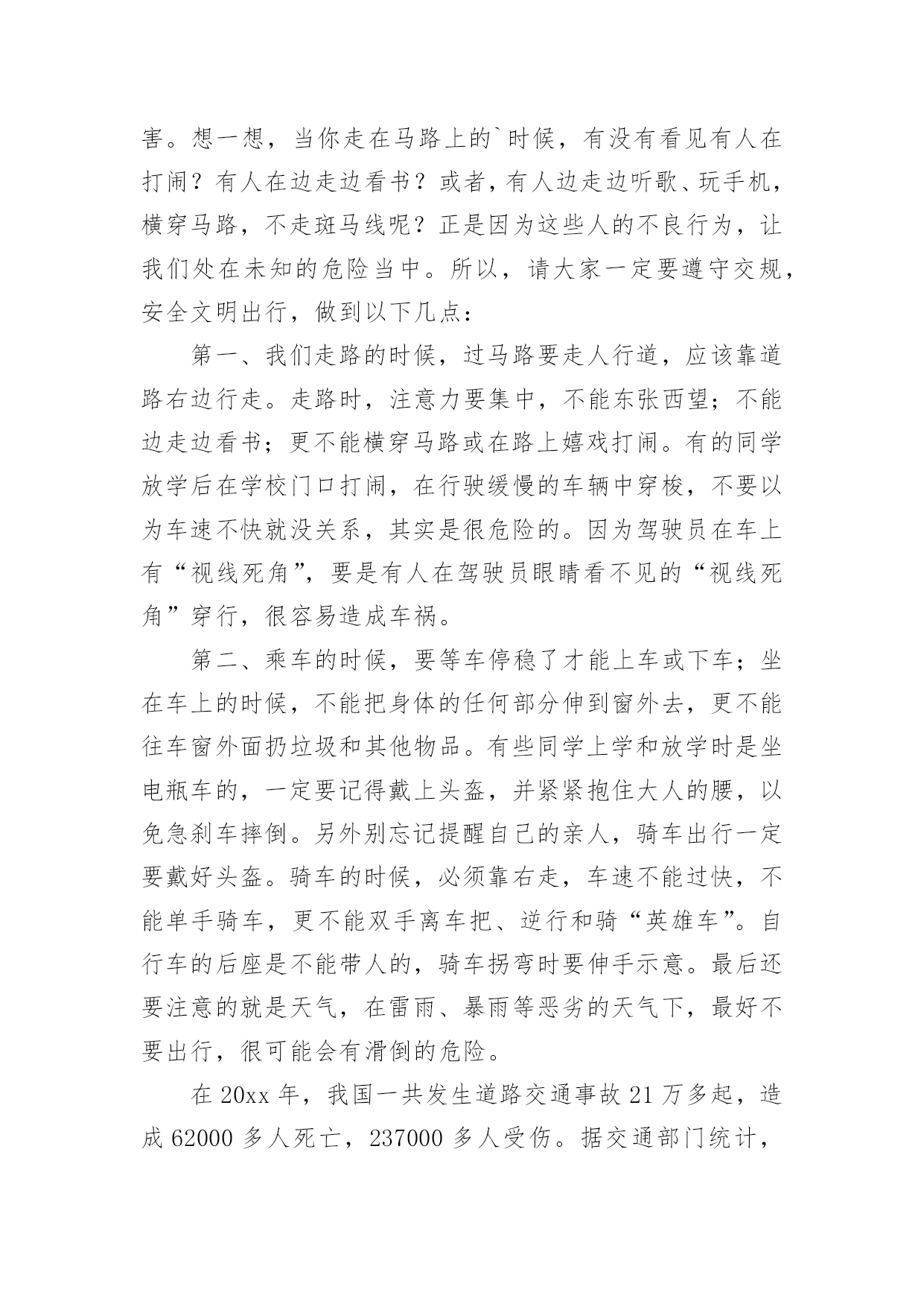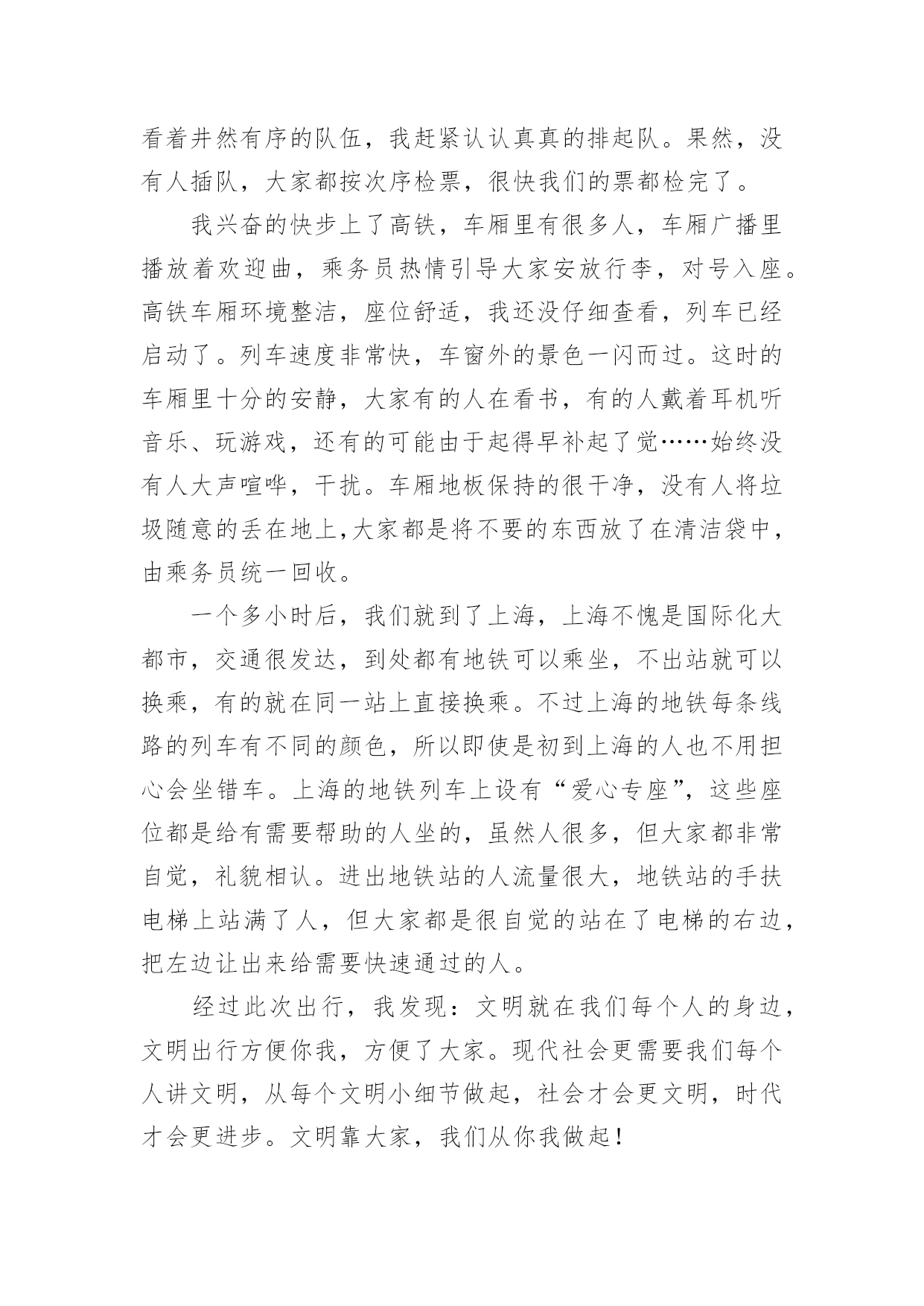 交通安全文明出行作文交通安全文明出行作文在平凡的学习、工作、生活中,大家最不陌生的就是作文了吧,写作文是培养人们的观察力、联想力、想象力、思考力和记忆力的重要手段。你写作文时总是无从下笔?下面是小编帮大家整理的交通安全文明出行作文,仅供参考,欢迎大家阅读。交通安全文明出行作文1站在发生事故的路旁,看见人心惶惶,面对惨不忍睹的车厢,我的心声在回荡……为什么!为什么许多人总是无法醒悟,一直和别人争抢这一秒甚至半秒,而让生命都失去色彩,为什么就不肯退让一丁点呢,退一步风平浪静呀,让他几秒又何妨。生命是短暂的,不要失去后才懂得珍惜,只会让亲人落下无力的泪……去年全世界交通事故死亡人数为五十万人,其中,中国交通事故死亡人数为十点四万人。交通是为“人”服务的,而交通事故的发生又让人们清楚地看到了“人”对交通法规忽视的结果。交通是为人造福的,但却又带来这么多事故,它让无数的家庭破裂,带来了无数的妻离子散,我们能够说它是罪恶的吗?维护交通安全,关爱生命久远。我们面对这惊人的数字难道只有“兴叹”吗,知错就改,善莫大焉,我们要吸取教训,不让这种事情重演,我们要做到文明交通!让这些交通工具充分发挥他们的益处,为我们造福。行文明路,倡树文明交通风尚。行路时不闯红灯、不乱穿马路、不翻越交通隔离设施,不违反交通信号指示通行、不妨碍机动车正常通行、自觉监督和推进文明交通环境的建设。文明交通靠大家。爱护生命,人人有责!礼让,中华民族的美德,行驶在路上,车主之间应该相互的尊重,礼让慢行,每一个小细节都会感动对方,我十分的尊重那些懂交通文明的人,夜晚,当一辆车与我相向而行,看到我后立刻减速并把远光灯换为近光灯时,我的心里是暖暖的。我爸爸一直教导我在路上不要急。“快就是慢,慢就是快。”这句深奥的交通语言我现在懂了,在路上,彼此慢一点,不要争抢,慢点却是能平安的到达;欲速则不达,一旦因“快”而导致了一场交通事故的发生,就不仅只是“慢”了。做文明人,积极参与文明交通志愿服务,主动劝阻不文明交通行为,经常引导和提醒家人、朋友以模范遵守交通法规为荣,以不遵守交通法规为耻;关爱自己和他人的生命,影响、带动更多的人遵章守纪、文明出行。当人们攥紧文明交通的事项,它会默默地发出光芒,为我们保驾护航!交通安全文明出行作文2在我们的日常生活中,总会有一些人违反交通规则,而正是因为他们违反了交通规则,才会给自己和他人带来了伤害。想一想,当你走在马路上的`时候,有没有看见有人在打闹?有人在边走边看书?或者,有人边走边听歌、玩手机,横穿马路,不走斑马线呢?正是因为这些人的不良行为,让我们处在未知的危险当中。所以,请大家一定要遵守交规,安全文明出行,做到以下几点:第一、我们走路的时候,过马路要走人行道,应该靠道路右边行走。走路时,注意力要集中,不能东张西望;不能边走边看书;更不能横穿马路或在路上嬉戏打闹。有的同学放学后在学校门口打闹,在行驶缓慢的车辆中穿梭,不要以为车速不快就没关系,其实是很危险的。因为驾驶员在车上有“视线死角”,要是有人在驾驶员眼睛看不见的“视线死角”穿行,很容易造成车祸。第二、乘车的时候,要等车停稳了才能上车或下车;坐在车上的时候,不能把身体的任何部分伸到窗外去,更不能往车窗外面扔垃圾和其他物品。有些同学上学和放学时是坐电瓶车的,一定要记得戴上头盔,并紧紧抱住大人的腰,以免急刹车摔倒。另外别忘记提醒自己的亲人,骑车出行一定要戴好头盔。骑车的时候,必须靠右走,车速不能过快,不能单手骑车,更不能双手离车把、逆行和骑“英雄车”。自行车的后座是不能带人的,骑车拐弯时要伸手示意。最后还要注意的就是天气,在雷雨、暴雨等恶劣的天气下,最好不要出行,很可能会有滑倒的危险。在20xx年,我国一共发生道路交通事故21万多起,造成62000多人死亡,237000多人受伤。据交通部门统计,有75%以上的事故都是人们,不遵守交通规则而造成的。很多人为了图方便而失去了生命,让整个家庭也蒙上了阴影。相信同学们也知道在我们学校这条路上,之前也发生过交通事故,每天上学和放学高峰期,车子和人特别多,大家可以错峰出行,不要都挤到一个时间点,不能因为快迟到了,就不遵守交通规则,不文明出行!交警叔叔每天风吹雨淋地在道路上指挥交通,他们是最可爱的人!在这里,我们对交警叔叔们说一声:“您们辛苦啦!以后大家都会遵守交通规则,文明出行,您们就不用这么辛苦!”同学们,遵守交通规则,文明出行,从我们做起,不能让交通事故夺走无辜的生命,我们一定要呼吁身边的人,无论在哪里,都要学会“文明交通,安全出行”!交通安全文明出行作文3社会正在进步,时代正在变化,都在倡导文明出行。“五一”假期,我们全家总动员一起去上海游玩,妈妈早已在网上买好了乘坐高铁的票。5月2日早上,由于我起床起晚了,等我们赶到火车站时,车站里已人山人海,等待检票