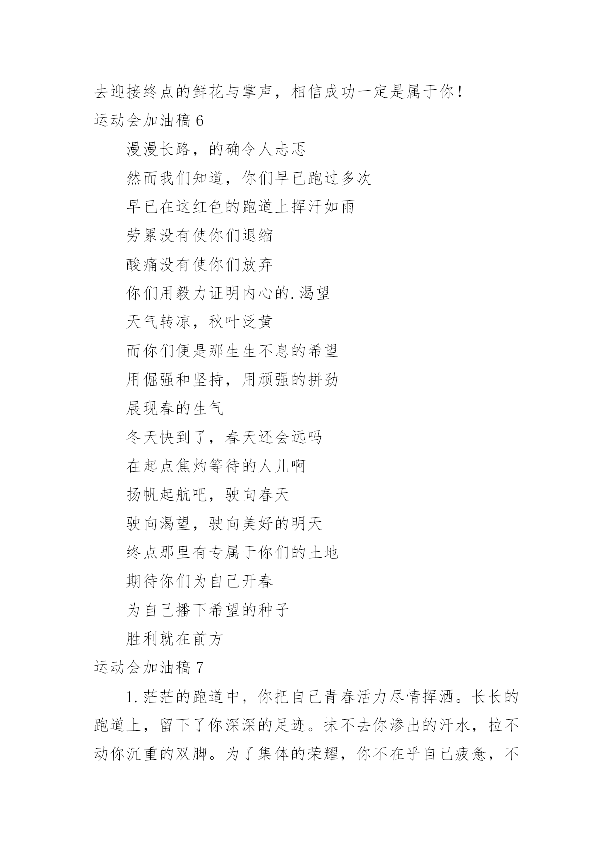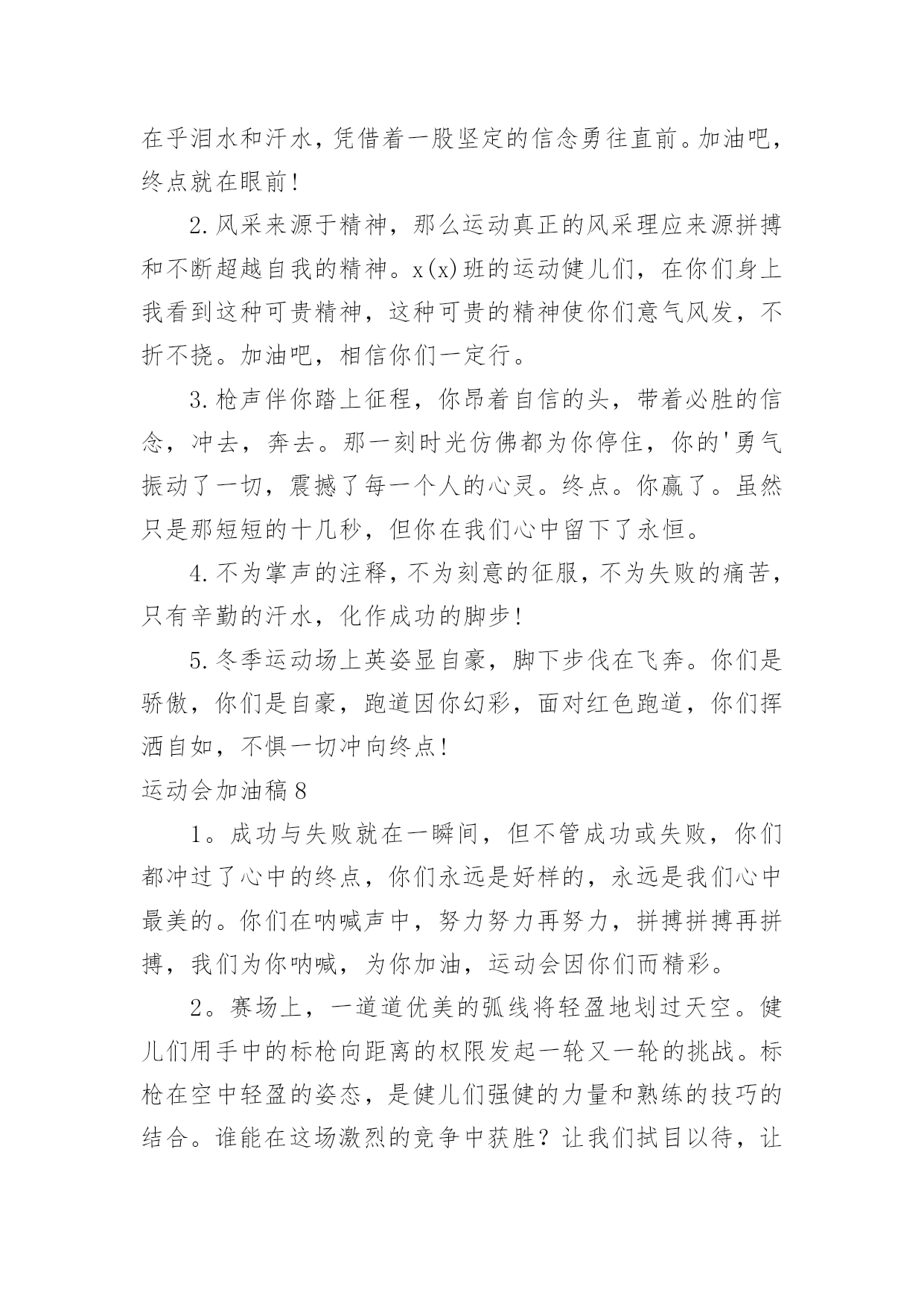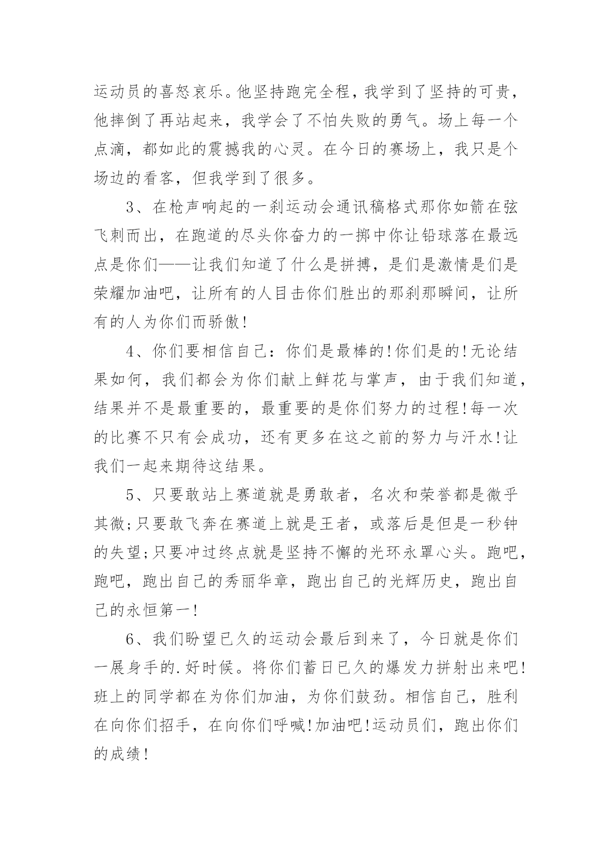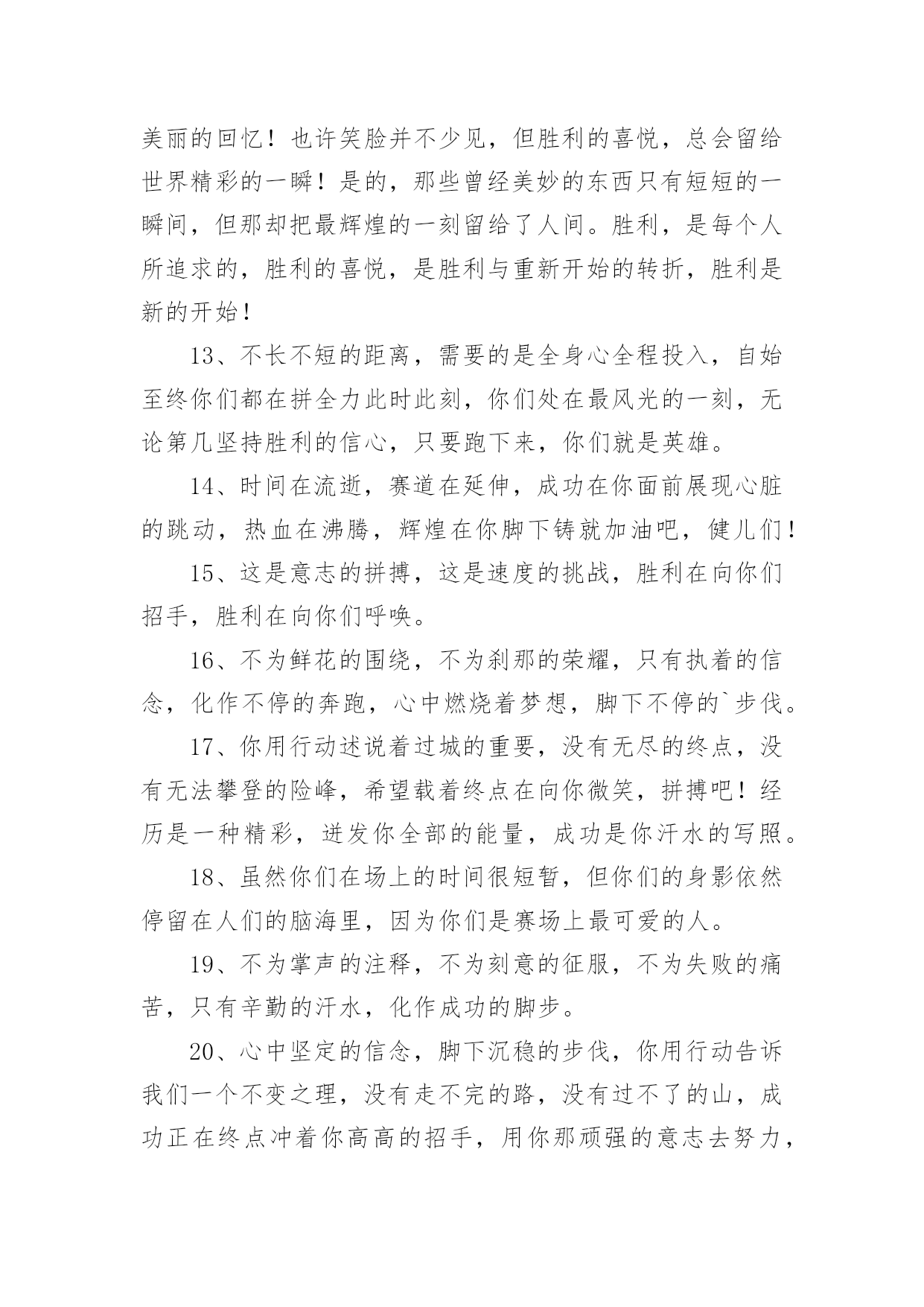 运动会加油稿运动会加油稿在不断进步的时代,我们可以使用加油稿的机会越来越多,借助加油稿可以激励他人的士气。你所见过的加油稿是什么样的呢?下面是小编精心整理的运动会加油稿,仅供参考,希望能够帮助到大家。运动会加油稿1蔚蓝的天空下,有你矫健的身影,热闹的操场上,有你坚定的步伐,美丽的.鲜花后,有你辛勤的汗水,我们的喝彩中,有你的自豪与骄傲!体育健儿们,我们知道你们的辛勤,我们了解你们的辛苦。加油吧!不论你是成功还是失败,我们都是你们坚强的后盾。胜也爱你,败也爱你,我们永远支持你,你们永远是“最特别的运动会加油稿21、年轻的我们自信飞扬,青春的气息如同出生的朝阳,蓬勃的力量如同阳光的挥洒。此时此刻,跑道便是我们精彩的舞台,声声加油便是我们的奖项!论何成功,谈何荣辱,心中的信念只有一个:拼搏!2、在今日的赛场上运动会通讯稿简短,我只是个场边的看客。我用眼睛见证了赛场上的是非成败,用心灵感受了运动员的喜怒哀乐。他坚持跑完全程,我学到了坚持的可贵,他摔倒了再站起来,我学会了不怕失败的勇气。场上每一个点滴,都如此的震撼我的心灵。在今日的赛场上,我只是个场边的看客,但我学到了很多。3、在枪声响起的一刹运动会通讯稿格式那你如箭在弦飞刺而出,在跑道的尽头你奋力的一掷中你让铅球落在最远点是你们——让我们知道了什么是拼搏,是们是激情是们是荣耀加油吧,让所有的人目击你们胜出的那刹那瞬间,让所有的人为你们而骄傲!4、你们要相信自己:你们是最棒的!你们是的!无论结果如何,我们都会为你们献上鲜花与掌声,由于我们知道,结果并不是最重要的,最重要的是你们努力的过程!每一次的比赛不只有会成功,还有更多在这之前的努力与汗水!让我们一起来期待这结果。5、只要敢站上赛道就是勇敢者,名次和荣誉都是微乎其微;只要敢飞奔在赛道上就是王者,或落后是但是一秒钟的失望;只要冲过终点就是坚持不懈的光环永罩心头。跑吧,跑吧,跑出自己的秀丽华章,跑出自己的光辉历史,跑出自己的永恒第一!6、我们盼望已久的运动会最后到来了,今日就是你们一展身手的.好时候。将你们蓄日已久的爆发力拼射出来吧!班上的同学都在为你们加油,为你们鼓劲。相信自己,胜利在向你们招手,在向你们呼喊!加油吧!运动员们,跑出你们的成绩!7、我们拥有同一个梦想,我们怀着同样炽热的心,我们争取“更快、更高、更强”,我们同喊“友谊第一,比赛第二。”我们是一个平凡而又独特的群众,我们相信,有梦就有远方,有付出就有期望——这就是勇往直前的八年(7)班,一个美丽温暖的班级,每一个成员都为此而自豪,加油吧!八年(7)班。加油吧!运动员们。赛出水平,赛出风格,让我们一齐努力吧!8、青春的你我致运动员青春的你我,蓝天下的未来。不需要白色的苍白;不需要褐色的无奈;我们的生命需要精彩。青春的你我,海洋中的风帆。不畏惧波涛的汹涌;不害怕呼啸的海风;我们的生命需要拼搏。飘扬的旗帜,高远的理想,深藏在你我的心中。别再犹豫,展翅高飞。运动会加油稿3人生的路,有坦途,也有坎坷,做过的.岁月,有欢笑,也有苦涩,泪水告诉我一个跌倒的故事,汗水使我多了一份沉重,几多成熟。理想毕竟不同于现实,失败是生活的一部分,谁也无法选择,无法抗拒,人生要自己去拼搏,去奋斗,在风雨中百折不饶勇往直前。流泪不是失落,徘徊不是迷惑,成功属于那些战胜失败,坚持不懈,勇于追求梦想的人。运动会加油稿41.九年级男子200米预赛即将开始,虽然你没有身高上的优势,但我们相信你的努力不会白费,在微微湿润的跑道上,尽情挥洒你的汗水吧!加油,叶志向,金忠恒!我们为你加油!2.现在要进行的是男子200米的比赛。冬天盛开的梅花不畏严寒开出花朵,运动员们就仿佛这冬梅不怕困难的阻碍,勇往直前地比赛。在我们的眼中,他们不管胜负,他们都是最棒的,加油,xxx的健儿们加油!3.xxx,加油!在红色跑道上以挥你的实力。你人高,腿也长。因而,你在比赛中有绝对优势!加油,努力奔跑!陈尔净、叶志向,你们也要加油!我会在终点等着你们,为你们加油,呐喊!4.因为你们,xxx班运动员不再劳累,因为你们,使他们疲惫的心得到慰藉,一瓶水,展示着你们无限的关怀,一次次奔跑,展现着你们的风采。有了你们,五班会更强。5.金秋送爽,丹桂飘香!望京实验学校终于迎来了第二届秋季运动会,我们三(1)班全体师生感谢学校为我们提供这次锻炼身体和检阅成绩的机会。6.“沙场秋点兵”的壮阔,想必给了我们难以言喻的激情。于是,我放下手中的笔,去感受脉搏与心跳的激烈。7.在期盼中,在意料中,是悲是喜,是欢是狂,都未可知,但可知的是我们拥有这样一场运动盛会。8.我们曾经不计成本地付出都将在这和梦碰撞的季节里得到肯定和兑现,结局并不重要,让我们的智力、体力得以平等竞争,在竞争中透出我们执着的`精神、自信的精神。我们渴望,我们支持,我们为登上领奖台的英雄喝彩,
