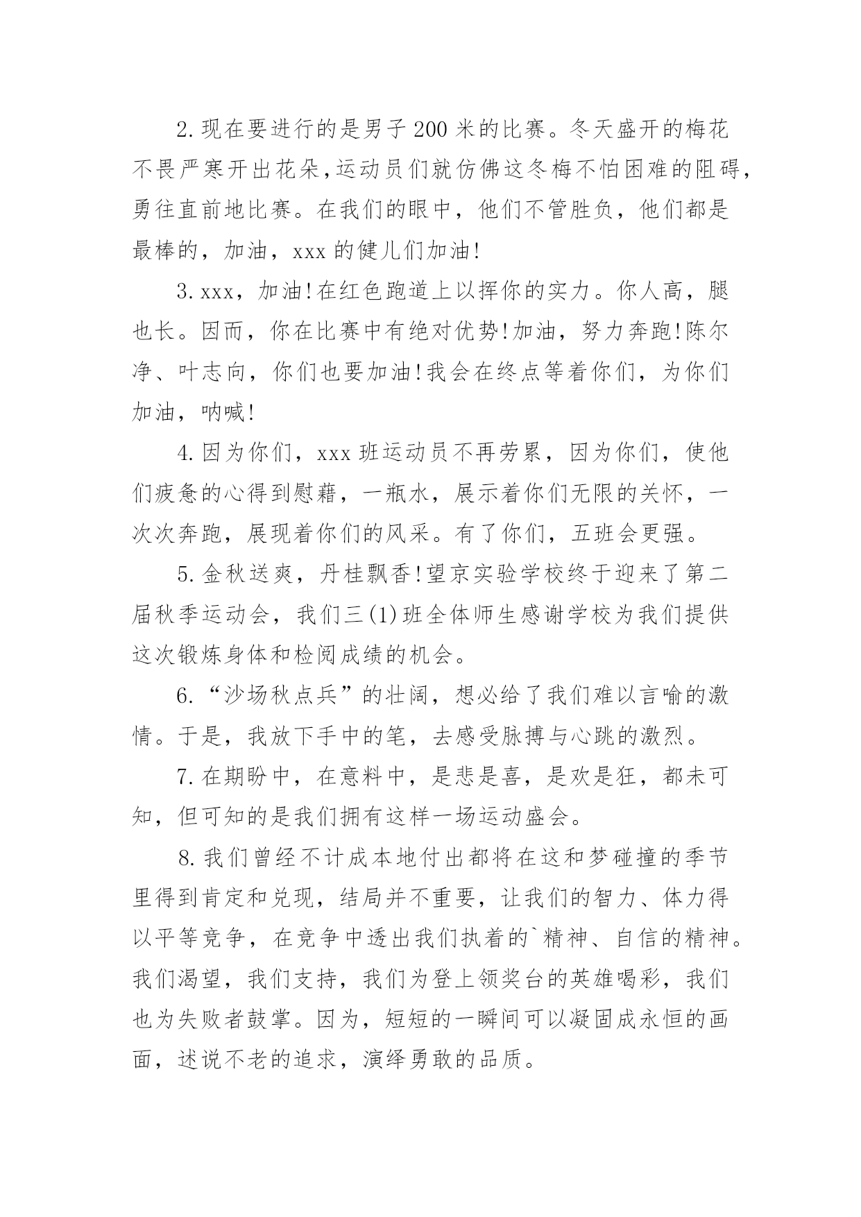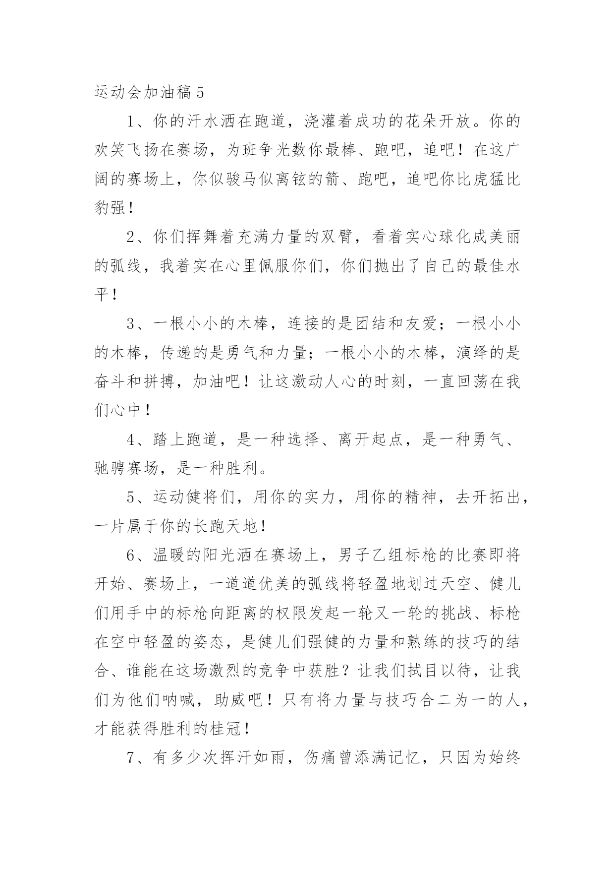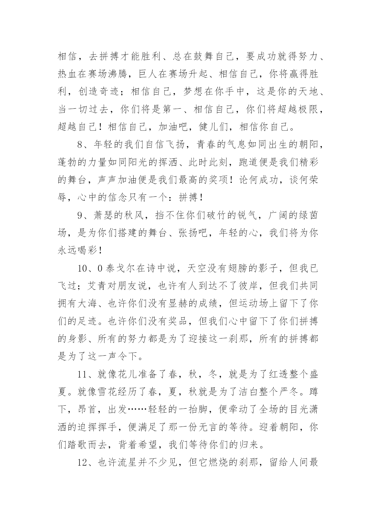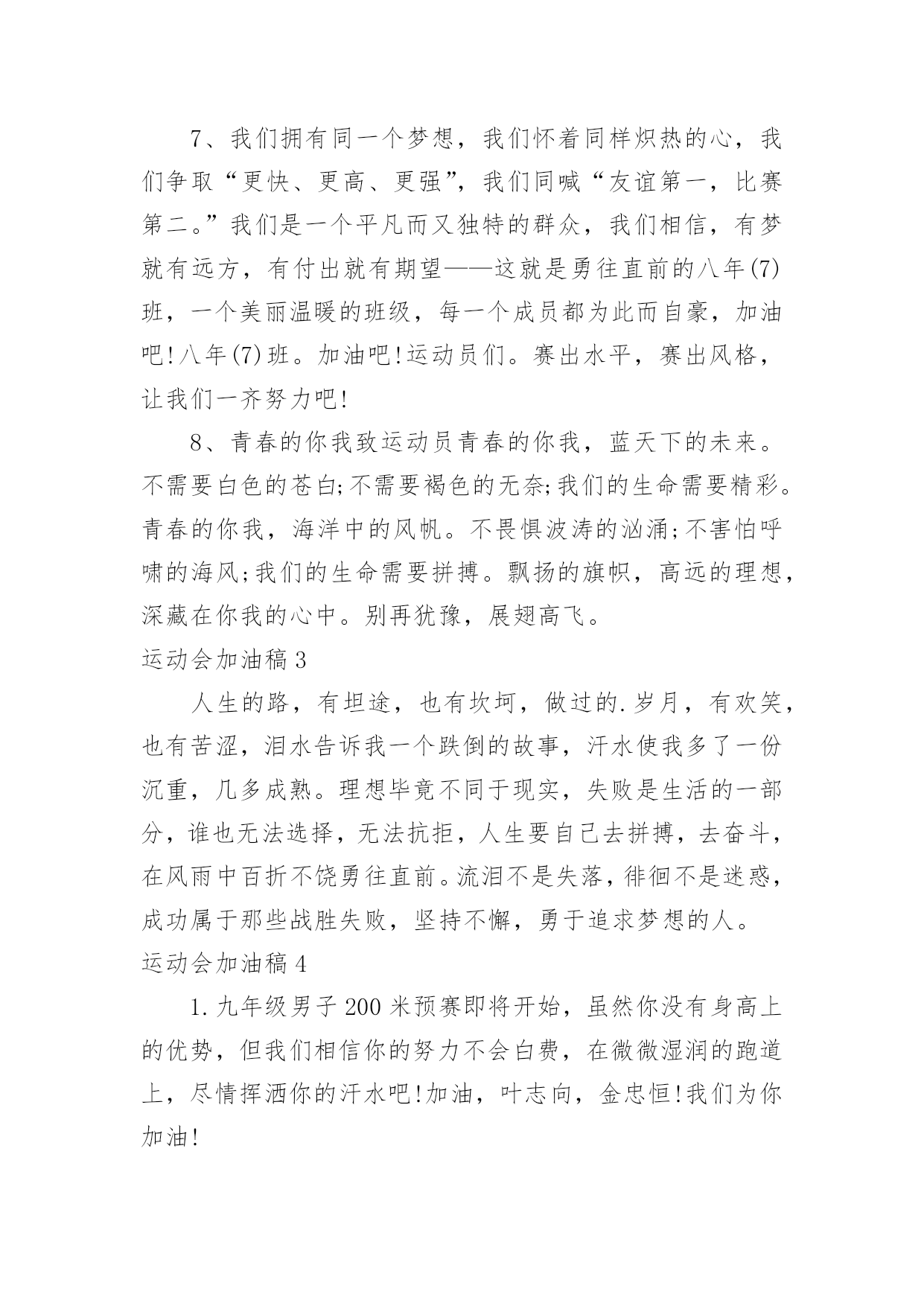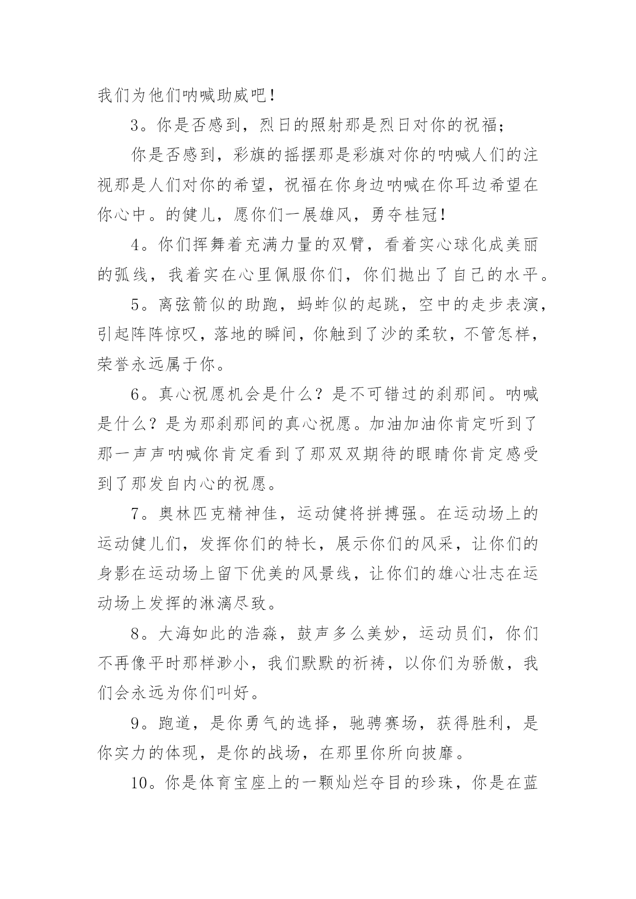 运动会加油稿运动会加油稿在不断进步的时代,我们可以使用加油稿的机会越来越多,借助加油稿可以激励他人的士气。你所见过的加油稿是什么样的呢?下面是小编精心整理的运动会加油稿,仅供参考,希望能够帮助到大家。运动会加油稿1蔚蓝的天空下,有你矫健的身影,热闹的操场上,有你坚定的步伐,美丽的.鲜花后,有你辛勤的汗水,我们的喝彩中,有你的自豪与骄傲!体育健儿们,我们知道你们的辛勤,我们了解你们的辛苦。加油吧!不论你是成功还是失败,我们都是你们坚强的后盾。胜也爱你,败也爱你,我们永远支持你,你们永远是“最特别的运动会加油稿21、年轻的我们自信飞扬,青春的气息如同出生的朝阳,蓬勃的力量如同阳光的挥洒。此时此刻,跑道便是我们精彩的舞台,声声加油便是我们的奖项!论何成功,谈何荣辱,心中的信念只有一个:拼搏!2、在今日的赛场上运动会通讯稿简短,我只是个场边的看客。我用眼睛见证了赛场上的是非成败,用心灵感受了运动员的喜怒哀乐。他坚持跑完全程,我学到了坚持的可贵,他摔倒了再站起来,我学会了不怕失败的勇气。场上每一个点滴,都如此的震撼我的心灵。在今日的赛场上,我只是个场边的看客,但我学到了很多。3、在枪声响起的一刹运动会通讯稿格式那你如箭在弦飞刺而出,在跑道的尽头你奋力的一掷中你让铅球落在最远点是你们——让我们知道了什么是拼搏,是们是激情是们是荣耀加油吧,让所有的人目击你们胜出的那刹那瞬间,让所有的人为你们而骄傲!4、你们要相信自己:你们是最棒的!你们是的!无论结果如何,我们都会为你们献上鲜花与掌声,由于我们知道,结果并不是最重要的,最重要的是你们努力的过程!每一次的比赛不只有会成功,还有更多在这之前的努力与汗水!让我们一起来期待这结果。5、只要敢站上赛道就是勇敢者,名次和荣誉都是微乎其微;只要敢飞奔在赛道上就是王者,或落后是但是一秒钟的失望;只要冲过终点就是坚持不懈的光环永罩心头。跑吧,跑吧,跑出自己的秀丽华章,跑出自己的光辉历史,跑出自己的永恒第一!6、我们盼望已久的运动会最后到来了,今日就是你们一展身手的.好时候。将你们蓄日已久的爆发力拼射出来吧!班上的同学都在为你们加油,为你们鼓劲。相信自己,胜利在向你们招手,在向你们呼喊!加油吧!运动员们,跑出你们的成绩!7、我们拥有同一个梦想,我们怀着同样炽热的心,我们争取“更快、更高、更强”,我们同喊“友谊第一,比赛第二。”我们是一个平凡而又独特的群众,我们相信,有梦就有远方,有付出就有期望——这就是勇往直前的八年(7)班,一个美丽温暖的班级,每一个成员都为此而自豪,加油吧!八年(7)班。加油吧!运动员们。赛出水平,赛出风格,让我们一齐努力吧!8、青春的你我致运动员青春的你我,蓝天下的未来。不需要白色的苍白;不需要褐色的无奈;我们的生命需要精彩。青春的你我,海洋中的风帆。不畏惧波涛的汹涌;不害怕呼啸的海风;我们的生命需要拼搏。飘扬的旗帜,高远的理想,深藏在你我的心中。别再犹豫,展翅高飞。运动会加油稿3人生的路,有坦途,也有坎坷,做过的.岁月,有欢笑,也有苦涩,泪水告诉我一个跌倒的故事,汗水使我多了一份沉重,几多成熟。理想毕竟不同于现实,失败是生活的一部分,谁也无法选择,无法抗拒,人生要自己去拼搏,去奋斗,在风雨中百折不饶勇往直前。流泪不是失落,徘徊不是迷惑,成功属于那些战胜失败,坚持不懈,勇于追求梦想的人。运动会加油稿41.九年级男子200米预赛即将开始,虽然你没有身高上的优势,但我们相信你的努力不会白费,在微微湿润的跑道上,尽情挥洒你的汗水吧!加油,叶志向,金忠恒!我们为你加油!2.现在要进行的是男子200米的比赛。冬天盛开的梅花不畏严寒开出花朵,运动员们就仿佛这冬梅不怕困难的阻碍,勇往直前地比赛。在我们的眼中,他们不管胜负,他们都是最棒的,加油,xxx的健儿们加油!3.xxx,加油!在红色跑道上以挥你的实力。你人高,腿也长。因而,你在比赛中有绝对优势!加油,努力奔跑!陈尔净、叶志向,你们也要加油!我会在终点等着你们,为你们加油,呐喊!4.因为你们,xxx班运动员不再劳累,因为你们,使他们疲惫的心得到慰藉,一瓶水,展示着你们无限的关怀,一次次奔跑,展现着你们的风采。有了你们,五班会更强。5.金秋送爽,丹桂飘香!望京实验学校终于迎来了第二届秋季运动会,我们三(1)班全体师生感谢学校为我们提供这次锻炼身体和检阅成绩的机会。6.“沙场秋点兵”的壮阔,想必给了我们难以言喻的激情。于是,我放下手中的笔,去感受脉搏与心跳的激烈。7.在期盼中,在意料中,是悲是喜,是欢是狂,都未可知,但可知的是我们拥有这样一场运动盛会。8.我们曾经不计成本地付出都将在这和梦碰撞的季节里得到肯定和兑现,结局并不重要,让我们的智力、体力得以平等竞争,在竞争中透出我们执着的`精神、自信的精神。我们渴望,我们支持,我们为登上领奖台的英雄喝彩,