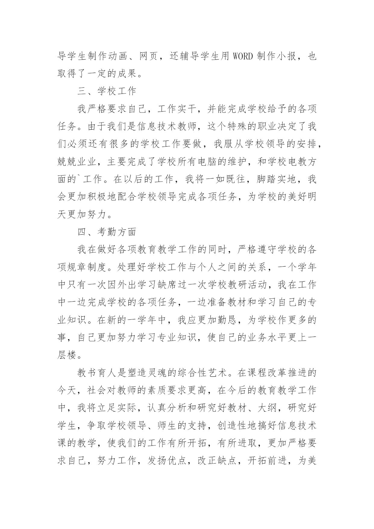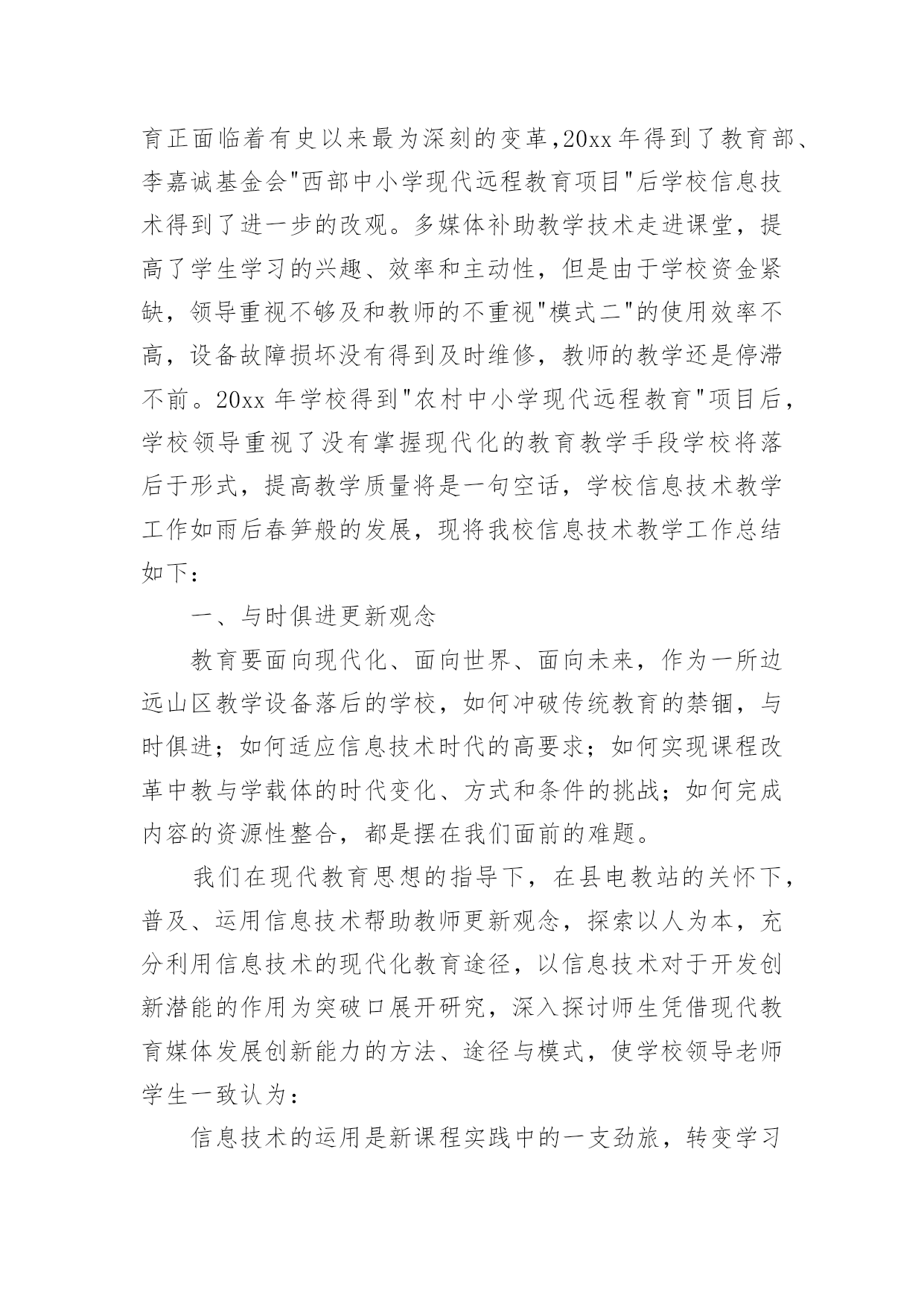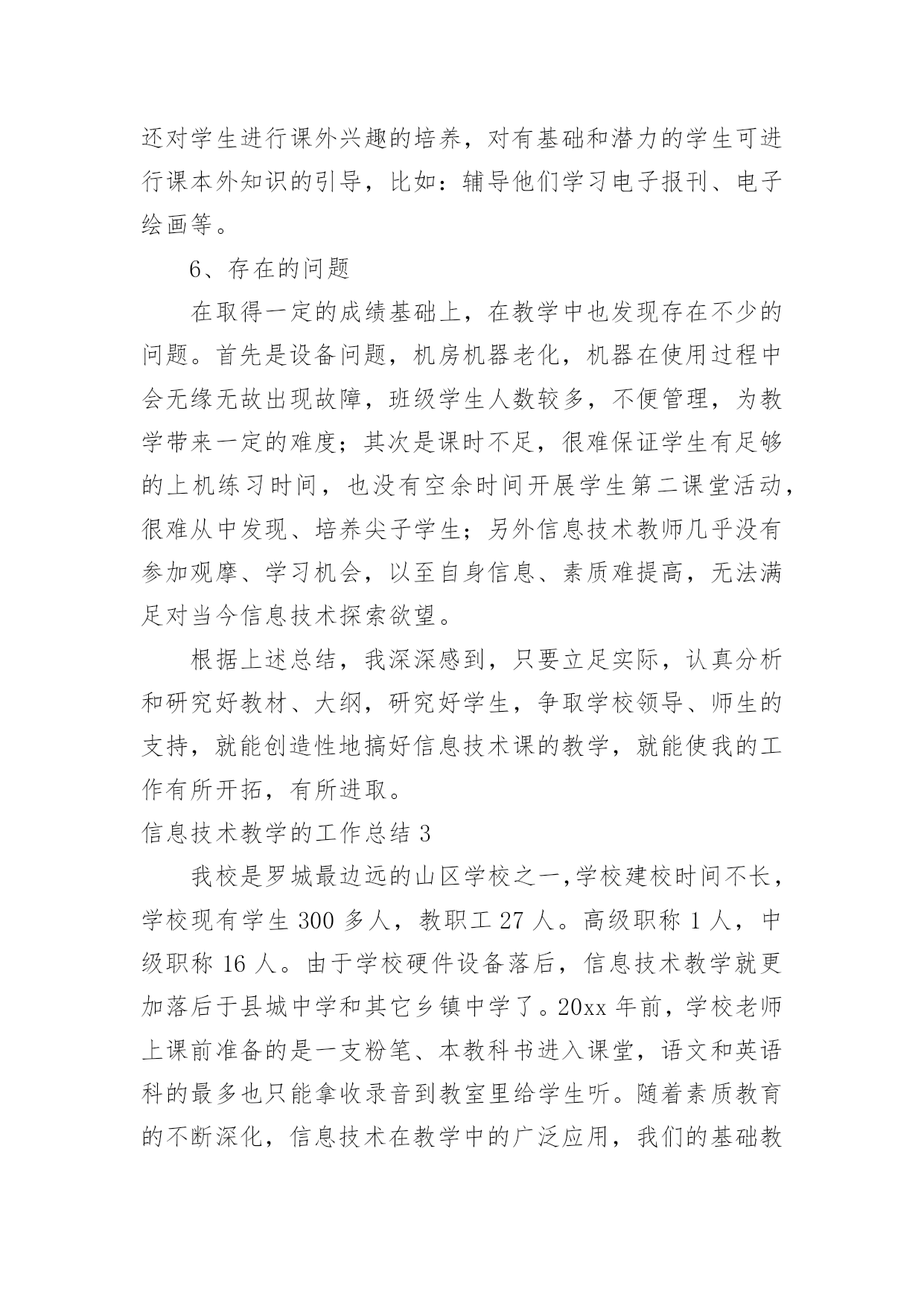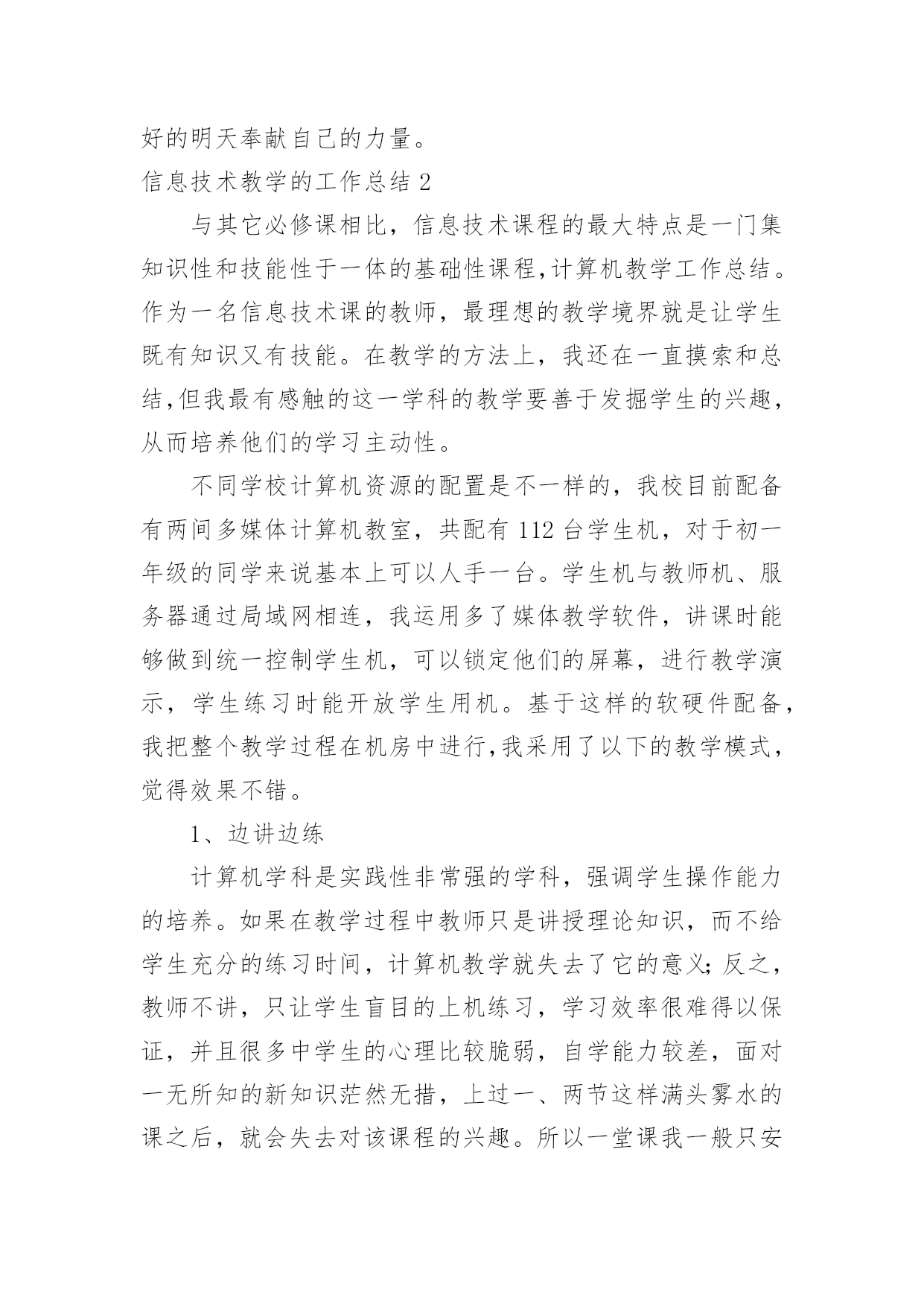 信息技术教学的工作总结信息技术教学的工作总结总结就是对一个时期的学习、工作或其完成情况进行一次全面系统的回顾和分析的书面材料,它可以帮助我们总结以往思想,发扬成绩,不如立即行动起来写一份总结吧。总结你想好怎么写了吗?以下是小编收集整理的信息技术教学的工作总结,仅供参考,希望能够帮助到大家。信息技术教学的工作总结1一个学年已过去,新的学年即将来临,在这过去的一年里我深刻体会到了做一名信息技术教师的艰辛和快乐,我把自己的精力倾注于我所钟爱的教育事业上,倾注于每一个学生身上,信息技术教学总结。一学年的工作已经结束,收获不少,下面我对上学年的工作作一总结,为新学年的工作确立新的目标。一、思想认识在过去的一年里,我在思想上严于律己,热爱党的教育事业,全面贯彻党的教育方针,严格要求自己,积极参加学校组织的各项政治活动。一年来,我服从学校的工作安排,配合领导和老师们做好校内外的各项工作。我相信在以后的工作学习中,在同事们的帮助下,通过自己的努力,克服缺点,取得更大的进步。新的一学年即将来临,我将更加努力工作,勤学苦练,在思想工作和学习上取得更大的进步。二、教学工作在教学工作方面,整学年的教学任务都非常重,担任中学三个年级的信息技术课,同时还当任着全校的计算机维护和网络维修任务。不管怎样,为了提高自己的教学水平,我坚持经常看电脑报、信息技术书籍等,还经常网上找一些优秀的教案课件学习,还争取机会多在网上听课,从中学习别人的长处,领悟其中的教学艺术,工作总结《信息技术教学总结》。平时还虚心请教有经验的老师。在备课过程中认真分析教材,根据教材的特点及学生的实际情况设计教案。一学期来,认真备课、上课、听课、评课,及时讲评作业,做好课后辅导工作,广泛涉猎各种知识,形成比较完整的知识结构。严格要求学生,尊重学生,发扬教学民主,使学生学有所得,不断提高,从而不断提高自己的教学水平和思想觉悟,并顺利完成教育教学任务。在教学中,对于信息技术课程来说,主要是突出学生的动手能力,也为了激发学生学习的兴趣,我作了充分的准备,每堂课上之前我都查找各种资料和图片,或者找一些学校老的电脑配件给学生们看,尽可能地让课堂让课堂气氛活跃,树立起他们学习的信心和激发他们学习台阶信息技术的兴趣。在整个教学过程中,我特地每节课都增加课本外的计算机基本知识,如像“计算机的发展史”等。还辅导家里有电脑的同学学习一些课外操作知识,也收到了很好的效果,发现学生中还有很多电脑小高手的,如辅导学生信息技术,辅导学生制作动画、网页,还辅导学生用WORD制作小报,也取得了一定的成果。三、学校工作我严格要求自己,工作实干,并能完成学校给予的各项任务。由于我们是信息技术教师,这个特殊的职业决定了我们必须还有很多的学校工作要做,我服从学校领导的安排,兢兢业业,主要完成了学校所有电脑的维护,和学校电教方面的`工作。在以后的工作,我将一如既往,脚踏实地,我会更加积极地配合学校领导完成各项任务,为学校的美好明天更加努力。四、考勤方面我在做好各项教育教学工作的同时,严格遵守学校的各项规章制度。处理好学校工作与个人之间的关系,一个学年中只有一次因外出学习缺席过一次学校教研活动,我在工作中一边完成学校的各项任务,一边准备教材和学习自己的专业知识。在新的一学年中,我应更加勤恳,为学校作更多的事,自己更加努力学习专业知识,使自己的业务水平更上一层楼。教书育人是塑造灵魂的综合性艺术。在课程改革推进的今天,社会对教师的素质要求更高,在今后的教育教学工作中,我将立足实际,认真分析和研究好教材、大纲,研究好学生,争取学校领导、师生的支持,创造性地搞好信息技术课的教学,使我们的工作有所开拓,有所进取,更加严格要求自己,努力工作,发扬优点,改正缺点,开拓前进,为美好的明天奉献自己的力量。信息技术教学的工作总结2与其它必修课相比,信息技术课程的最大特点是一门集知识性和技能性于一体的基础性课程,计算机教学工作总结。作为一名信息技术课的教师,最理想的教学境界就是让学生既有知识又有技能。在教学的方法上,我还在一直摸索和总结,但我最有感触的这一学科的教学要善于发掘学生的兴趣,从而培养他们的学习主动性。不同学校计算机资源的配置是不一样的,我校目前配备有两间多媒体计算机教室,共配有112台学生机,对于初一年级的同学来说基本上可以人手一台。学生机与教师机、服务器通过局域网相连,我运用多了媒体教学软件,讲课时能够做到统一控制学生机,可以锁定他们的屏幕,进行教学演示,学生练习时能开放学生用机。基于这样的软硬件配备,我把整个教学过程在机房中进行,我采用了以下的教学模式,觉得效果不错。1、边讲边练计算机学科是实践性非常强的学科,强调学生操作能力的培养。如果在教学过程中教师只是讲授理论知识,而不给学生充分的练习时间,计算机教学就失去了它的意义;反之,教师