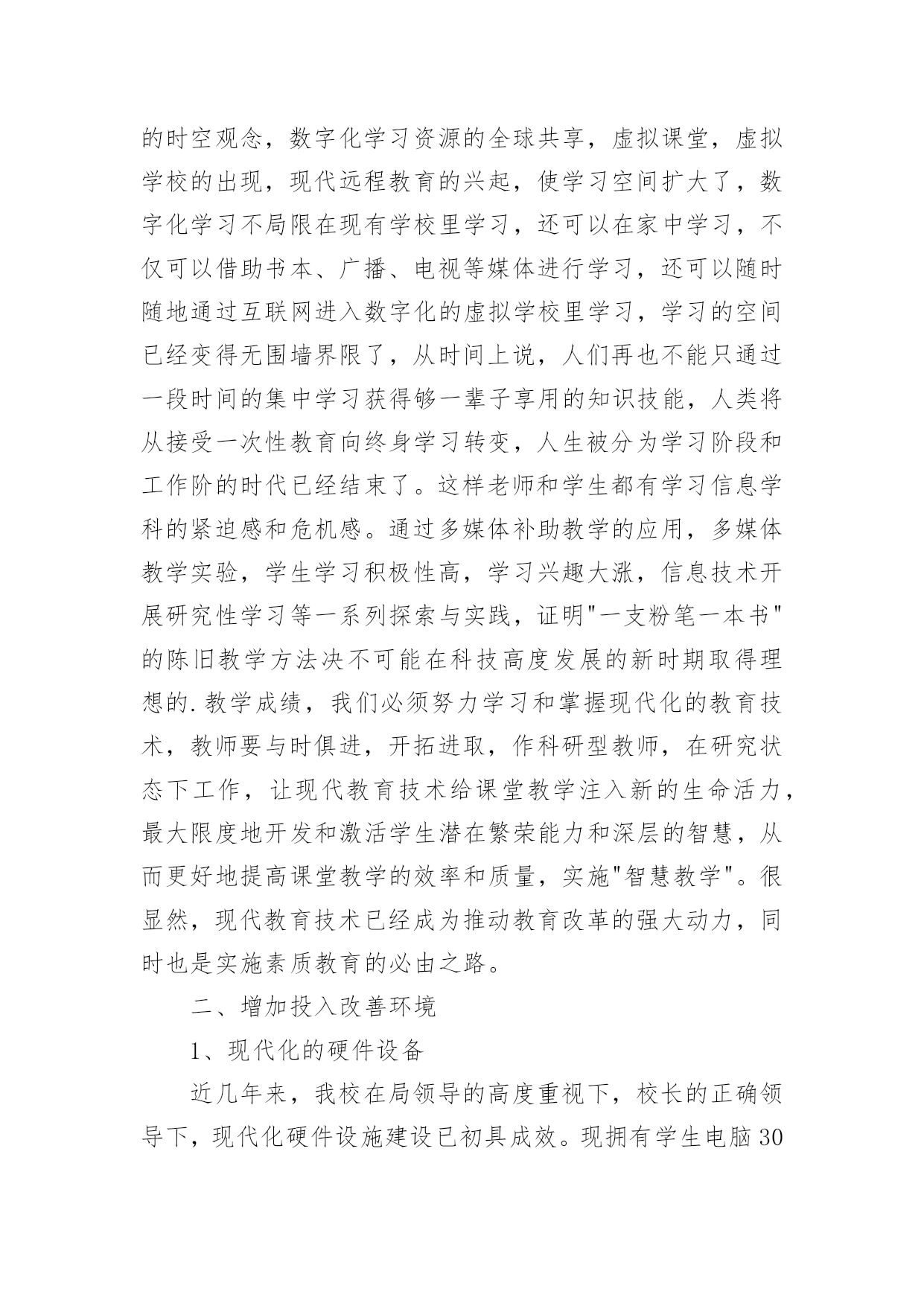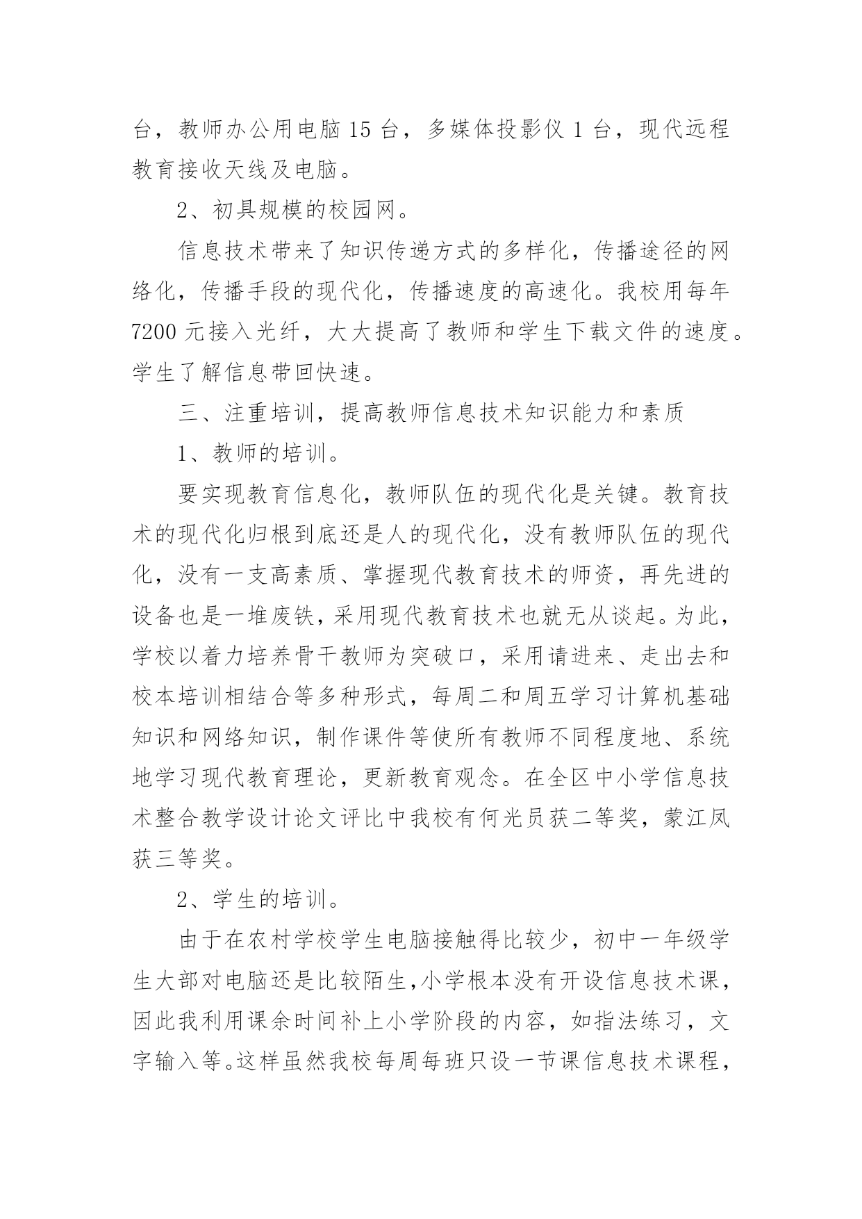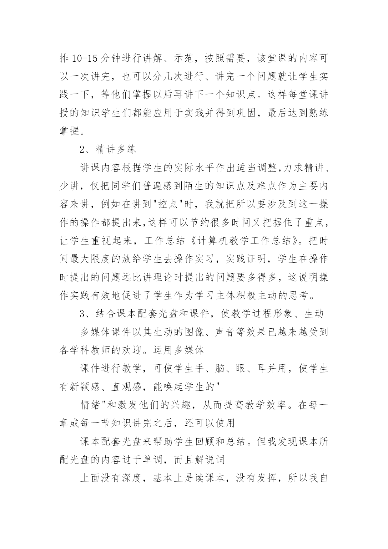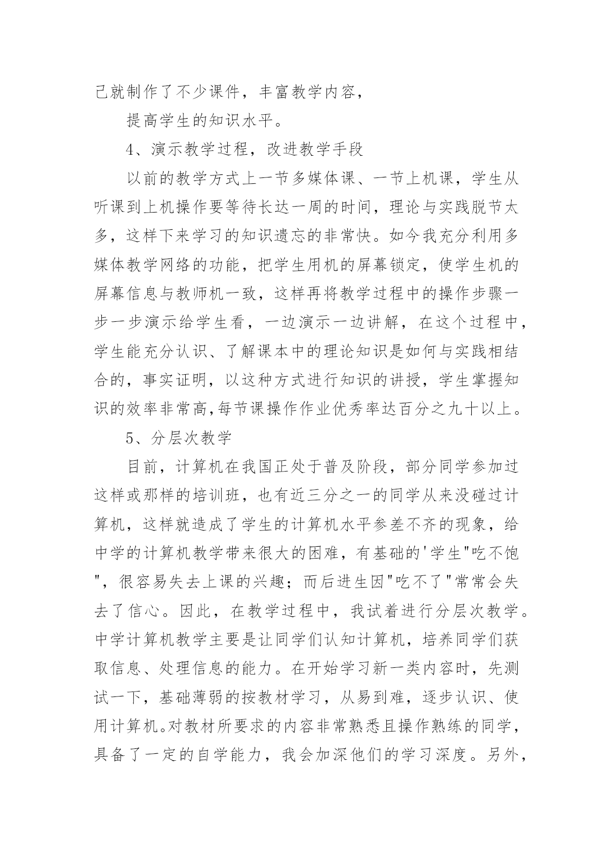 信息技术教学的工作总结信息技术教学的工作总结总结就是对一个时期的学习、工作或其完成情况进行一次全面系统的回顾和分析的书面材料,它可以帮助我们总结以往思想,发扬成绩,不如立即行动起来写一份总结吧。总结你想好怎么写了吗?以下是小编收集整理的信息技术教学的工作总结,仅供参考,希望能够帮助到大家。信息技术教学的工作总结1一个学年已过去,新的学年即将来临,在这过去的一年里我深刻体会到了做一名信息技术教师的艰辛和快乐,我把自己的精力倾注于我所钟爱的教育事业上,倾注于每一个学生身上,信息技术教学总结。一学年的工作已经结束,收获不少,下面我对上学年的工作作一总结,为新学年的工作确立新的目标。一、思想认识在过去的一年里,我在思想上严于律己,热爱党的教育事业,全面贯彻党的教育方针,严格要求自己,积极参加学校组织的各项政治活动。一年来,我服从学校的工作安排,配合领导和老师们做好校内外的各项工作。我相信在以后的工作学习中,在同事们的帮助下,通过自己的努力,克服缺点,取得更大的进步。新的一学年即将来临,我将更加努力工作,勤学苦练,在思想工作和学习上取得更大的进步。二、教学工作在教学工作方面,整学年的教学任务都非常重,担任中学三个年级的信息技术课,同时还当任着全校的计算机维护和网络维修任务。不管怎样,为了提高自己的教学水平,我坚持经常看电脑报、信息技术书籍等,还经常网上找一些优秀的教案课件学习,还争取机会多在网上听课,从中学习别人的长处,领悟其中的教学艺术,工作总结《信息技术教学总结》。平时还虚心请教有经验的老师。在备课过程中认真分析教材,根据教材的特点及学生的实际情况设计教案。一学期来,认真备课、上课、听课、评课,及时讲评作业,做好课后辅导工作,广泛涉猎各种知识,形成比较完整的知识结构。严格要求学生,尊重学生,发扬教学民主,使学生学有所得,不断提高,从而不断提高自己的教学水平和思想觉悟,并顺利完成教育教学任务。在教学中,对于信息技术课程来说,主要是突出学生的动手能力,也为了激发学生学习的兴趣,我作了充分的准备,每堂课上之前我都查找各种资料和图片,或者找一些学校老的电脑配件给学生们看,尽可能地让课堂让课堂气氛活跃,树立起他们学习的信心和激发他们学习台阶信息技术的兴趣。在整个教学过程中,我特地每节课都增加课本外的计算机基本知识,如像“计算机的发展史”等。还辅导家里有电脑的同学学习一些课外操作知识,也收到了很好的效果,发现学生中还有很多电脑小高手的,如辅导学生信息技术,辅导学生制作动画、网页,还辅导学生用WORD制作小报,也取得了一定的成果。三、学校工作我严格要求自己,工作实干,并能完成学校给予的各项任务。由于我们是信息技术教师,这个特殊的职业决定了我们必须还有很多的学校工作要做,我服从学校领导的安排,兢兢业业,主要完成了学校所有电脑的维护,和学校电教方面的`工作。在以后的工作,我将一如既往,脚踏实地,我会更加积极地配合学校领导完成各项任务,为学校的美好明天更加努力。四、考勤方面我在做好各项教育教学工作的同时,严格遵守学校的各项规章制度。处理好学校工作与个人之间的关系,一个学年中只有一次因外出学习缺席过一次学校教研活动,我在工作中一边完成学校的各项任务,一边准备教材和学习自己的专业知识。在新的一学年中,我应更加勤恳,为学校作更多的事,自己更加努力学习专业知识,使自己的业务水平更上一层楼。教书育人是塑造灵魂的综合性艺术。在课程改革推进的今天,社会对教师的素质要求更高,在今后的教育教学工作中,我将立足实际,认真分析和研究好教材、大纲,研究好学生,争取学校领导、师生的支持,创造性地搞好信息技术课的教学,使我们的工作有所开拓,有所进取,更加严格要求自己,努力工作,发扬优点,改正缺点,开拓前进,为美好的明天奉献自己的力量。信息技术教学的工作总结2与其它必修课相比,信息技术课程的最大特点是一门集知识性和技能性于一体的基础性课程,计算机教学工作总结。作为一名信息技术课的教师,最理想的教学境界就是让学生既有知识又有技能。在教学的方法上,我还在一直摸索和总结,但我最有感触的这一学科的教学要善于发掘学生的兴趣,从而培养他们的学习主动性。不同学校计算机资源的配置是不一样的,我校目前配备有两间多媒体计算机教室,共配有112台学生机,对于初一年级的同学来说基本上可以人手一台。学生机与教师机、服务器通过局域网相连,我运用多了媒体教学软件,讲课时能够做到统一控制学生机,可以锁定他们的屏幕,进行教学演示,学生练习时能开放学生用机。基于这样的软硬件配备,我把整个教学过程在机房中进行,我采用了以下的教学模式,觉得效果不错。1、边讲边练计算机学科是实践性非常强的学科,强调学生操作能力的培养。如果在教学过程中教师只是讲授理论知识,而不给学生充分的练习时间,计算机教学就失去了它的意义;反之,教师