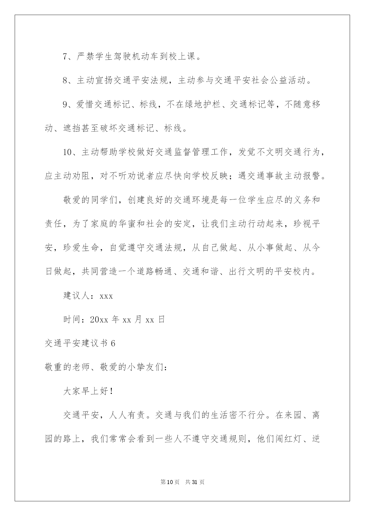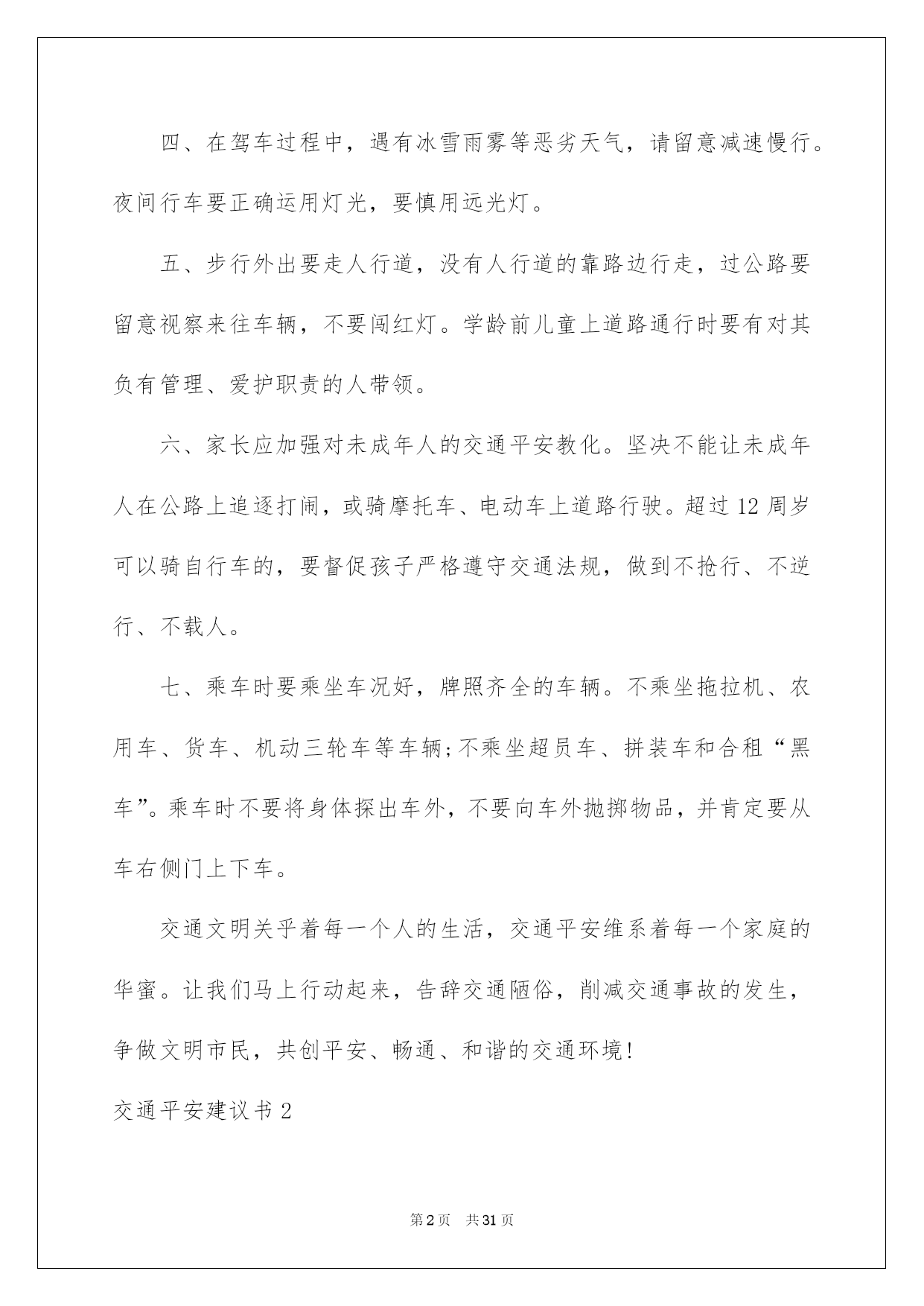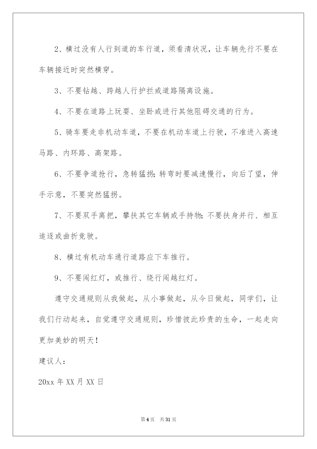 第PAGE\*Arabic\*MERGEFORMAT31页共NUMPAGES\*Arabic\*MERGEFORMAT31页第PAGE\*MERGEFORMAT31页共NUMPAGES\*MERGEFORMAT31页第PAGE\*MERGEFORMAT31页共NUMPAGES\*MERGEFORMAT31页第PAGE\*MERGEFORMAT31页共NUMPAGES\*MERGEFORMAT31页第PAGE\*MERGEFORMAT31页共NUMPAGES\*MERGEFORMAT31页第PAGE\*MERGEFORMAT31页共NUMPAGES\*MERGEFORMAT31页第PAGE\*MERGEFORMAT31页共NUMPAGES\*MERGEFORMAT31页第PAGE\*MERGEFORMAT31页共NUMPAGES\*MERGEFORMAT31页第PAGE\*MERGEFORMAT31页共NUMPAGES\*MERGEFORMAT31页第PAGE\*MERGEFORMAT31页共NUMPAGES\*MERGEFORMAT31页第PAGE\*MERGEFORMAT31页共NUMPAGES\*MERGEFORMAT31页2022交通安全建议书交通平安建议书(精选15篇)在不断进步的时代,建议书在我们的视野里出现的频率越来越高,建议书是一连串的管理实践,往往有着至关重要的作用。信任写建议书是一个让很多人都头痛的问题,以下是我细心整理的交通平安建议书,仅供参考,大家一起来看看吧。交通平安建议书1车祸猛于虎!交通事故已成为当今社会的一大公害。为爱护人身平安,预防和削减道路交通事故。登封交警特发此倡议书,提示广阔交通参加者文明交通,平安出行!一、不无证驾驶,不酒后驾驶,不超员、超速、超载和疲惫驾驶,不抱任何侥幸心理,加强自我约束,自觉遵守交通法规。二、低速载货汽车、三轮车和拖拉机不得载人,微型面包车不得载货,因为人货混装车辆存在极大的平安隐患。三、驾车上路前,请您确认机动车处在良好的平安技术状态,不开“带病车”上路行驶,确保刹车、转向灵敏、牢靠、有效。四、在驾车过程中,遇有冰雪雨雾等恶劣天气,请留意减速慢行。夜间行车要正确运用灯光,要慎用远光灯。五、步行外出要走人行道,没有人行道的靠路边行走,过公路要留意视察来往车辆,不要闯红灯。学龄前儿童上道路通行时要有对其负有管理、爱护职责的人带领。六、家长应加强对未成年人的交通平安教化。坚决不能让未成年人在公路上追逐打闹,或骑摩托车、电动车上道路行驶。超过12周岁可以骑自行车的,要督促孩子严格遵守交通法规,做到不抢行、不逆行、不载人。七、乘车时要乘坐车况好,牌照齐全的车辆。不乘坐拖拉机、农用车、货车、机动三轮车等车辆;不乘坐超员车、拼装车和合租“黑车”。乘车时不要将身体探出车外,不要向车外抛掷物品,并肯定要从车右侧门上下车。交通文明关乎着每一个人的生活,交通平安维系着每一个家庭的华蜜。让我们马上行动起来,告辞交通陋俗,削减交通事故的发生,争做文明市民,共创平安、畅通、和谐的交通环境!交通平安建议书2各位同学:你们好!我们生活在这样一个喧嚣繁华的城市里,我们每天来往于生活区、教学区和其他场所之间,在那行人车辆拥挤的街道上,你是否看到了潜藏在我们每日行走的交通路途上的危急呢?因为不遵守交通法规,我们看到了血的事实,经受了血的教训,那一幕幕令人伤心、惨不忍睹的画面,那一个个因抢救无效而离我们远去的人们,最终留给我们的都是心灵上的创伤和对离去者无尽的痛惜。我们在痛惜他们的同时,更应当醒悟地相识到:遵守交通法规,就是珍爱生命!下面这组数字让人确信,“车祸猛于虎”决不是危言耸听,交通事故就在你我身边。20xx年全国共发生道路交通事故567753起,造成99217人死亡,451810人受伤,干脆经济损失27亿元。俗话说得好:”无规则不成方圆”。因此,凡是在公路上进行与交通有关的活动的人都不能为所欲为,都必需严守规则,即交通法规。它是保证我们社会井然有序,健康快速发展的坚毅后盾。为此,我校少先队大队部特向王集小学的全体同学发出以下倡议:全校同学应“文明行车,文明走路,文明乘车”从我做起,树立校内文明新风。1、行人要走行人道,没有行人道的靠路右边行走。2、横过没有人行到道的车行道,须看清状况,让车辆先行不要在车辆接近时突然横穿。3、不要钻越、跨越人行护拦或道路隔离设施。4、不要在道路上玩耍、坐卧或进行其他阻碍交通的行为。5、骑车要走非机动车道,不要在机动车道上行驶,不准进入高速马路、内环路、高架路。6、不要争道抢行,急转猛拐;转弯时要减速慢行,向后了
