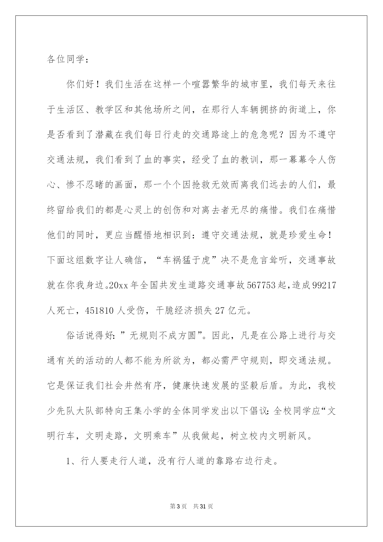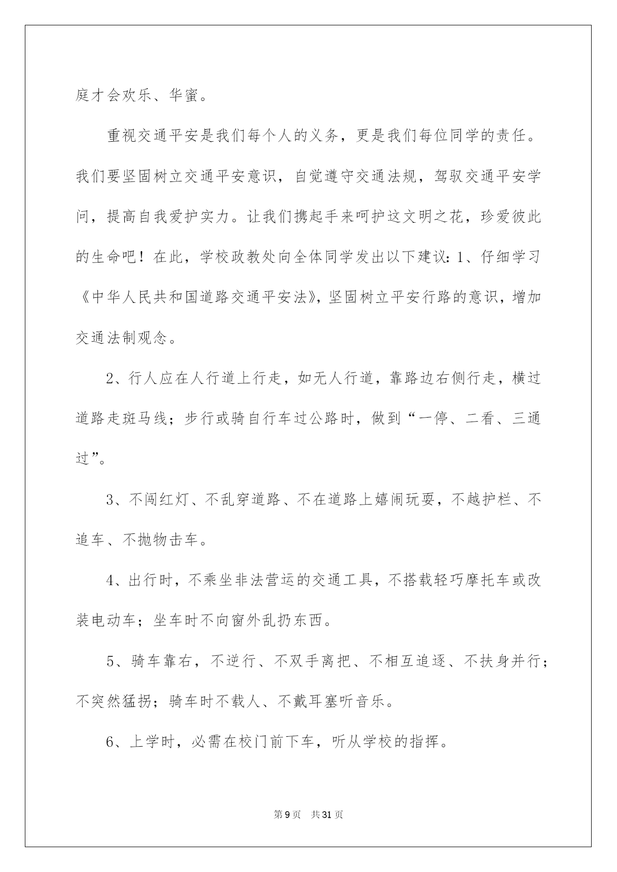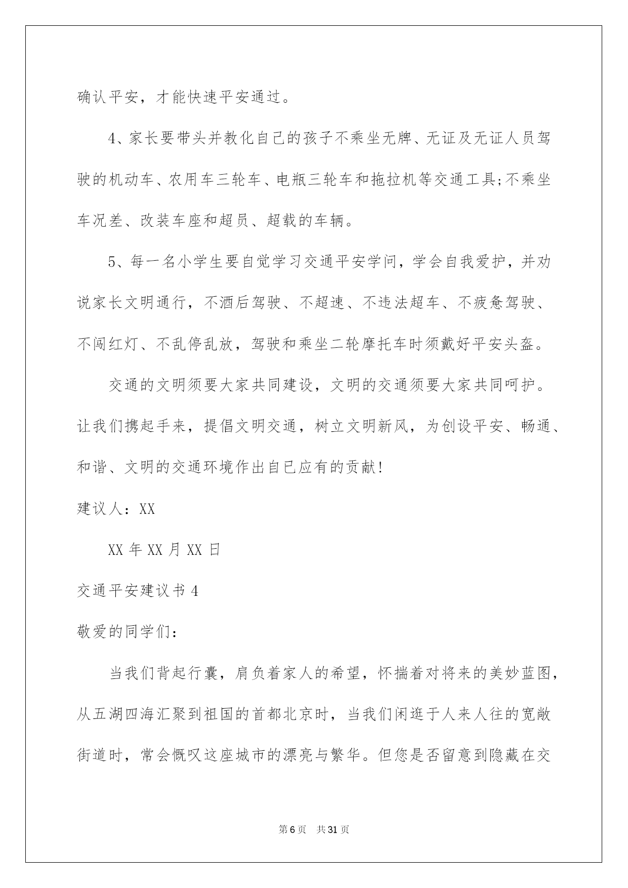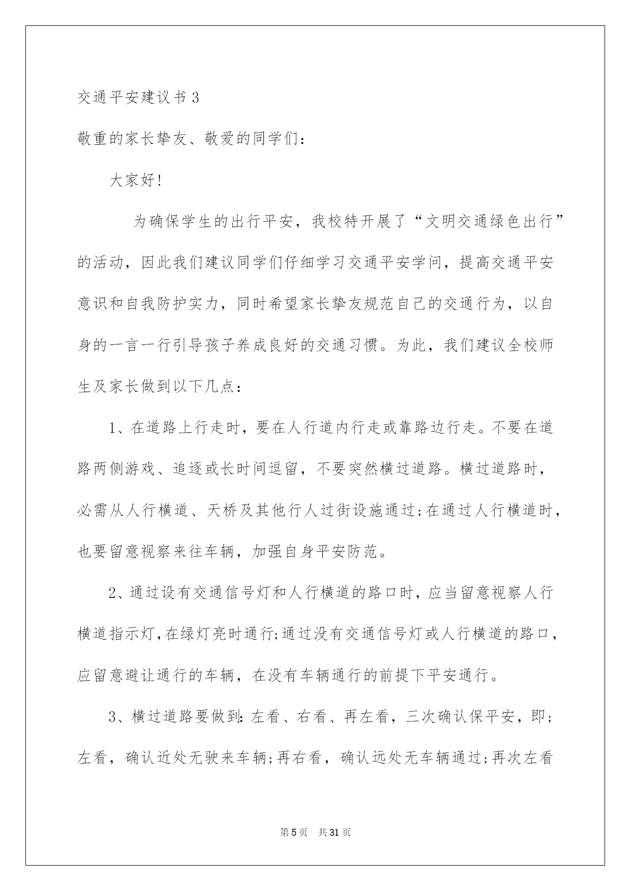 第PAGE\*Arabic\*MERGEFORMAT31页共NUMPAGES\*Arabic\*MERGEFORMAT31页第PAGE\*MERGEFORMAT31页共NUMPAGES\*MERGEFORMAT31页第PAGE\*MERGEFORMAT31页共NUMPAGES\*MERGEFORMAT31页第PAGE\*MERGEFORMAT31页共NUMPAGES\*MERGEFORMAT31页第PAGE\*MERGEFORMAT31页共NUMPAGES\*MERGEFORMAT31页第PAGE\*MERGEFORMAT31页共NUMPAGES\*MERGEFORMAT31页第PAGE\*MERGEFORMAT31页共NUMPAGES\*MERGEFORMAT31页第PAGE\*MERGEFORMAT31页共NUMPAGES\*MERGEFORMAT31页第PAGE\*MERGEFORMAT31页共NUMPAGES\*MERGEFORMAT31页第PAGE\*MERGEFORMAT31页共NUMPAGES\*MERGEFORMAT31页第PAGE\*MERGEFORMAT31页共NUMPAGES\*MERGEFORMAT31页2022交通安全建议书交通平安建议书(精选15篇)在不断进步的时代,建议书在我们的视野里出现的频率越来越高,建议书是一连串的管理实践,往往有着至关重要的作用。信任写建议书是一个让很多人都头痛的问题,以下是我细心整理的交通平安建议书,仅供参考,大家一起来看看吧。交通平安建议书1车祸猛于虎!交通事故已成为当今社会的一大公害。为爱护人身平安,预防和削减道路交通事故。登封交警特发此倡议书,提示广阔交通参加者文明交通,平安出行!一、不无证驾驶,不酒后驾驶,不超员、超速、超载和疲惫驾驶,不抱任何侥幸心理,加强自我约束,自觉遵守交通法规。二、低速载货汽车、三轮车和拖拉机不得载人,微型面包车不得载货,因为人货混装车辆存在极大的平安隐患。三、驾车上路前,请您确认机动车处在良好的平安技术状态,不开“带病车”上路行驶,确保刹车、转向灵敏、牢靠、有效。四、在驾车过程中,遇有冰雪雨雾等恶劣天气,请留意减速慢行。夜间行车要正确运用灯光,要慎用远光灯。五、步行外出要走人行道,没有人行道的靠路边行走,过公路要留意视察来往车辆,不要闯红灯。学龄前儿童上道路通行时要有对其负有管理、爱护职责的人带领。六、家长应加强对未成年人的交通平安教化。坚决不能让未成年人在公路上追逐打闹,或骑摩托车、电动车上道路行驶。超过12周岁可以骑自行车的,要督促孩子严格遵守交通法规,做到不抢行、不逆行、不载人。七、乘车时要乘坐车况好,牌照齐全的车辆。不乘坐拖拉机、农用车、货车、机动三轮车等车辆;不乘坐超员车、拼装车和合租“黑车”。乘车时不要将身体探出车外,不要向车外抛掷物品,并肯定要从车右侧门上下车。交通文明关乎着每一个人的生活,交通平安维系着每一个家庭的华蜜。让我们马上行动起来,告辞交通陋俗,削减交通事故的发生,争做文明市民,共创平安、畅通、和谐的交通环境!交通平安建议书2各位同学:你们好!我们生活在这样一个喧嚣繁华的城市里,我们每天来往于生活区、教学区和其他场所之间,在那行人车辆拥挤的街道上,你是否看到了潜藏在我们每日行走的交通路途上的危急呢?因为不遵守交通法规,我们看到了血的事实,经受了血的教训,那一幕幕令人伤心、惨不忍睹的画面,那一个个因抢救无效而离我们远去的人们,最终留给我们的都是心灵上的创伤和对离去者无尽的痛惜。我们在痛惜他们的同时,更应当醒悟地相识到:遵守交通法规,就是珍爱生命!下面这组数字让人确信,“车祸猛于虎”决不是危言耸听,交通事故就在你我身边。20xx年全国共发生道路交通事故567753起,造成99217人死亡,451810人受伤,干脆经济损失27亿元。俗话说得好:”无规则不成方圆”。因此,凡是在公路上进行与交通有关的活动的人都不能为所欲为,都必需严守规则,即交通法规。它是保证我们社会井然有序,健康快速发展的坚毅后盾。为此,我校少先队大队部特向王集小学的全体同学发出以下倡议:全校同学应“文明行车,文明走路,文明乘车”从我做起,树立校内文明新风。1、行人要走行人道,没有行人道的靠路右边行走。2、横过没有人行到道的车行道,须看清状况,让车辆先行不要在车辆接近时突然横穿。3、不要钻越、跨越人行护拦或道路隔离设施。4、不要在道路上玩耍、坐卧或进行其他阻碍交通的行为。5、骑车要走非机动车道,不要在机动车道上行驶,不准进入高速马路、内环路、高架路。6、不要争道抢行,急转猛拐;转弯时要减速慢行,向后了
