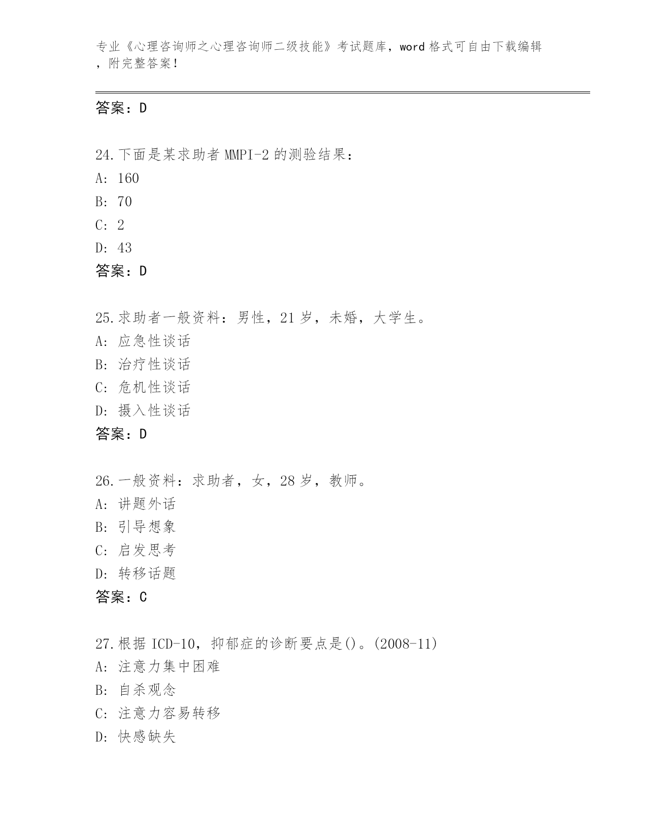 2024河北省深泽县《心理咨询师之心理咨询师二级技能》考试完整版A4版打印