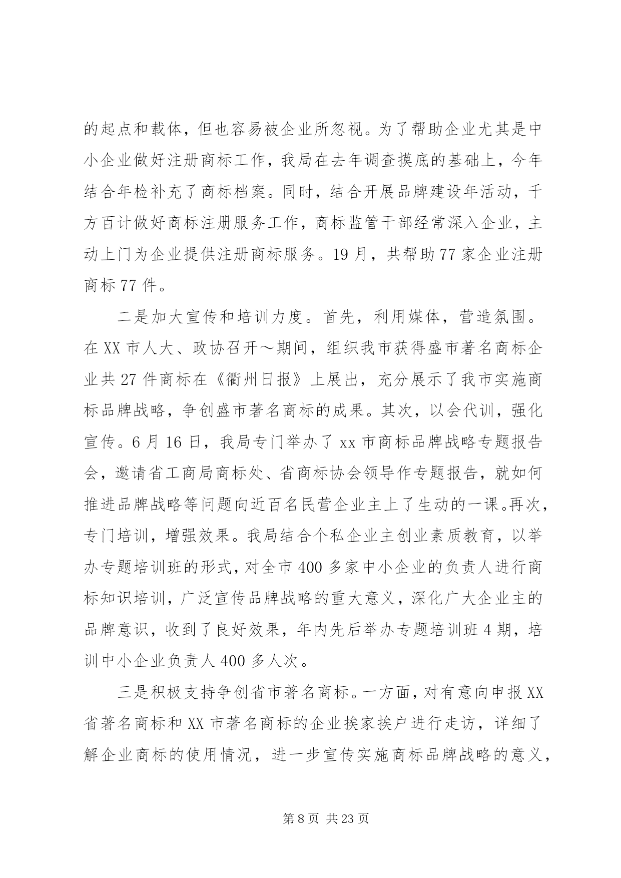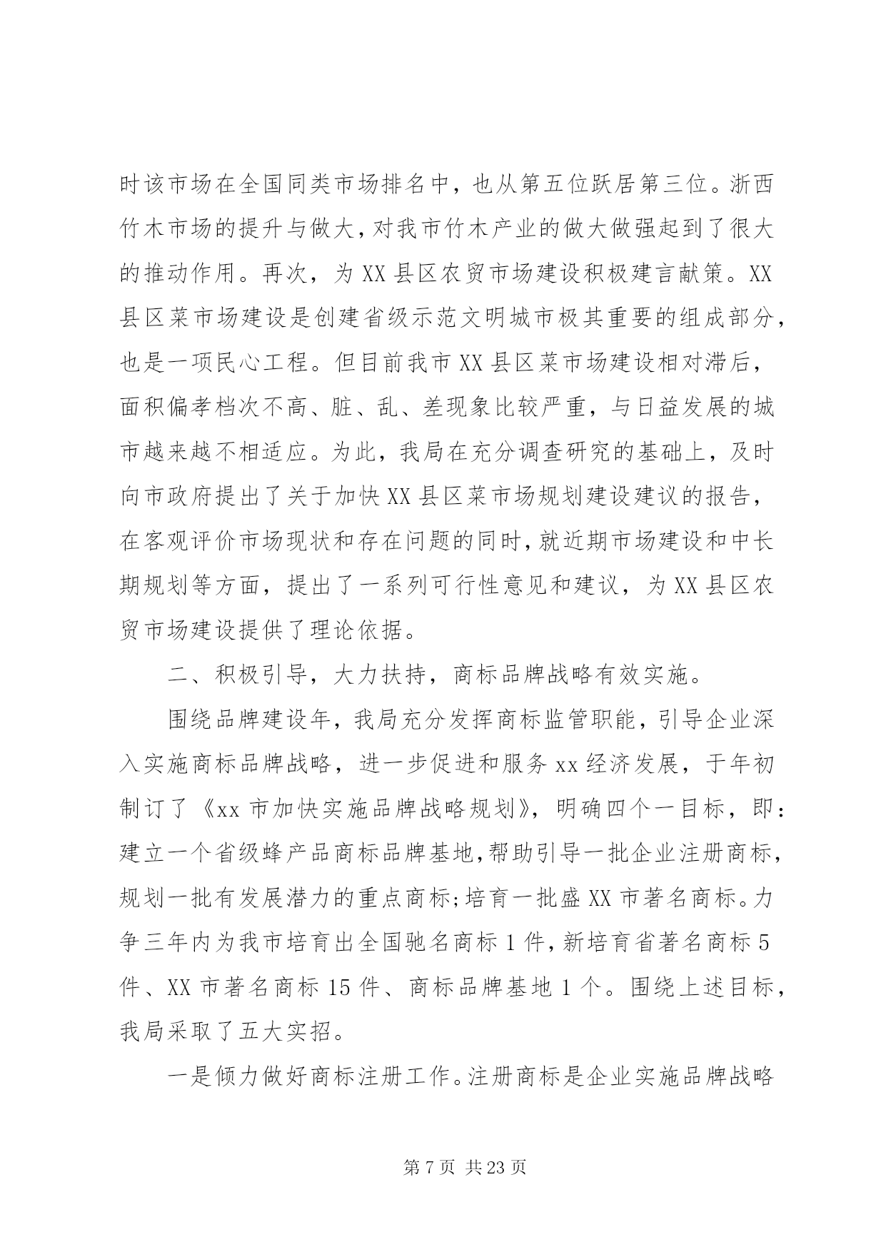 第PAGE\*Arabic\*MERGEFORMAT23页共NUMPAGES\*MERGEFORMAT23页工商所20XX年党支部工作计划xx工商所党支部工作计划范文一:萨依布衣工商所党支部在市局党总支的领导下,以邓小平理论和quot;三个代表quot;的重要思想为指导,以科学发展观为统领,以党的先进性建设为重点,不断加强支部建设、干部队伍建设和党员队伍建设。充分发挥支部的战斗堡垒作用和党员的先锋模范作用,树立党在群众中的良好形象,形成一股凝心力,深入群众,组织群众,永葆党的先进性。一、积极发挥支部的核心作用。1、加强领导班子思想政治建设,深入开展发展型领导班子创建活动。以加强工商所领导干部的思想作风建设为重点,不断丰富活动内容和活化活动形式,来提高班子成员的理论修养和开拓创新能力。2、加强支部建设增强党支部的凝聚力和战斗力。坚持领导班子民主集中制原则,认真开好班子成员民主生活会。3、加强党建工作,保持共产党员先进性教育成果,继续开展责任区工作,做好干部的思想教育,把党的温暖送到干部的心中。二、加强党员的教育管理。1、以学习贯彻党的xx届六中全会和自治区第八次党代会精神为主线,结合科学发展观理念,加强对党员的思想政治教育。重点抓好quot;三会一课quot;、民主评议党员和所班子建设。2、持之以恒地抓好党员干部的理论学习。结合quot;读书年quot;活动,有计划地开展党员干部理论学习,在学习中不断完善各项学习制度。注重调查研究,理论联系实际。3、发扬党员全心全意为人民服务的思想。关心年老、体弱和生活有困难的群众,及时上门进行慰问,排忧解难。并开展党员助残、扶贫活动。树立共产党员quot;吃苦在前,享乐在后quot;的共产主义精神。5、加强党风廉政建设。班子成员要签定廉洁自律承诺书,率先垂范,做廉洁自律的楷模。6、做好组织发展工作,吸收优秀群众加入党组织,使我党永保活力。三、落实各项规章制度。1、坚持集体领导的原则,重大事情集体讨论决定,充分发扬民主。发挥集体的作用和智慧。2、健全quot;三会一课quot;制,定期召开支委会、小组会。党课年不少于四次。四、促进精神文明建设1、牢固树立quot;两手抓quot;,两手都要硬的思想。做到年初有计划,年中有检查,年终有总结。2、加强宣传力度,充分利用学习日,开展公民道德教育,学习身边的楷模。3、加强对校园周边环境的监管为学生营造良好的教育环境。xx工商所党支部工作计划范文二:20xx年,工商行政管理工作又是一个丰收年。一年来,围绕上级工商部门的重点工作和xx市委、市政府的中心工作,我局以助动发展为主题,以科学监管为手段,以能力建设为重点,全力干事,奋发进取,成效显著。现将主要工作成效、亮点和特色工作总结如下。一、全员联企,全员帮办,个私经济发展亮点纷呈。我局以企业服务年为载体,以市委、市政府提出的跻身全国两百强为目标,刷新举措,强化服务,助动个私民营经济快速健康发展。19月,全市新发展个体私营企业2281户,累计全市有个私企业16467户,实现工业总产值69亿元,完成销售总额83亿元,社会消费品零售额61.17亿元。与去年相比,个私经济发展呈现出三大亮点。一是外贸出口挑大梁。到8月底止,全市外贸出口额达2640万美元,在7家出口额超过100万美元的企业中,私营企业就占了6家,其中的领军人物是xx沃克出口有限公司和xx恒亮蜂产品有限公司,外贸出口额分别达到456万美元和223万美元。二是六六产业异军突起。纺织、服装、机电、竹木加工、电光源、消防器材、羽毛球等六大产业,今年18月累计完成产值53.4亿元,同比增长41.9%,占全市工业产值的55.2%。其中,消防器材产业在六大产业中增长速度最快,同比增长达116%。三是获得省级荣誉称号的企业多。年内我市私营企业浙江贝林集团有限公司和个体工商户马肖宏、周志云等3家个私企业,分别被省委宣传部、省工商局、省个私协会授予20xx年度诚信民营企业、诚信工商户荣誉称号;浙江天蓬畜业有限公司被省知名商号评审委员会评审认定为20xx年度XX省知名商号。个私经济发展之所以亮点纷呈,就工商部门而言,主要是开展了全员联企,全员帮办活动,以大服务促大发展,效果明显。(一)全员联企,建立五个一联系企业制度。一是每名党员干部至少联系1家以上规模企业和10户以上个体工商户;二是在企业年检、个体户验照时开展零距离服务,上门为个私企业提供方便;三是结合工商职能,对联系企业在商标注册、品牌战略、合同订立、信用建设等方面提出一份有针对性的工商行政建议书;四是年内至少为联系企业和个体户办一件实事好事;五是每名党员干部都要记好一本走访企业日记。一年来,我局党员干部与xx余家重点个私企业建立了比较密切的联系,先后将4000多份年检报告书送达企业并指导填写