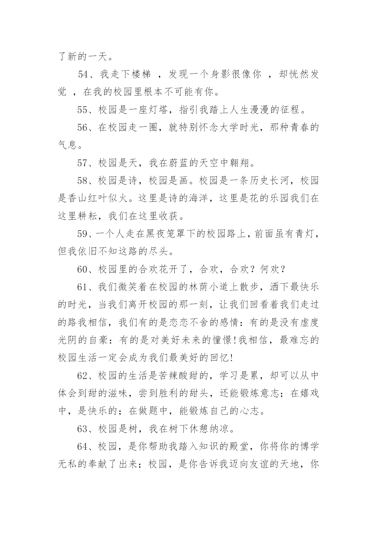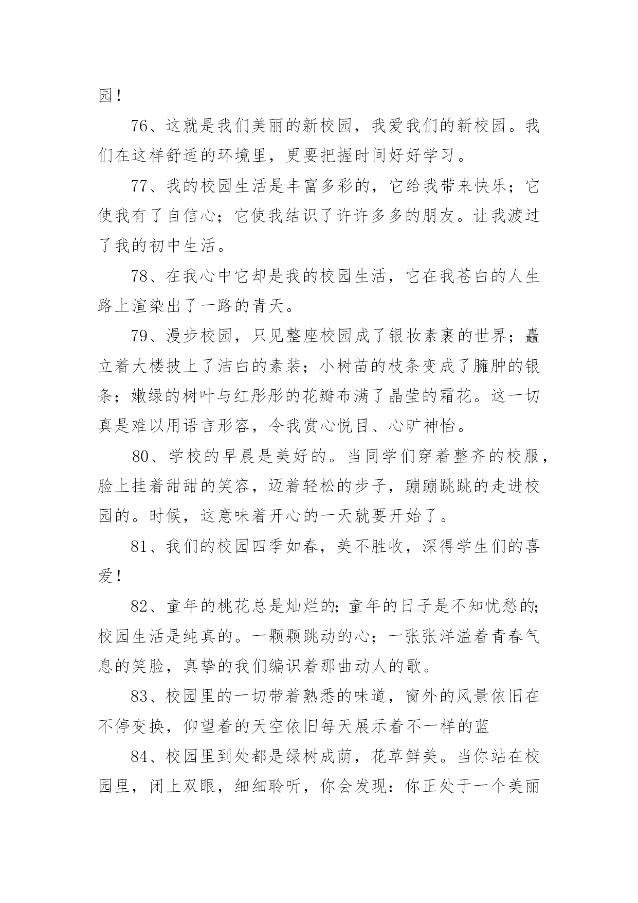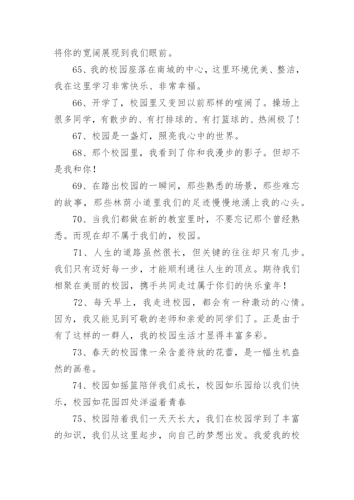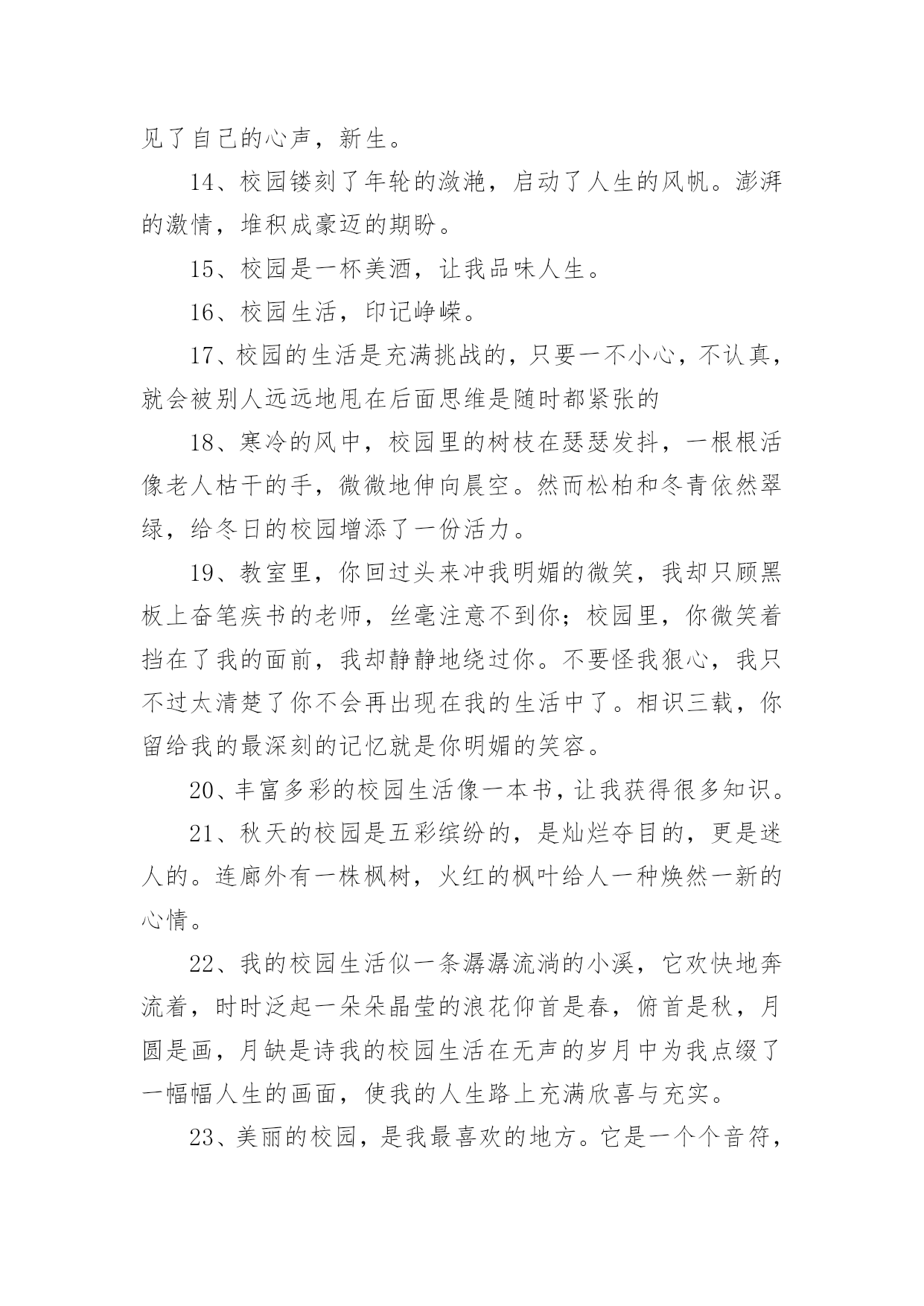 美好校园生活的短句美好校园生活的短句校园里每一个角落都充满了勃勃生机。看,那个墙角下,几个学生在讨论一些问题;瞧,这颗树底下,几个孩子在快乐的游戏。校园是我们学习生活的乐土。以下是小编为大家整理的美好校园生活的短句(精选100句),欢迎大家借鉴与参考,希望对大家有所帮助。1、在校园里,不仅充满了鸟语花香,绿树成荫,而且错落有致的教学楼更是平添了一份美景。2、校园是我人生的道路,校园是我的前途,校园是我的生命,校园是我的家。3、校园的生活是精彩的,那婀娜的舞姿;激动的比赛;然而愈难愈兴奋的奥赛题,受益匪浅的文章;更有有趣的文章。4、又见熟悉的朋友笑脸,又见往日校园的花草,一切都那么亲切,美好,回到学校的感觉真好。朋友,开学快乐,好好学习!5、光阴似箭,日月如梭,一年一度的六一儿童节踏着轻轻的脚步再次来临。早晨,我们兴高采烈.谈笑风生地走进了校园,不知不觉中响起了我们那清脆又优美的校歌,同学们发出一阵银铃般的笑声,露出一张张可爱的笑脸。6、秋天的校园仍旧光彩宜人,树依旧是那么绿;花儿好象不知道深秋已经来了,依旧竟香开放,依旧用它那芳香吸引着只只蜜蜂;蝴蝶依旧在校园里翩翩起舞,依旧用它那美丽的身影吸引着班级同学们的目光。7、每当第一缕阳光射进校园时,我们便高高兴兴地来到校园,一进校园,迎面而来的是一排排树木,瞧!这儿有梧桐,那儿有松柏,操场上遍地都是嫩绿的小草,它们仿佛都要把自己绿色献给校园。我觉得校园像一个美丽植物园。8、走进校园,枯黄的枝叶纷纷住下落,就像一只只翩翩起舞的蝴蝶,在自由地飞舞着,但是越"飞","蝴蝶"越往下落。落到地上,像给大地披上了金黄色的秋装,美丽极了!9、校园的生活是充实的,上课铃响,学生都将饱满的学习热情释放出来,迎接新的挑战下课铃响,同学们在操场间活动,如那新生的鸟儿,仿佛他就是下一个刘翔,姚明有些同学还在温习这堂课所学的知识,仿佛他就是下一个爱因斯坦与爱丁顿校园内的学生的每一天的生活都充满了乐趣和斗志,让外来人都认为这里的学生都不愿服输,不愿比任何人差10、校园是一盆炭火,温暖着我的身心。11、校园里的时光,总是难得美好。来之不易所以格外珍惜。勤恳,自由,尊崇。日子这样过去便很好。12、校园的一角,美丽的一角,生活在这里,我们快乐!13、我听见了校园广播的音乐,远处拆房队的挖掘机的声响,马路上汽车的鸣笛声此刻,我面对宁静的自然,我听见了自己的心声,新生。14、校园镂刻了年轮的潋滟,启动了人生的风帆。澎湃的激情,堆积成豪迈的期盼。15、校园是一杯美酒,让我品味人生。16、校园生活,印记峥嵘。17、校园的生活是充满挑战的,只要一不小心,不认真,就会被别人远远地甩在后面思维是随时都紧张的18、寒冷的风中,校园里的树枝在瑟瑟发抖,一根根活像老人枯干的手,微微地伸向晨空。然而松柏和冬青依然翠绿,给冬日的校园增添了一份活力。19、教室里,你回过头来冲我明媚的微笑,我却只顾黑板上奋笔疾书的老师,丝毫注意不到你;校园里,你微笑着挡在了我的面前,我却静静地绕过你。不要怪我狠心,我只不过太清楚了你不会再出现在我的生活中了。相识三载,你留给我的最深刻的记忆就是你明媚的笑容。20、丰富多彩的校园生活像一本书,让我获得很多知识。21、秋天的校园是五彩缤纷的,是灿烂夺目的,更是迷人的。连廊外有一株枫树,火红的枫叶给人一种焕然一新的心情。22、我的校园生活似一条潺潺流淌的小溪,它欢快地奔流着,时时泛起一朵朵晶莹的浪花仰首是春,俯首是秋,月圆是画,月缺是诗我的校园生活在无声的岁月中为我点缀了一幅幅人生的画面,使我的人生路上充满欣喜与充实。23、美丽的校园,是我最喜欢的地方。它是一个个音符,串联起我童年的梦想;它是只有魔法的大雁,带我领略大自然的美妙;它是我快乐的源泉,同样也使我学到许多知识。24、我们的校园里的操场宽阔平坦。那里的体育器具可真不少,单杠双杠木马爬竿等等,同学们可以在那里练臂力,练技巧,尽情地锻炼身体。每逢下午的课外活动课,或者第二课堂的活动时间,操场一片龙腾虎跃,热闹非凡,同学们的欢声笑语使校园充满了快乐。25、忆往昔,博学石旁,金中的一草一木,老师的'一颦一笑,仍记忆犹新。在那绿色的校园里,我们手握春光烂漫的年华,编织着人生的七彩之梦。26、这样的时光里,总会觉得生活真美。想有一天自己老了,也住在安静美丽的校园里,种很多的花,夏天的傍晚坐在外面,在晚风与花香中与别人聊天,悠闲地摇蒲扇,呵呵,这样的想法,是不是每个人在某一个瞬间都曾有过?27、我们有一个美丽、温馨、和谐的校园。学校里有耐心培养我们成长的敬爱的老师和团结友爱的同学,还有一年四季景色迷人,令我心旷神怡的优美环境。28、我们把青春浪费在校园里,把爱情埋葬在回忆里。29、校园里每一个角落都充满了勃勃生机。看,
