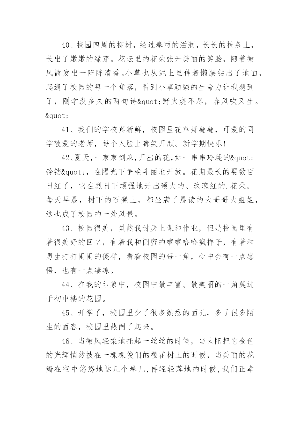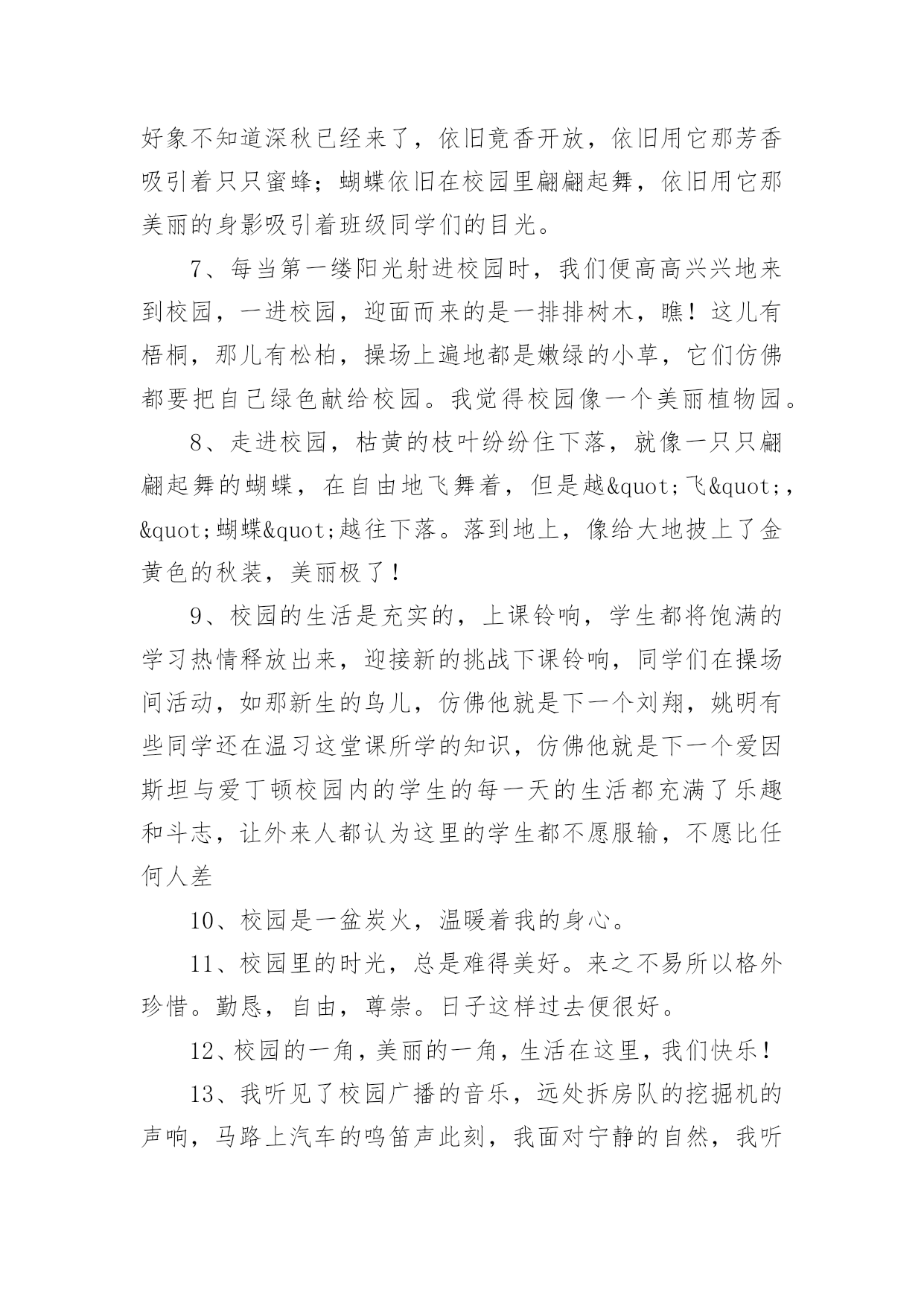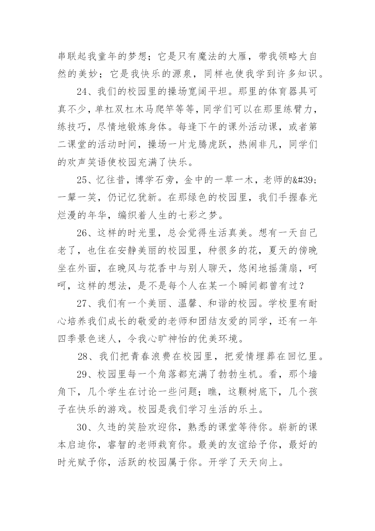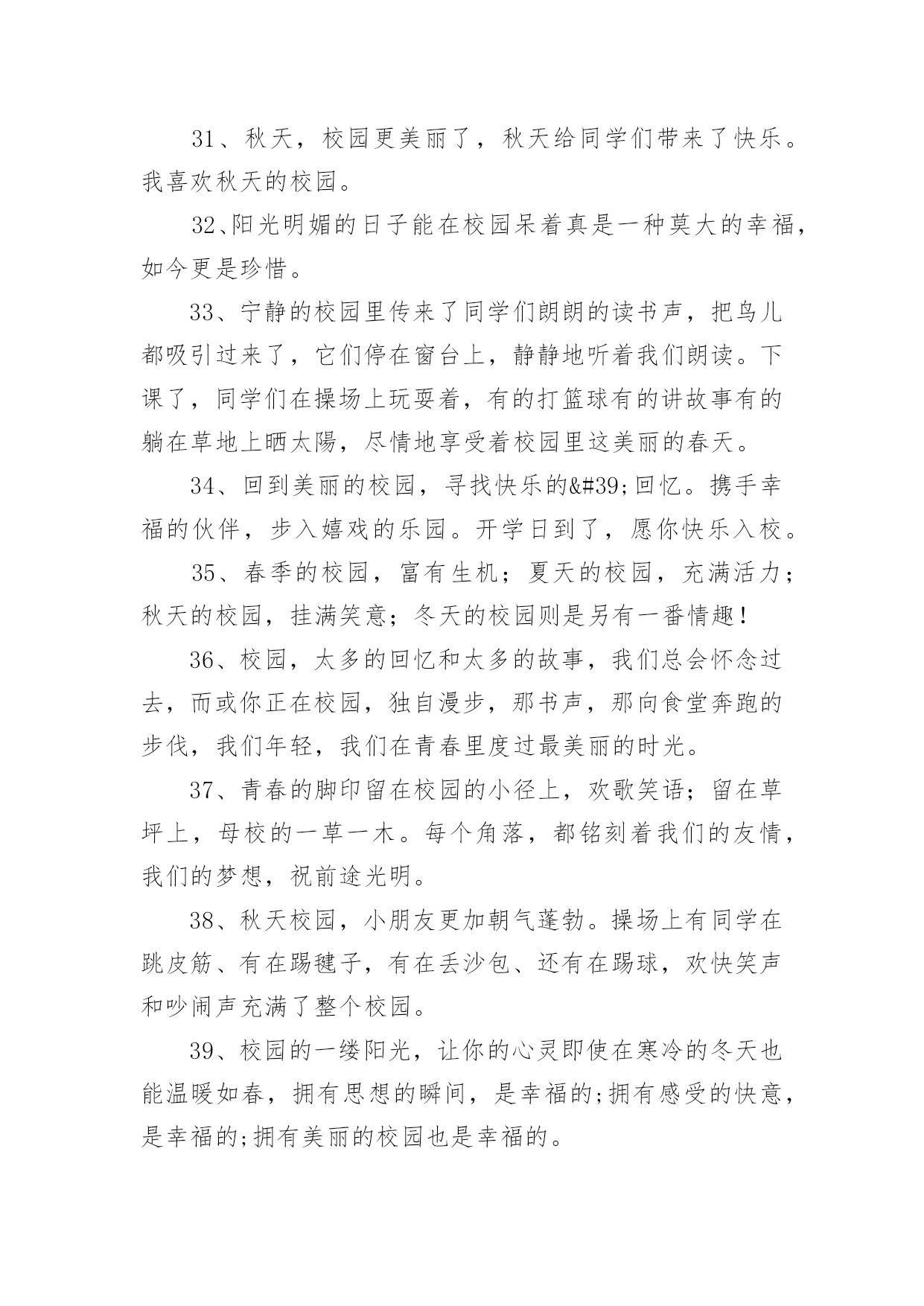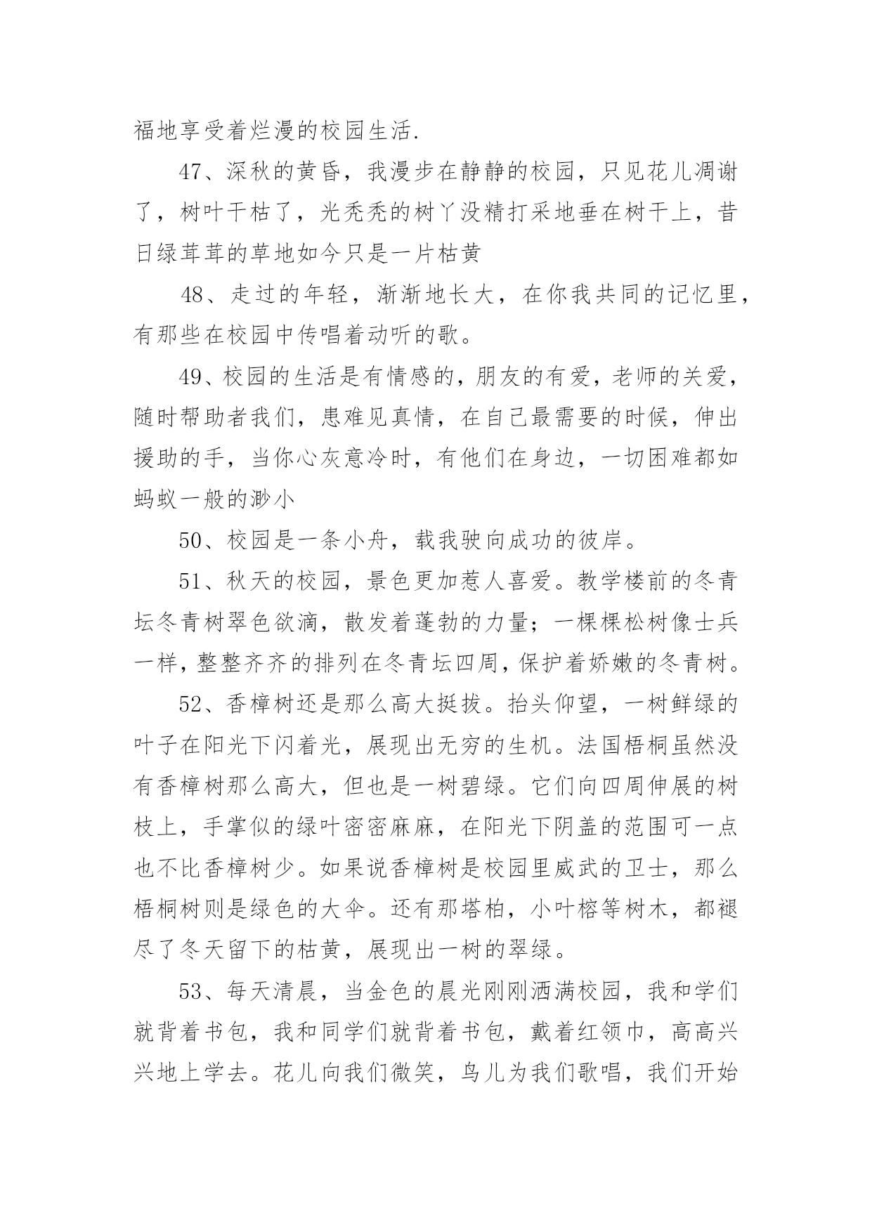 美好校园生活的短句美好校园生活的短句校园里每一个角落都充满了勃勃生机。看,那个墙角下,几个学生在讨论一些问题;瞧,这颗树底下,几个孩子在快乐的游戏。校园是我们学习生活的乐土。以下是小编为大家整理的美好校园生活的短句(精选100句),欢迎大家借鉴与参考,希望对大家有所帮助。1、在校园里,不仅充满了鸟语花香,绿树成荫,而且错落有致的教学楼更是平添了一份美景。2、校园是我人生的道路,校园是我的前途,校园是我的生命,校园是我的家。3、校园的生活是精彩的,那婀娜的舞姿;激动的比赛;然而愈难愈兴奋的奥赛题,受益匪浅的文章;更有有趣的文章。4、又见熟悉的朋友笑脸,又见往日校园的花草,一切都那么亲切,美好,回到学校的感觉真好。朋友,开学快乐,好好学习!5、光阴似箭,日月如梭,一年一度的六一儿童节踏着轻轻的脚步再次来临。早晨,我们兴高采烈.谈笑风生地走进了校园,不知不觉中响起了我们那清脆又优美的校歌,同学们发出一阵银铃般的笑声,露出一张张可爱的笑脸。6、秋天的校园仍旧光彩宜人,树依旧是那么绿;花儿好象不知道深秋已经来了,依旧竟香开放,依旧用它那芳香吸引着只只蜜蜂;蝴蝶依旧在校园里翩翩起舞,依旧用它那美丽的身影吸引着班级同学们的目光。7、每当第一缕阳光射进校园时,我们便高高兴兴地来到校园,一进校园,迎面而来的是一排排树木,瞧!这儿有梧桐,那儿有松柏,操场上遍地都是嫩绿的小草,它们仿佛都要把自己绿色献给校园。我觉得校园像一个美丽植物园。8、走进校园,枯黄的枝叶纷纷住下落,就像一只只翩翩起舞的蝴蝶,在自由地飞舞着,但是越"飞","蝴蝶"越往下落。落到地上,像给大地披上了金黄色的秋装,美丽极了!9、校园的生活是充实的,上课铃响,学生都将饱满的学习热情释放出来,迎接新的挑战下课铃响,同学们在操场间活动,如那新生的鸟儿,仿佛他就是下一个刘翔,姚明有些同学还在温习这堂课所学的知识,仿佛他就是下一个爱因斯坦与爱丁顿校园内的学生的每一天的生活都充满了乐趣和斗志,让外来人都认为这里的学生都不愿服输,不愿比任何人差10、校园是一盆炭火,温暖着我的身心。11、校园里的时光,总是难得美好。来之不易所以格外珍惜。勤恳,自由,尊崇。日子这样过去便很好。12、校园的一角,美丽的一角,生活在这里,我们快乐!13、我听见了校园广播的音乐,远处拆房队的挖掘机的声响,马路上汽车的鸣笛声此刻,我面对宁静的自然,我听见了自己的心声,新生。14、校园镂刻了年轮的潋滟,启动了人生的风帆。澎湃的激情,堆积成豪迈的期盼。15、校园是一杯美酒,让我品味人生。16、校园生活,印记峥嵘。17、校园的生活是充满挑战的,只要一不小心,不认真,就会被别人远远地甩在后面思维是随时都紧张的18、寒冷的风中,校园里的树枝在瑟瑟发抖,一根根活像老人枯干的手,微微地伸向晨空。然而松柏和冬青依然翠绿,给冬日的校园增添了一份活力。19、教室里,你回过头来冲我明媚的微笑,我却只顾黑板上奋笔疾书的老师,丝毫注意不到你;校园里,你微笑着挡在了我的面前,我却静静地绕过你。不要怪我狠心,我只不过太清楚了你不会再出现在我的生活中了。相识三载,你留给我的最深刻的记忆就是你明媚的笑容。20、丰富多彩的校园生活像一本书,让我获得很多知识。21、秋天的校园是五彩缤纷的,是灿烂夺目的,更是迷人的。连廊外有一株枫树,火红的枫叶给人一种焕然一新的心情。22、我的校园生活似一条潺潺流淌的小溪,它欢快地奔流着,时时泛起一朵朵晶莹的浪花仰首是春,俯首是秋,月圆是画,月缺是诗我的校园生活在无声的岁月中为我点缀了一幅幅人生的画面,使我的人生路上充满欣喜与充实。23、美丽的校园,是我最喜欢的地方。它是一个个音符,串联起我童年的梦想;它是只有魔法的大雁,带我领略大自然的美妙;它是我快乐的源泉,同样也使我学到许多知识。24、我们的校园里的操场宽阔平坦。那里的体育器具可真不少,单杠双杠木马爬竿等等,同学们可以在那里练臂力,练技巧,尽情地锻炼身体。每逢下午的课外活动课,或者第二课堂的活动时间,操场一片龙腾虎跃,热闹非凡,同学们的欢声笑语使校园充满了快乐。25、忆往昔,博学石旁,金中的一草一木,老师的'一颦一笑,仍记忆犹新。在那绿色的校园里,我们手握春光烂漫的年华,编织着人生的七彩之梦。26、这样的时光里,总会觉得生活真美。想有一天自己老了,也住在安静美丽的校园里,种很多的花,夏天的傍晚坐在外面,在晚风与花香中与别人聊天,悠闲地摇蒲扇,呵呵,这样的想法,是不是每个人在某一个瞬间都曾有过?27、我们有一个美丽、温馨、和谐的校园。学校里有耐心培养我们成长的敬爱的老师和团结友爱的同学,还有一年四季景色迷人,令我心旷神怡的优美环境。28、我们把青春浪费在校园里,把爱情埋葬在回忆里。29、校园里每一个角落都充满了勃勃生机。看,