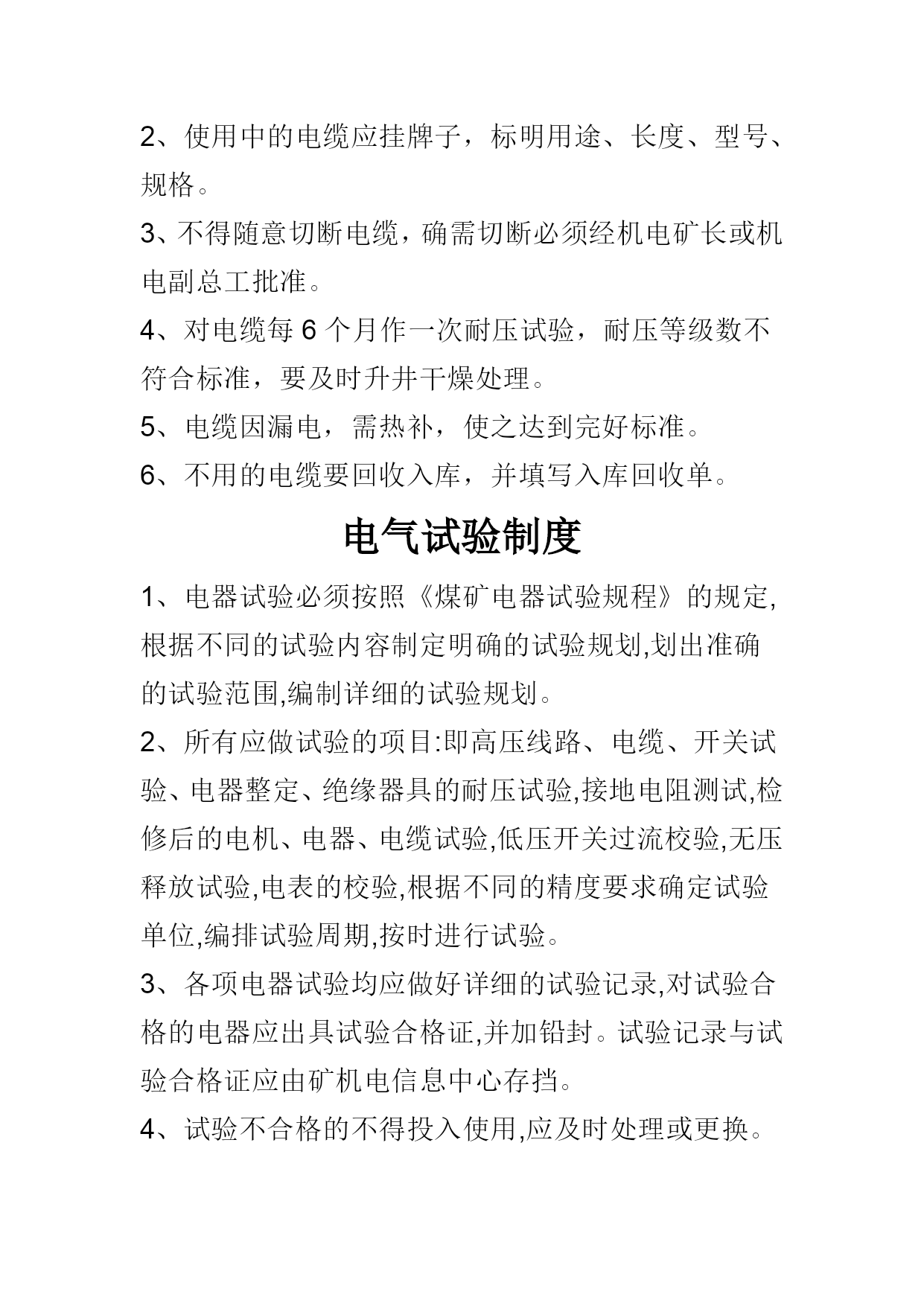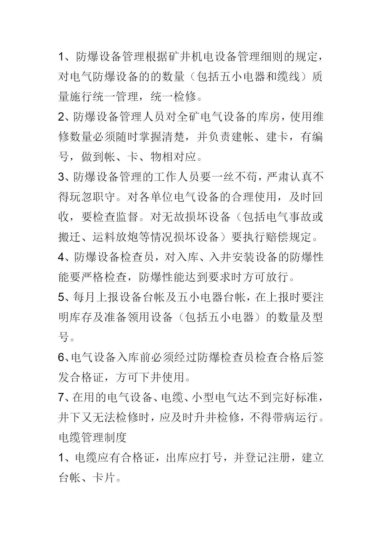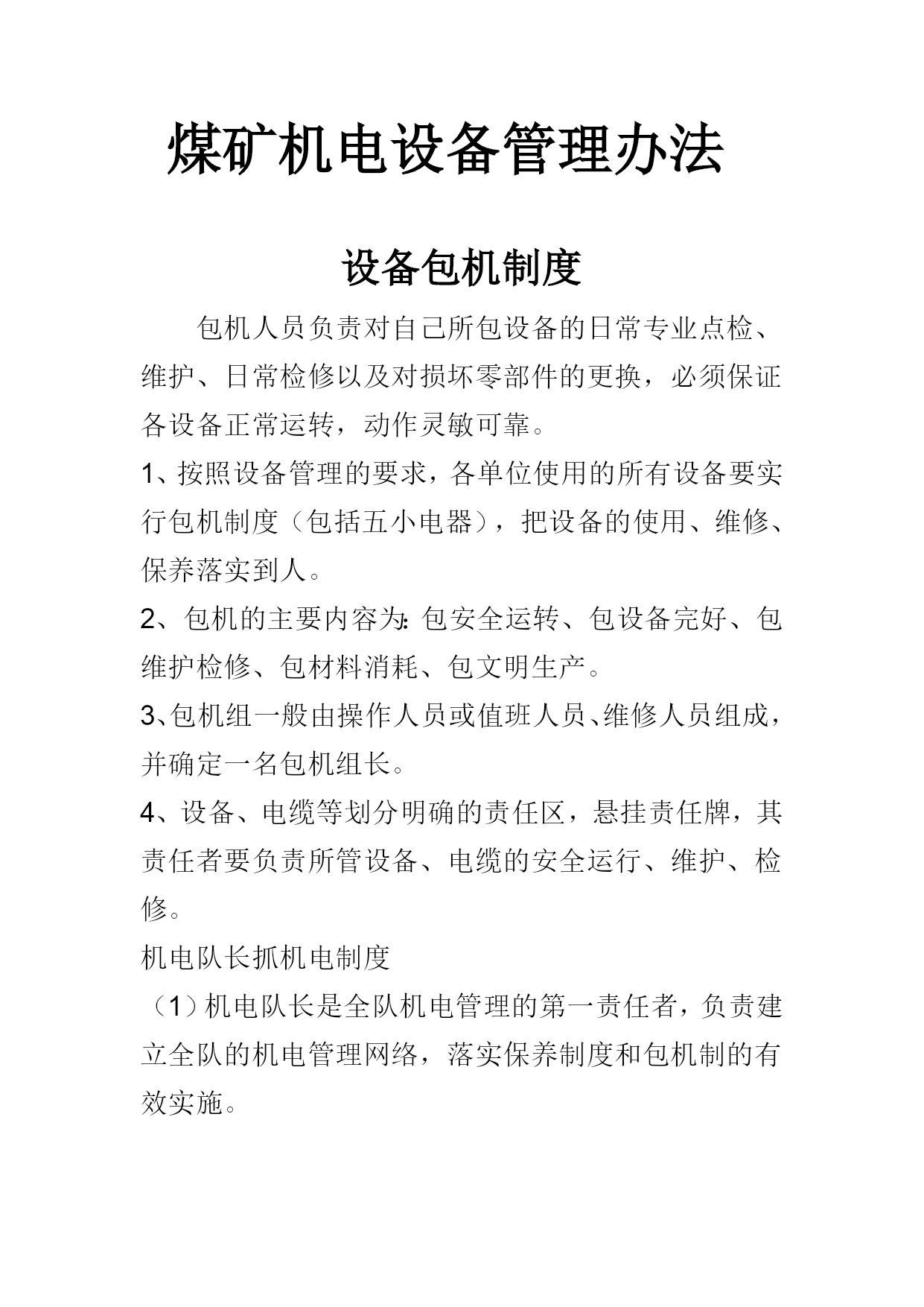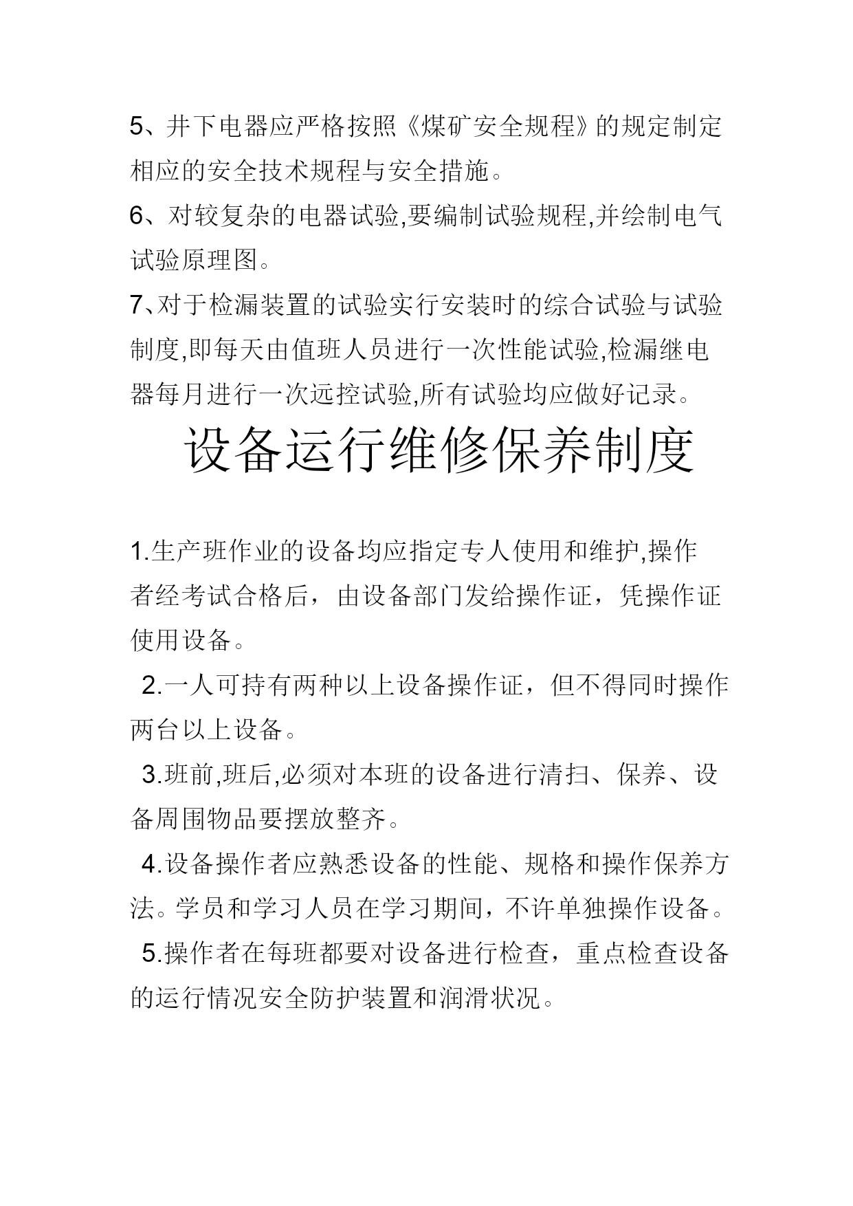 煤矿机电设备管理办法设备包机制度包机人员负责对自己所包设备的日常专业点检、维护、日常检修以及对损坏零部件的更换,必须保证各设备正常运转,动作灵敏可靠。1、按照设备管理的要求,各单位使用的所有设备要实行包机制度(包括五小电器),把设备的使用、维修、保养落实到人。2、包机的主要内容为:包安全运转、包设备完好、包维护检修、包材料消耗、包文明生产。3、包机组一般由操作人员或值班人员、维修人员组成,并确定一名包机组长。4、设备、电缆等划分明确的责任区,悬挂责任牌,其责任者要负责所管设备、电缆的安全运行、维护、检修。机电队长抓机电制度(1)机电队长是全队机电管理的第一责任者,负责建立全队的机电管理网络,落实保养制度和包机制的有效实施。(2)机电队长必须加强机电业务能力的提高和机电基础理论的学习,要全面掌握所使用设备的结构、性能、原理。在生产组织上,必须保证设备的正确合理使用,实现正规循环作业。对全队的机电设备进行一次全面检查,每半月对配件的计划、组织进行全面落实,及时提交紧急配件和下月的配件计划以及季、年的配件编报工作进行督促、审批。(3)机电队长必须组织全队人员对本矿各项机电管理规章、制度和办法进行认真贯彻学习,全面组织落实,并随时提出合理的修改意见;每半年对班组长进行一次机电、设备管理、专业业务知识考试。每月组织班组长以上的干部,对照各项机电管理制度,对本队的工作进行一次全面检查落实,并对下月机电管理重点进行安排;每周组织召开一次机电(安全)例会,每月召开一次机电专题会,对矿上检查提出的问题及时安排整改,并将检查结果报请矿上复查。(4)机电队长要重视机电技术骨干的培养、使用、管理,使其在各自岗位上充分发挥技术优势,要对拔尖人才给予优惠待遇。机电队长要结合本队实际,切实落实节支将耗措施。班长抓机电制度(1)班长是当班机电管理的第一责任者,负责组建本班组的机电管理小组。在生产中必须有效组织和规范本班职工严格遵守操作规程,杜绝蛮干、拼设备的行为,生产组织以使用好、维护好、保养好设备为前提,教育职工爱护设备。(2)班长必须提高业务能力,全面掌握所使用设备的结构、性能、原理,对主要机械设备能进行操作,能排除一般性故障。(3)班长必须组织全班人员全面落实本矿的机电管理制度以及队里的各项要求。班长在班前要了解机电设备的运转情况,根据设备的状况组织生产和维修;班长要对本班设备的维护使用、运转情况进行详细记录,并向下班认真交接,有情况及时向队里汇报。(4)班长要重视机电人才的培养、使用、管理,使其在生产岗位上真正发挥作用。(5)班长必须执行各级检查人员针对机电设备运行状况提出的整改意见,保证设备在完好的状态下运行。班长必须认真落实矿、队关于节支降耗的各项规定。防爆设备及小型电器管理制度1、防爆设备管理根据矿井机电设备管理细则的规定,对电气防爆设备的的数量(包括五小电器和缆线)质量施行统一管理,统一检修。2、防爆设备管理人员对全矿电气设备的库房,使用维修数量必须随时掌握清楚,并负责建帐、建卡,有编号,做到帐、卡、物相对应。3、防爆设备管理的工作人员要一丝不苟,严肃认真不得玩忽职守。对各单位电气设备的合理使用,及时回收,要检查监督。对无故损坏设备(包括电气事故或搬迁、运料放炮等情况损坏设备)要执行赔偿规定。4、防爆设备检查员,对入库、入井安装设备的防爆性能要严格检查,防爆性能达到要求时方可放行。5、每月上报设备台帐及五小电器台帐,在上报时要注明库存及准备领用设备(包括五小电器)的数量及型号。6、电气设备入库前必须经过防爆检查员检查合格后签发合格证,方可下井使用。7、在用的电气设备、电缆、小型电气达不到完好标准,井下又无法检修时,应及时升井检修,不得带病运行。电缆管理制度1、电缆应有合格证,出库应打号,并登记注册,建立台帐、卡片。2、使用中的电缆应挂牌子,标明用途、长度、型号、规格。3、不得随意切断电缆,确需切断必须经机电矿长或机电副总工批准。4、对电缆每6个月作一次耐压试验,耐压等级数不符合标准,要及时升井干燥处理。5、电缆因漏电,需热补,使之达到完好标准。6、不用的电缆要回收入库,并填写入库回收单。电气试验制度1、电器试验必须按照《煤矿电器试验规程》的规定,根据不同的试验内容制定明确的试验规划,划出准确的试验范围,编制详细的试验规划。2、所有应做试验的项目:即高压线路、电缆、开关试验、电器整定、绝缘器具的耐压试验,接地电阻测试,检修后的电机、电器、电缆试验,低压开关过流校验,无压释放试验,电表的校验,根据不同的精度要求确定试验单位,编排试验周期,按时进行试验。3、各项电器试验均应做好详细的试验记录,对试验合格的电器应出具试验合格证,并加铅封。试验记录与试验合格证应由矿机电信息中心