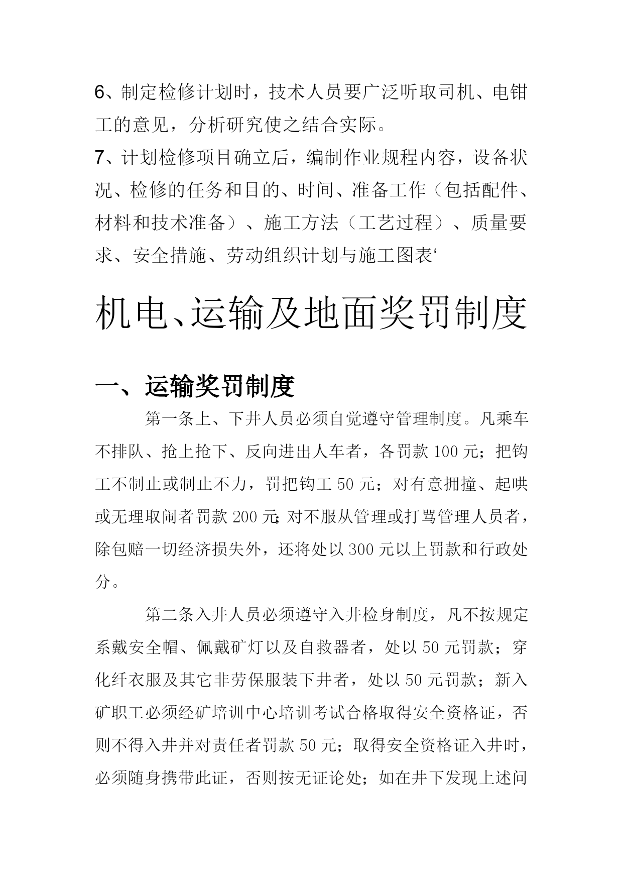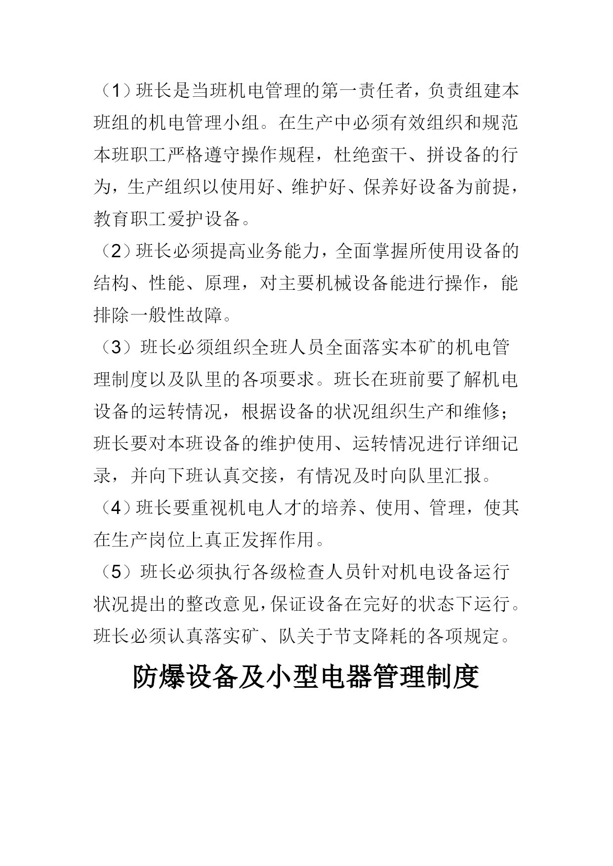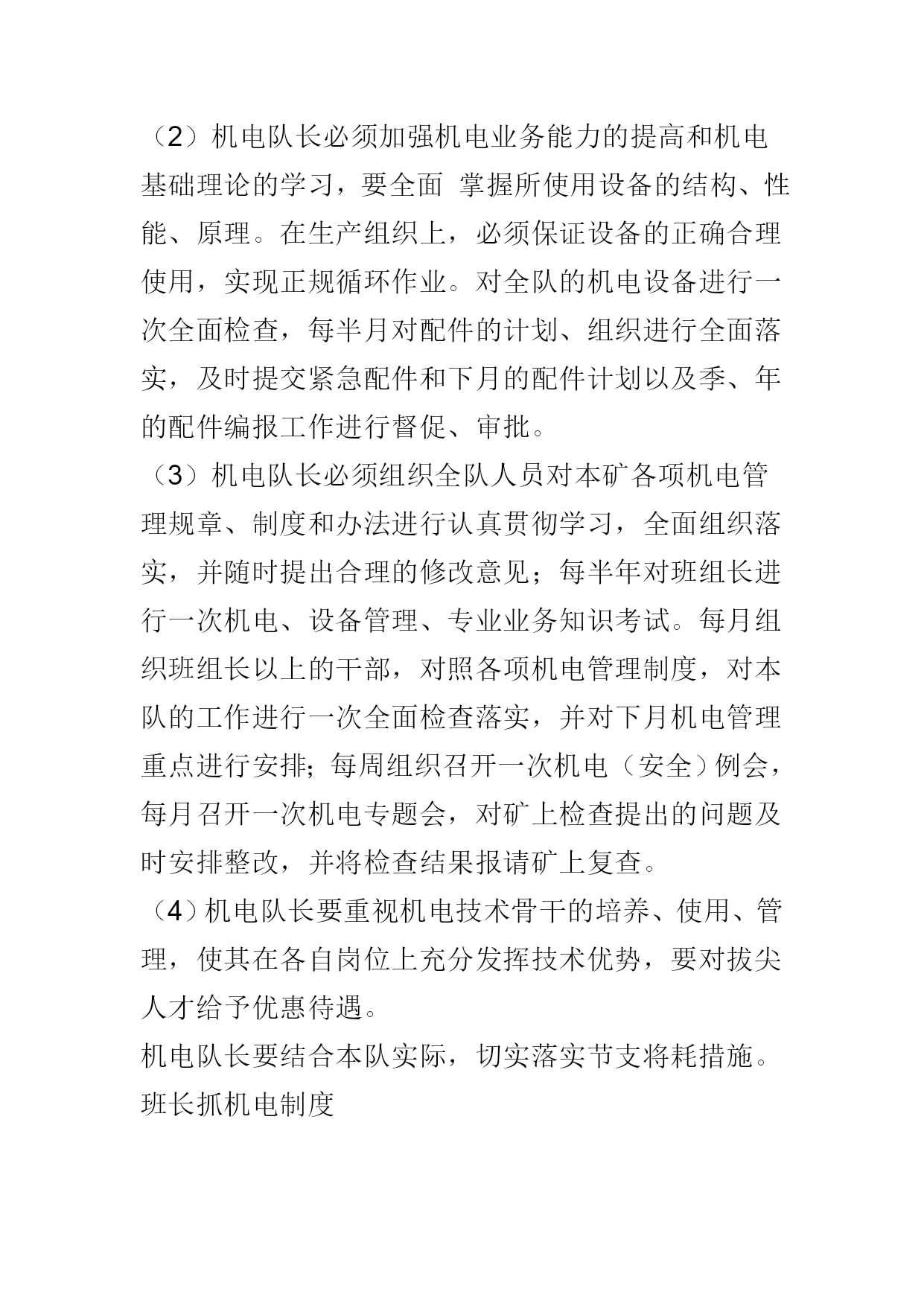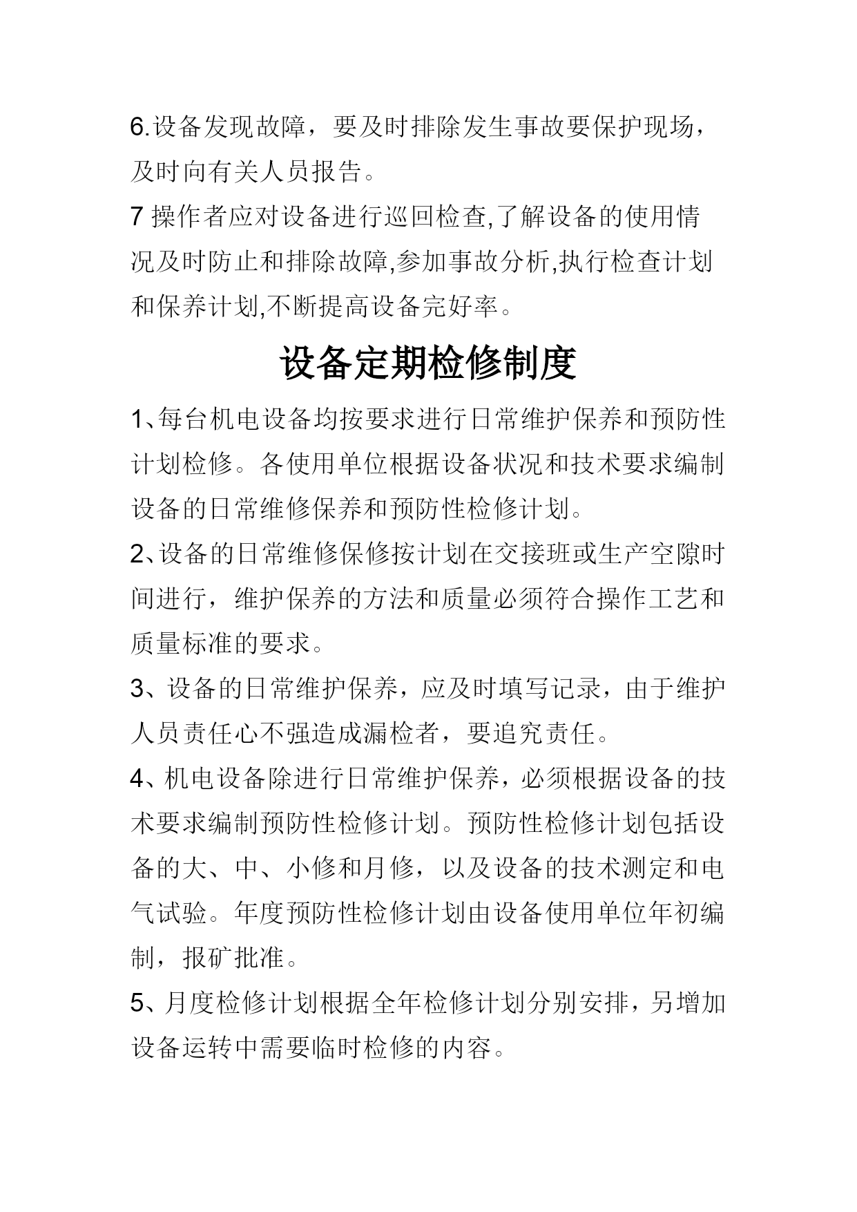 煤矿机电设备管理办法设备包机制度包机人员负责对自己所包设备的日常专业点检、维护、日常检修以及对损坏零部件的更换,必须保证各设备正常运转,动作灵敏可靠。1、按照设备管理的要求,各单位使用的所有设备要实行包机制度(包括五小电器),把设备的使用、维修、保养落实到人。2、包机的主要内容为:包安全运转、包设备完好、包维护检修、包材料消耗、包文明生产。3、包机组一般由操作人员或值班人员、维修人员组成,并确定一名包机组长。4、设备、电缆等划分明确的责任区,悬挂责任牌,其责任者要负责所管设备、电缆的安全运行、维护、检修。机电队长抓机电制度(1)机电队长是全队机电管理的第一责任者,负责建立全队的机电管理网络,落实保养制度和包机制的有效实施。(2)机电队长必须加强机电业务能力的提高和机电基础理论的学习,要全面掌握所使用设备的结构、性能、原理。在生产组织上,必须保证设备的正确合理使用,实现正规循环作业。对全队的机电设备进行一次全面检查,每半月对配件的计划、组织进行全面落实,及时提交紧急配件和下月的配件计划以及季、年的配件编报工作进行督促、审批。(3)机电队长必须组织全队人员对本矿各项机电管理规章、制度和办法进行认真贯彻学习,全面组织落实,并随时提出合理的修改意见;每半年对班组长进行一次机电、设备管理、专业业务知识考试。每月组织班组长以上的干部,对照各项机电管理制度,对本队的工作进行一次全面检查落实,并对下月机电管理重点进行安排;每周组织召开一次机电(安全)例会,每月召开一次机电专题会,对矿上检查提出的问题及时安排整改,并将检查结果报请矿上复查。(4)机电队长要重视机电技术骨干的培养、使用、管理,使其在各自岗位上充分发挥技术优势,要对拔尖人才给予优惠待遇。机电队长要结合本队实际,切实落实节支将耗措施。班长抓机电制度(1)班长是当班机电管理的第一责任者,负责组建本班组的机电管理小组。在生产中必须有效组织和规范本班职工严格遵守操作规程,杜绝蛮干、拼设备的行为,生产组织以使用好、维护好、保养好设备为前提,教育职工爱护设备。(2)班长必须提高业务能力,全面掌握所使用设备的结构、性能、原理,对主要机械设备能进行操作,能排除一般性故障。(3)班长必须组织全班人员全面落实本矿的机电管理制度以及队里的各项要求。班长在班前要了解机电设备的运转情况,根据设备的状况组织生产和维修;班长要对本班设备的维护使用、运转情况进行详细记录,并向下班认真交接,有情况及时向队里汇报。(4)班长要重视机电人才的培养、使用、管理,使其在生产岗位上真正发挥作用。(5)班长必须执行各级检查人员针对机电设备运行状况提出的整改意见,保证设备在完好的状态下运行。班长必须认真落实矿、队关于节支降耗的各项规定。防爆设备及小型电器管理制度1、防爆设备管理根据矿井机电设备管理细则的规定,对电气防爆设备的的数量(包括五小电器和缆线)质量施行统一管理,统一检修。2、防爆设备管理人员对全矿电气设备的库房,使用维修数量必须随时掌握清楚,并负责建帐、建卡,有编号,做到帐、卡、物相对应。3、防爆设备管理的工作人员要一丝不苟,严肃认真不得玩忽职守。对各单位电气设备的合理使用,及时回收,要检查监督。对无故损坏设备(包括电气事故或搬迁、运料放炮等情况损坏设备)要执行赔偿规定。4、防爆设备检查员,对入库、入井安装设备的防爆性能要严格检查,防爆性能达到要求时方可放行。5、每月上报设备台帐及五小电器台帐,在上报时要注明库存及准备领用设备(包括五小电器)的数量及型号。6、电气设备入库前必须经过防爆检查员检查合格后签发合格证,方可下井使用。7、在用的电气设备、电缆、小型电气达不到完好标准,井下又无法检修时,应及时升井检修,不得带病运行。电缆管理制度1、电缆应有合格证,出库应打号,并登记注册,建立台帐、卡片。2、使用中的电缆应挂牌子,标明用途、长度、型号、规格。3、不得随意切断电缆,确需切断必须经机电矿长或机电副总工批准。4、对电缆每6个月作一次耐压试验,耐压等级数不符合标准,要及时升井干燥处理。5、电缆因漏电,需热补,使之达到完好标准。6、不用的电缆要回收入库,并填写入库回收单。电气试验制度1、电器试验必须按照《煤矿电器试验规程》的规定,根据不同的试验内容制定明确的试验规划,划出准确的试验范围,编制详细的试验规划。2、所有应做试验的项目:即高压线路、电缆、开关试验、电器整定、绝缘器具的耐压试验,接地电阻测试,检修后的电机、电器、电缆试验,低压开关过流校验,无压释放试验,电表的校验,根据不同的精度要求确定试验单位,编排试验周期,按时进行试验。3、各项电器试验均应做好详细的试验记录,对试验合格的电器应出具试验合格证,并加铅封。试验记录与试验合格证应由矿机电信息中心
