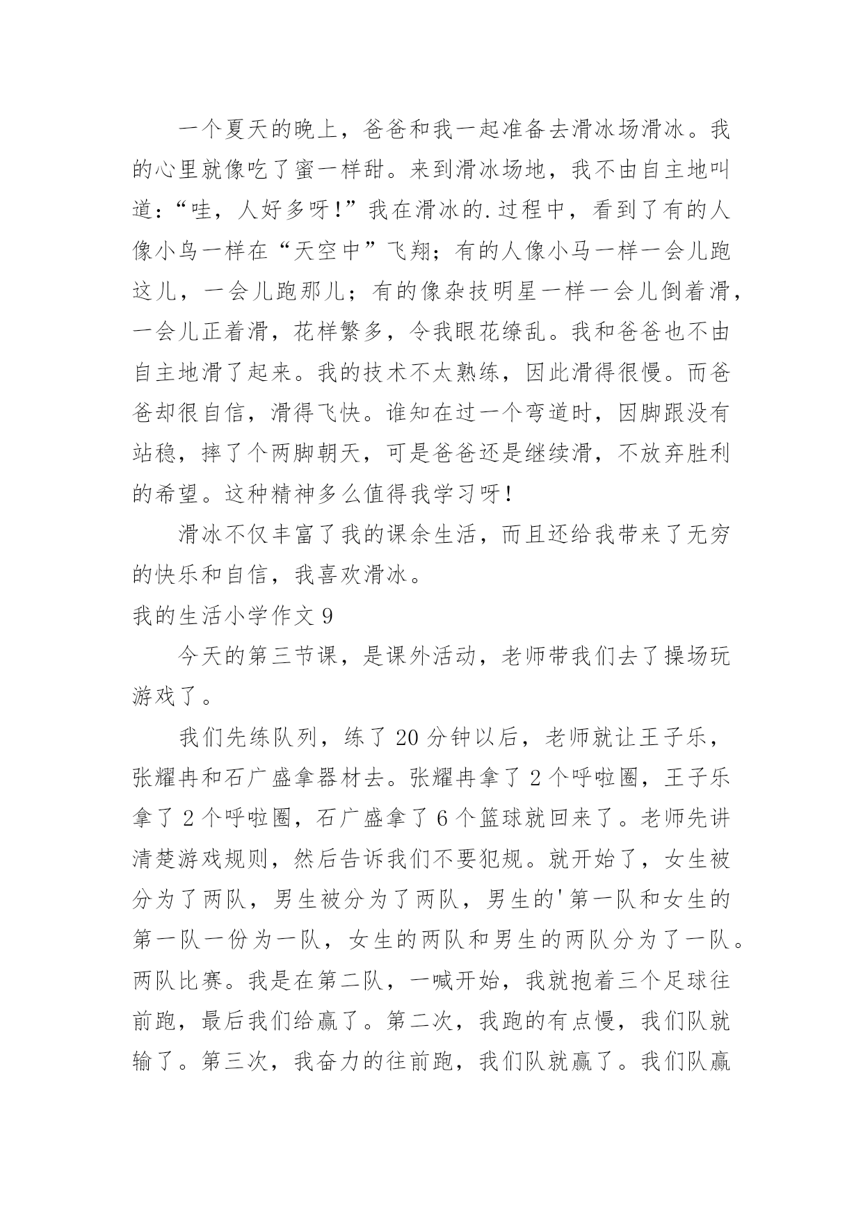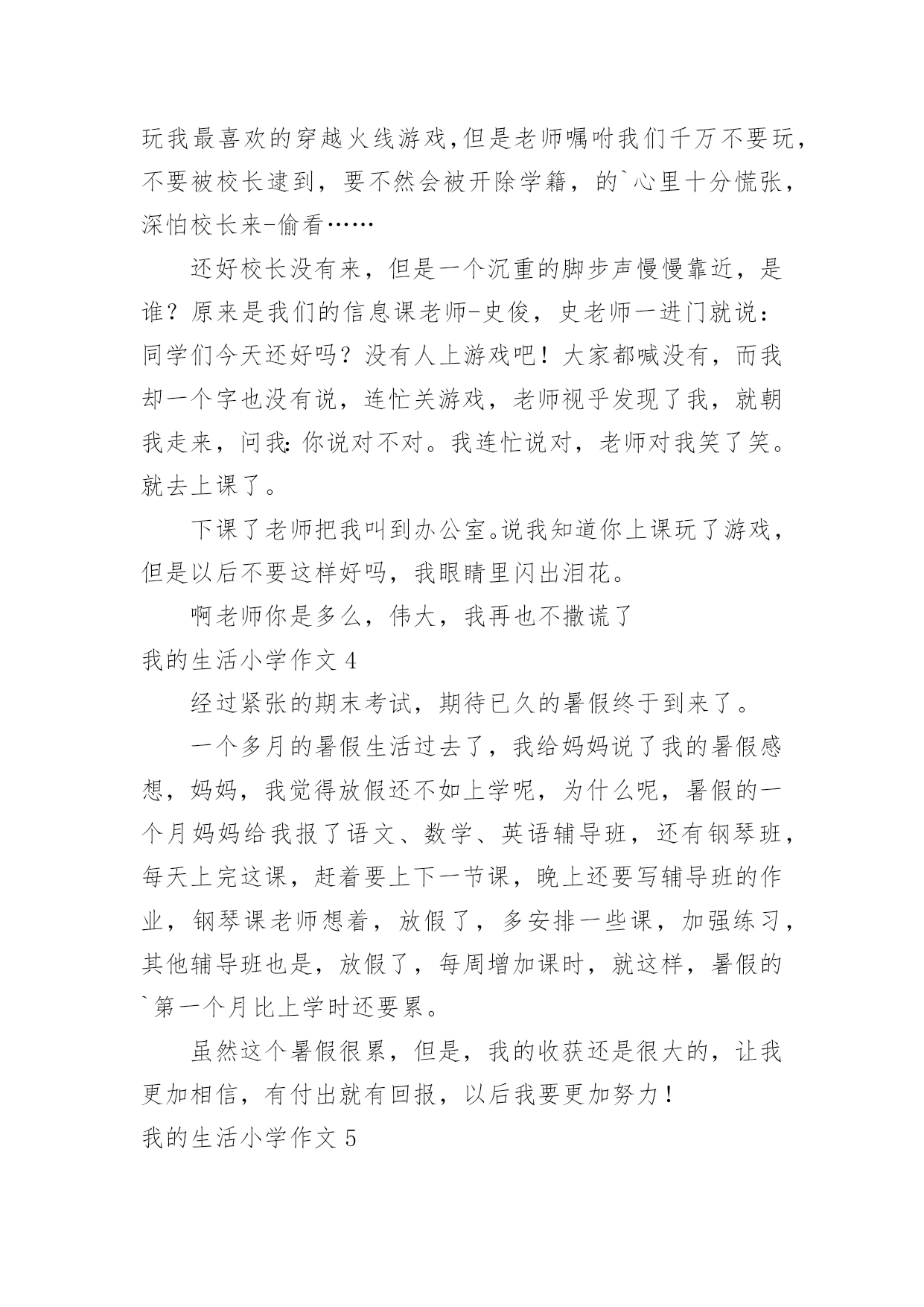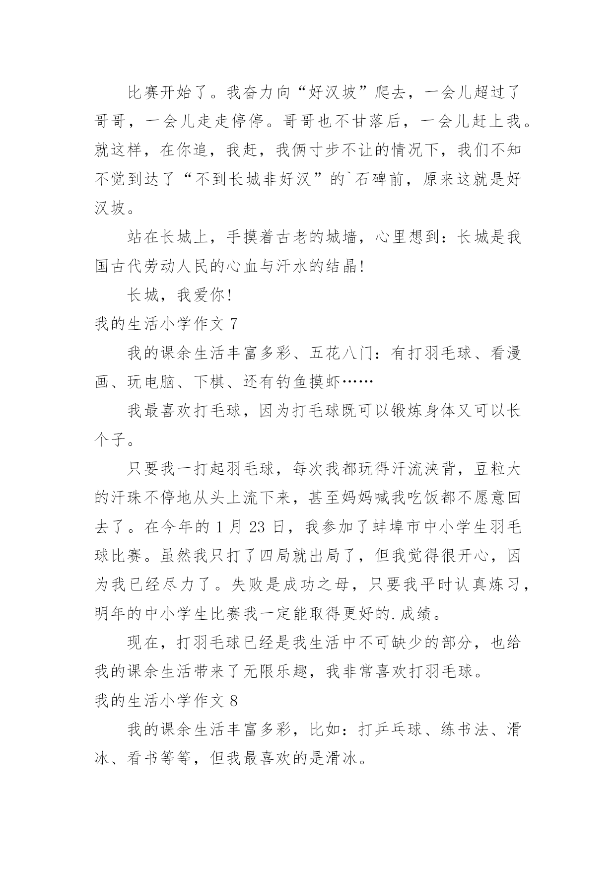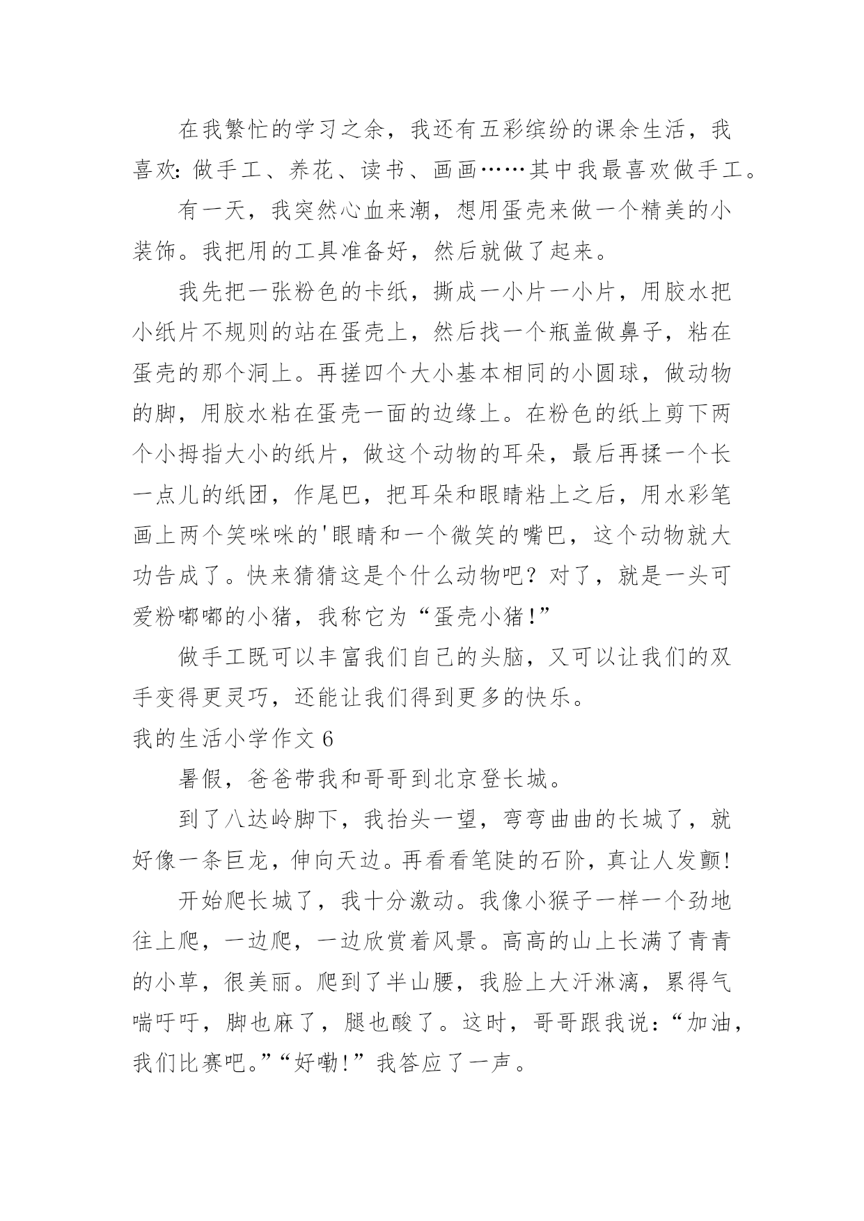 我的生活小学作文我的生活小学作文在日常生活或是工作学习中,大家都不可避免地会接触到作文吧,写作文是培养人们的观察力、联想力、想象力、思考力和记忆力的重要手段。你知道作文怎样才能写的好吗?下面是小编帮大家整理的我的生活小学作文,仅供参考,欢迎大家阅读。我的生活小学作文1今年暑假,我结束了我的幼儿园生活,开始了我期待很久的小学生活。第一天上学校的时候,我既开心、好奇,又有点儿害怕、紧张,怕交不到新朋友。慢慢地,我喜欢上了我的小学生活,因为我不仅交到许多新朋友,还认识了新的老师。我很喜欢我的老师们,是她们让我学到了很多新的知识。我的语文老师教我们学习拼音还有汉字,让我们养成阅读的好习惯;数学老师教我们数学题,让我学会开动脑筋;音乐老师教我们唱很多好听的歌;科学老师带我们认识了很多身体方面的小秘密;美术老师教我们很多画画的'技巧。哦,还有我们的体育老师,让我们锻炼身体,告诉我们:少年强,则国强!哇,我们的老师真多呀!我们的老师本领也非常大!我们的小学生活是那么的丰富多彩!它让我感觉自己长大了。我喜欢美丽的学校,我喜欢漂亮的老师和可爱的同学。我为我是一名小学生而感到骄傲!我的生活小学作文2盼望已久的寒假终于来了,我特别高兴。虽然放了寒假,但学习是不可以丢掉的。每天早晨八点我准时起床,洗刷完毕后开始晨读。我晨读的内容很丰富,有古诗,有美文,还有课外书籍的积累。早饭后姥姥带我去采购年货。来到超市,这里的人可真多呀,买东西都要排队。不过物品却很全。吃的、玩的、用的琳琅满目,看得我眼花缭乱。我们顺着人流往前走,先买了鱼,姥姥说这意味着“年年有余”。又买了肉、青菜、水果等一大包东西,全是吃的'。随后我们又买了很多鞭炮和几副春联。中午,姥姥做了一大桌子香喷喷的饭菜,让人看着就直流口水。一家人围在一起,边吃边喝边聊天,其乐融融。时间过得真快,转眼间一个寒假就过去了,但寒假给我带来的快乐与收获却是令人难忘的。我的生活小学作文3在我很小的时候,我妈妈就告诉我做人要诚实,但是有一次让我十分后悔。啊!要迟到了,怎么了今天上午家里怎么没人,可能都出去了吧!我急忙穿好衣服去上学但是,我心里十分乱,啊到了学校,今天是信息课,可是老师没有来的时候,我却在玩我最喜欢的穿越火线游戏,但是老师嘱咐我们千万不要玩,不要被校长逮到,要不然会被开除学籍,的`心里十分慌张,深怕校长来-偷看……还好校长没有来,但是一个沉重的脚步声慢慢靠近,是谁?原来是我们的信息课老师-史俊,史老师一进门就说:同学们今天还好吗?没有人上游戏吧!大家都喊没有,而我却一个字也没有说,连忙关游戏,老师视乎发现了我,就朝我走来,问我:你说对不对。我连忙说对,老师对我笑了笑。就去上课了。下课了老师把我叫到办公室。说我知道你上课玩了游戏,但是以后不要这样好吗,我眼睛里闪出泪花。啊老师你是多么,伟大,我再也不撒谎了我的生活小学作文4经过紧张的期末考试,期待已久的暑假终于到来了。一个多月的暑假生活过去了,我给妈妈说了我的暑假感想,妈妈,我觉得放假还不如上学呢,为什么呢,暑假的一个月妈妈给我报了语文、数学、英语辅导班,还有钢琴班,每天上完这课,赶着要上下一节课,晚上还要写辅导班的作业,钢琴课老师想着,放假了,多安排一些课,加强练习,其他辅导班也是,放假了,每周增加课时,就这样,暑假的`第一个月比上学时还要累。虽然这个暑假很累,但是,我的收获还是很大的,让我更加相信,有付出就有回报,以后我要更加努力!我的生活小学作文5在我繁忙的学习之余,我还有五彩缤纷的课余生活,我喜欢:做手工、养花、读书、画画……其中我最喜欢做手工。有一天,我突然心血来潮,想用蛋壳来做一个精美的小装饰。我把用的工具准备好,然后就做了起来。我先把一张粉色的卡纸,撕成一小片一小片,用胶水把小纸片不规则的站在蛋壳上,然后找一个瓶盖做鼻子,粘在蛋壳的那个洞上。再搓四个大小基本相同的小圆球,做动物的脚,用胶水粘在蛋壳一面的边缘上。在粉色的纸上剪下两个小拇指大小的纸片,做这个动物的耳朵,最后再揉一个长一点儿的纸团,作尾巴,把耳朵和眼睛粘上之后,用水彩笔画上两个笑咪咪的'眼睛和一个微笑的嘴巴,这个动物就大功告成了。快来猜猜这是个什么动物吧?对了,就是一头可爱粉嘟嘟的小猪,我称它为“蛋壳小猪!”做手工既可以丰富我们自己的头脑,又可以让我们的双手变得更灵巧,还能让我们得到更多的快乐。我的生活小学作文6暑假,爸爸带我和哥哥到北京登长城。到了八达岭脚下,我抬头一望,弯弯曲曲的长城了,就好像一条巨龙,伸向天边。再看看笔陡的石阶,真让人发颤!开始爬长城了,我十分激动。我像小猴子一样一个劲地往上爬,一边爬,一边欣赏着风景。高高的山上长满了青青的小草,很美丽。爬到了半山腰,我脸上大汗淋漓,累得气喘吁吁,脚也麻了,腿也酸了。这时,哥哥跟我说:“加油,我们比赛吧。”“好嘞!”我答