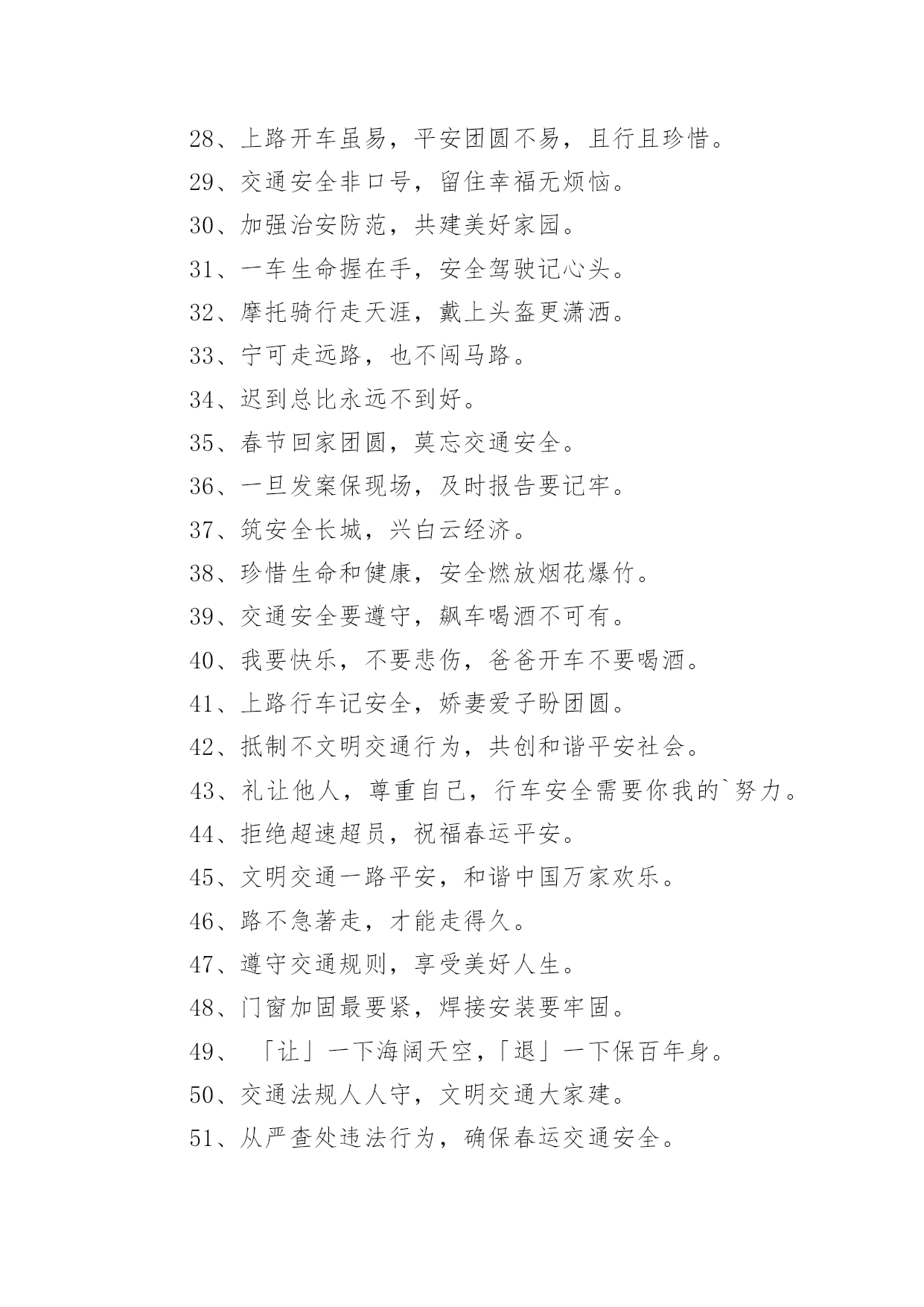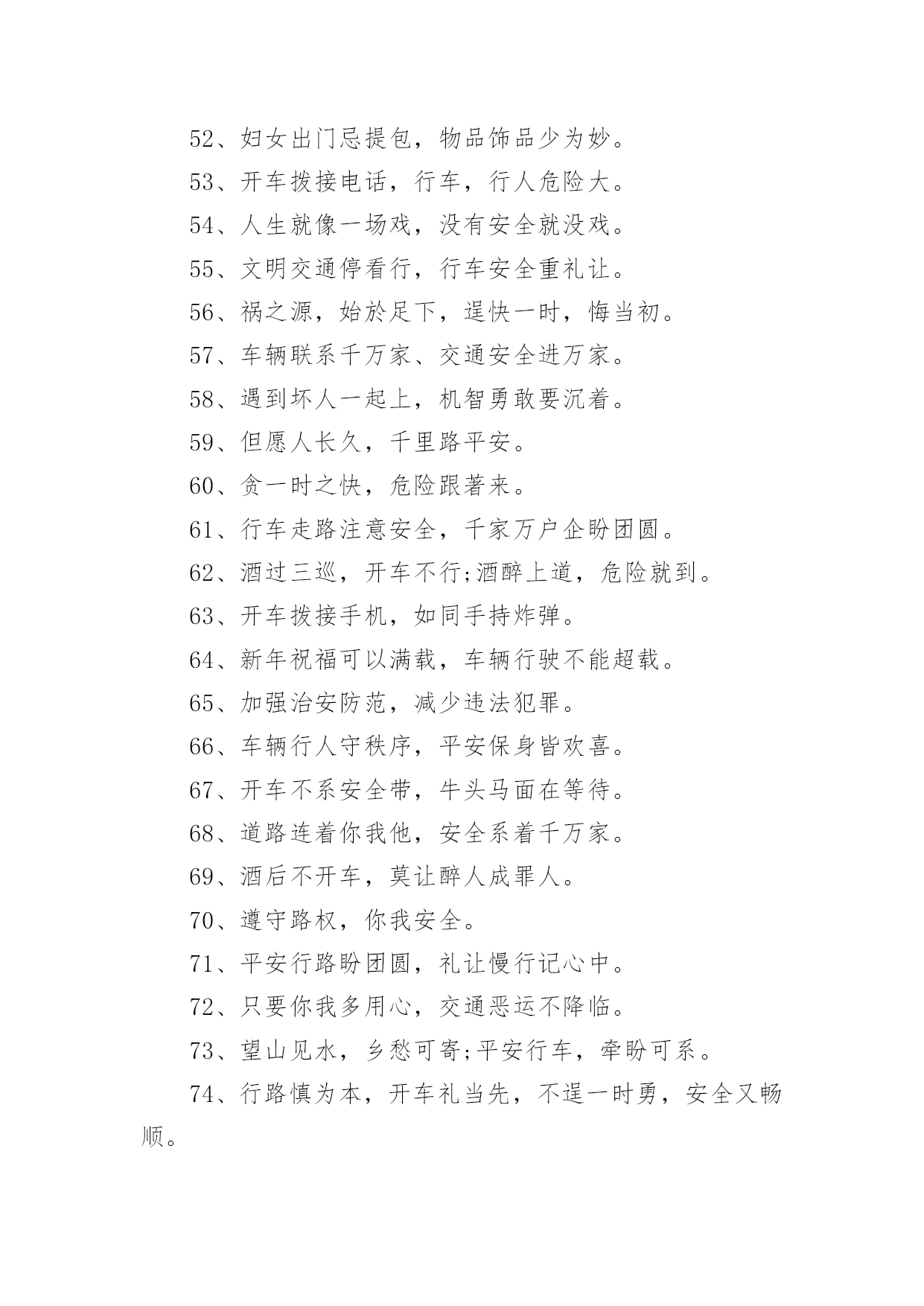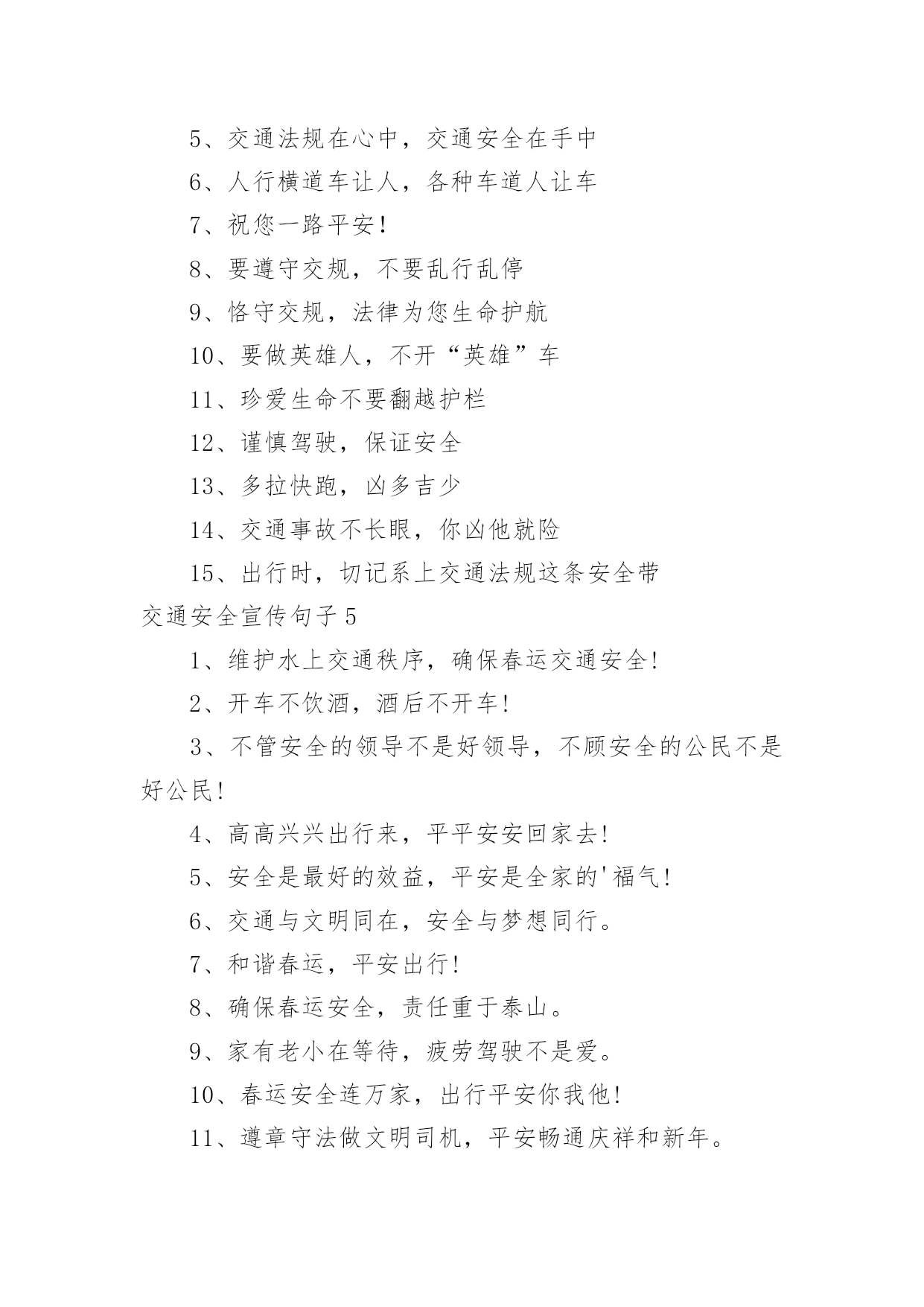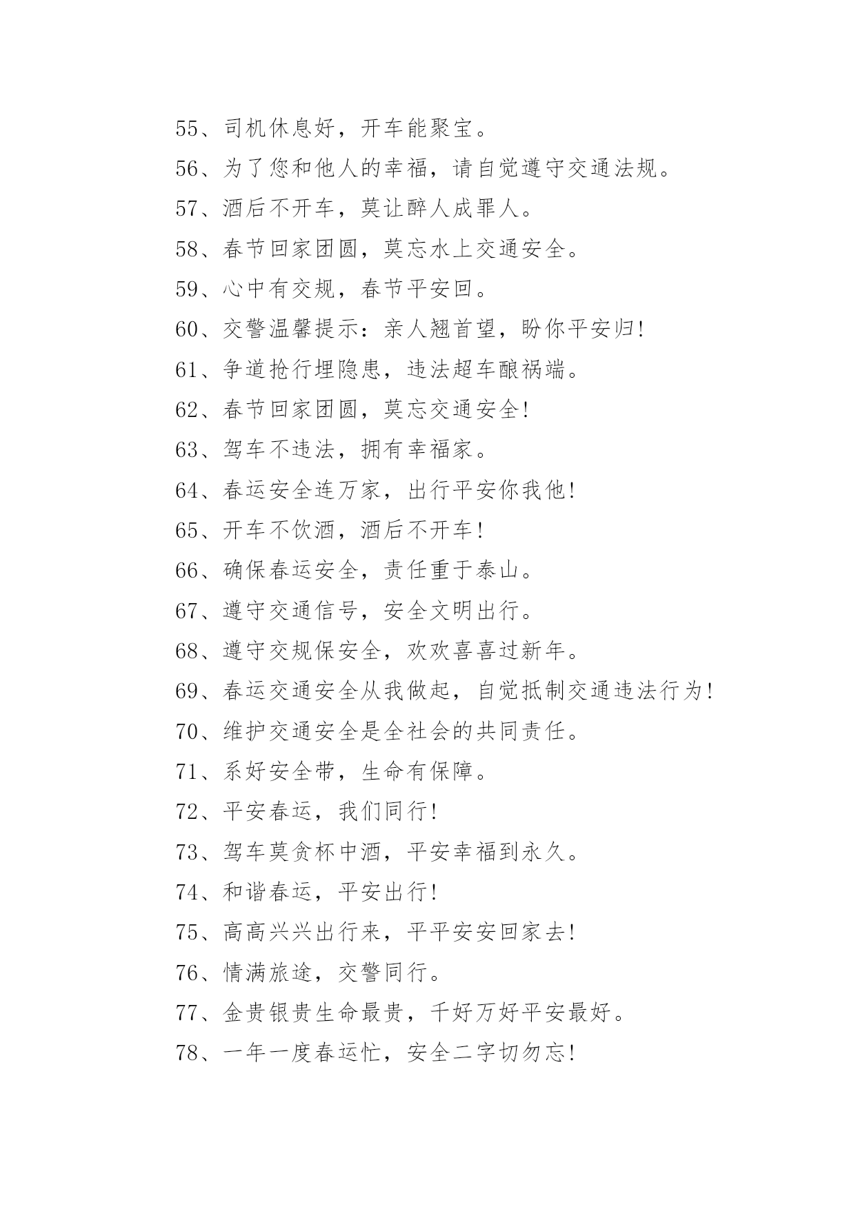交通安全宣传句子交通安全宣传句子无论在学习、工作或是生活中,大家最不陌生的就是句子了吧,句子由词或词组部分和语调所表示的语气部分组成。你所见过的句子是什么样的呢?下面是小编帮大家整理的交通安全宣传句子,希望对大家有所帮助。交通安全宣传句子11、爱家庭,无视交规等于零。2、维护水上交通秩序,确保春运交通安全!3、春运交通安全从我做起,自觉抵制交通违法行为!4、为了万家团圆,确保春运安全!5、不乘违法车辆,确保乘车安全!6、春节回家团圆,莫忘交通安全。7、带一份小心上路,携一团温馨回家。8、一人出车全家念,一人平安全家福。9、狭路相逢让者胜。10、全力投入春运交通安全竞赛活动,打胜新年交通安全第一仗!11、关爱生命,不坐超员车,不坐报废车,不坐低速载货汽车和拖拉机。12、文明交通你我他,平安出行迎新春。13、不超速,不超员,不酒后驾驶,不疲劳驾驶!14、为了万家团圆,确保春运安全。15、一车生命握在手,安全驾驶记心头!16、交通与文明同在,安全与梦想同行。17、关爱他人生命,莫开超员车;关注自身安全,不乘超员车!18、但愿人长久,千里路平安。19、安全牢记心中,平安才能回家。20、摩托骑行走天涯,戴上头盔更潇洒。21、春运保安全,真情满人间!22、一人安危系全家,全家幸福系一人。23、遵章守法做文明司机,平安畅通庆祥和新年。24、坚持以人为本,构建和谐春运!25、遵守交通法规维护交通秩序构建和谐交通打造平安上虞。26、心头常亮红绿灯安全行驶伴人生!27、安全是最好的效益,平安是全家的福气!28、文明交通你我他,平安出行靠大家。29、文明、规范的.交通行为是您安全和幸福的保障。30、春节等你团圆,安全才能回家!31、和谐春运行好运,平安回家乐万家。32、春运安全连万家,平安全靠你我他!33、一切围绕春运,一切服从春运!34、交警大队、驾协祝您新春吉祥,出行平安!35、严禁超员、超载、超速、超时驾驶、客货混装、疲劳驾驶!36、回家路上莫忘安全,春运旅途和谐共建。37、十次肇事九次快,摩托车族当自爱。38、家有老小在等待,疲劳驾驶不是爱。39、亲人有交代,系好安全带,开车不比赛,平安时刻在。40、礼让三分多条路,文明驾驶乐一生。41、平平安安回家,欢欢喜喜过年!42、不超速,不超员,不酒后驾驶,不疲劳驾驶!43、全力投入春运交通安全竞赛活动,打胜新年交通安全第一仗!44、关爱生命安全出行,从我做起从您做起。45、春运安全是大事,遵章守规非小节。46、保障春运道路交通安全,营造平安祥和节日氛围!47、自觉遵守道路交通安全法规,全力确保春运交通安全有序!48、遵纪守法文明驾驶,平安岀行阖家欢乐!49、进站乘车查三品,出行安全你我他!50、一车生命握在手,安全驾驶记心头。51、春节团圆万家盼,遵纪守规保平安。52、春运安全连万家,平安全靠你我他!53、保障春运交通安全,营造平安、祥和的节日氛围。54、不管安全的领导不是好领导,不顾安全的公民不是好公民!55、司机休息好,开车能聚宝。56、为了您和他人的幸福,请自觉遵守交通法规。57、酒后不开车,莫让醉人成罪人。58、春节回家团圆,莫忘水上交通安全。59、心中有交规,春节平安回。60、交警温馨提示:亲人翘首望,盼你平安归!61、争道抢行埋隐患,违法超车酿祸端。62、春节回家团圆,莫忘交通安全!63、驾车不违法,拥有幸福家。64、春运安全连万家,出行平安你我他!65、开车不饮酒,酒后不开车!66、确保春运安全,责任重于泰山。67、遵守交通信号,安全文明出行。68、遵守交规保安全,欢欢喜喜过新年。69、春运交通安全从我做起,自觉抵制交通违法行为!70、维护交通安全是全社会的共同责任。71、系好安全带,生命有保障。72、平安春运,我们同行!73、驾车莫贪杯中酒,平安幸福到永久。74、和谐春运,平安出行!75、高高兴兴出行来,平平安安回家去!76、情满旅途,交警同行。77、金贵银贵生命最贵,千好万好平安最好。78、一年一度春运忙,安全二字切勿忘!79、春运安全连万家,出行平安你我他。80、高高兴兴出行来,平平安安回家去!交通安全宣传句子21、交通安全抛脑后,交通事故在前头2、您保持车况良好,车容整洁3、交通安全在我心中!4、加强综合治理,保障交通安全5、学龄前儿童上街要有成年人带领6、穿马路,跨护栏,少公德,多危险7、上有老,下有小,出了交通事故不得了8、宣传交通法规,提高交通文明意识9、最大的浪费是事故,最大的节约是安全10、行横道是您横过马路的安全带!11、人行道车莫占,车行道人莫钻12、您是河源的'客人,您是遵章守规的楷模13、酒后开车,危险万分!14、行经路口要观望,拐弯示意要礼让15、勿以快慢论英雄,安全行车最光荣交通安全宣传句子31、行车多礼让,行人优先行。2、安全是回家唯一的捷径。3、