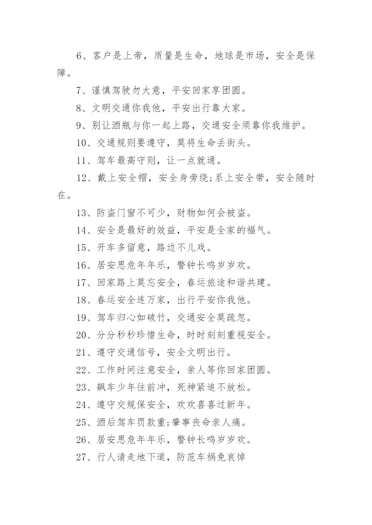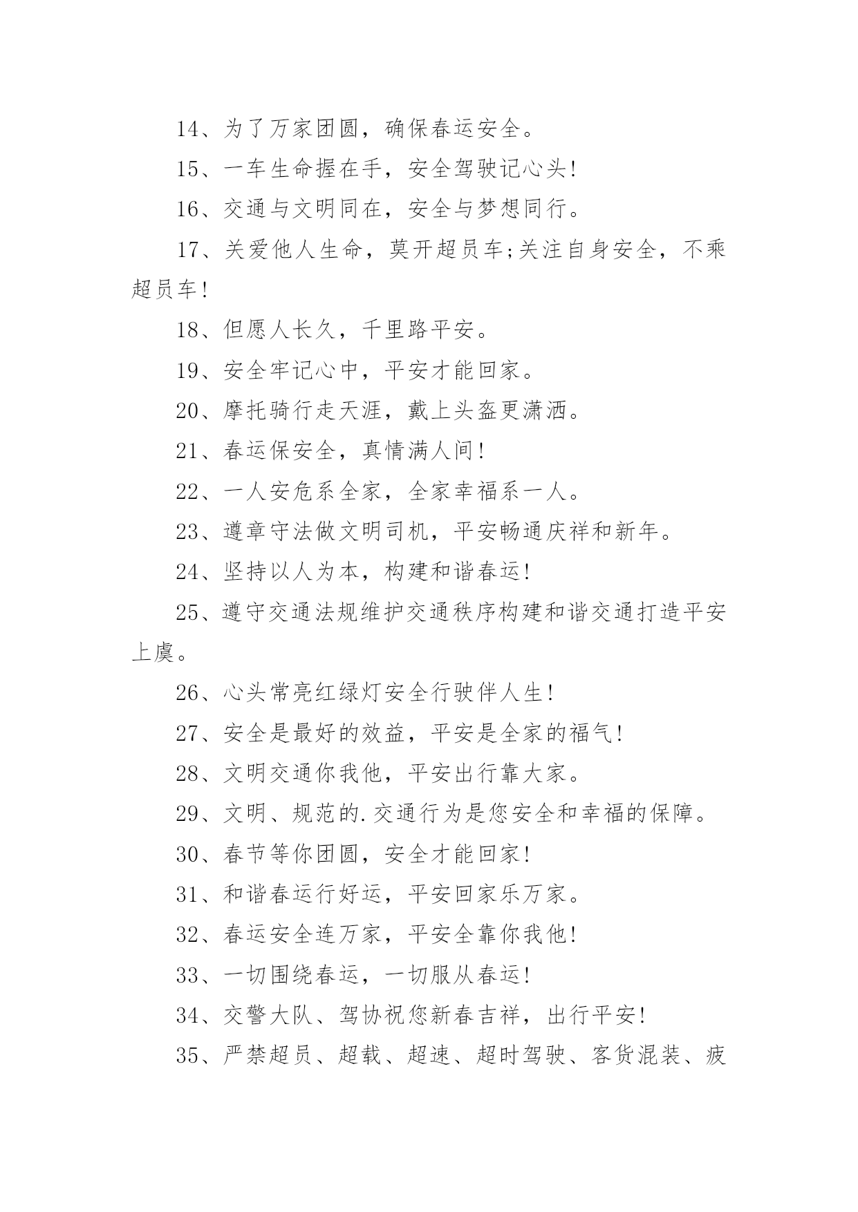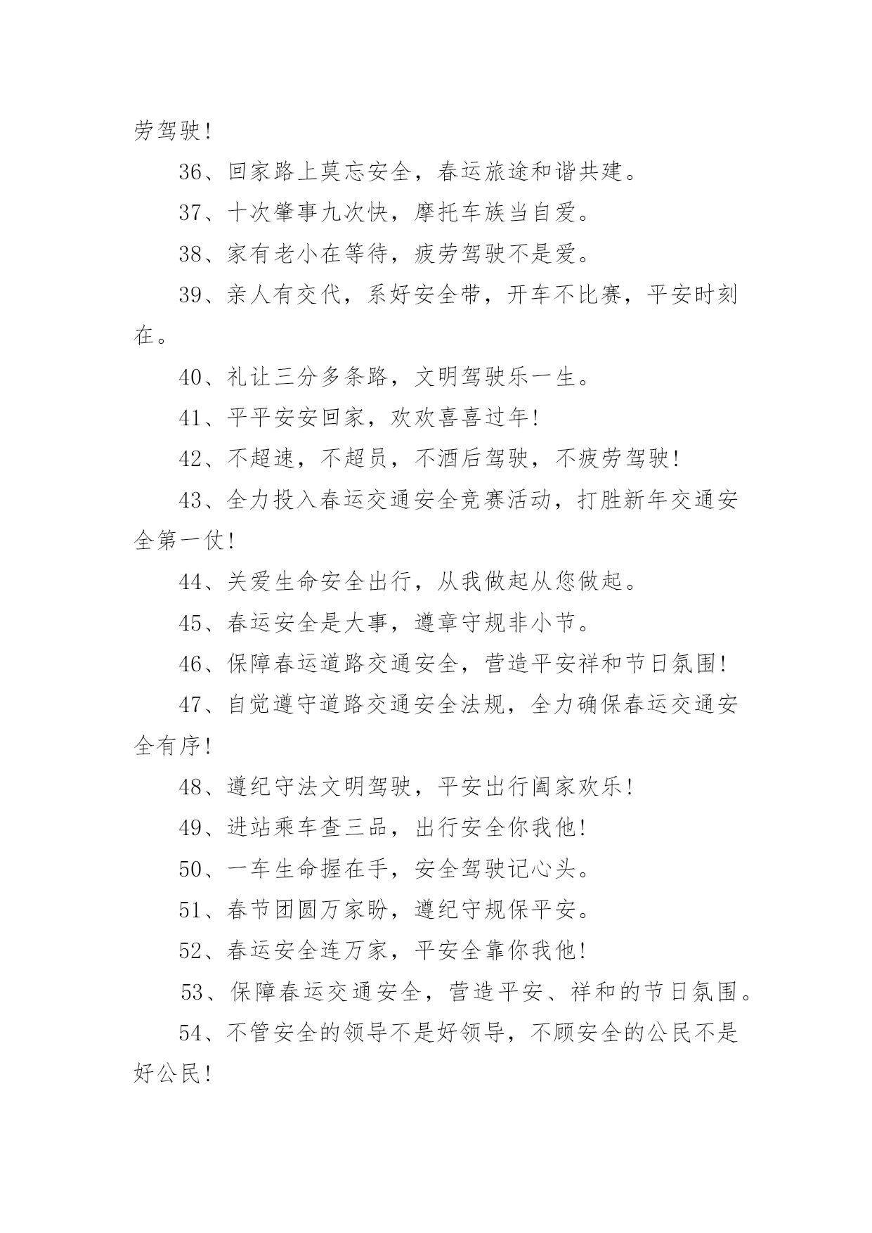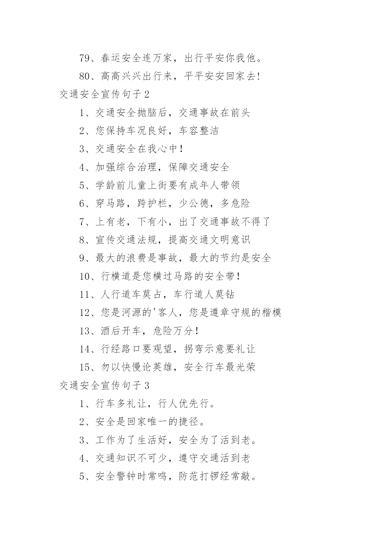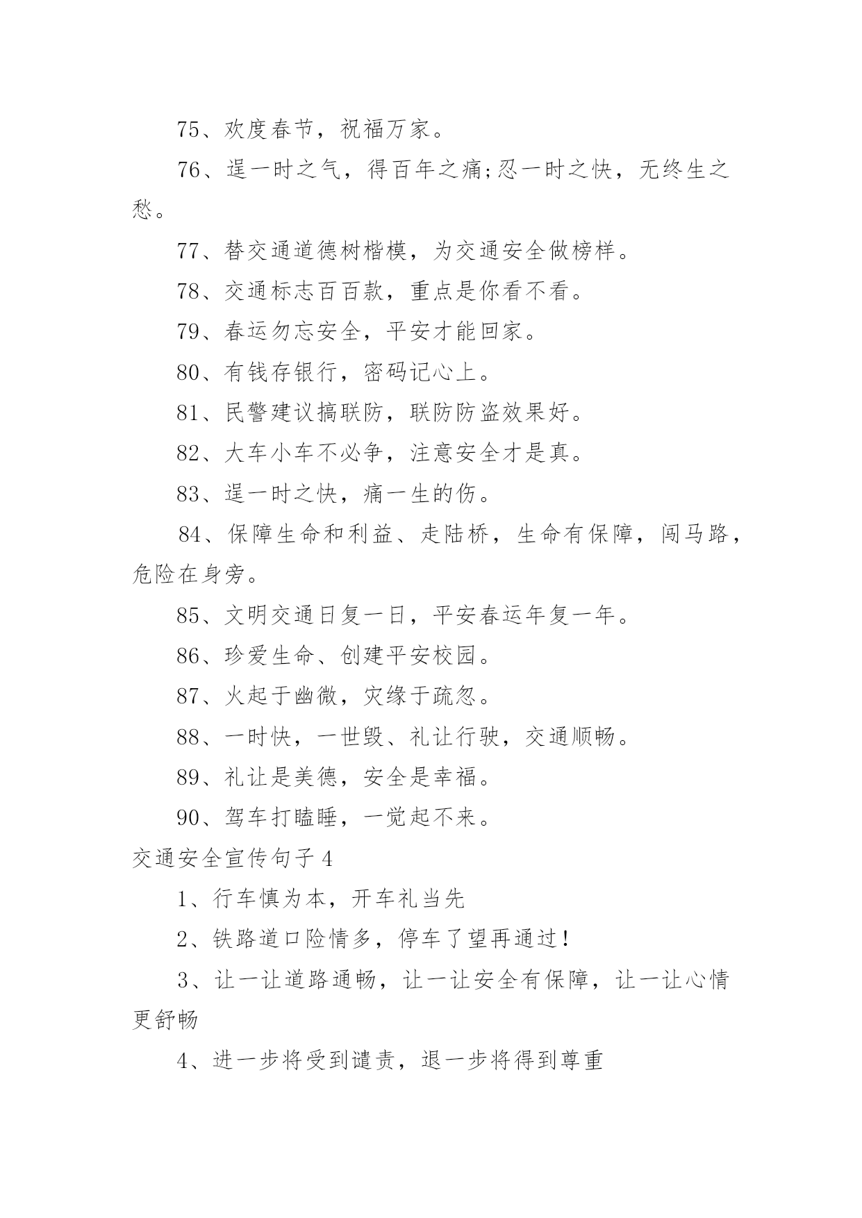 交通安全宣传句子交通安全宣传句子无论在学习、工作或是生活中,大家最不陌生的就是句子了吧,句子由词或词组部分和语调所表示的语气部分组成。你所见过的句子是什么样的呢?下面是小编帮大家整理的交通安全宣传句子,希望对大家有所帮助。交通安全宣传句子11、爱家庭,无视交规等于零。2、维护水上交通秩序,确保春运交通安全!3、春运交通安全从我做起,自觉抵制交通违法行为!4、为了万家团圆,确保春运安全!5、不乘违法车辆,确保乘车安全!6、春节回家团圆,莫忘交通安全。7、带一份小心上路,携一团温馨回家。8、一人出车全家念,一人平安全家福。9、狭路相逢让者胜。10、全力投入春运交通安全竞赛活动,打胜新年交通安全第一仗!11、关爱生命,不坐超员车,不坐报废车,不坐低速载货汽车和拖拉机。12、文明交通你我他,平安出行迎新春。13、不超速,不超员,不酒后驾驶,不疲劳驾驶!14、为了万家团圆,确保春运安全。15、一车生命握在手,安全驾驶记心头!16、交通与文明同在,安全与梦想同行。17、关爱他人生命,莫开超员车;关注自身安全,不乘超员车!18、但愿人长久,千里路平安。19、安全牢记心中,平安才能回家。20、摩托骑行走天涯,戴上头盔更潇洒。21、春运保安全,真情满人间!22、一人安危系全家,全家幸福系一人。23、遵章守法做文明司机,平安畅通庆祥和新年。24、坚持以人为本,构建和谐春运!25、遵守交通法规维护交通秩序构建和谐交通打造平安上虞。26、心头常亮红绿灯安全行驶伴人生!27、安全是最好的效益,平安是全家的福气!28、文明交通你我他,平安出行靠大家。29、文明、规范的.交通行为是您安全和幸福的保障。30、春节等你团圆,安全才能回家!31、和谐春运行好运,平安回家乐万家。32、春运安全连万家,平安全靠你我他!33、一切围绕春运,一切服从春运!34、交警大队、驾协祝您新春吉祥,出行平安!35、严禁超员、超载、超速、超时驾驶、客货混装、疲劳驾驶!36、回家路上莫忘安全,春运旅途和谐共建。37、十次肇事九次快,摩托车族当自爱。38、家有老小在等待,疲劳驾驶不是爱。39、亲人有交代,系好安全带,开车不比赛,平安时刻在。40、礼让三分多条路,文明驾驶乐一生。41、平平安安回家,欢欢喜喜过年!42、不超速,不超员,不酒后驾驶,不疲劳驾驶!43、全力投入春运交通安全竞赛活动,打胜新年交通安全第一仗!44、关爱生命安全出行,从我做起从您做起。45、春运安全是大事,遵章守规非小节。46、保障春运道路交通安全,营造平安祥和节日氛围!47、自觉遵守道路交通安全法规,全力确保春运交通安全有序!48、遵纪守法文明驾驶,平安岀行阖家欢乐!49、进站乘车查三品,出行安全你我他!50、一车生命握在手,安全驾驶记心头。51、春节团圆万家盼,遵纪守规保平安。52、春运安全连万家,平安全靠你我他!53、保障春运交通安全,营造平安、祥和的节日氛围。54、不管安全的领导不是好领导,不顾安全的公民不是好公民!55、司机休息好,开车能聚宝。56、为了您和他人的幸福,请自觉遵守交通法规。57、酒后不开车,莫让醉人成罪人。58、春节回家团圆,莫忘水上交通安全。59、心中有交规,春节平安回。60、交警温馨提示:亲人翘首望,盼你平安归!61、争道抢行埋隐患,违法超车酿祸端。62、春节回家团圆,莫忘交通安全!63、驾车不违法,拥有幸福家。64、春运安全连万家,出行平安你我他!65、开车不饮酒,酒后不开车!66、确保春运安全,责任重于泰山。67、遵守交通信号,安全文明出行。68、遵守交规保安全,欢欢喜喜过新年。69、春运交通安全从我做起,自觉抵制交通违法行为!70、维护交通安全是全社会的共同责任。71、系好安全带,生命有保障。72、平安春运,我们同行!73、驾车莫贪杯中酒,平安幸福到永久。74、和谐春运,平安出行!75、高高兴兴出行来,平平安安回家去!76、情满旅途,交警同行。77、金贵银贵生命最贵,千好万好平安最好。78、一年一度春运忙,安全二字切勿忘!79、春运安全连万家,出行平安你我他。80、高高兴兴出行来,平平安安回家去!交通安全宣传句子21、交通安全抛脑后,交通事故在前头2、您保持车况良好,车容整洁3、交通安全在我心中!4、加强综合治理,保障交通安全5、学龄前儿童上街要有成年人带领6、穿马路,跨护栏,少公德,多危险7、上有老,下有小,出了交通事故不得了8、宣传交通法规,提高交通文明意识9、最大的浪费是事故,最大的节约是安全10、行横道是您横过马路的安全带!11、人行道车莫占,车行道人莫钻12、您是河源的'客人,您是遵章守规的楷模13、酒后开车,危险万分!14、行经路口要观望,拐弯示意要礼让15、勿以快慢论英雄,安全行车最光荣交通安全宣传句子31、行车多礼让,行人优先行。2、安全是回家唯一的捷径。3、